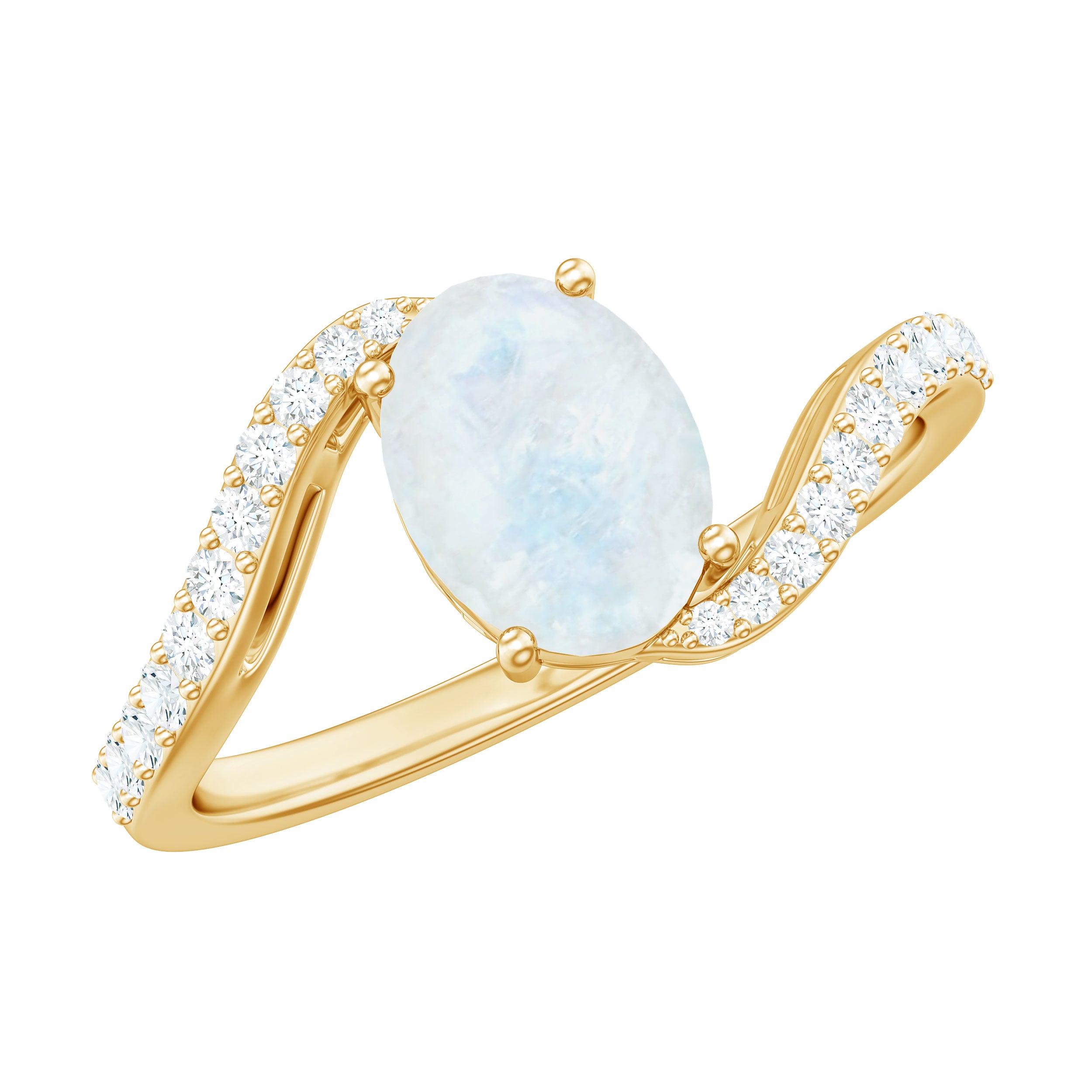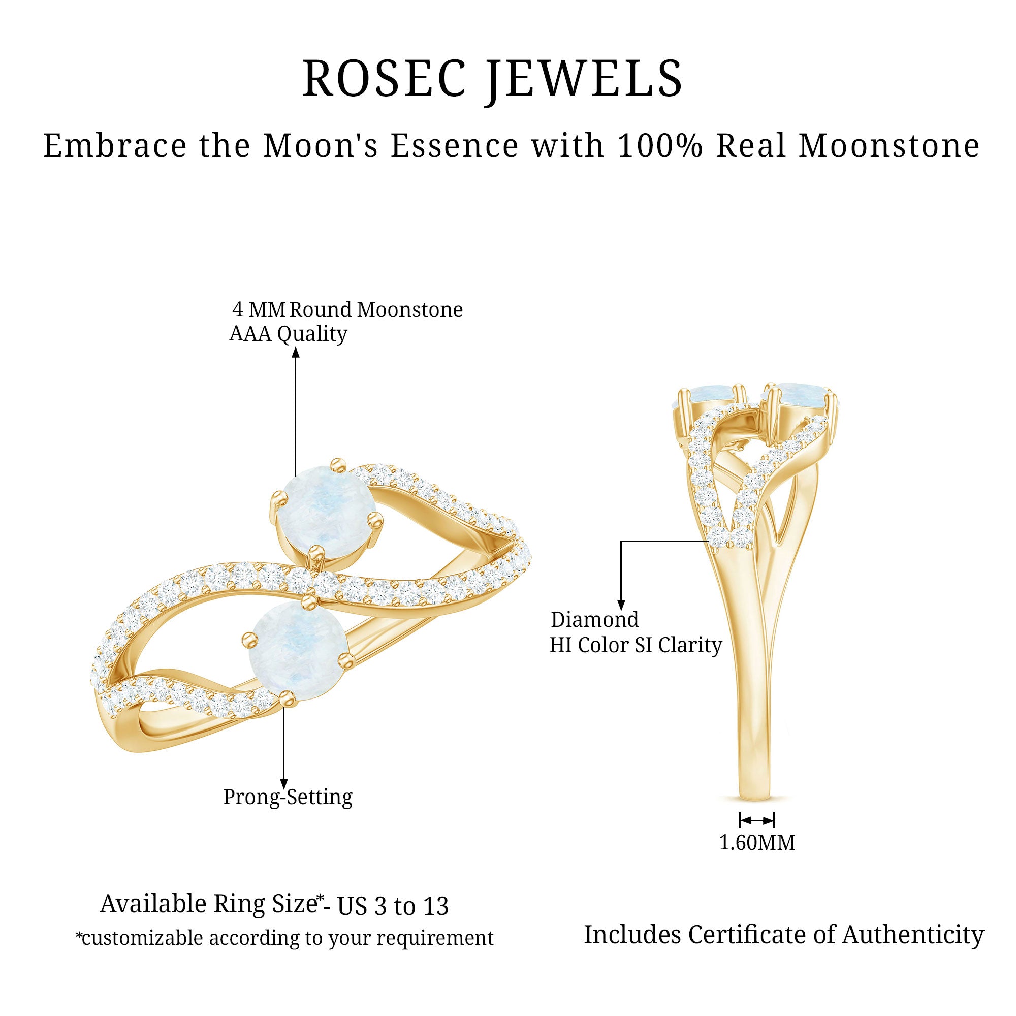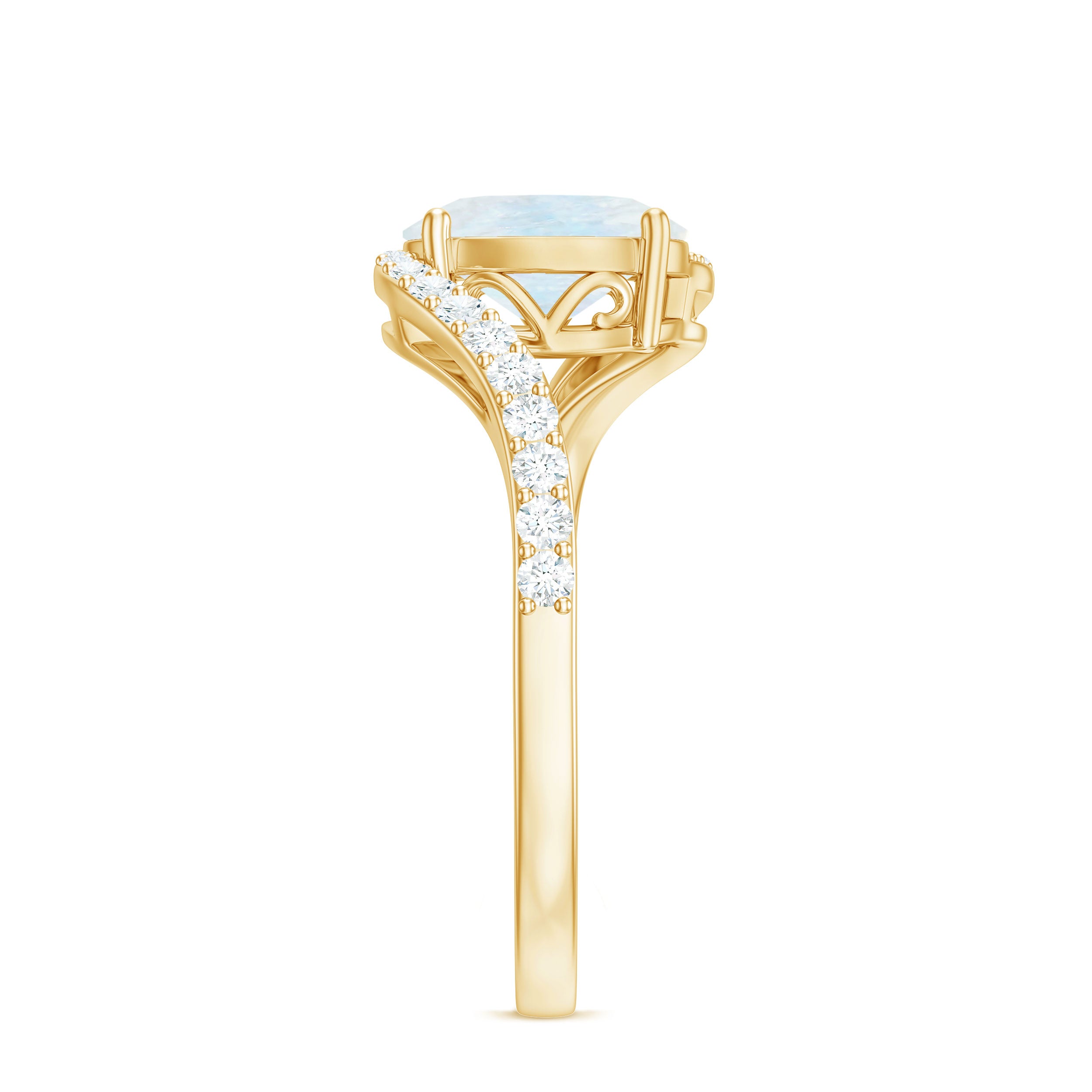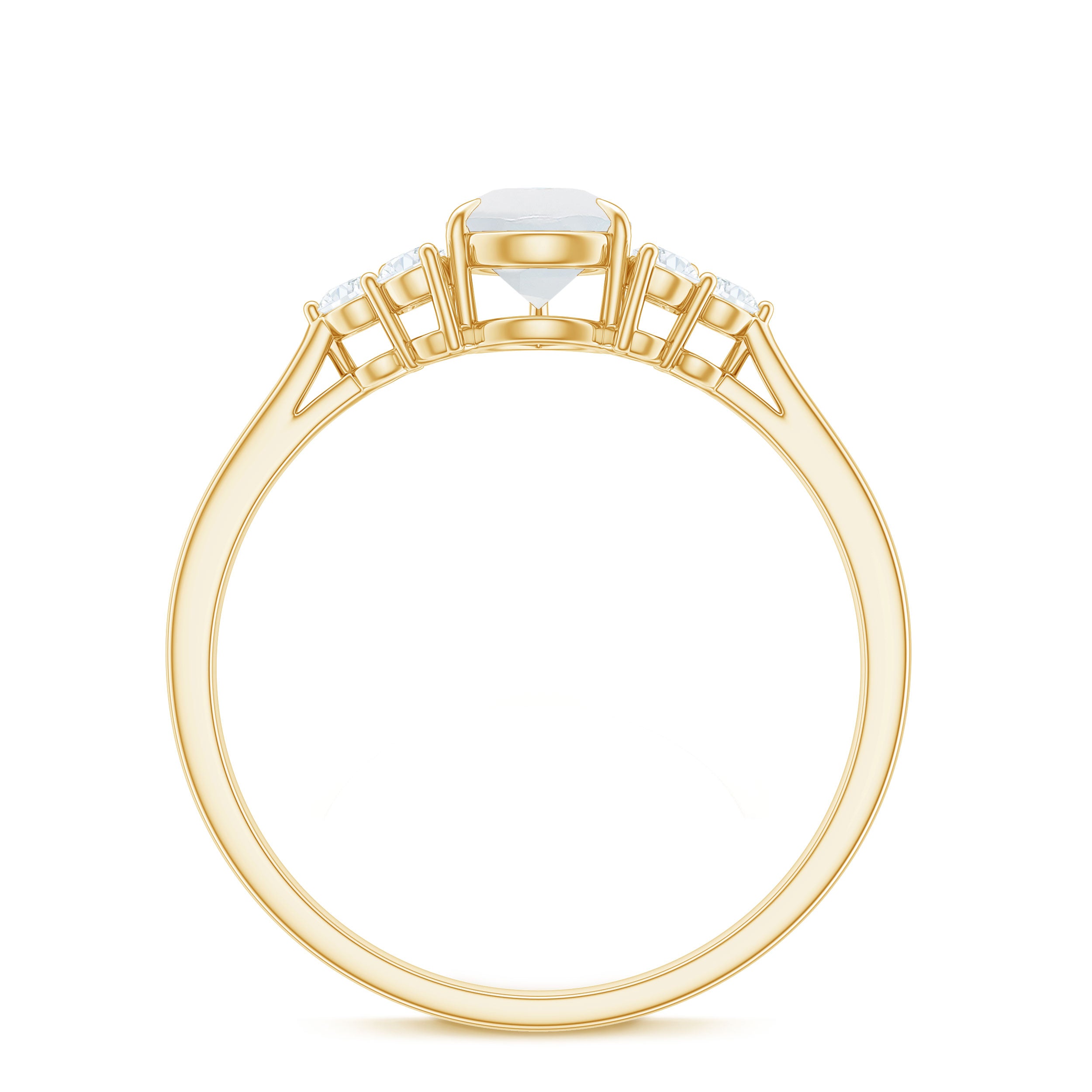 Easily the most sophisticated and Simple Moonstone Ring in the entire collection, a Solitaire Style features the Centerpiece of a Moonstone (of any shape) that stands out on its own. The Moonstone Solitaire here is at least 6 MM in size, which also makes it a one-of-a-kind choice of Moonstone Engagement Ring. It is fashioned in a versatile number of shapes that cater to just as many senses of style. While a Round or Oval Moonstone Ring exudes a conventional touch, a ring adorned with a princess, marquise, or pear-cut Moonstone is more on the fancier side of the spectrum. On the other hand, if you’re on the hunt for an Antique Moonstone Ring, go for the one fashioned in Emerald, Cushion, or Asscher cut Center stone.