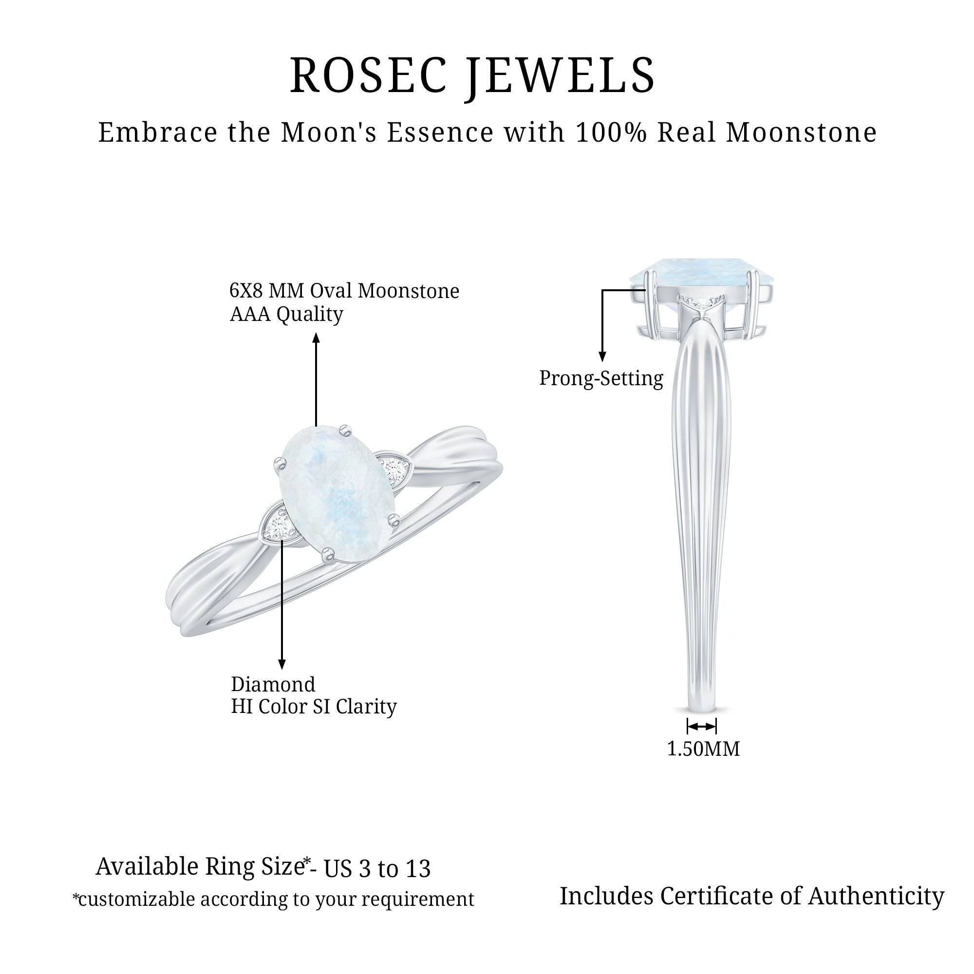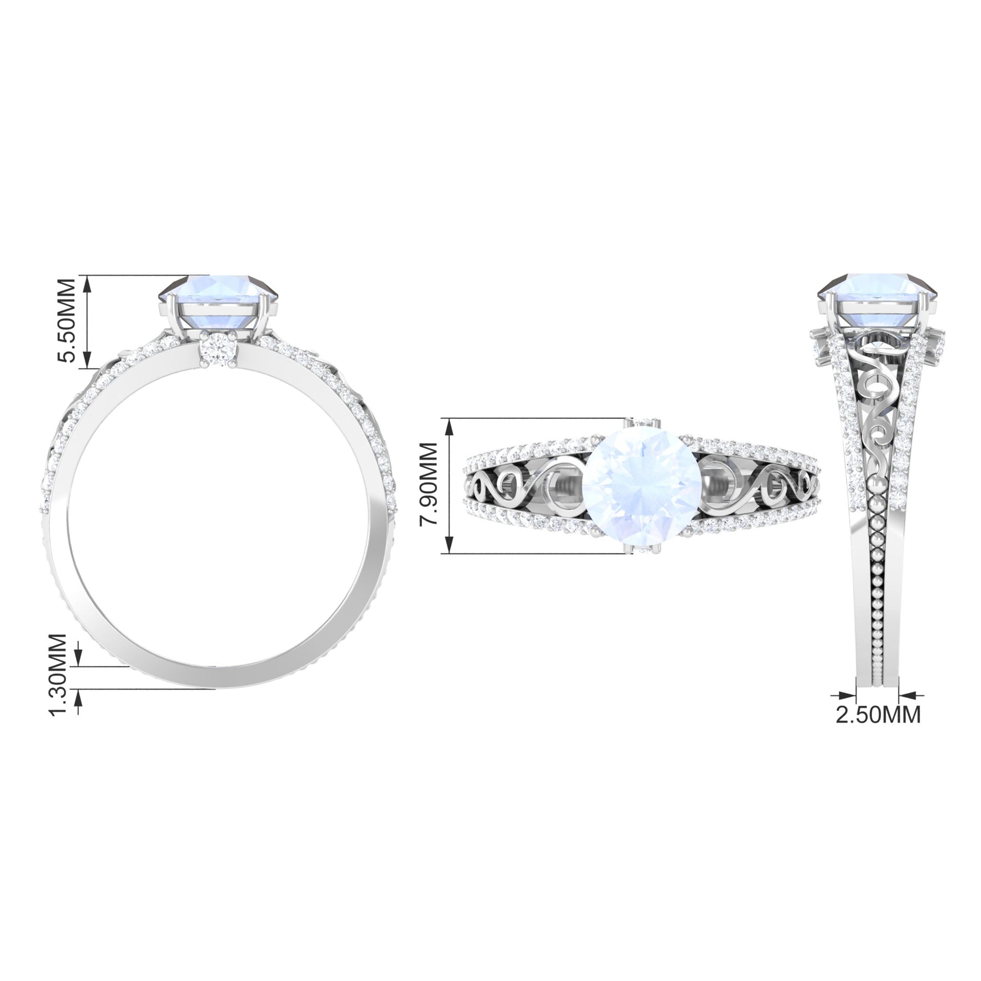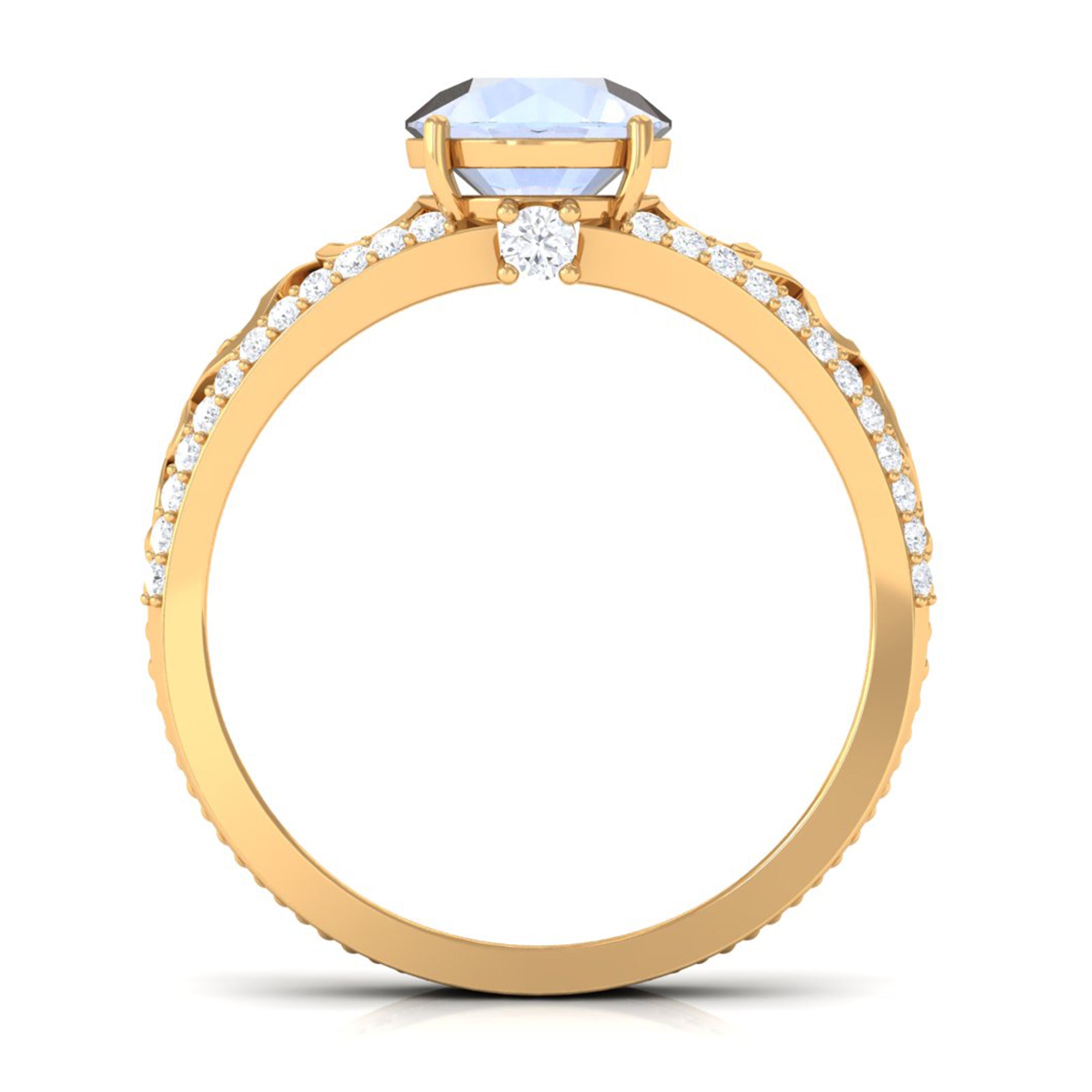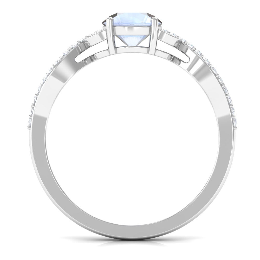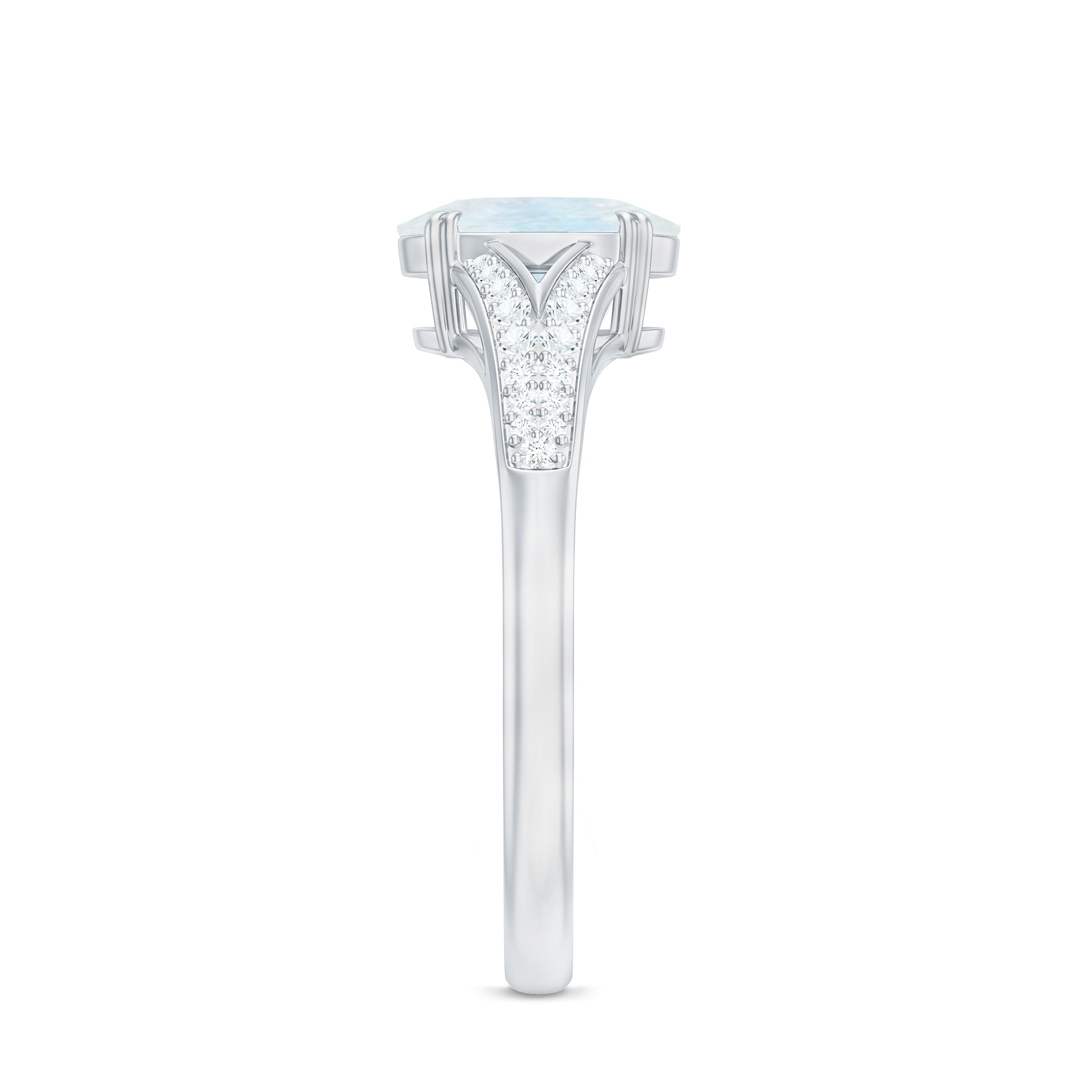 Easily the most sophisticated and Simple Moonstone Ring in the entire collection, a Solitaire Style features the Centerpiece of a Moonstone (of any shape) that stands out on its own. The Moonstone Solitaire here is at least 6 MM in size, which also makes it a one-of-a-kind choice of Moonstone Engagement Ring. It is fashioned in a versatile number of shapes that cater to just as many senses of style. While a Round or Oval Moonstone Ring exudes a conventional touch, a ring adorned with a princess, marquise, or pear-cut Moonstone is more on the fancier side of the spectrum. On the other hand, if you’re on the hunt for an Antique Moonstone Ring, go for the one fashioned in Emerald, Cushion, or Asscher cut Center stone.