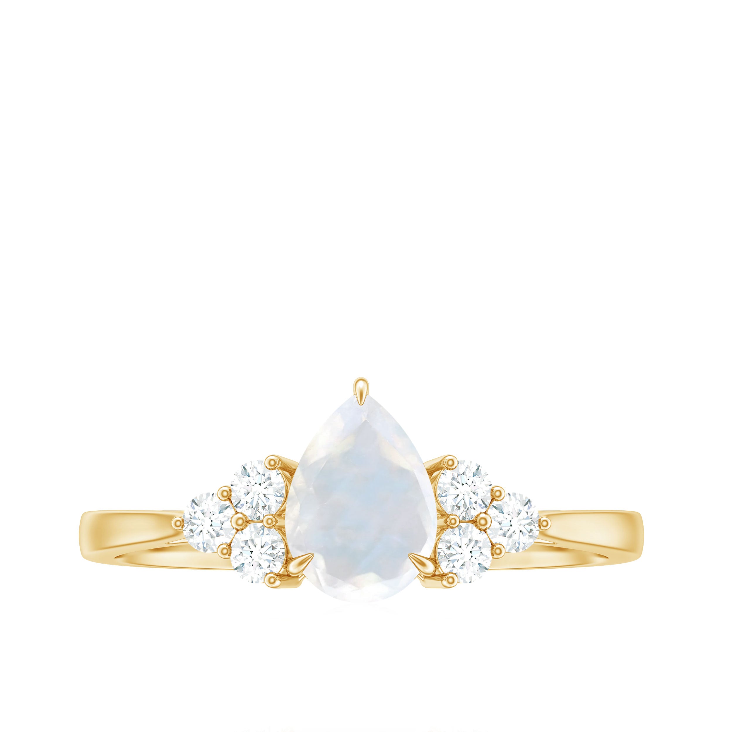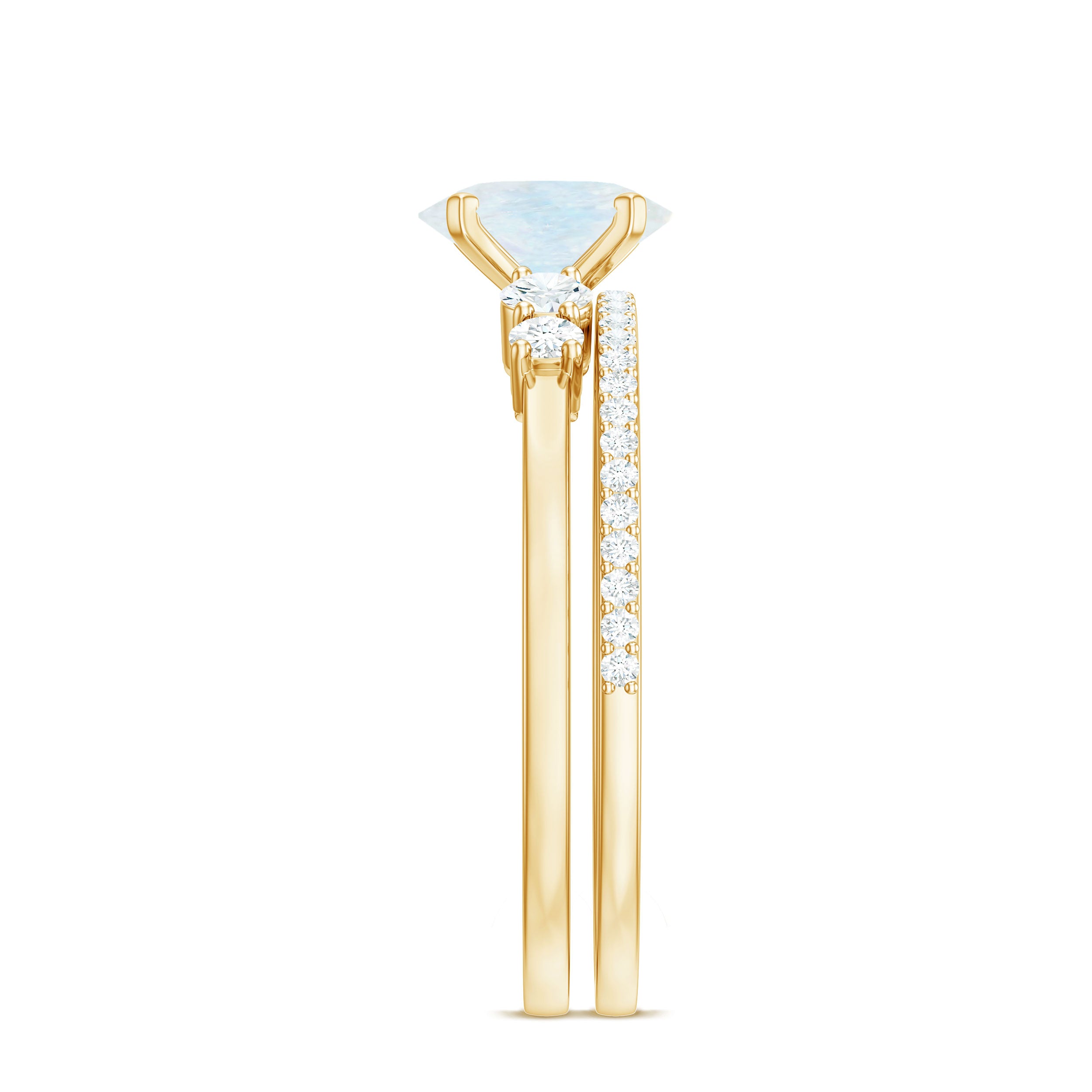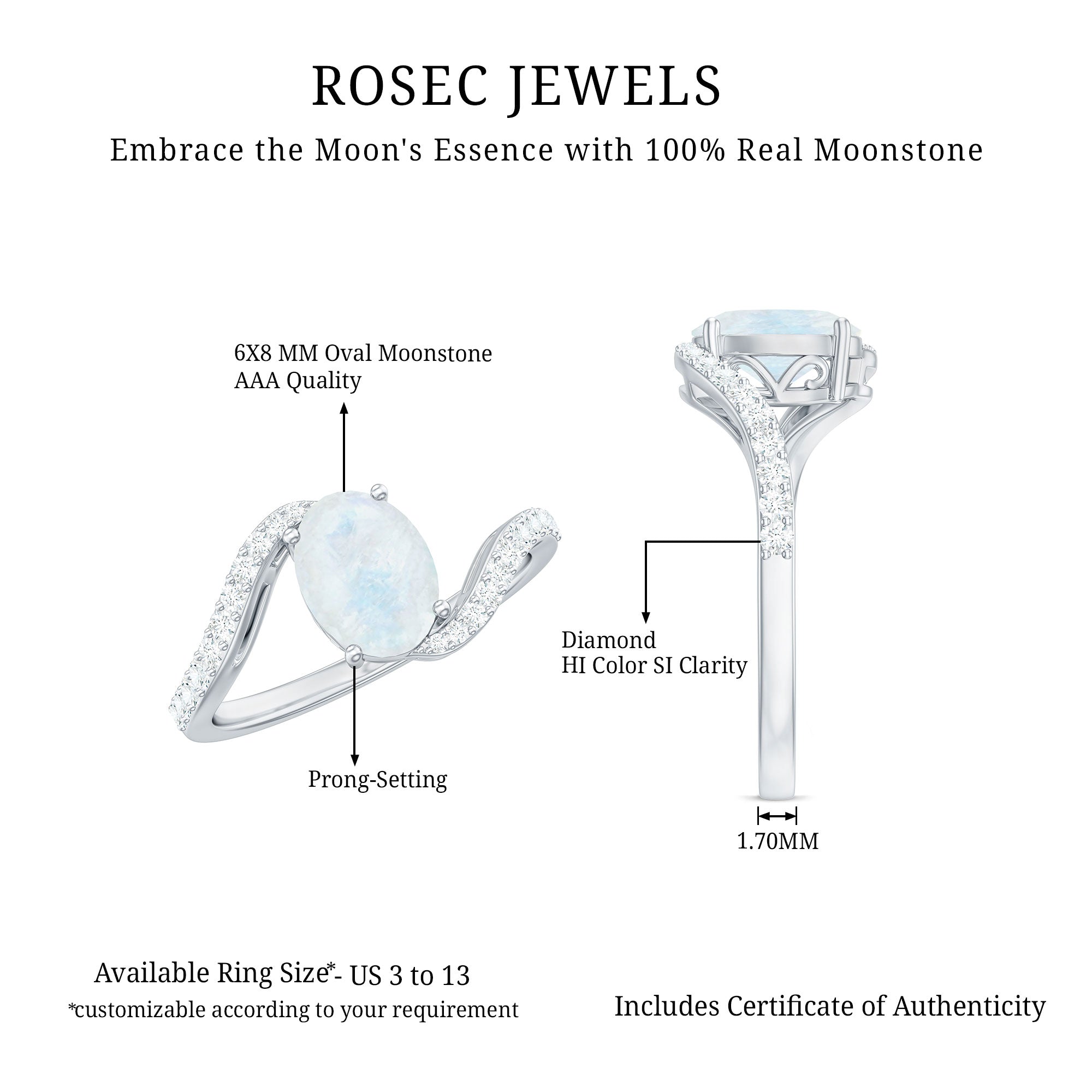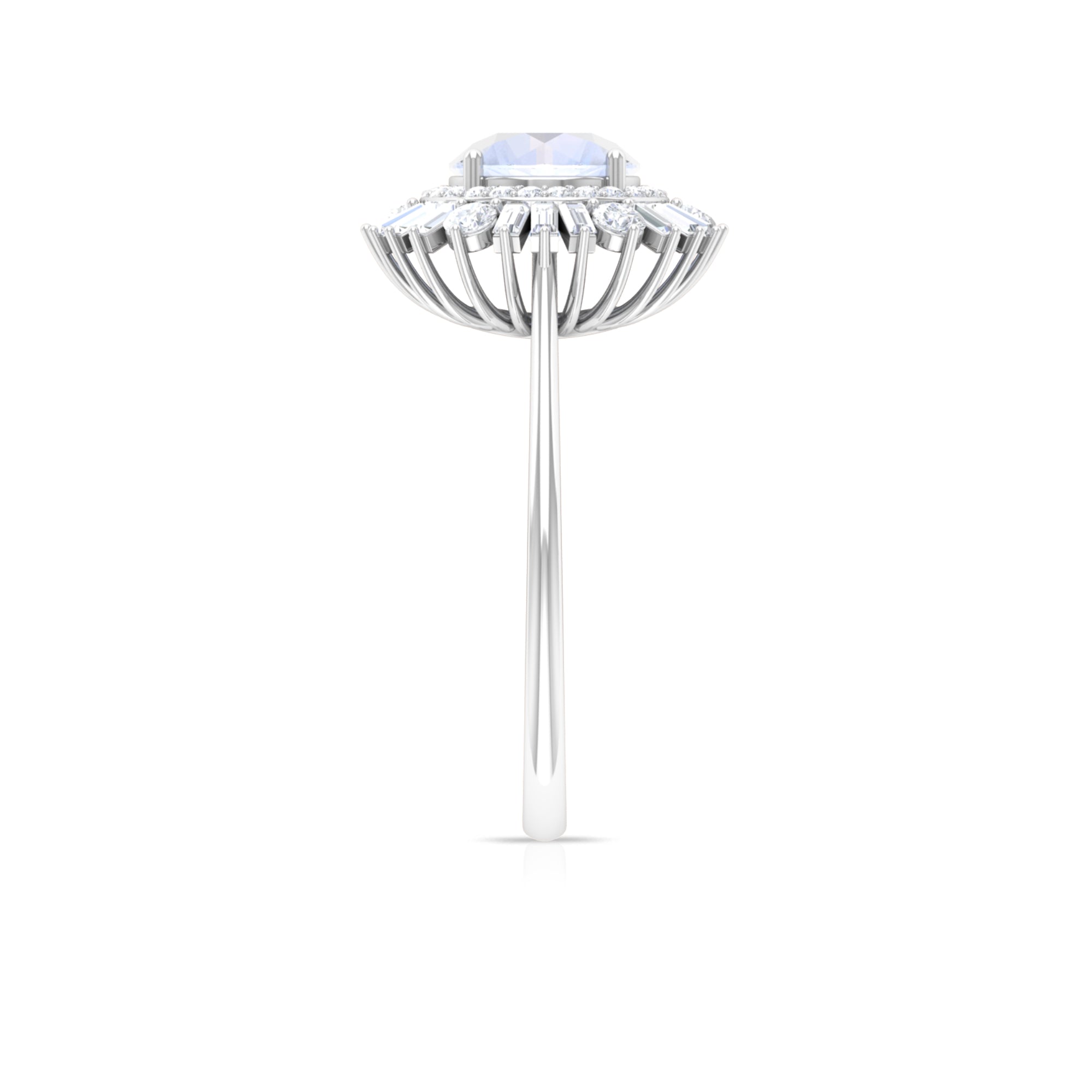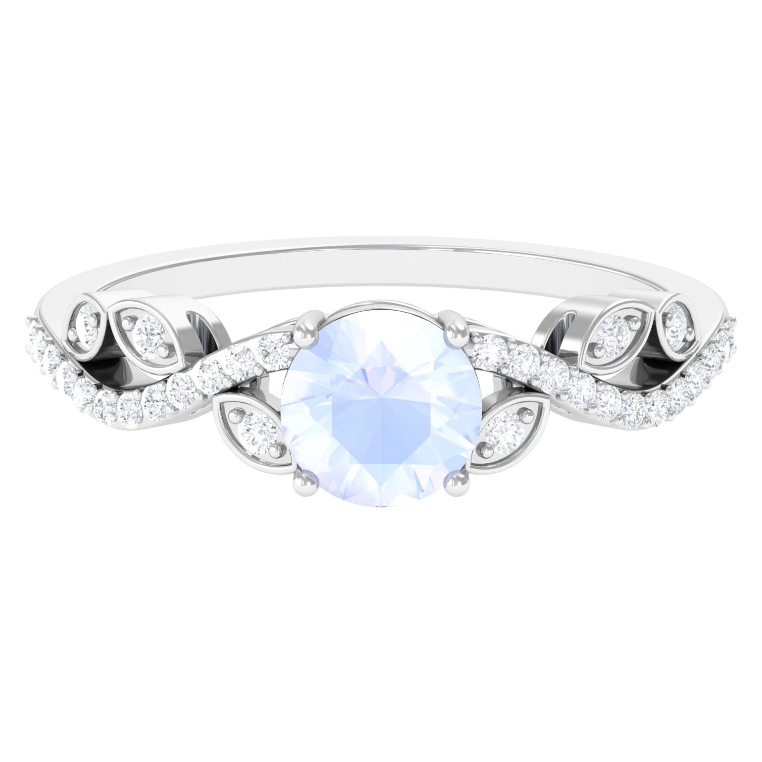 Easily the most sophisticated and Simple Moonstone Ring in the entire collection, a Solitaire Style features the Centerpiece of a Moonstone (of any shape) that stands out on its own. The Moonstone Solitaire here is at least 6 MM in size, which also makes it a one-of-a-kind choice of Moonstone Engagement Ring. It is fashioned in a versatile number of shapes that cater to just as many senses of style. While a Round or Oval Moonstone Ring exudes a conventional touch, a ring adorned with a princess, marquise, or pear-cut Moonstone is more on the fancier side of the spectrum. On the other hand, if you’re on the hunt for an Antique Moonstone Ring, go for the one fashioned in Emerald, Cushion, or Asscher cut Center stone.