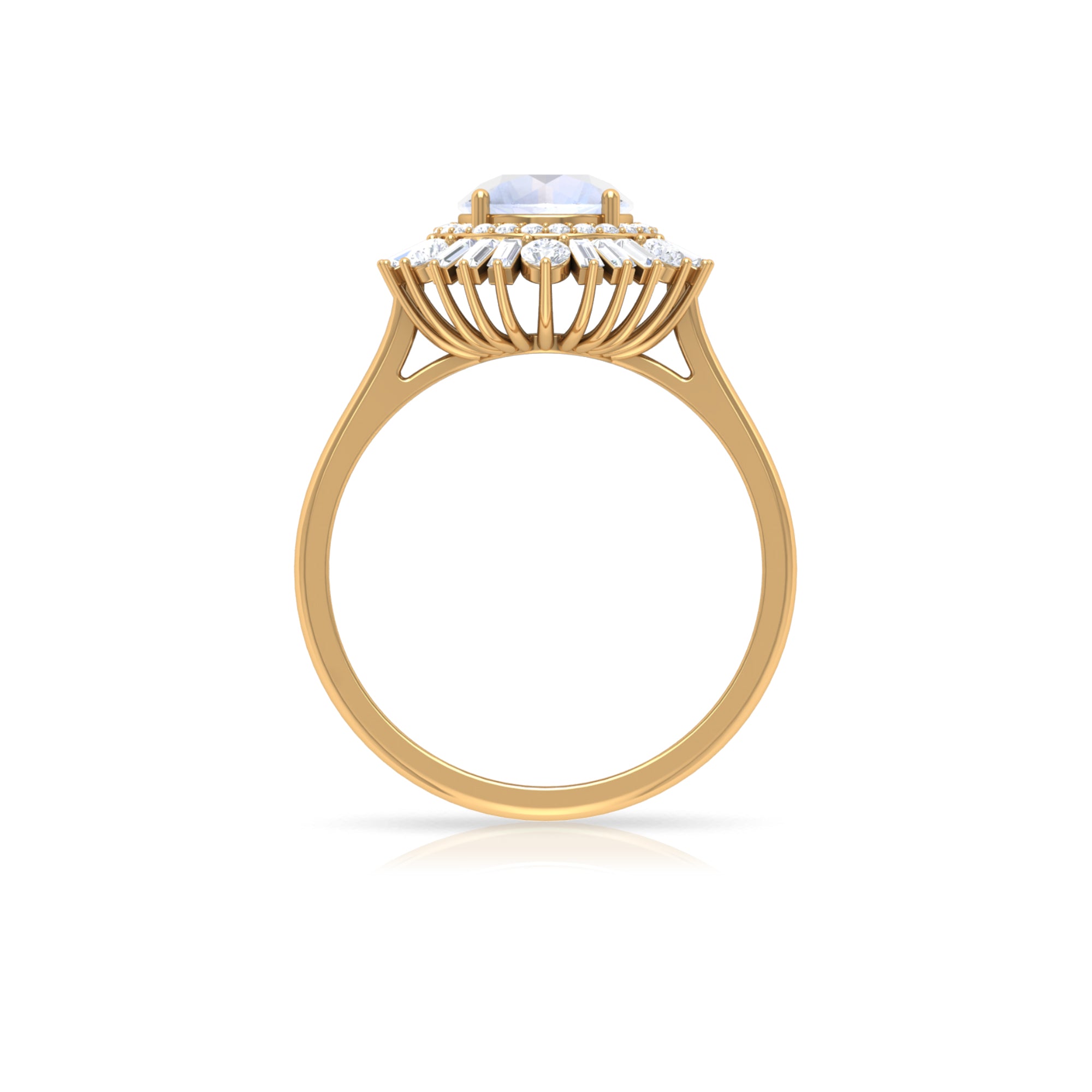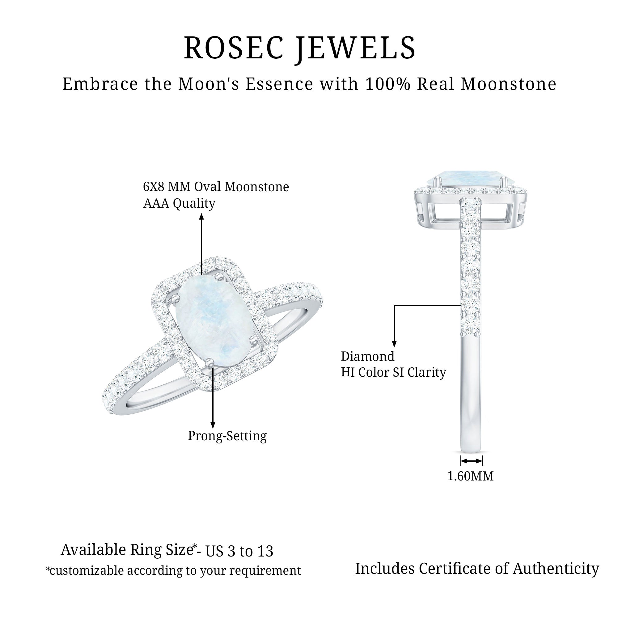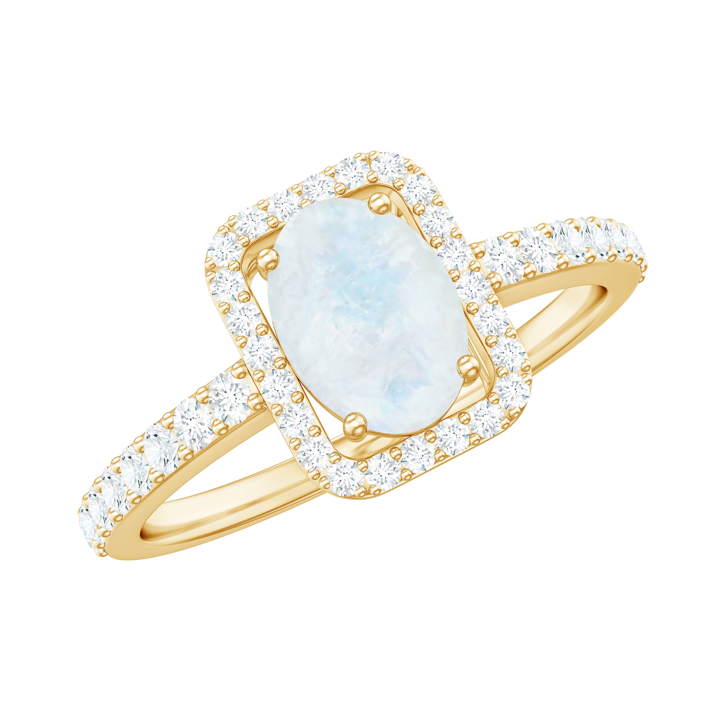 A Halo adorns the sheeny Centerpiece of Moonstone a sparkling touch with the shimmering parade of Diamond/Moissanite all around. Also, if you’re all about glitz and glam but still like a little classic touch, a Moonstone Ring with Diamonds (in a Halo) could be your best bet. The best part? It doesn’t just bestow more character on your Moonstone; it best highlights its beauty by making it appear larger.