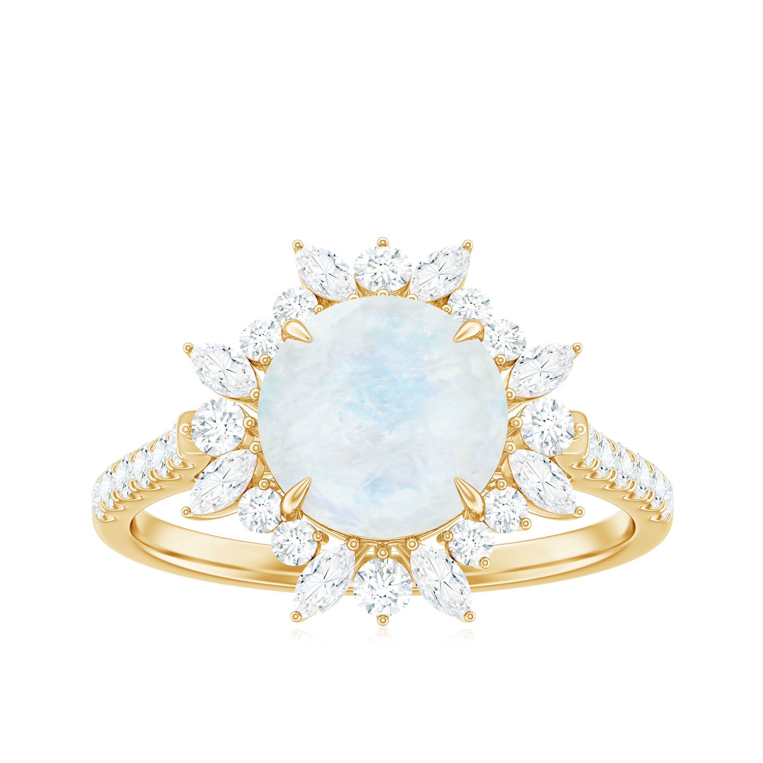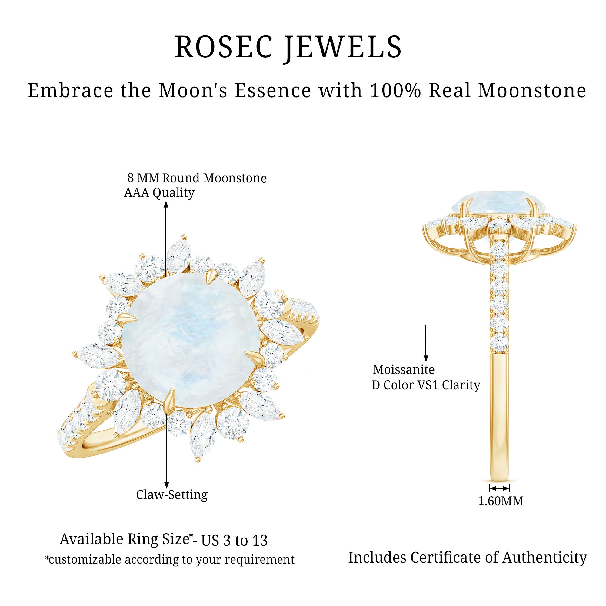 A Cocktail Ring is adorned with a large, flashy center stone of Moonstone that steals all the attention with its over-the-top appeal. To beautify it even further, it is often adorned with sparkling stones of Diamond/Moissanite in eye-catching patterns. This Moonstone Ring for Women has lately become the fashion status for those who like to go all out with their choice of accessories.