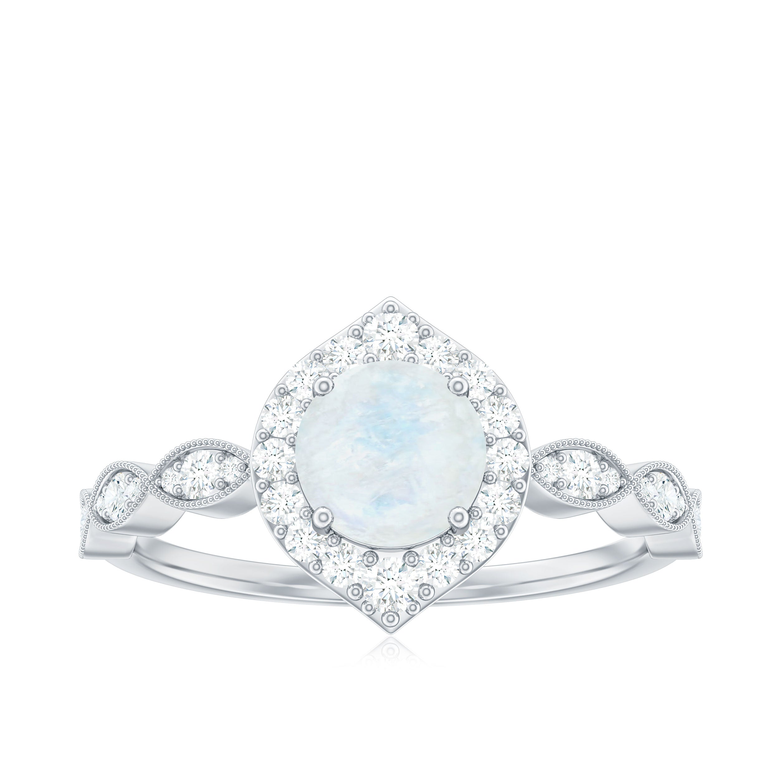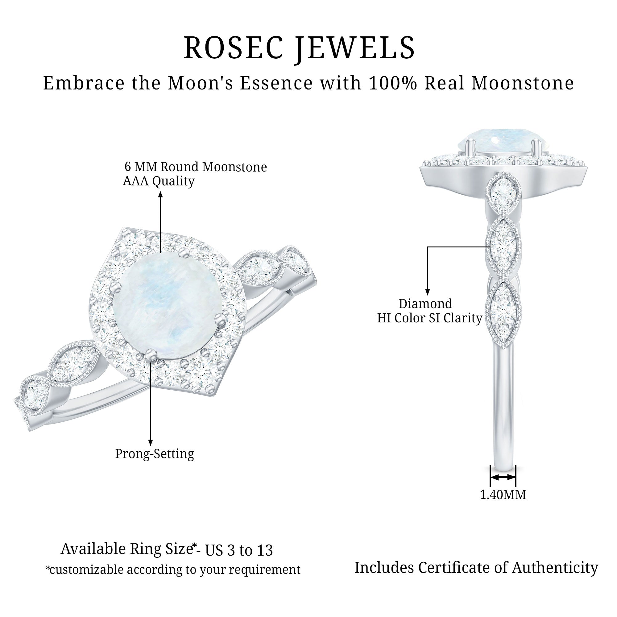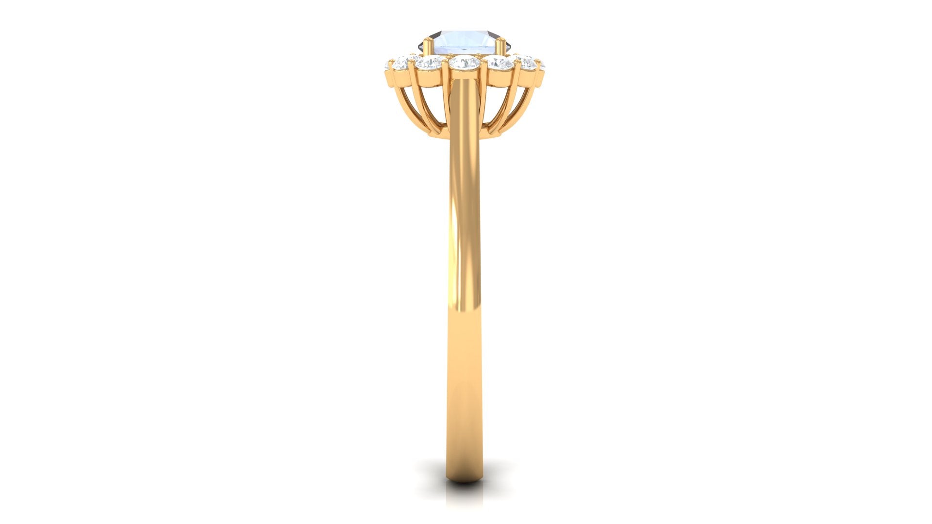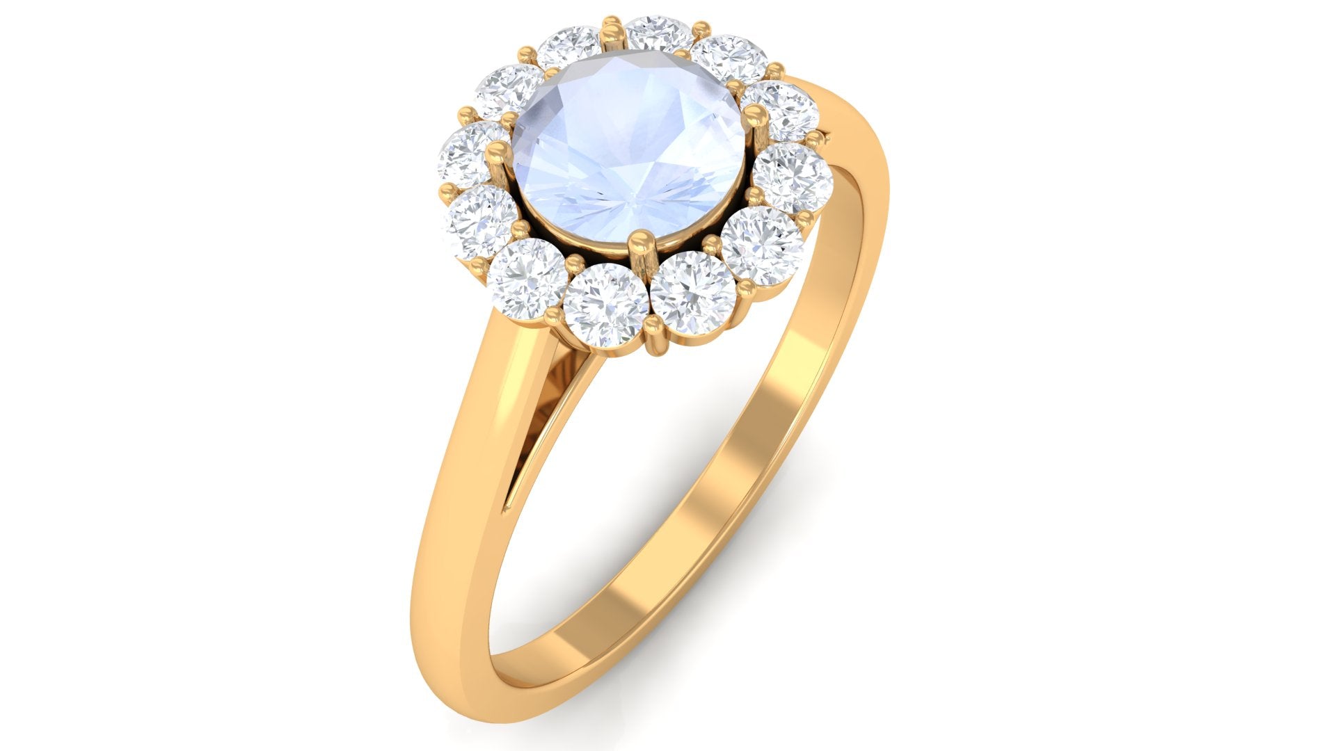 A Halo adorns the sheeny Centerpiece of Moonstone a sparkling touch with the shimmering parade of Diamond/Moissanite all around. Also, if you’re all about glitz and glam but still like a little classic touch, a Moonstone Ring with Diamonds (in a Halo) could be your best bet. The best part? It doesn’t just bestow more character on your Moonstone; it best highlights its beauty by making it appear larger.