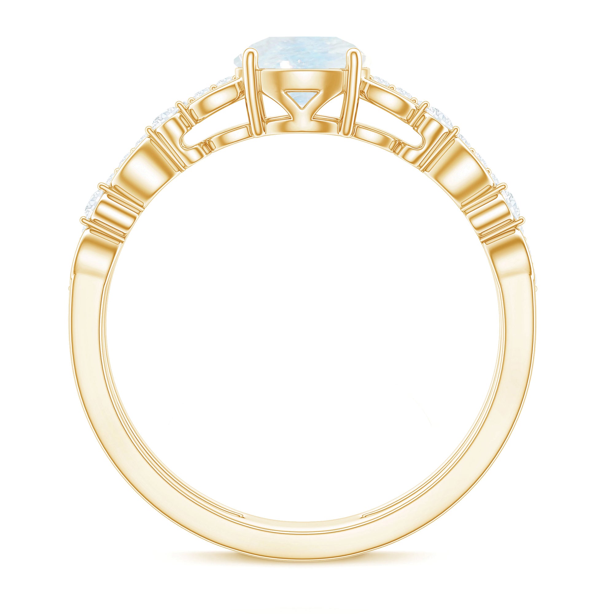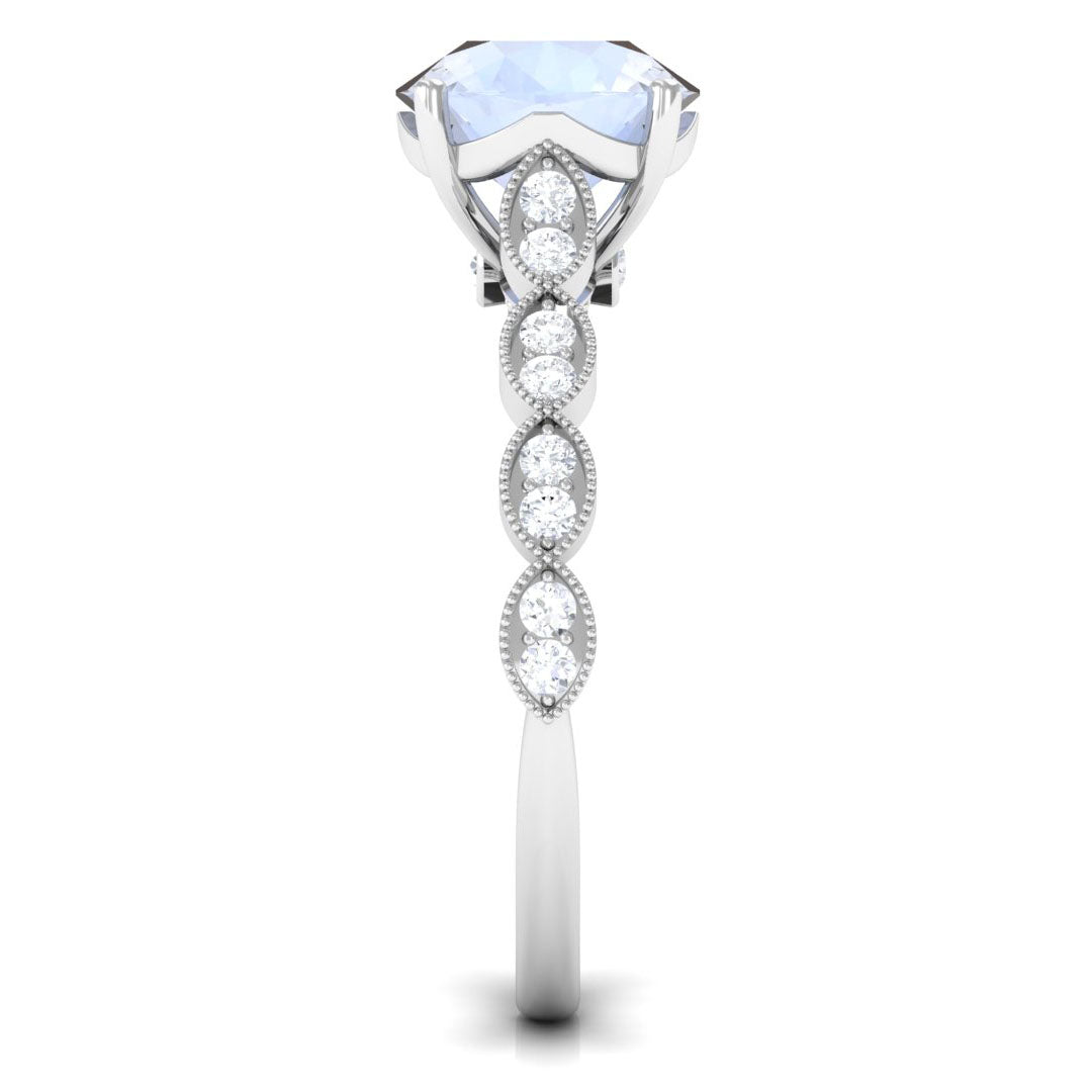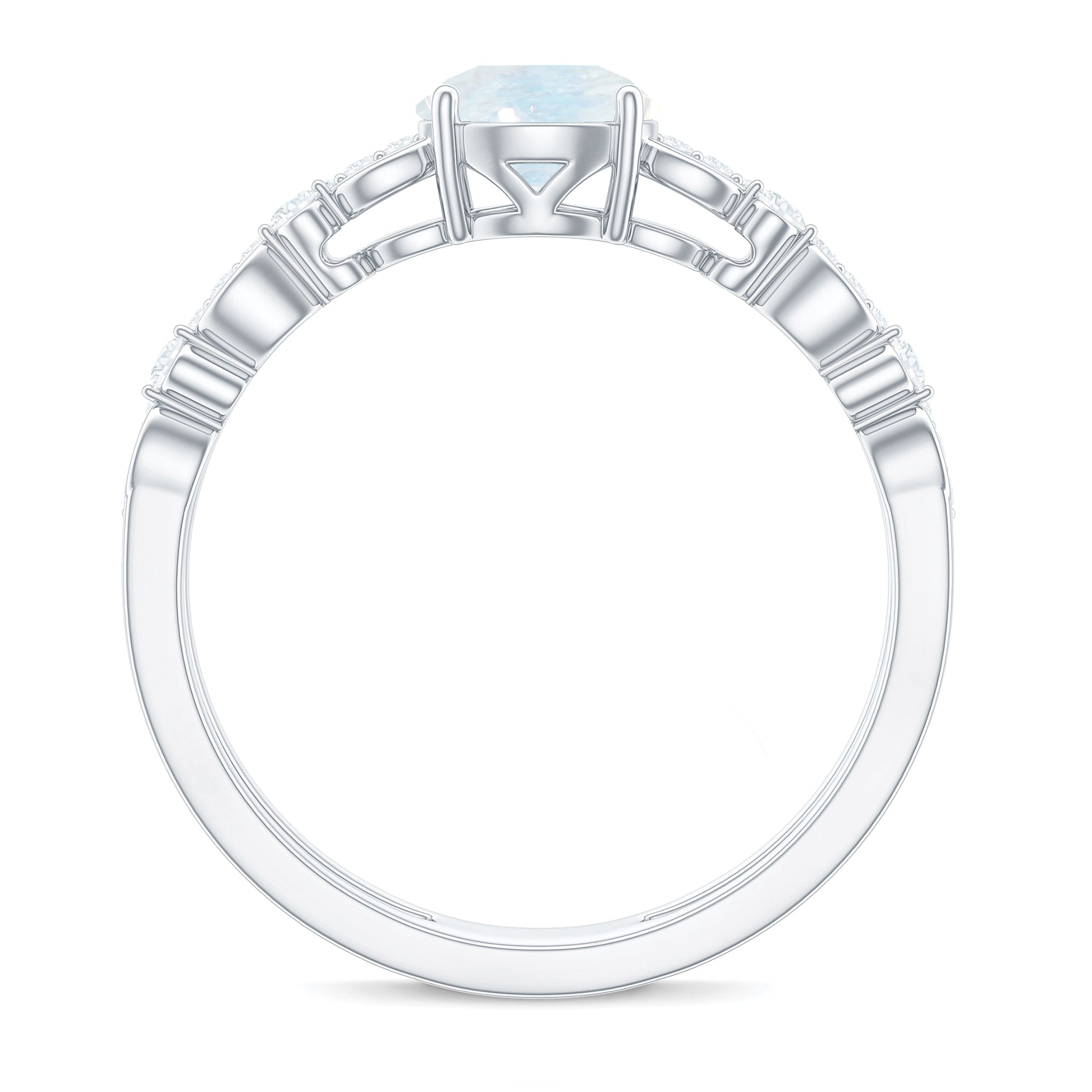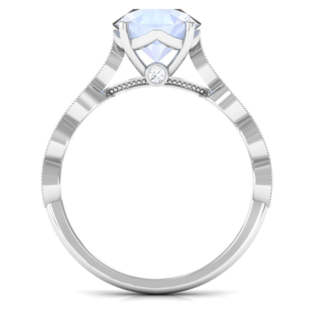Easily the most sophisticated and Simple Moonstone Ring in the entire collection, a Solitaire Style features the Centerpiece of a Moonstone (of any shape) that stands out on its own. The Moonstone Solitaire here is at least 6 MM in size, which also makes it a one-of-a-kind choice of Moonstone Engagement Ring. It is fashioned in a versatile number of shapes that cater to just as many senses of style. While a Round or Oval Moonstone Ring exudes a conventional touch, a ring adorned with a princess, marquise, or pear-cut Moonstone is more on the fancier side of the spectrum. On the other hand, if you’re on the hunt for an Antique Moonstone Ring, go for the one fashioned in Emerald, Cushion, or Asscher cut Center stone.