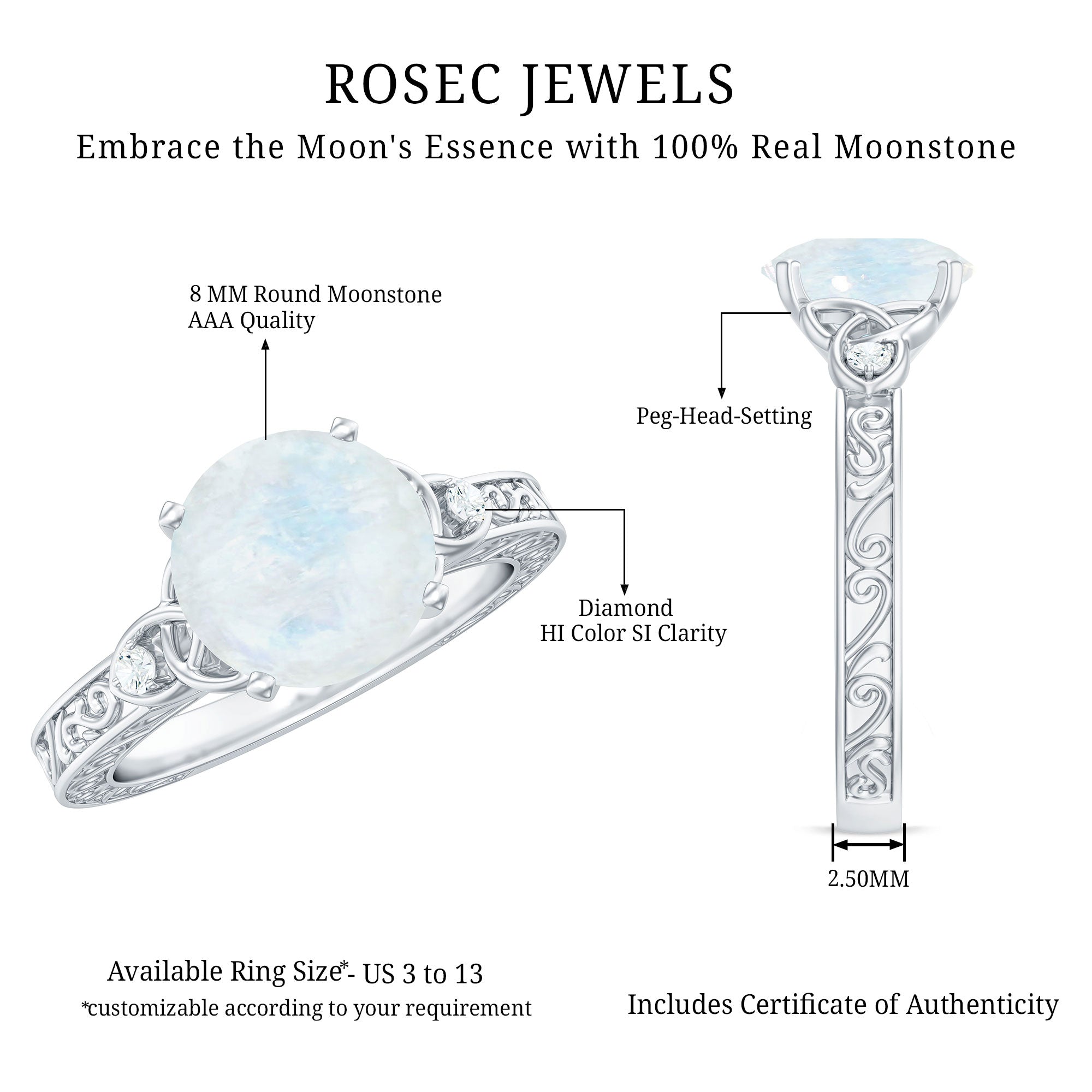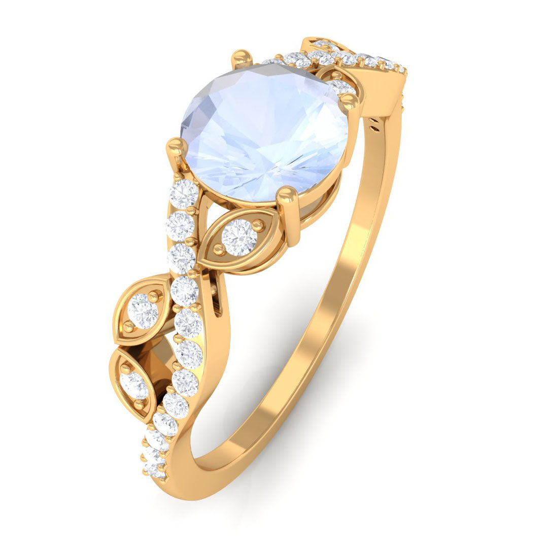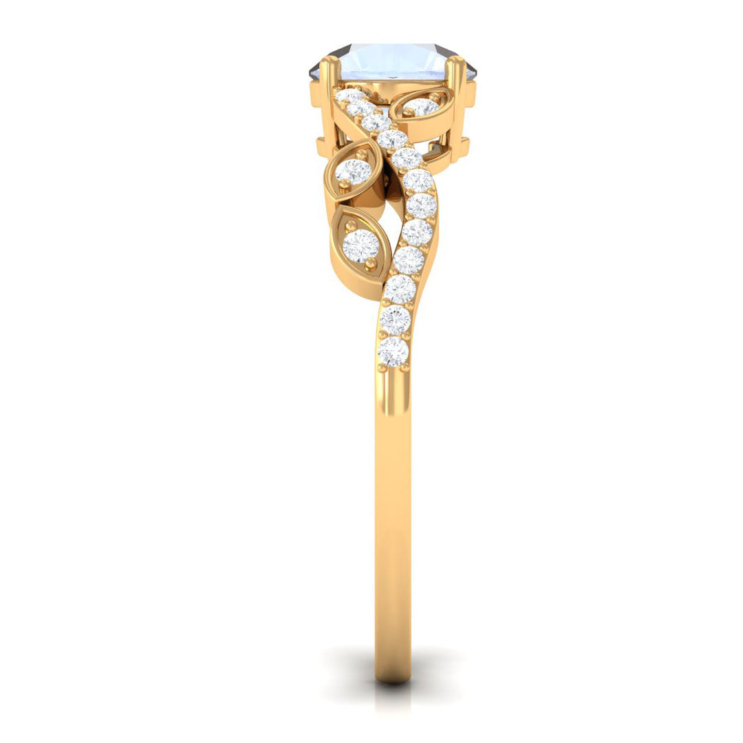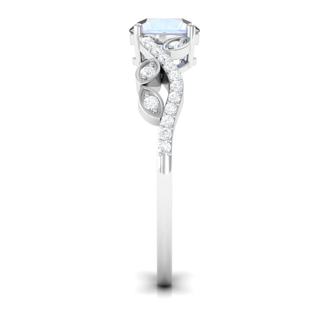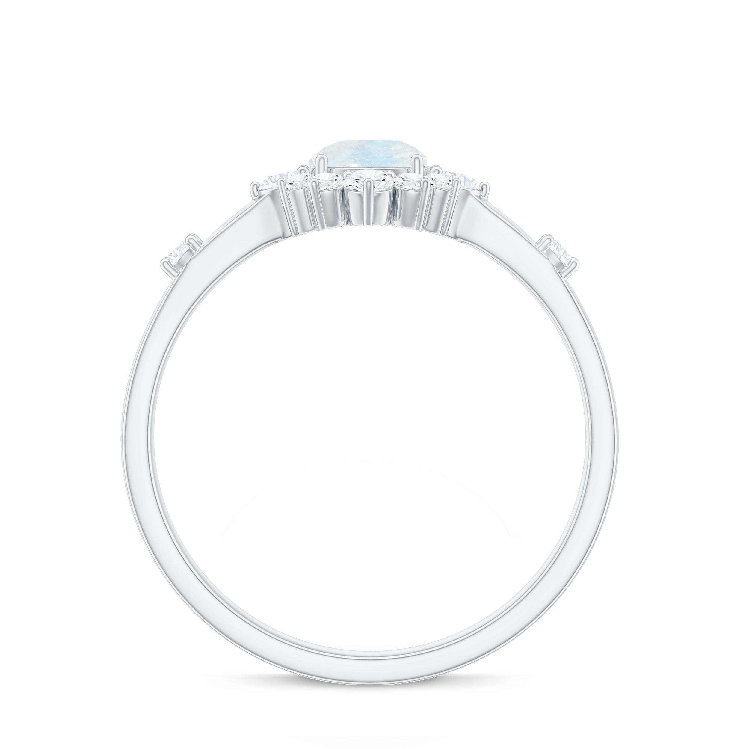 Easily the most sophisticated and Simple Moonstone Ring in the entire collection, a Solitaire Style features the Centerpiece of a Moonstone (of any shape) that stands out on its own. The Moonstone Solitaire here is at least 6 MM in size, which also makes it a one-of-a-kind choice of Moonstone Engagement Ring. It is fashioned in a versatile number of shapes that cater to just as many senses of style. While a Round or Oval Moonstone Ring exudes a conventional touch, a ring adorned with a princess, marquise, or pear-cut Moonstone is more on the fancier side of the spectrum. On the other hand, if you’re on the hunt for an Antique Moonstone Ring, go for the one fashioned in Emerald, Cushion, or Asscher cut Center stone.