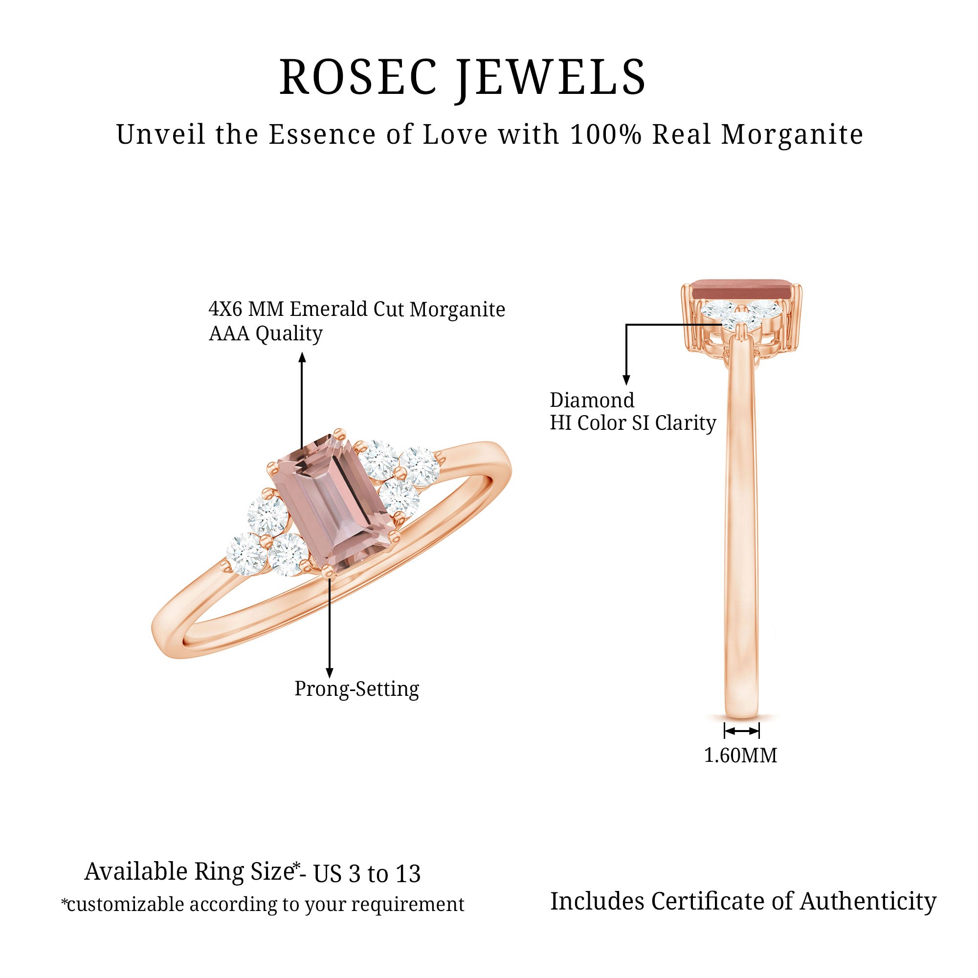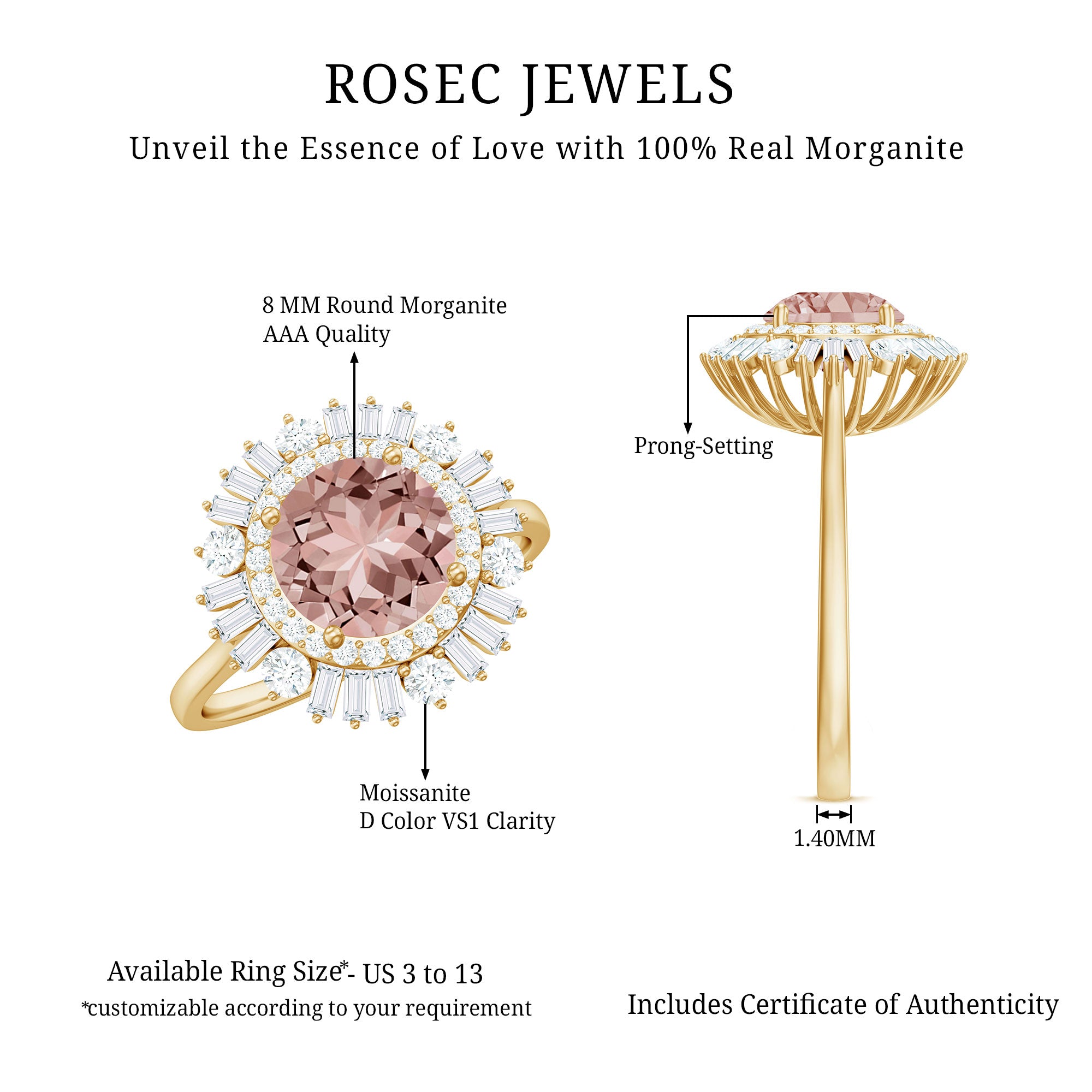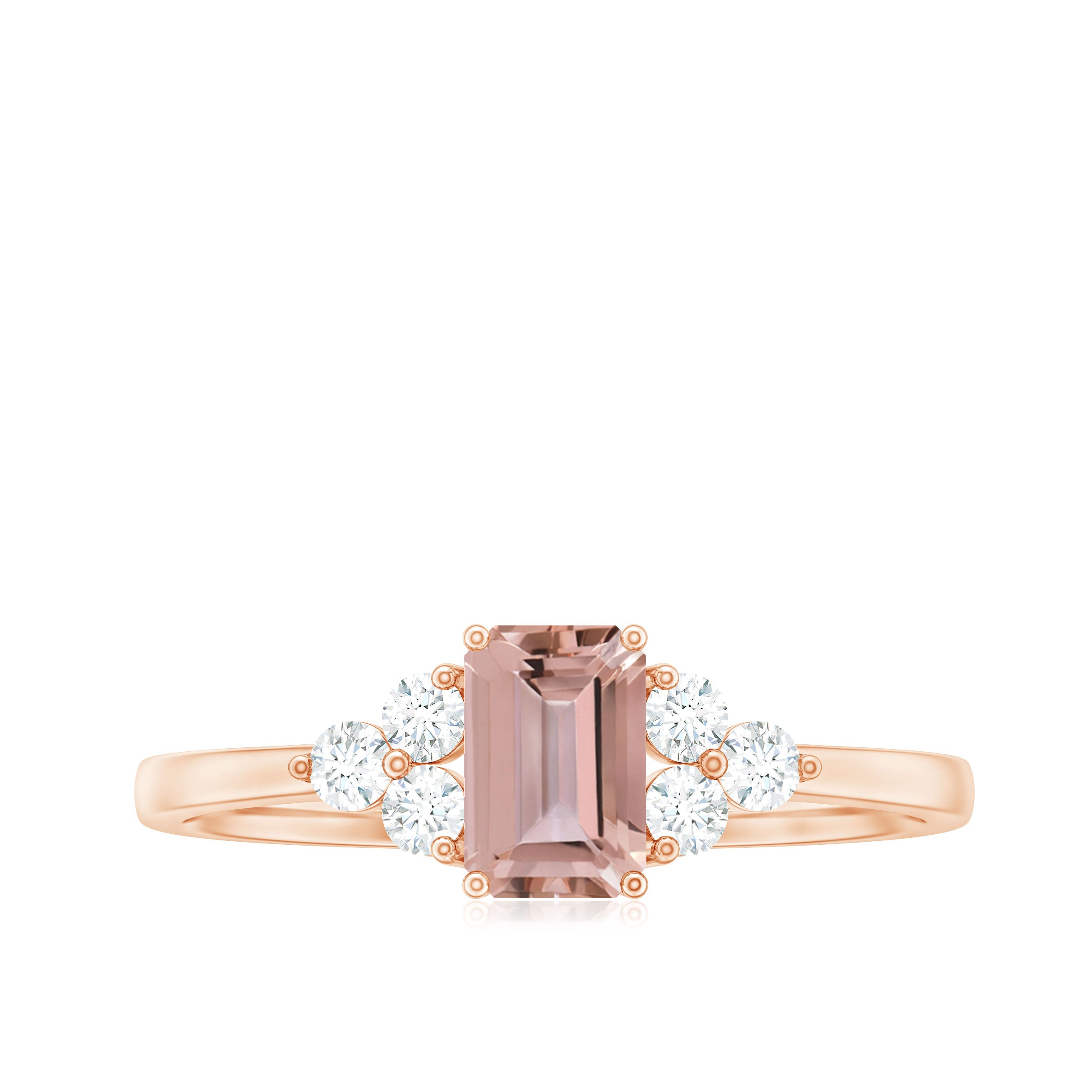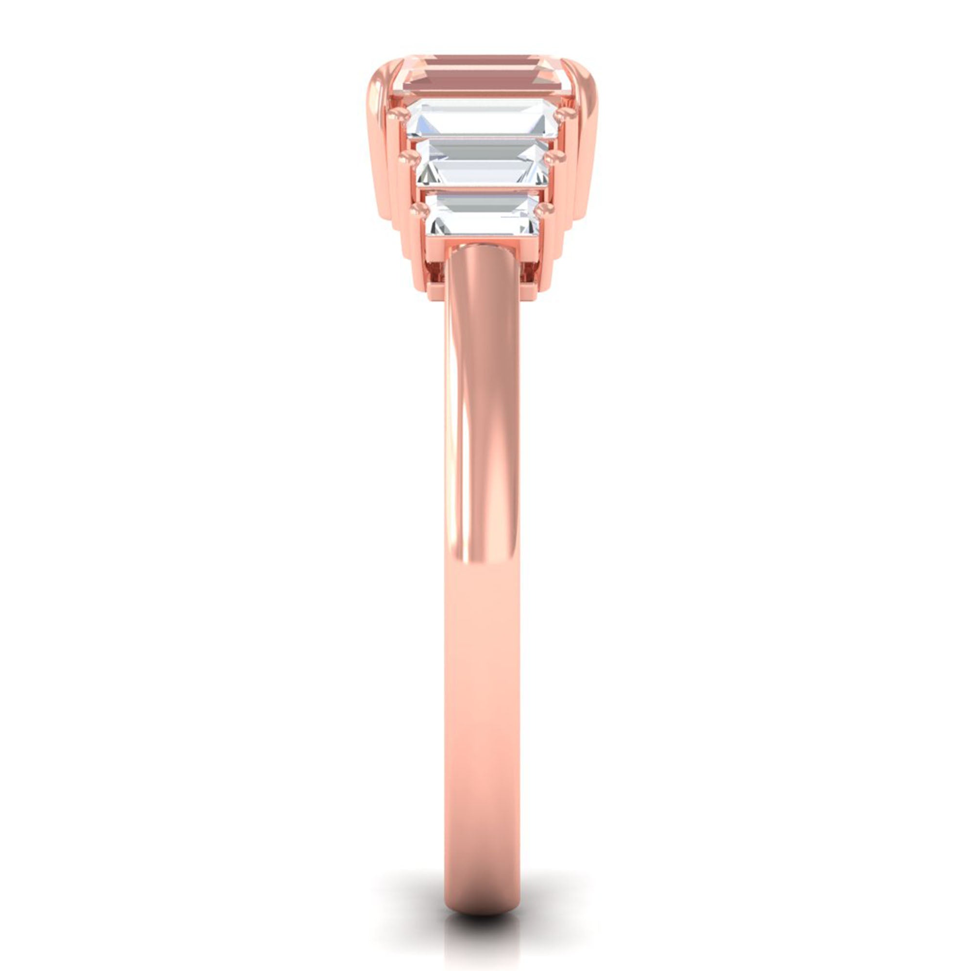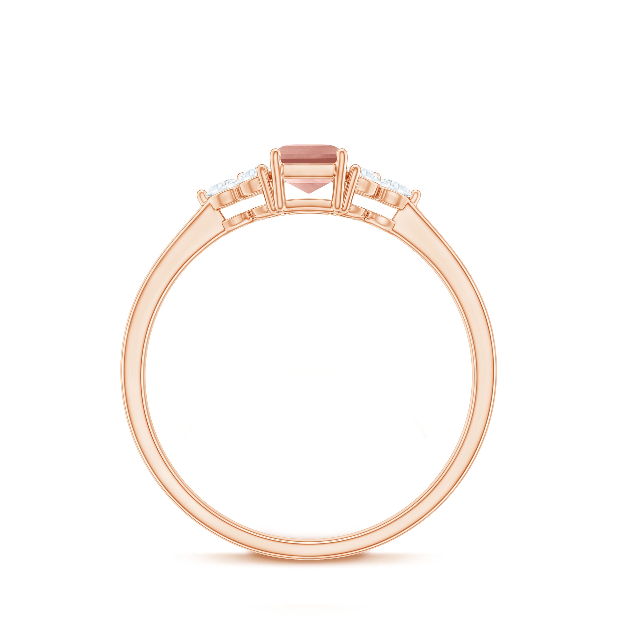 Morganite rose gold rings feature blush pink hues. Rose gold is a durable metal choice that’s suitable for daily wear. Known for its soft tones, rose gold complements beautifully with the blush tones of morganite. The feminine look of this gem, makes rose gold morganite rings a perfect choice for engagement or wedding rings.