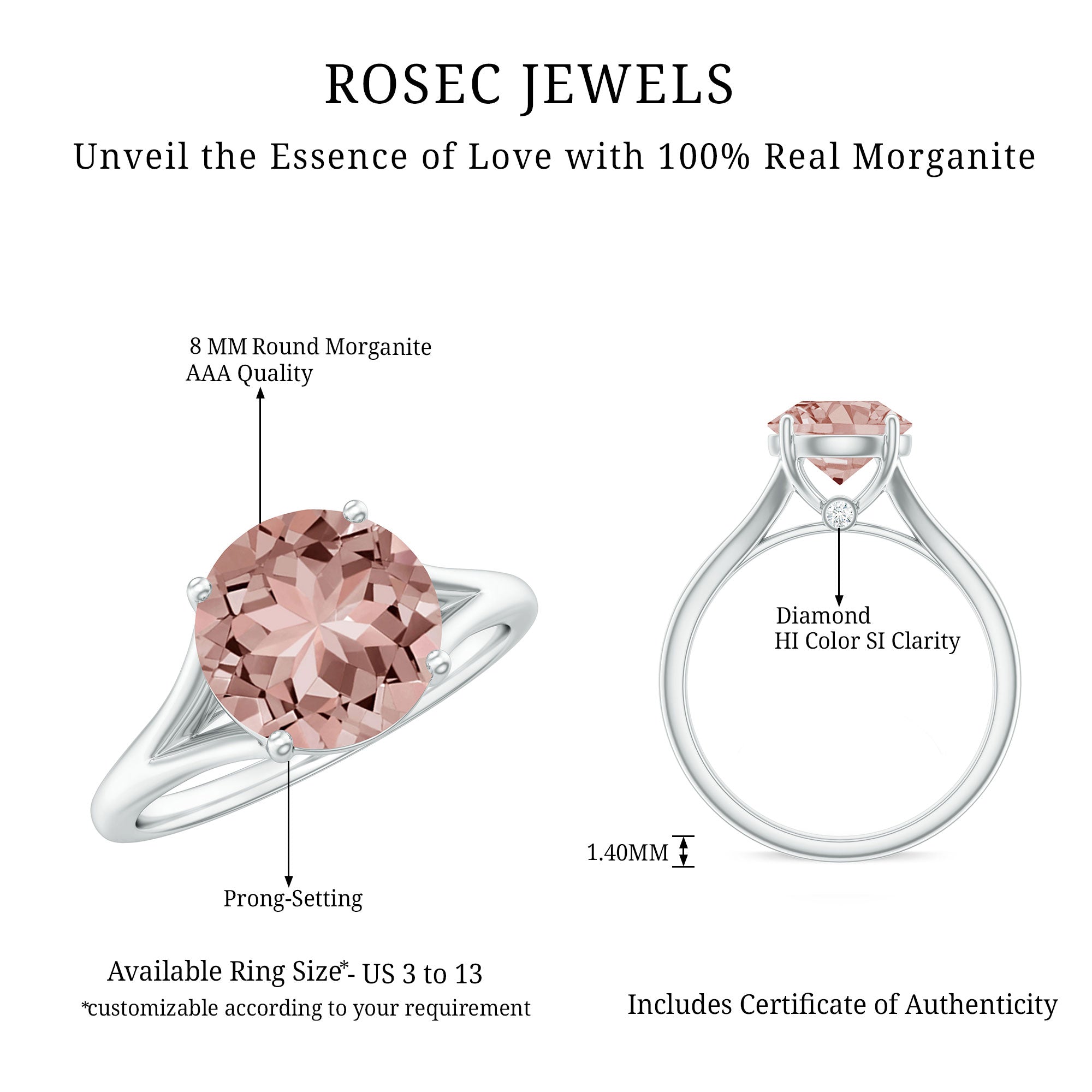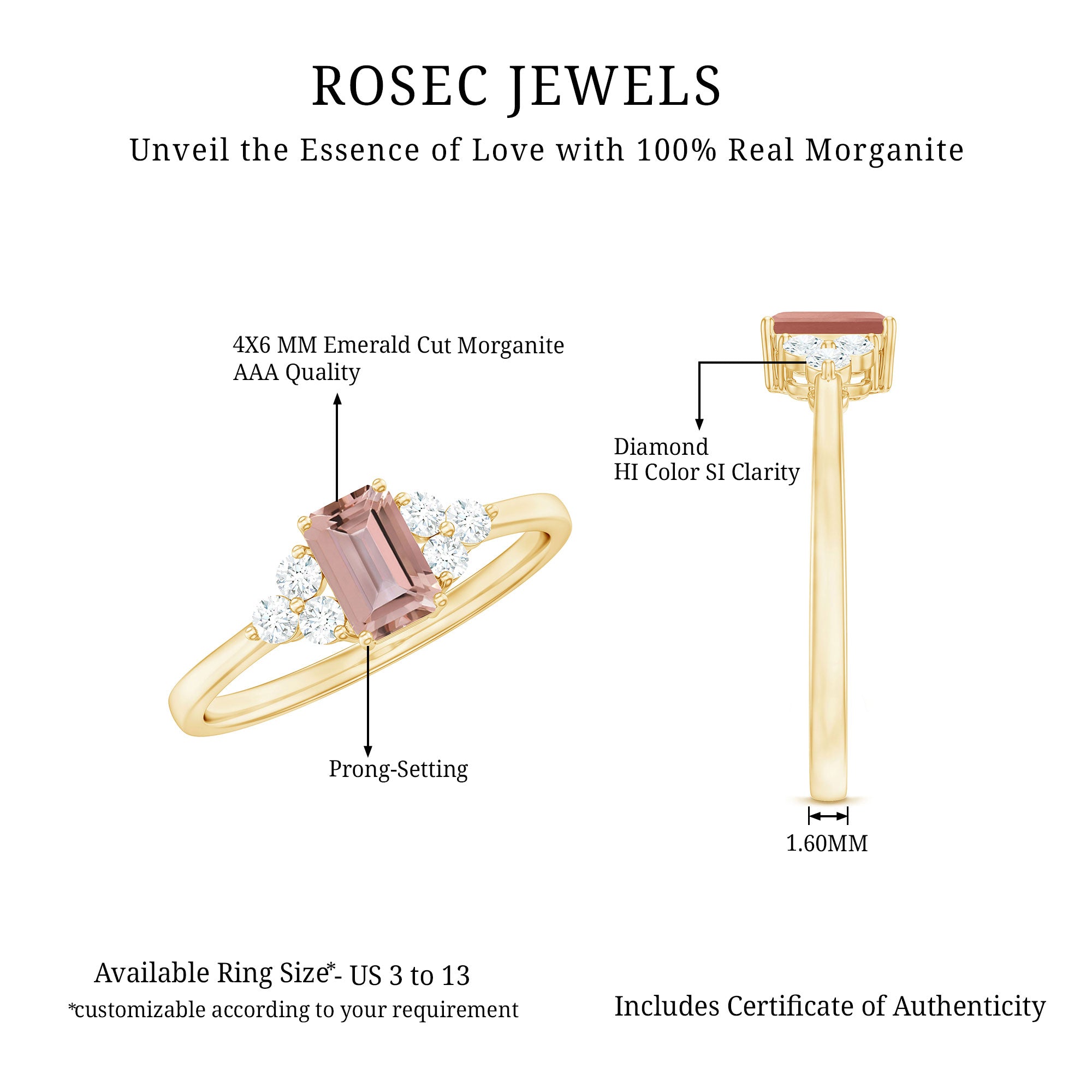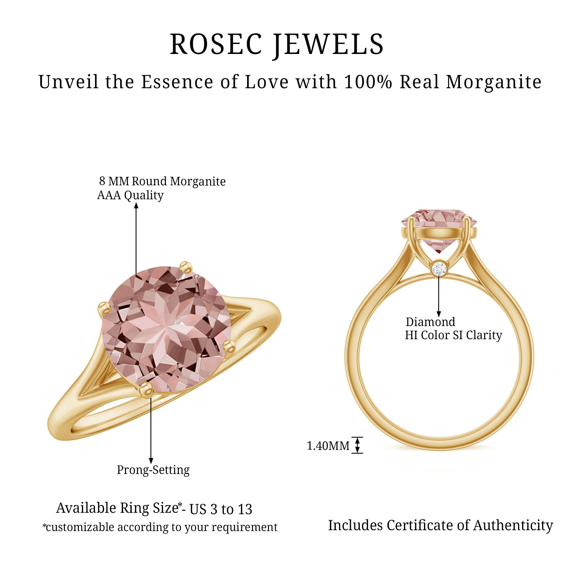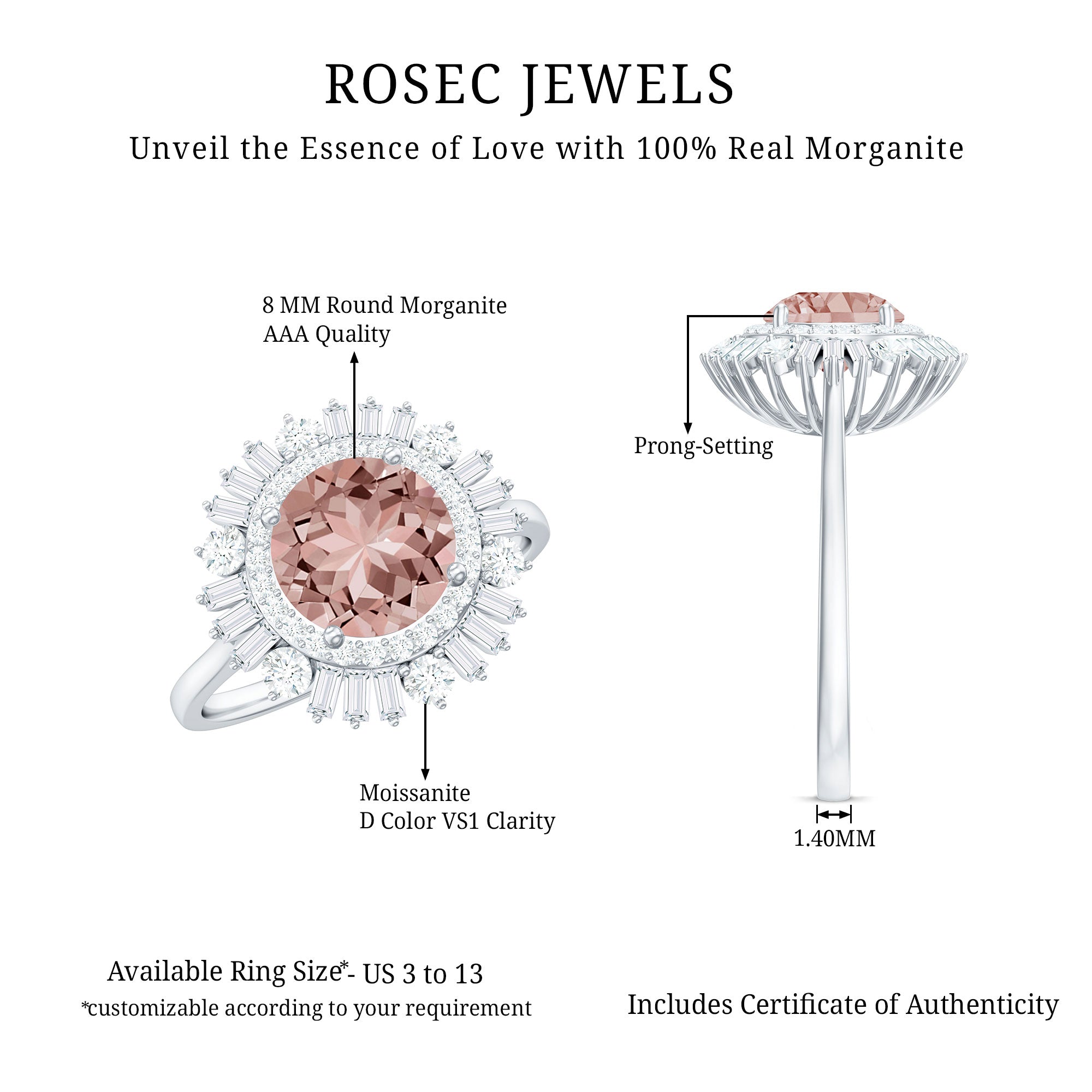 Morganite rose gold rings feature blush pink hues. Rose gold is a durable metal choice that’s suitable for daily wear. Known for its soft tones, rose gold complements beautifully with the blush tones of morganite. The feminine look of this gem, makes rose gold morganite rings a perfect choice for engagement or wedding rings.