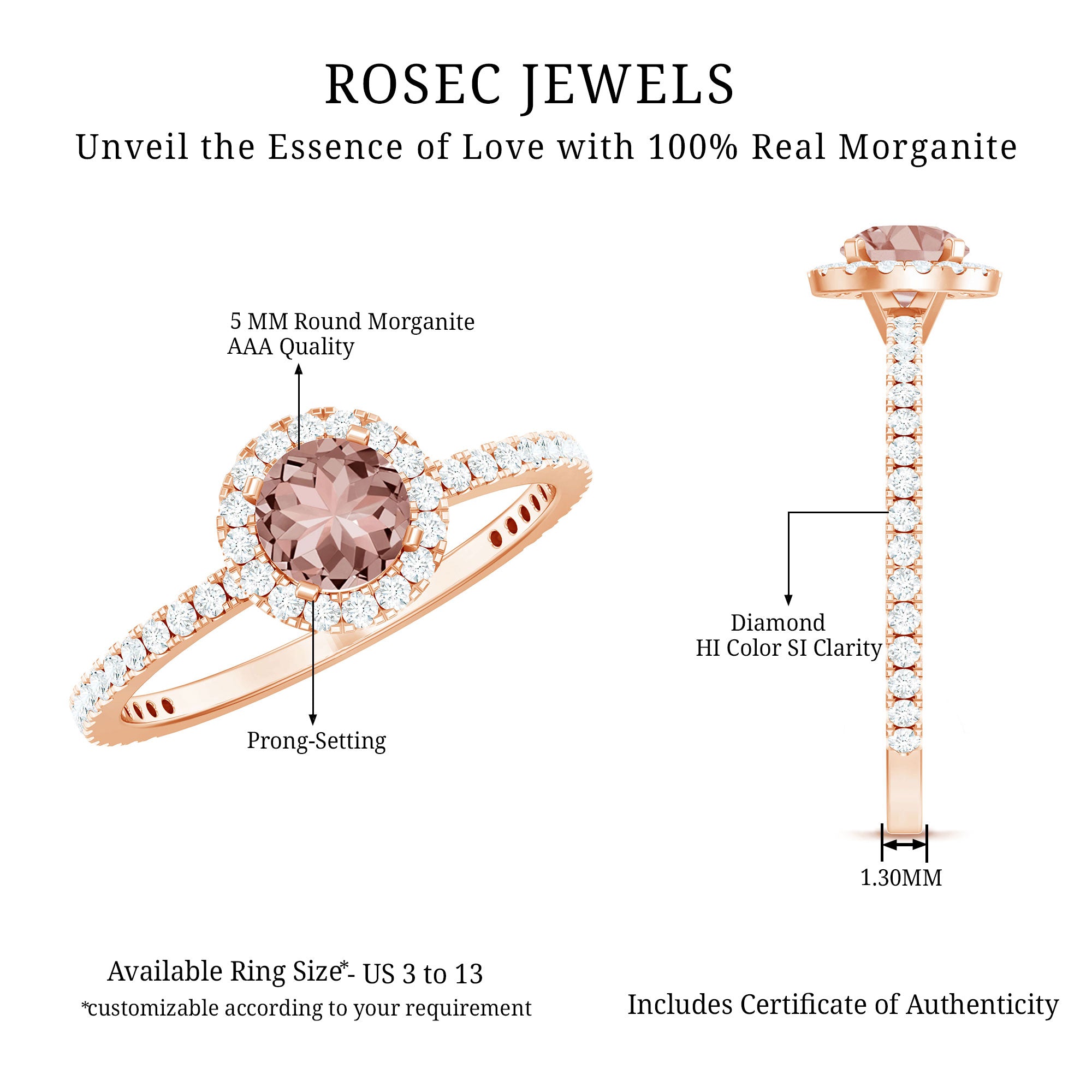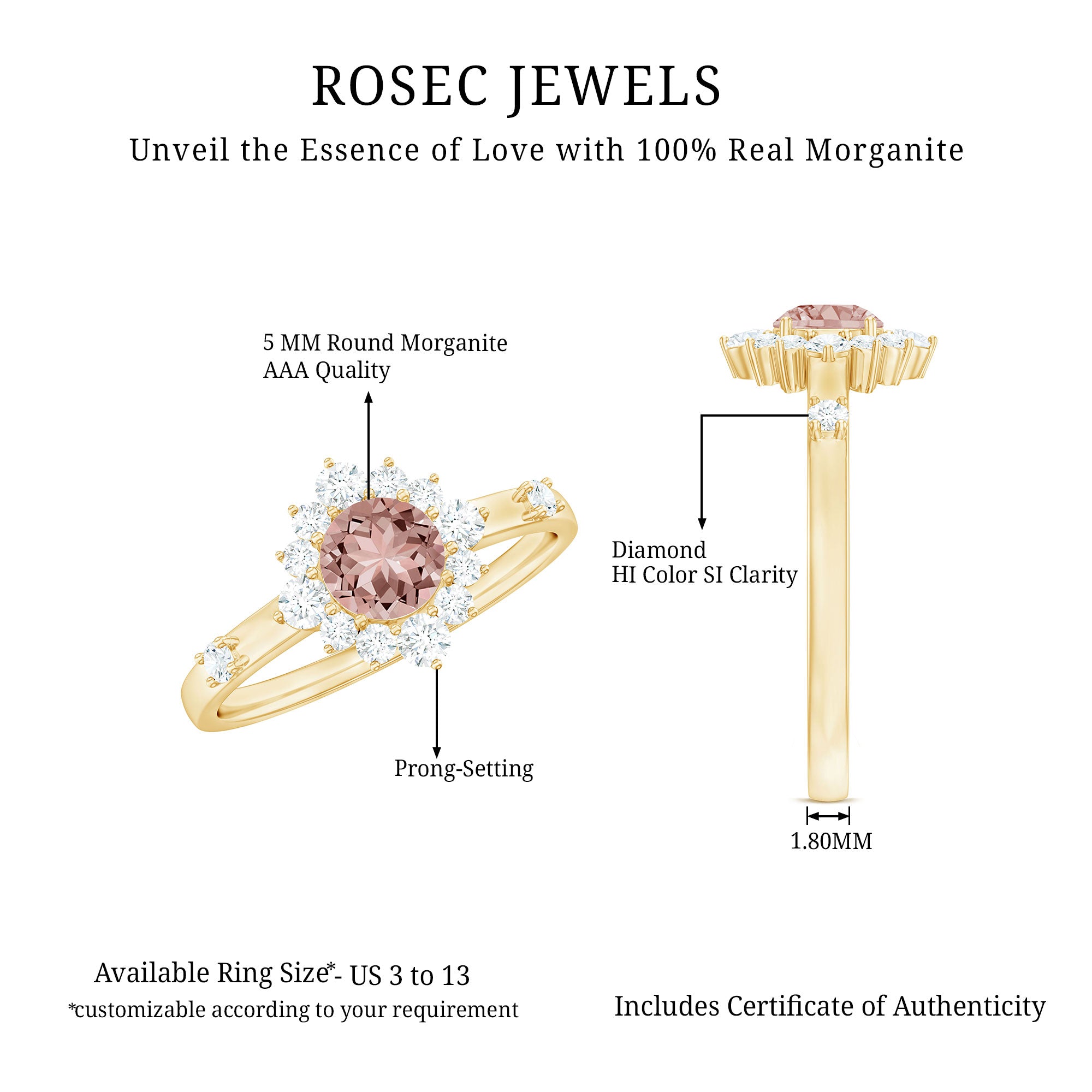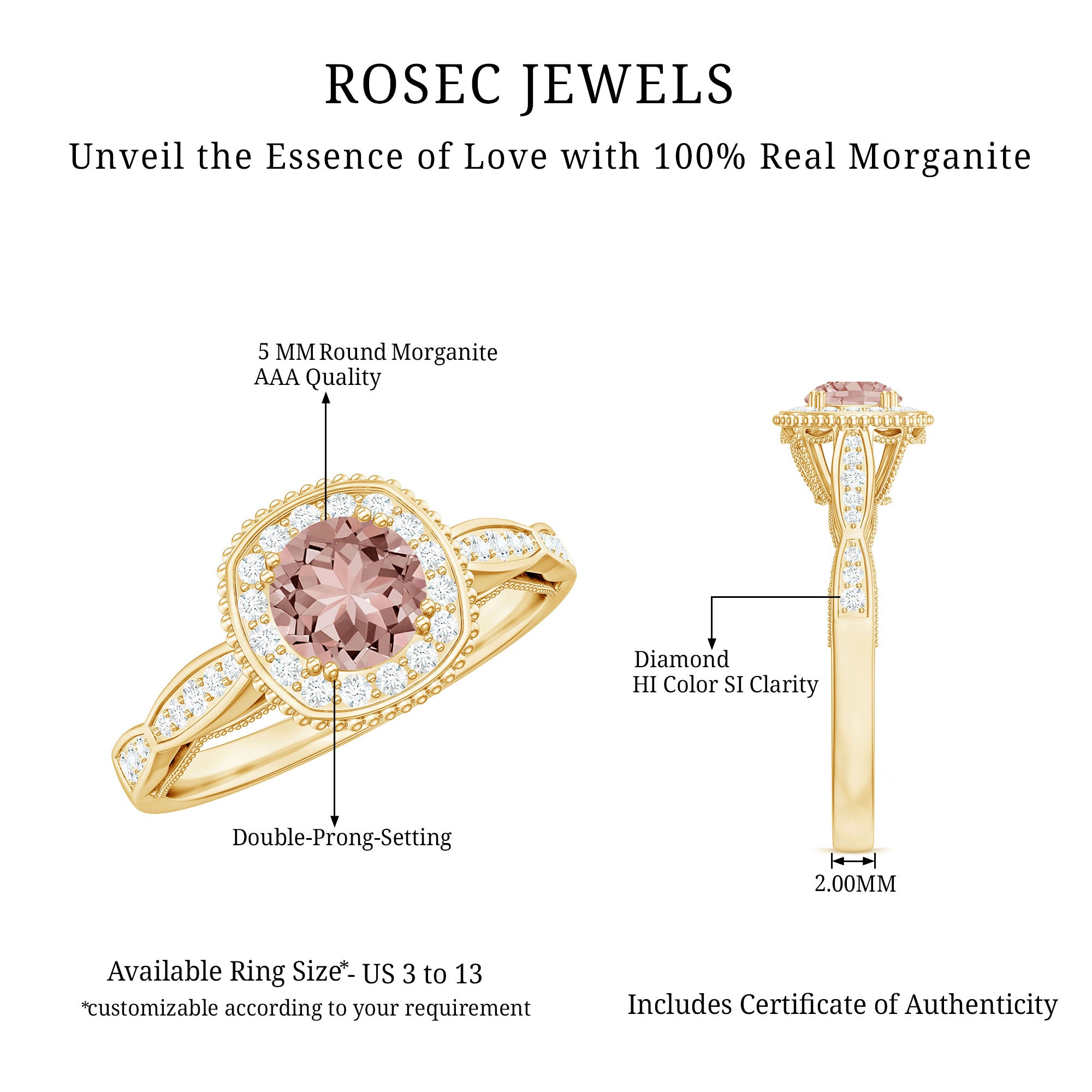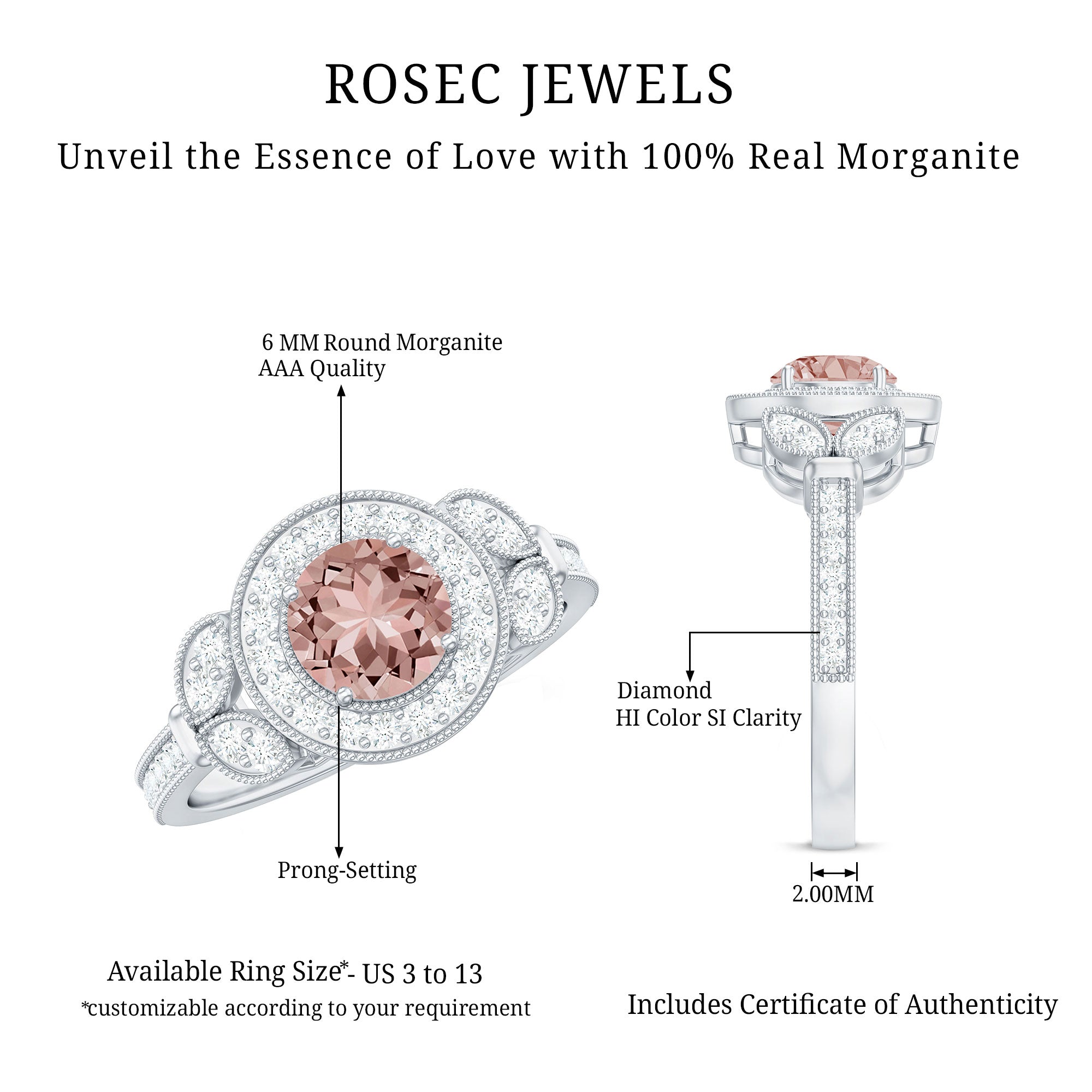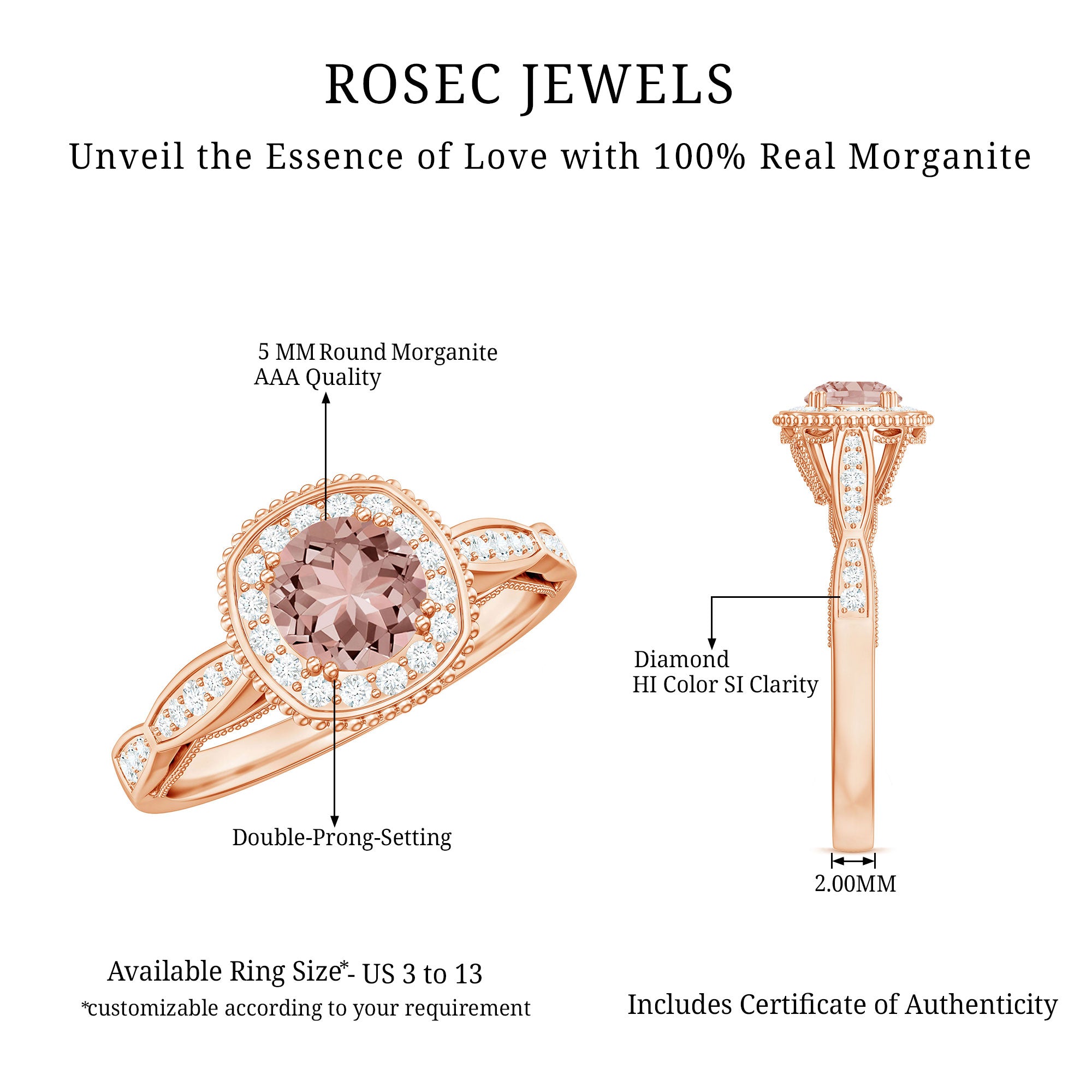 Morganite rose gold rings feature blush pink hues. Rose gold is a durable metal choice that’s suitable for daily wear. Known for its soft tones, rose gold complements beautifully with the blush tones of morganite. The feminine look of this gem, makes rose gold morganite rings a perfect choice for engagement or wedding rings.