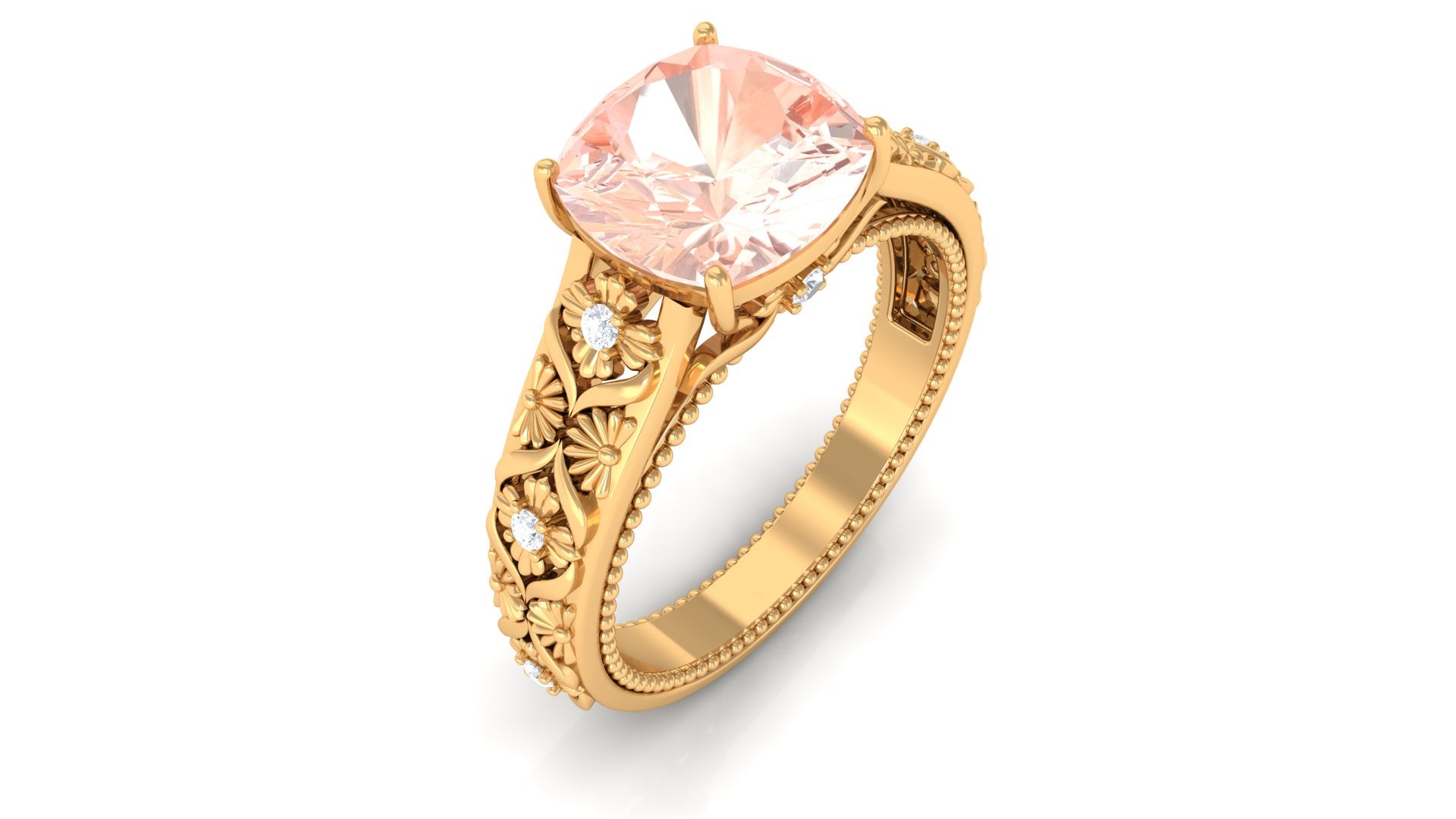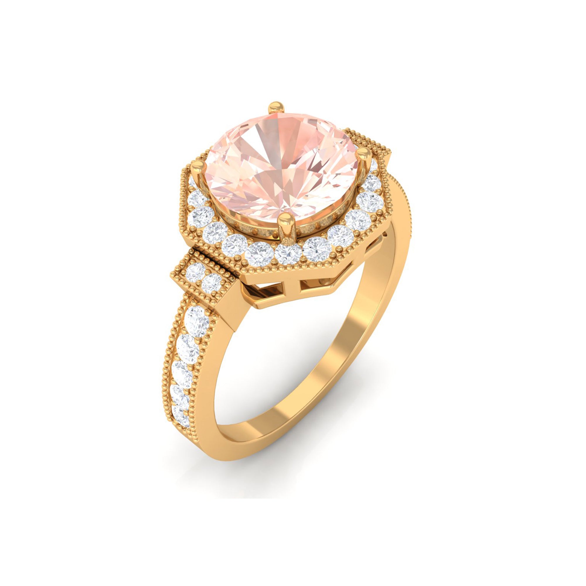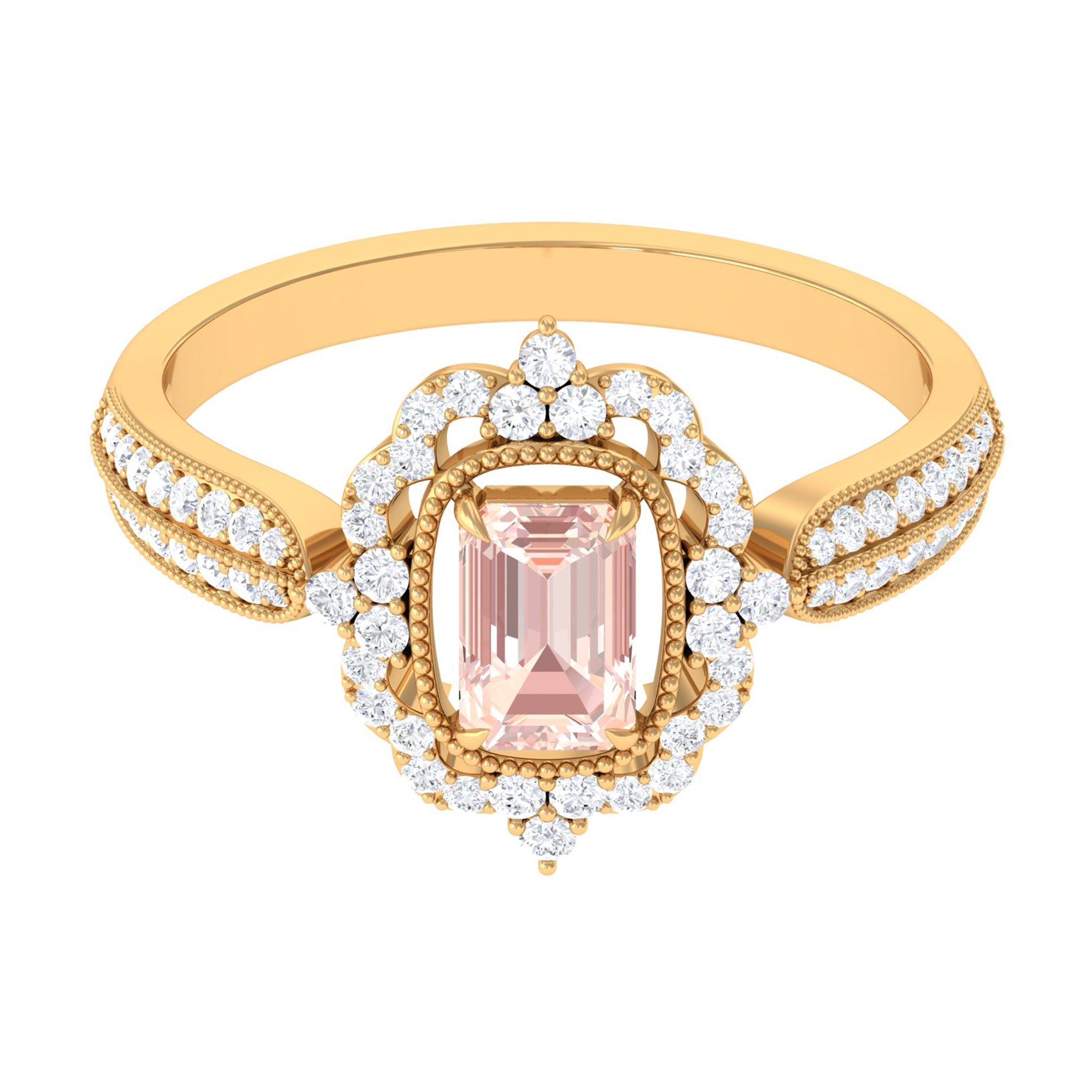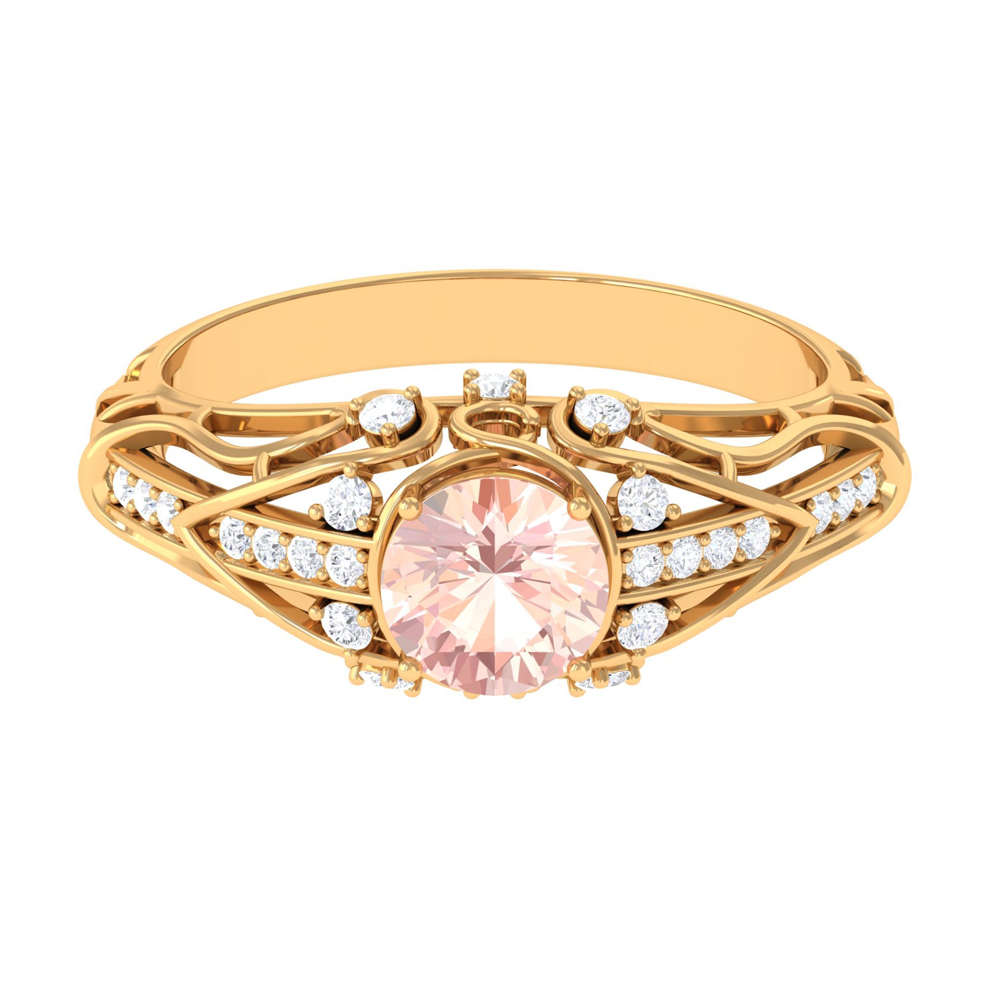 Standing the test of time, a Vintage Morganite Ring boasts ornate designs that are inspired by the Art Deco, Edwardian, and Victorian Eras. In a broader context, it features art-forward geometric patterns as well as intricate milgrain, filigree, and antique engravings that are brought to life with heavy metalwork. With the old-world vibe of these designs complementing the feminine appeal of Morganite, this Antique Morganite Ring offers you the best of both worlds.