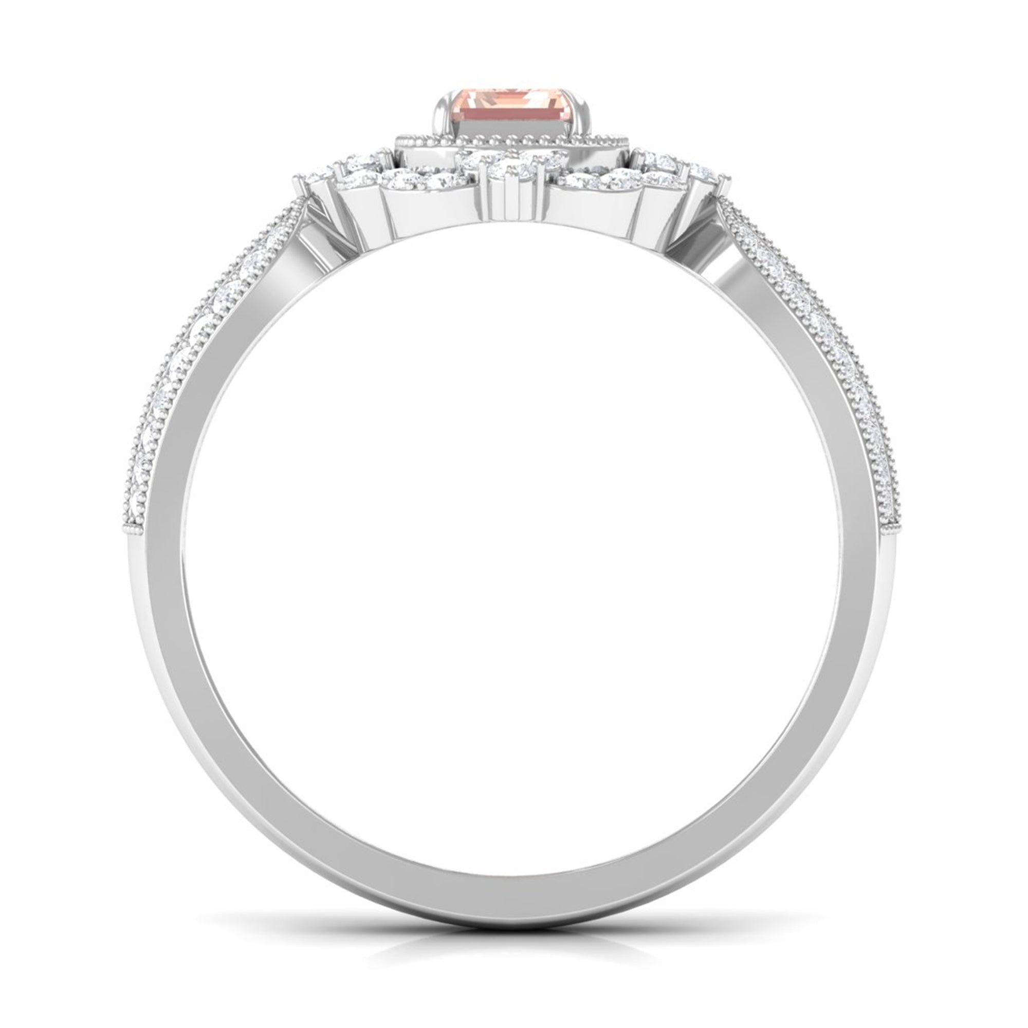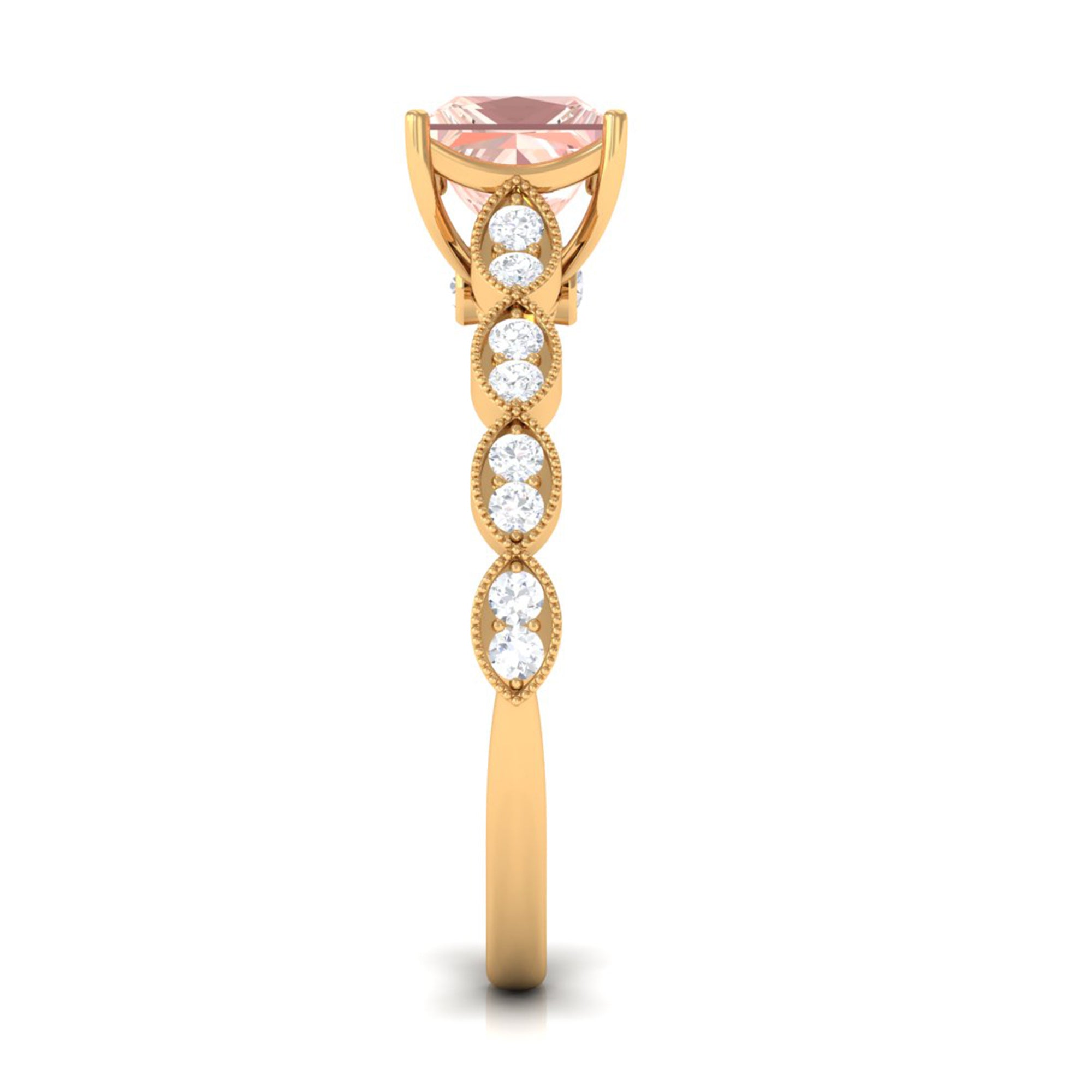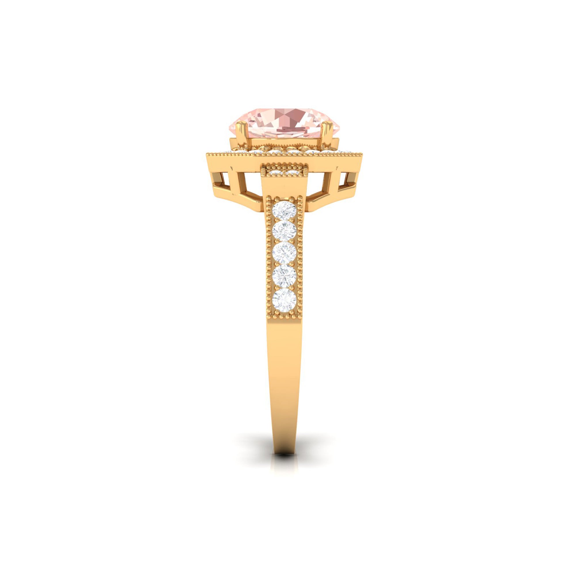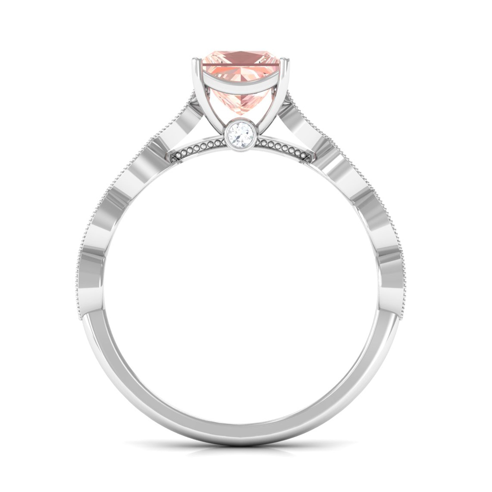 Forever in trend, a Solitaire Morganite Ring boasts a solo centerpiece of Morganite (that is meant to shine out with its enormous size of 6 MM or more). This style makes for one of the most classic cum conventional choices in the Morganite Engagement Ring. What’s more, this timeless style offers you a wide scope of versatility. It ranges from a Round Morganite Ring for the traditional bride to fancier ones like Marquise, Pear, or Princess Cut Solitaire Ring for the bride who likes to keep up with the trends. On the other hand, if nothing appeals quite like a little vintage touch, you can rely on old-school shapes like an Asscher, Cushion, or Emerald Cut Morganite Ring.