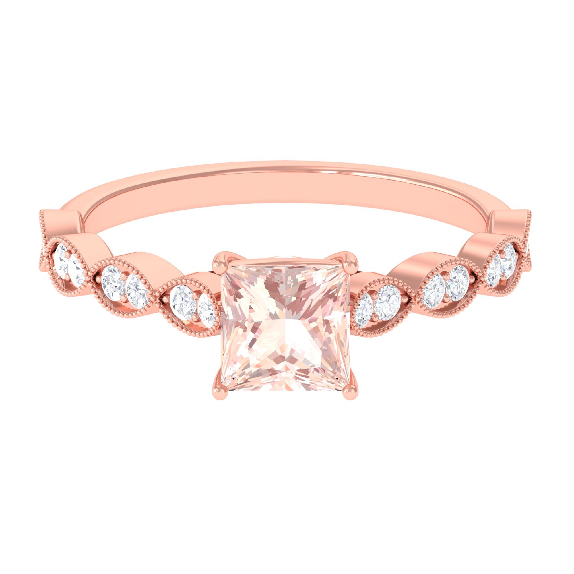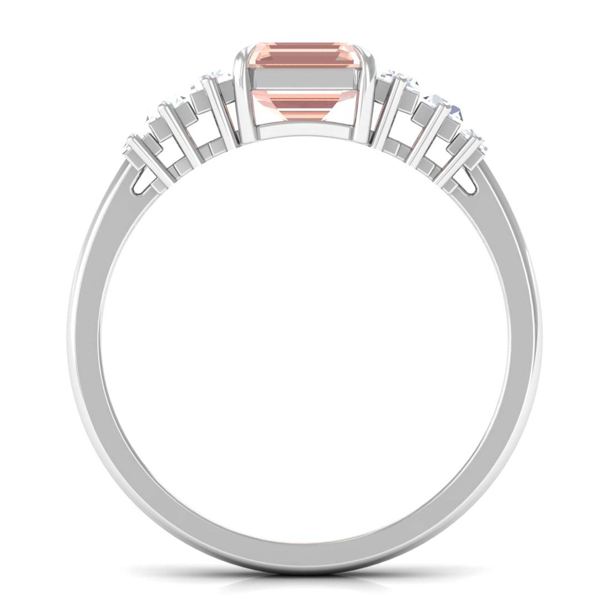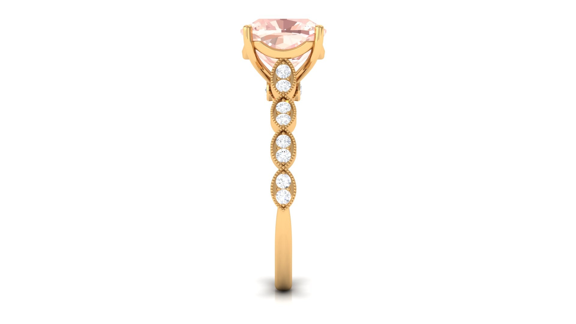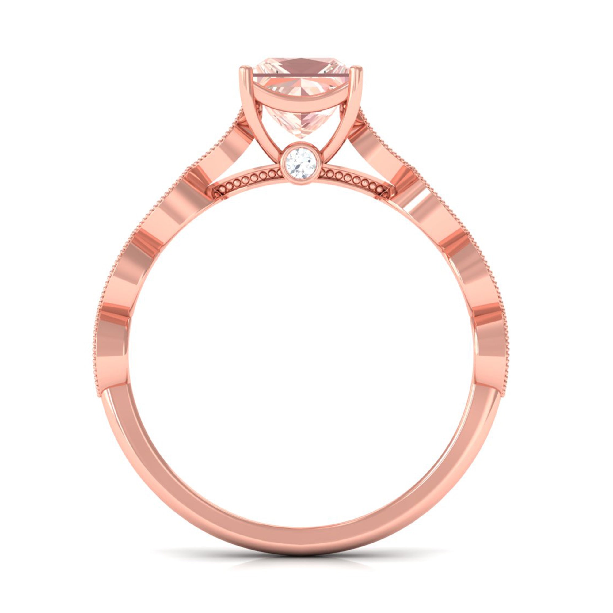 Forever in trend, a Solitaire Morganite Ring boasts a solo centerpiece of Morganite (that is meant to shine out with its enormous size of 6 MM or more). This style makes for one of the most classic cum conventional choices in the Morganite Engagement Ring. What’s more, this timeless style offers you a wide scope of versatility. It ranges from a Round Morganite Ring for the traditional bride to fancier ones like Marquise, Pear, or Princess Cut Solitaire Ring for the bride who likes to keep up with the trends. On the other hand, if nothing appeals quite like a little vintage touch, you can rely on old-school shapes like an Asscher, Cushion, or Emerald Cut Morganite Ring.