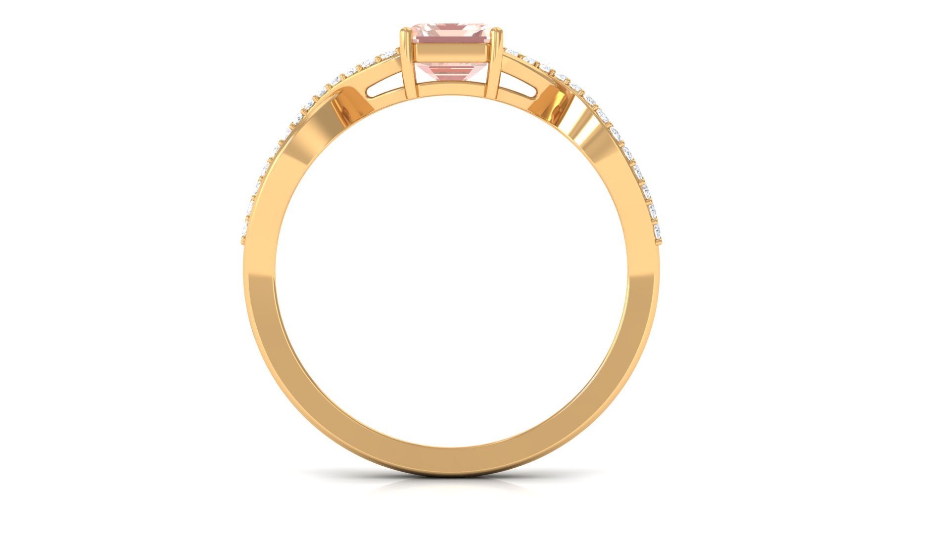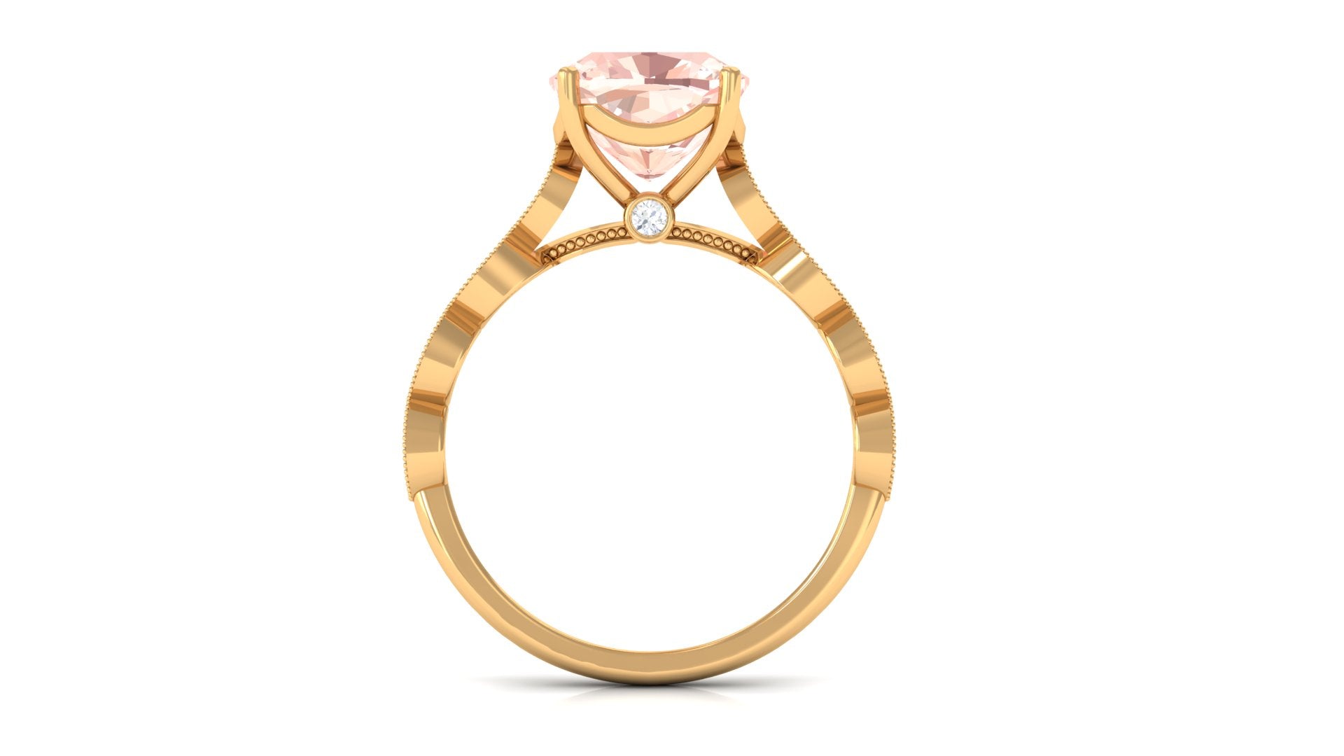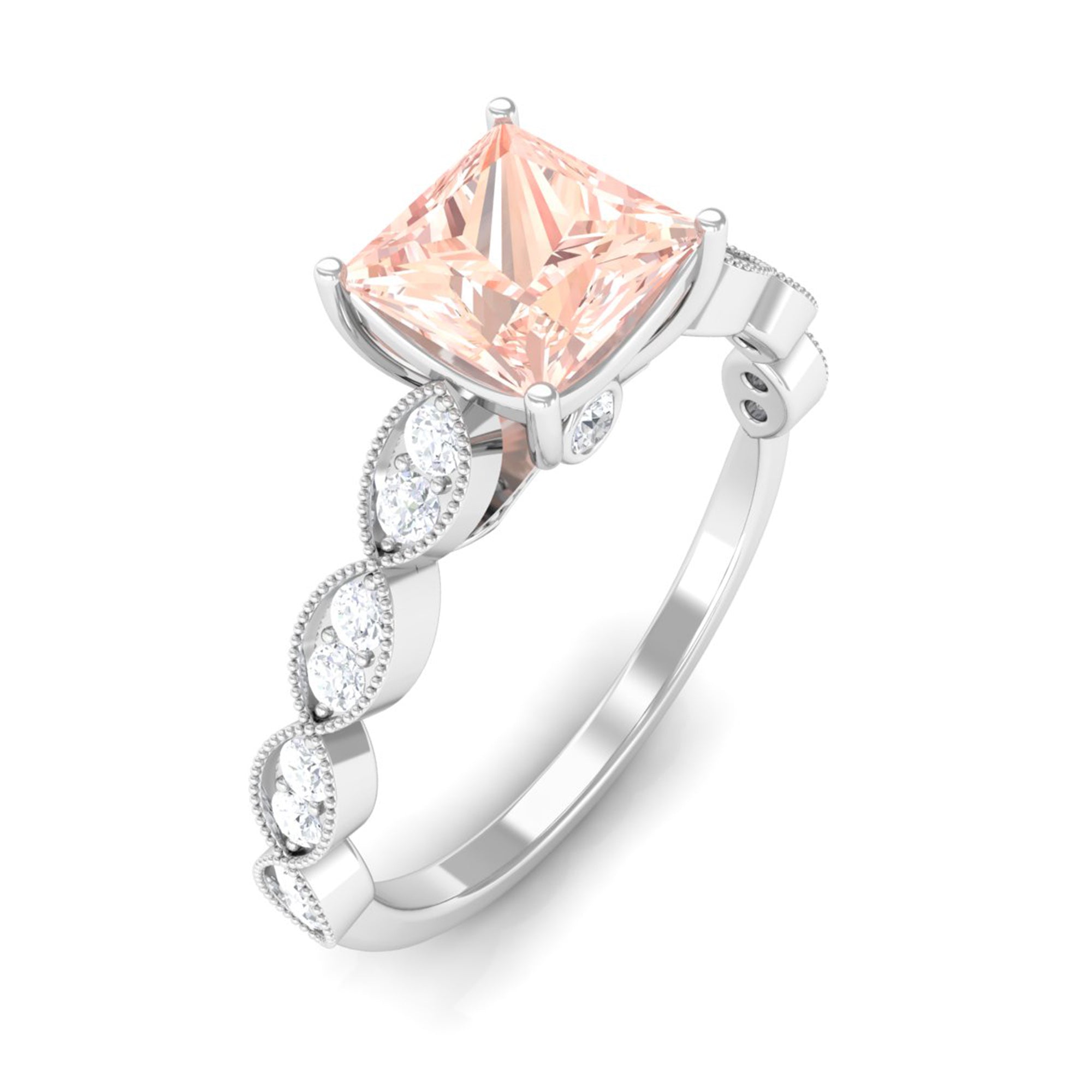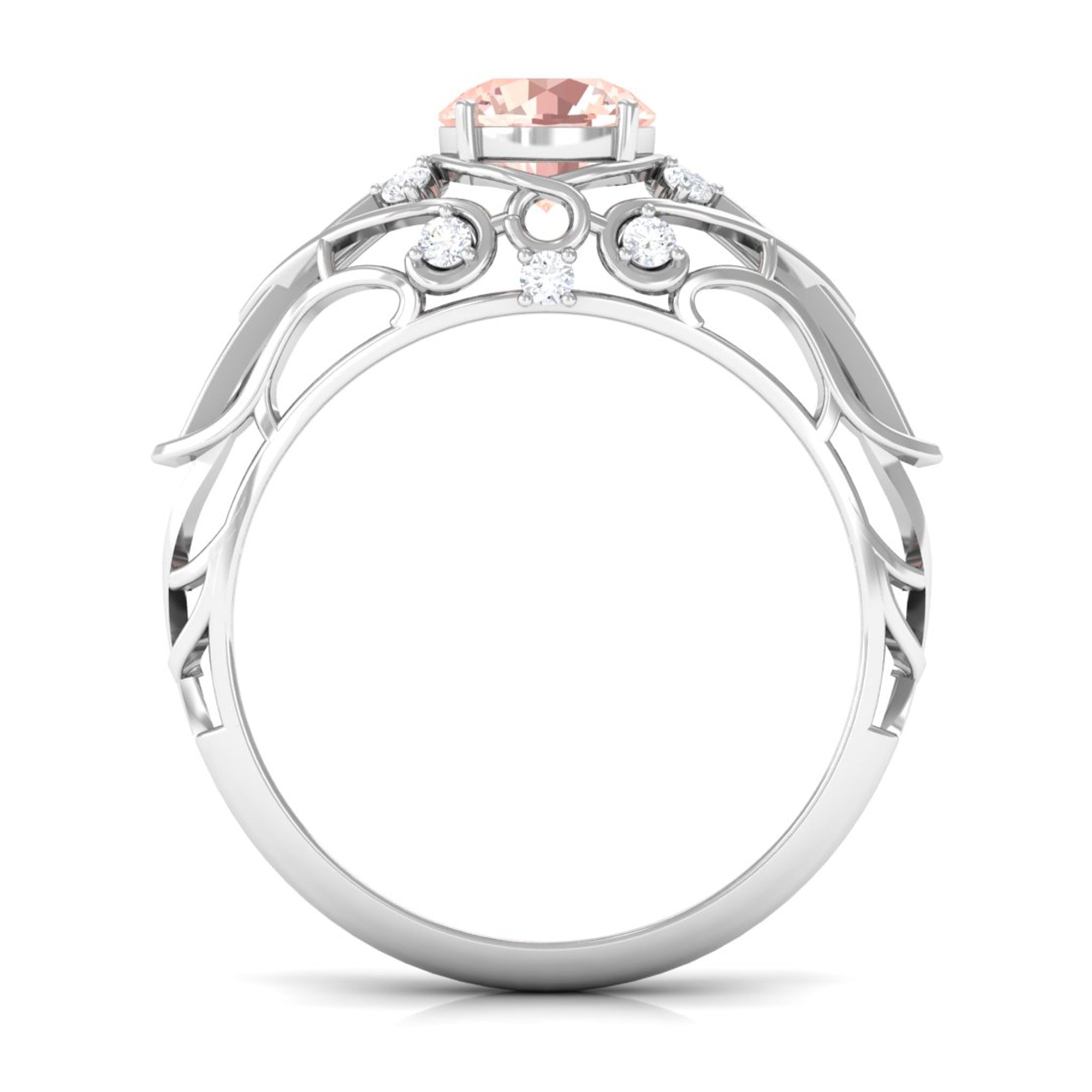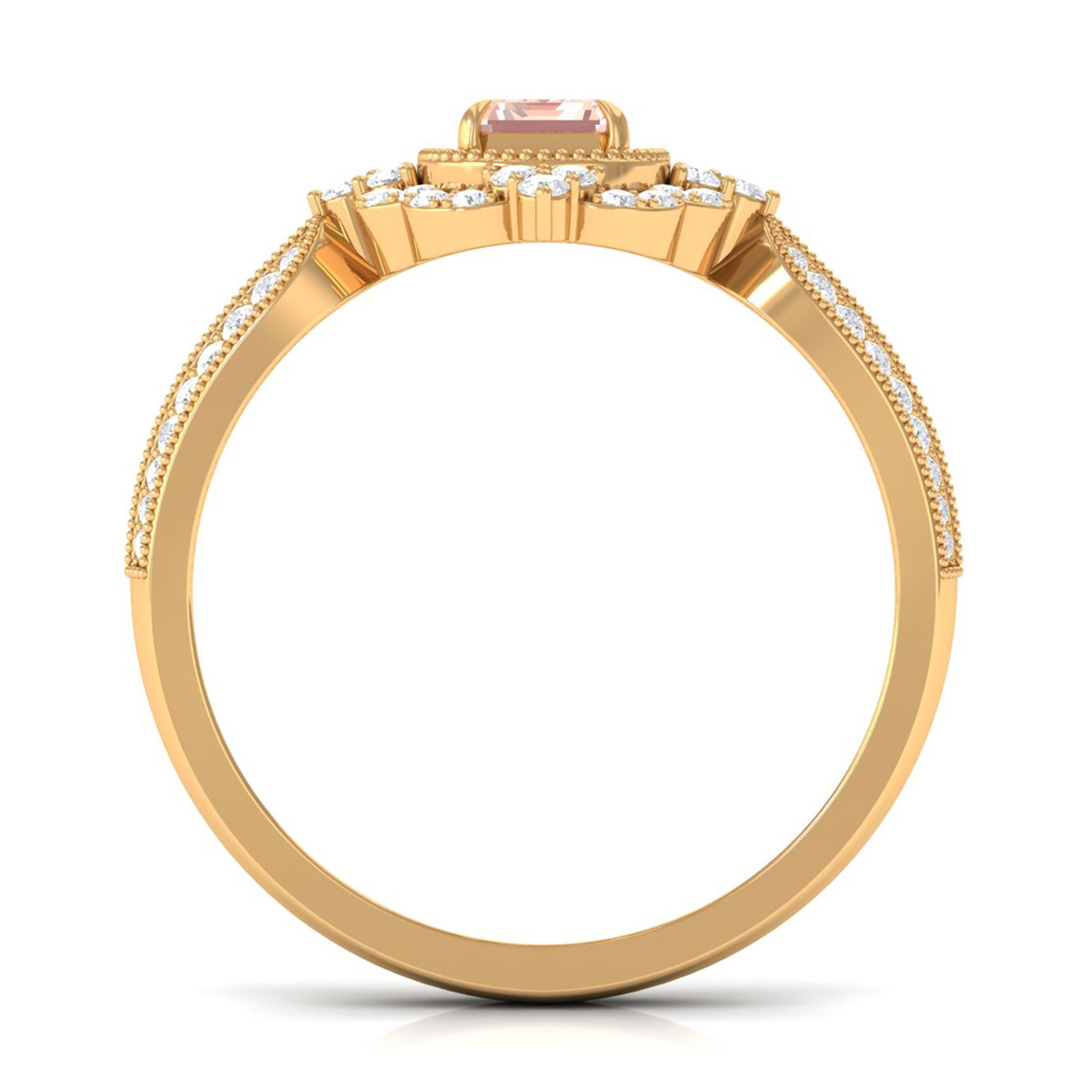 Forever in trend, a Solitaire Morganite Ring boasts a solo centerpiece of Morganite (that is meant to shine out with its enormous size of 6 MM or more). This style makes for one of the most classic cum conventional choices in the Morganite Engagement Ring. What’s more, this timeless style offers you a wide scope of versatility. It ranges from a Round Morganite Ring for the traditional bride to fancier ones like Marquise, Pear, or Princess Cut Solitaire Ring for the bride who likes to keep up with the trends. On the other hand, if nothing appeals quite like a little vintage touch, you can rely on old-school shapes like an Asscher, Cushion, or Emerald Cut Morganite Ring.