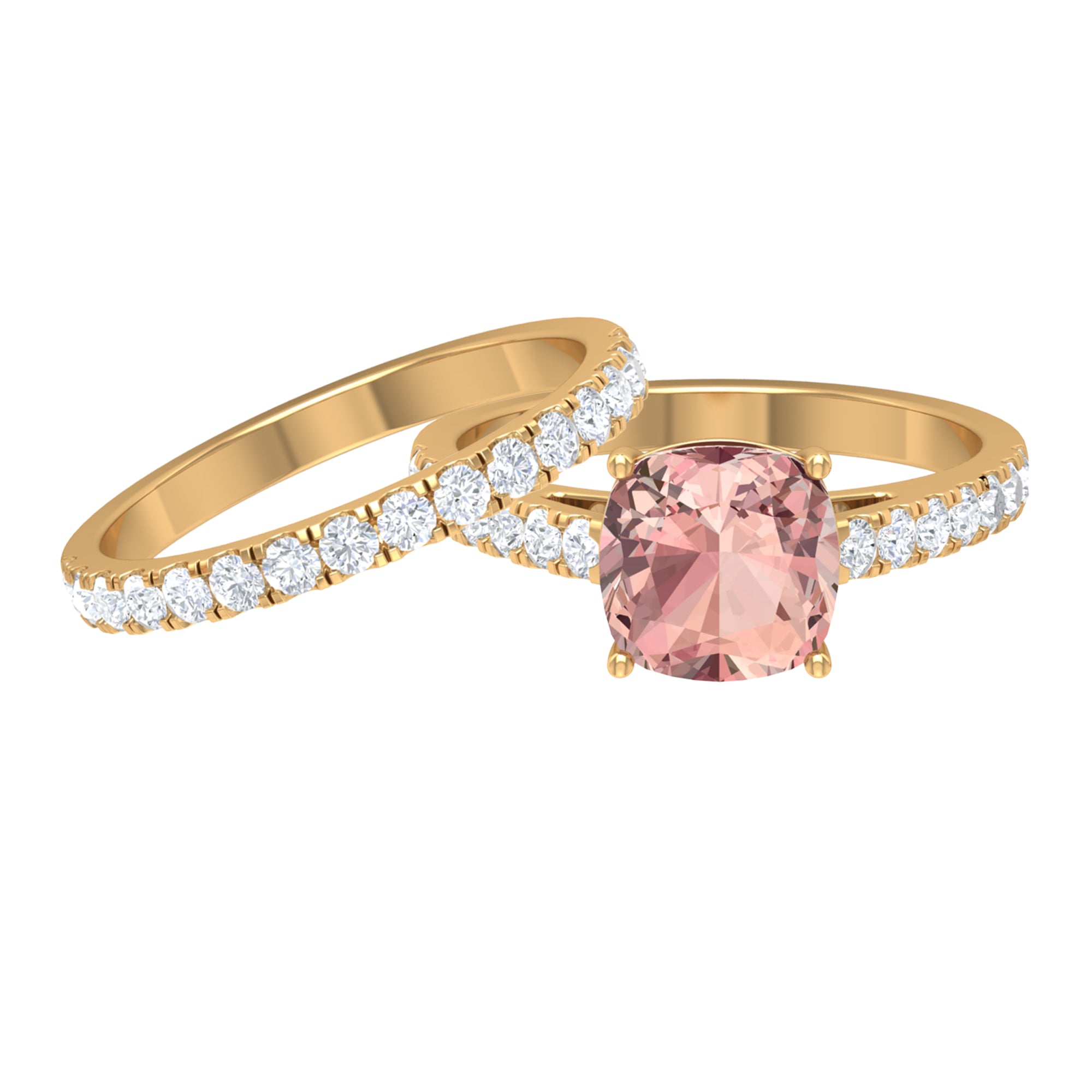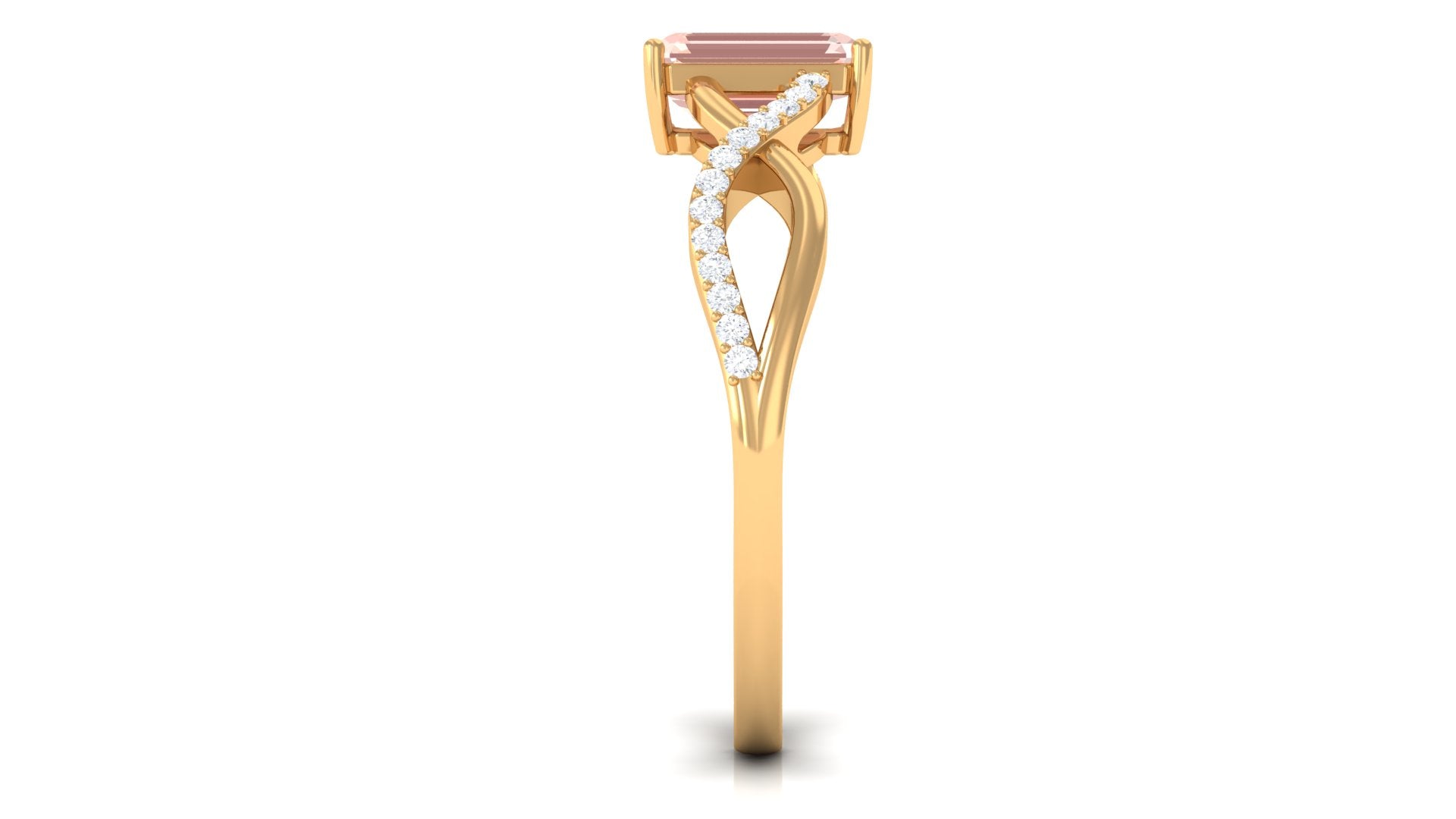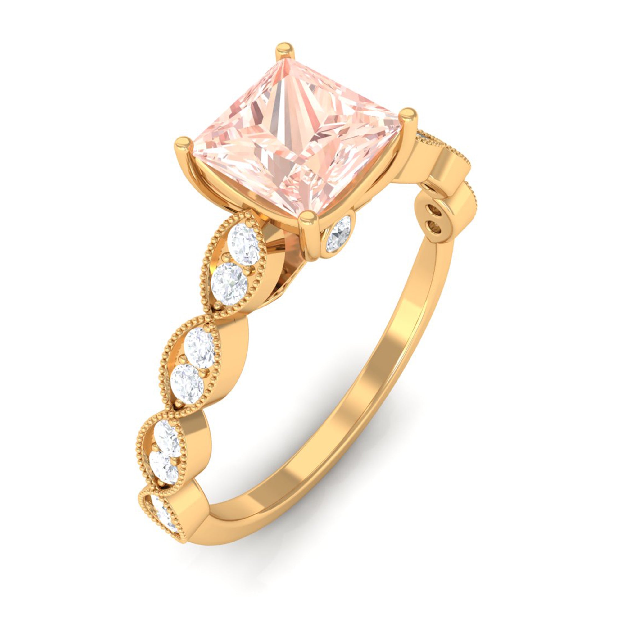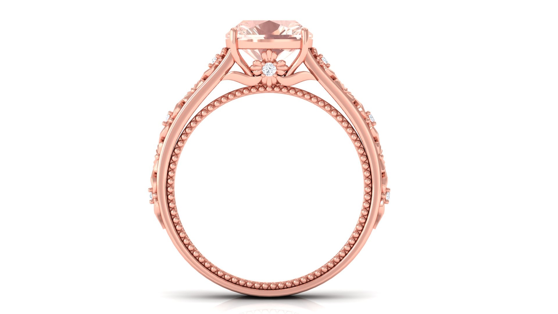Forever in trend, a Solitaire Morganite Ring boasts a solo centerpiece of Morganite (that is meant to shine out with its enormous size of 6 MM or more). This style makes for one of the most classic cum conventional choices in the Morganite Engagement Ring. What’s more, this timeless style offers you a wide scope of versatility. It ranges from a Round Morganite Ring for the traditional bride to fancier ones like Marquise, Pear, or Princess Cut Solitaire Ring for the bride who likes to keep up with the trends. On the other hand, if nothing appeals quite like a little vintage touch, you can rely on old-school shapes like an Asscher, Cushion, or Emerald Cut Morganite Ring.