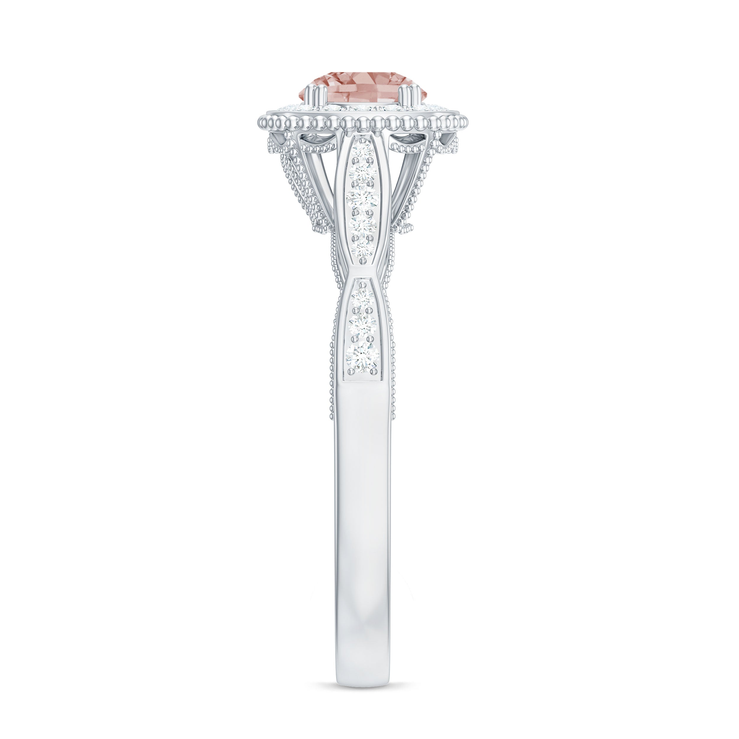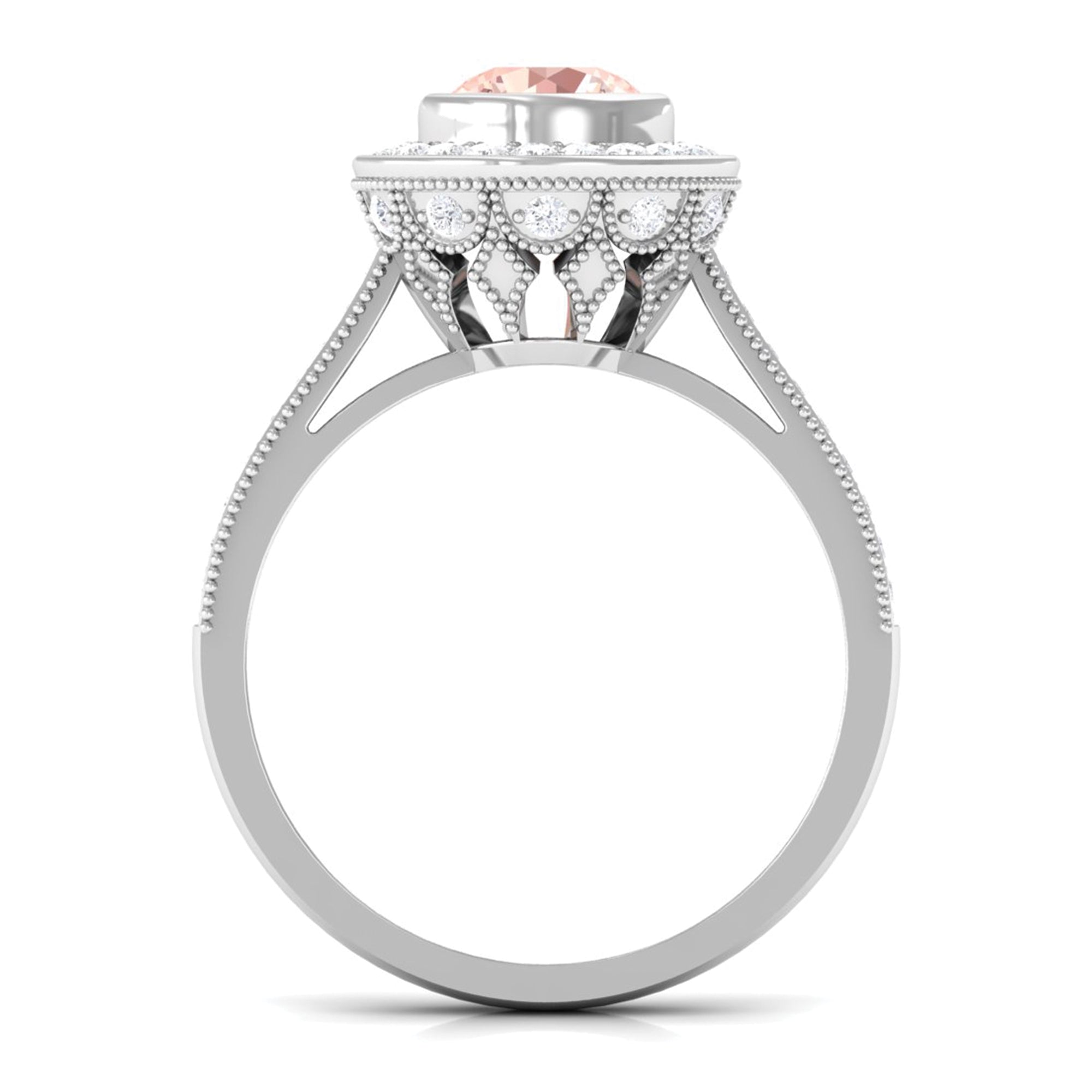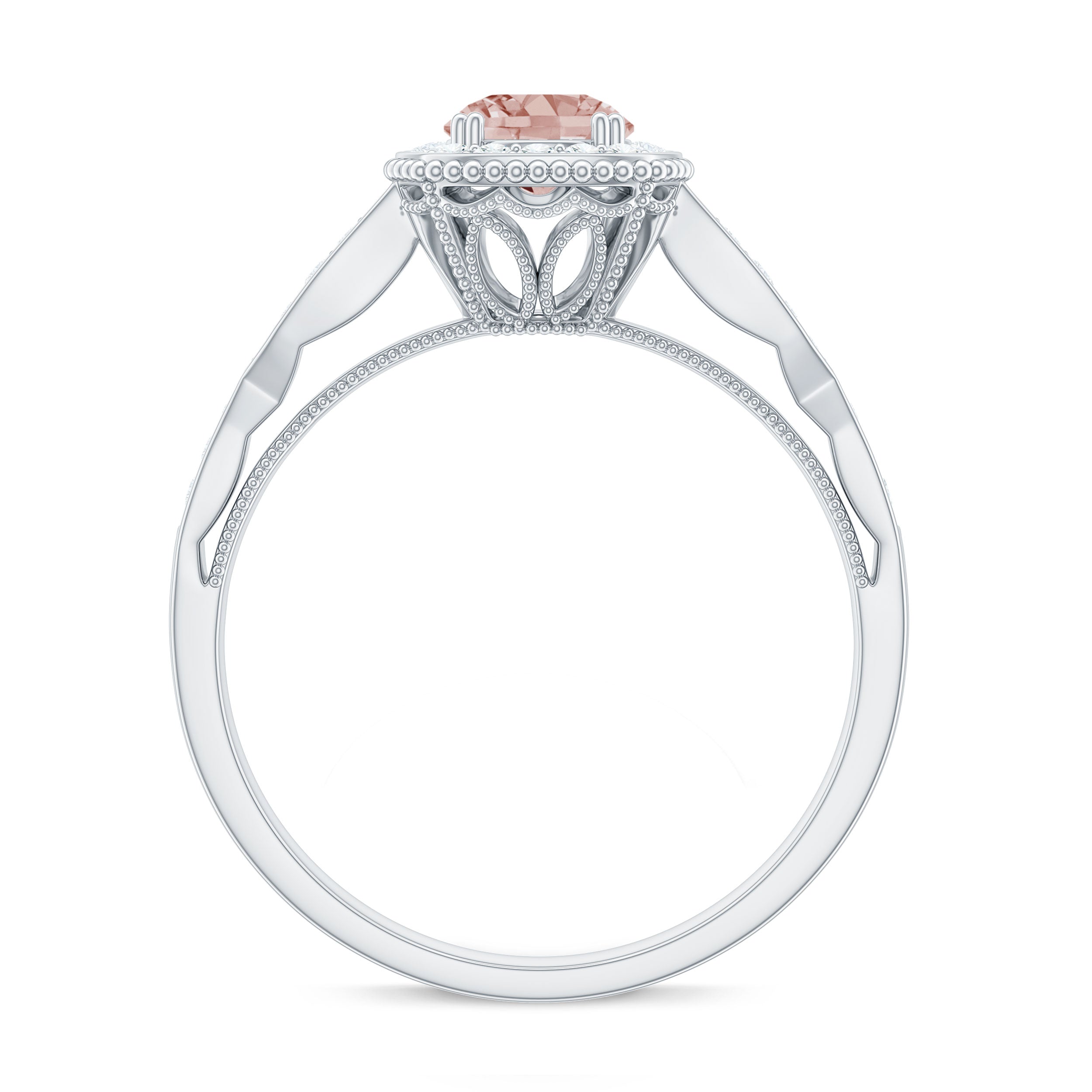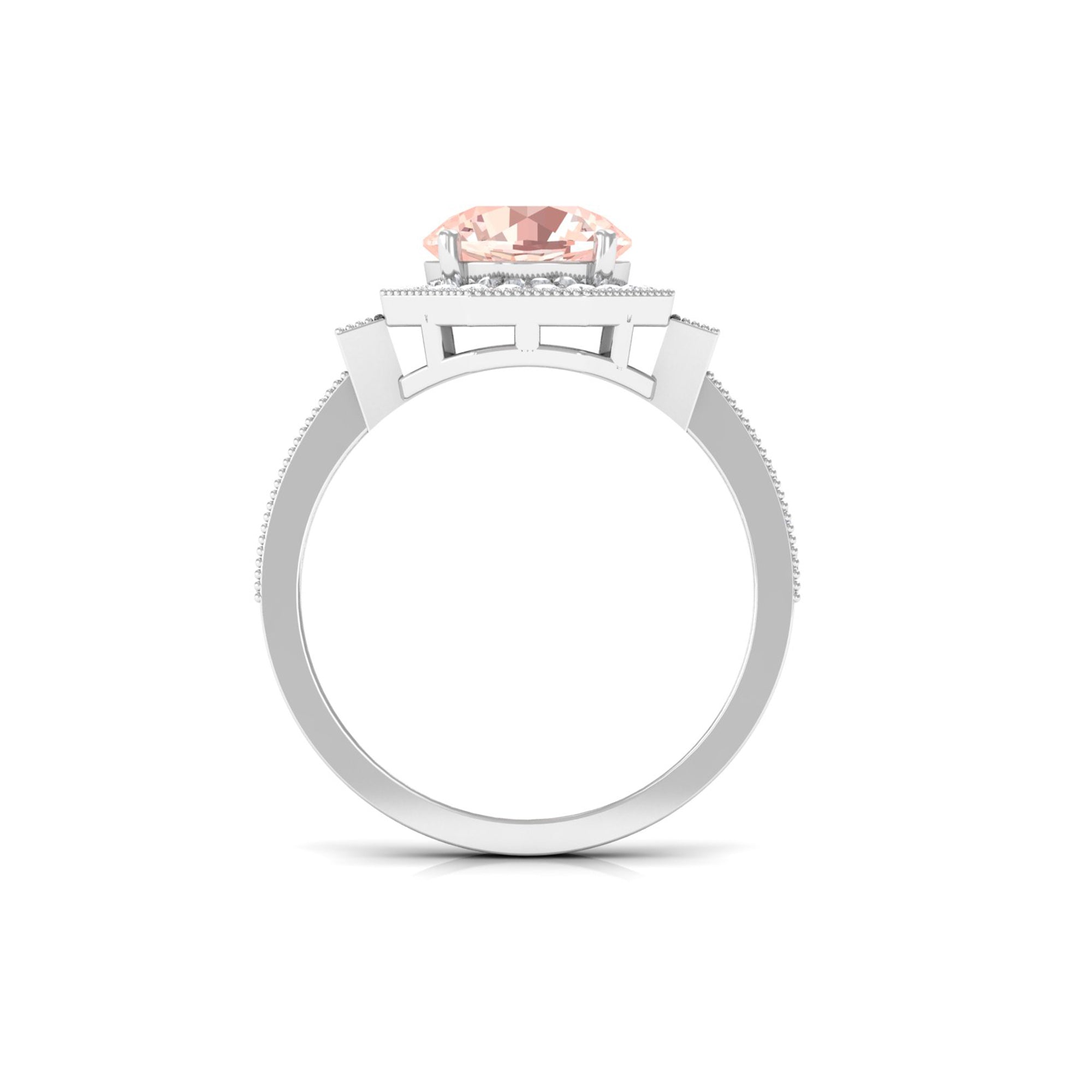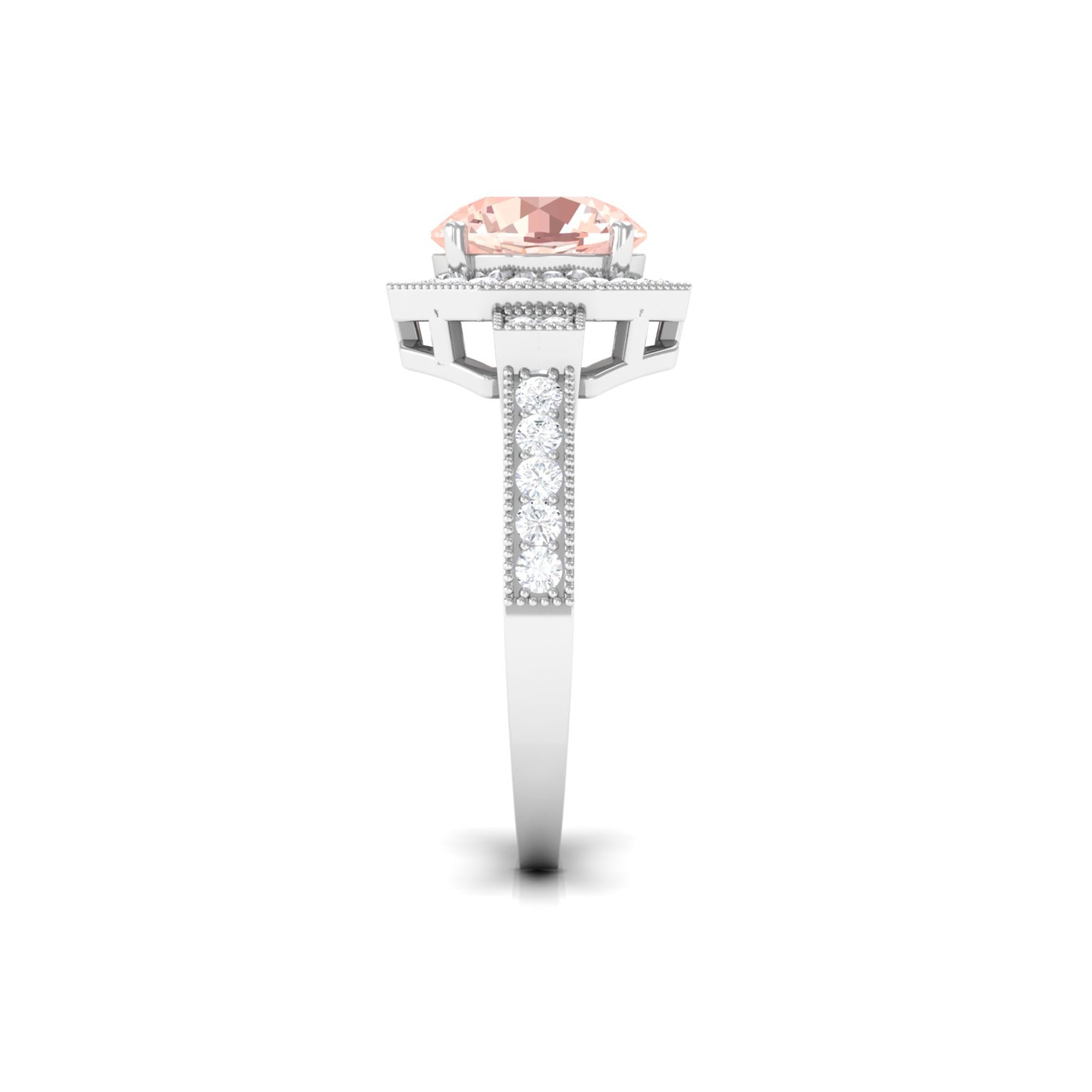 Lending a sparkling visual appeal to the conventional solitaire style, a Halo Ring encircles the center Morganite with a shimmering loop of Diamond/Moissanite. The Halo effortlessly draws more attention to the beauty of your Morganite by making it appear larger (while saving your precious bucks). So if you’re all about the glitz and glam, a Halo Style Morganite Engagement Ring might be a great fit for you.