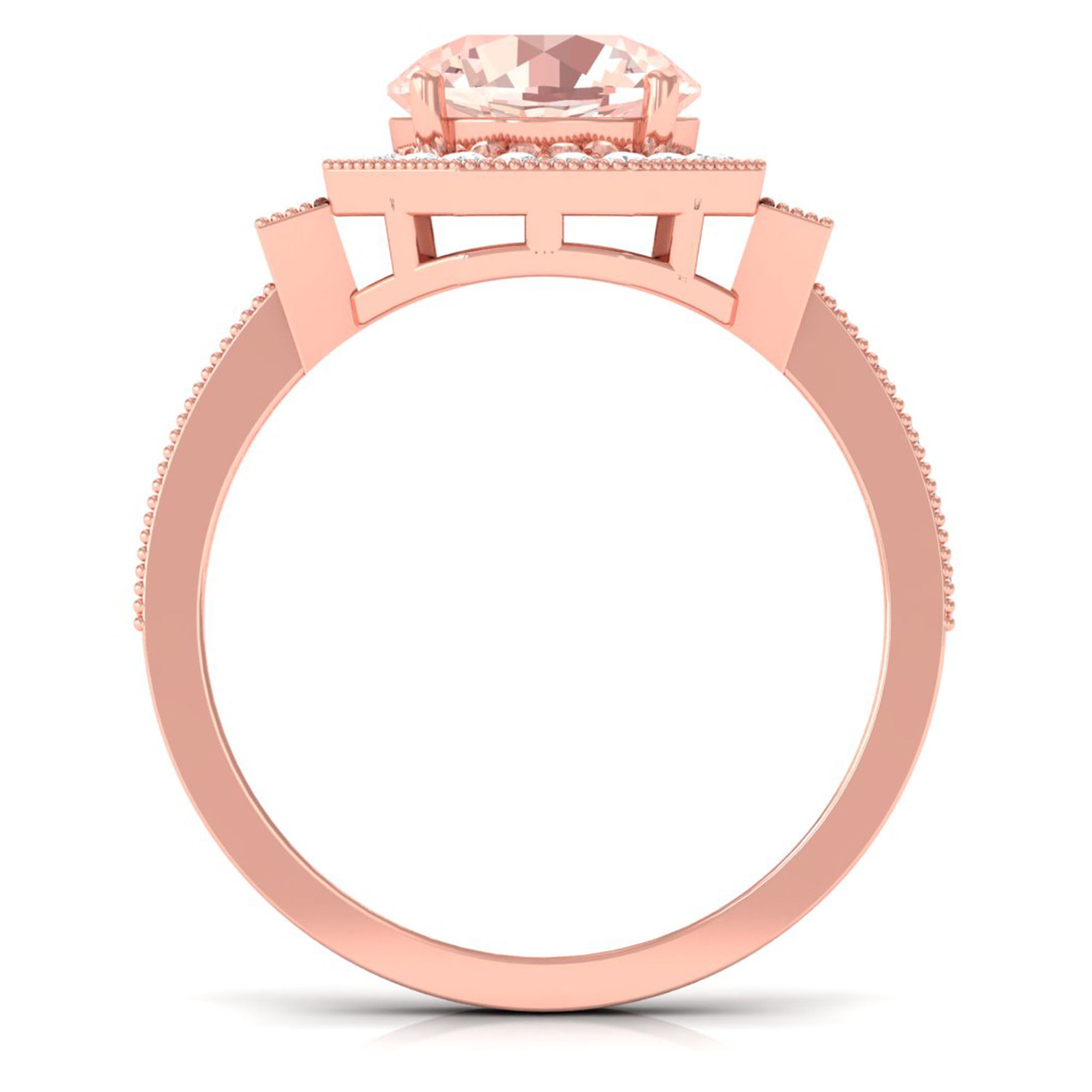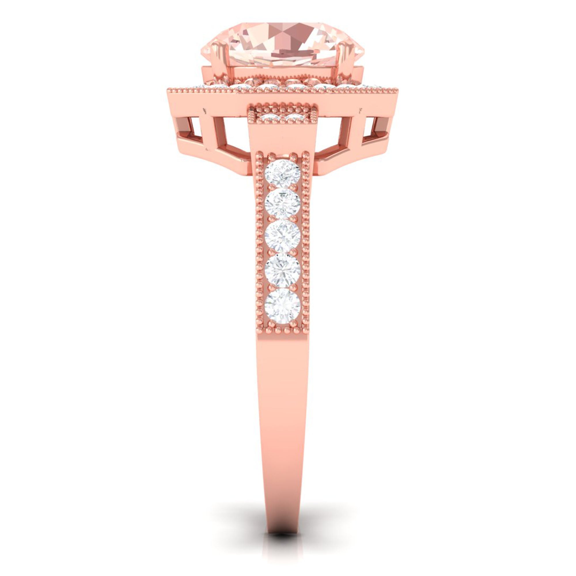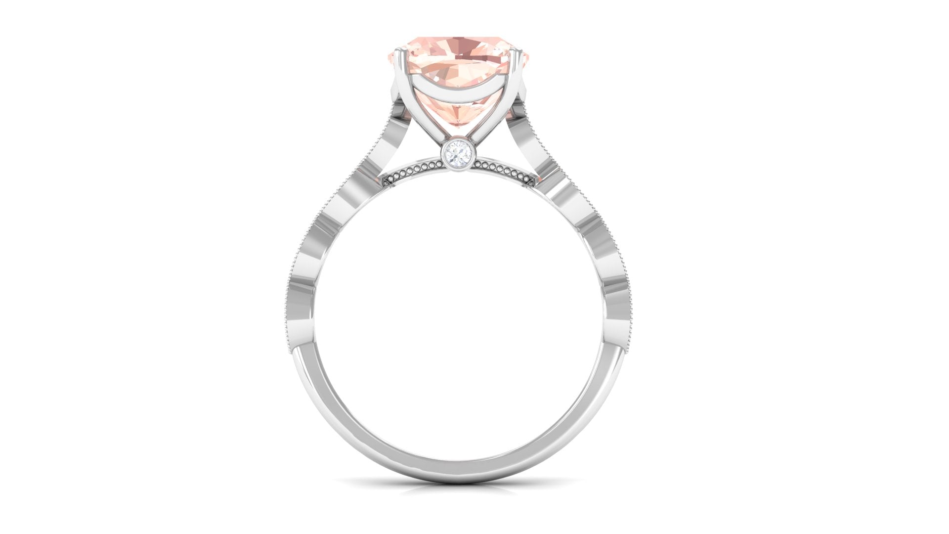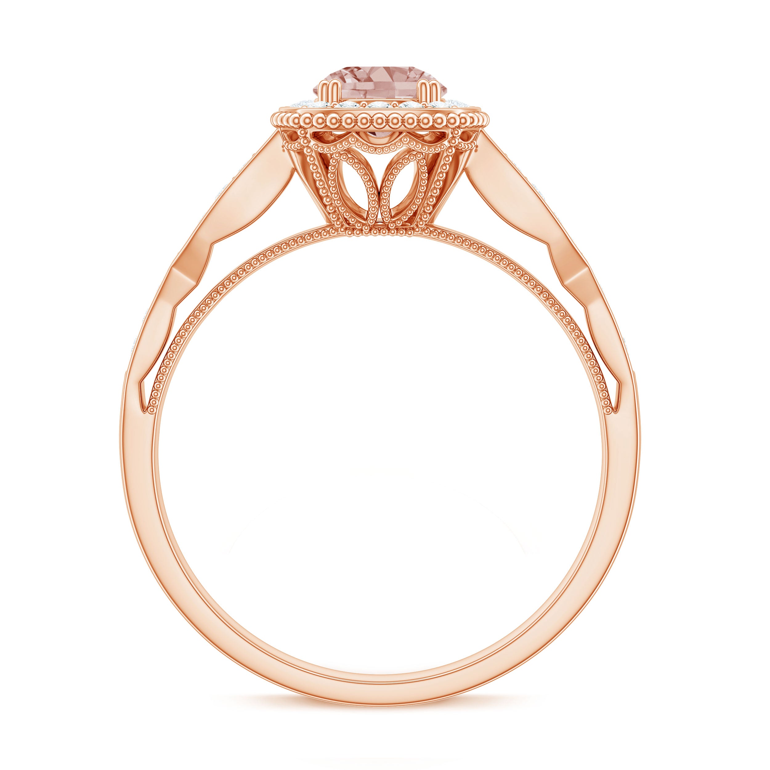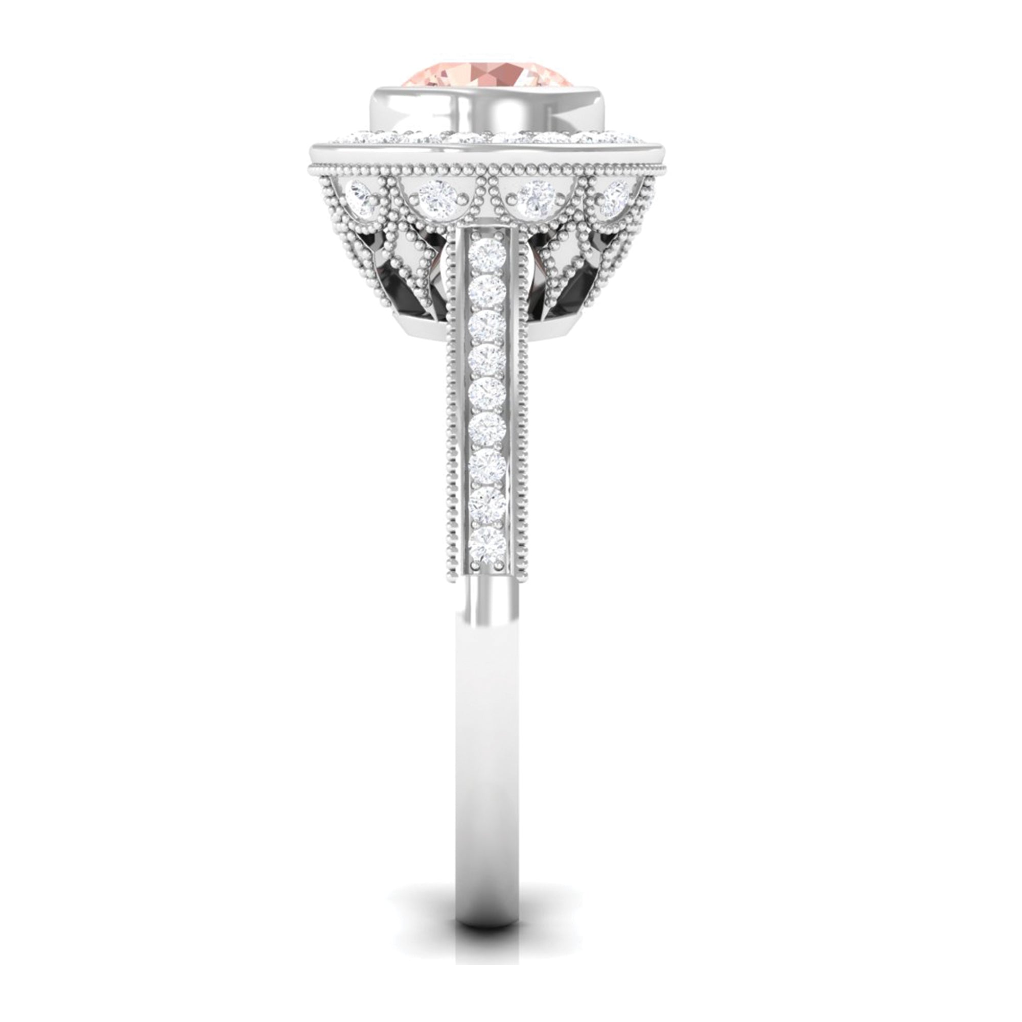 Lending a sparkling visual appeal to the conventional solitaire style, a Halo Ring encircles the center Morganite with a shimmering loop of Diamond/Moissanite. The Halo effortlessly draws more attention to the beauty of your Morganite by making it appear larger (while saving your precious bucks). So if you’re all about the glitz and glam, a Halo Style Morganite Engagement Ring might be a great fit for you.