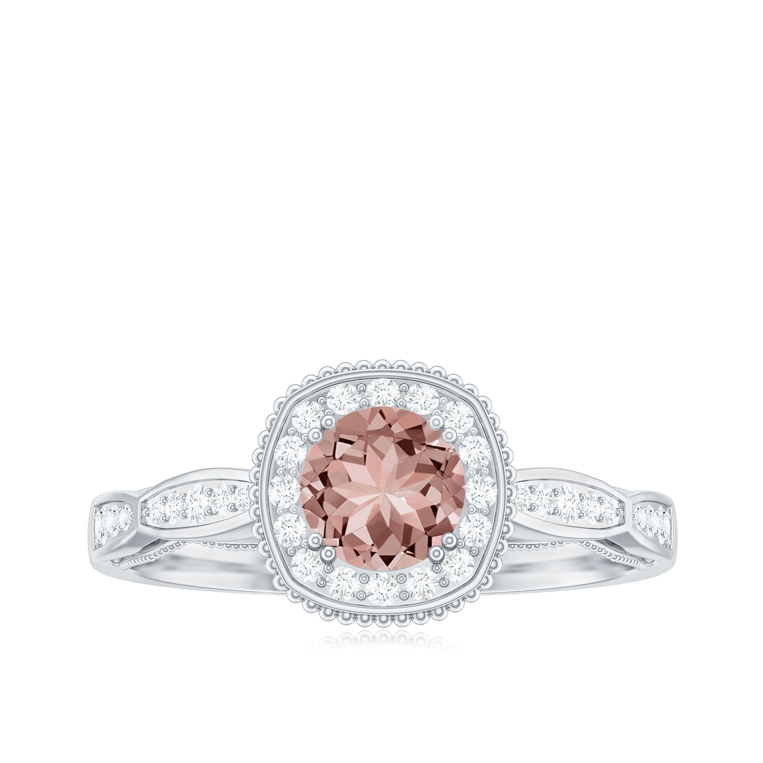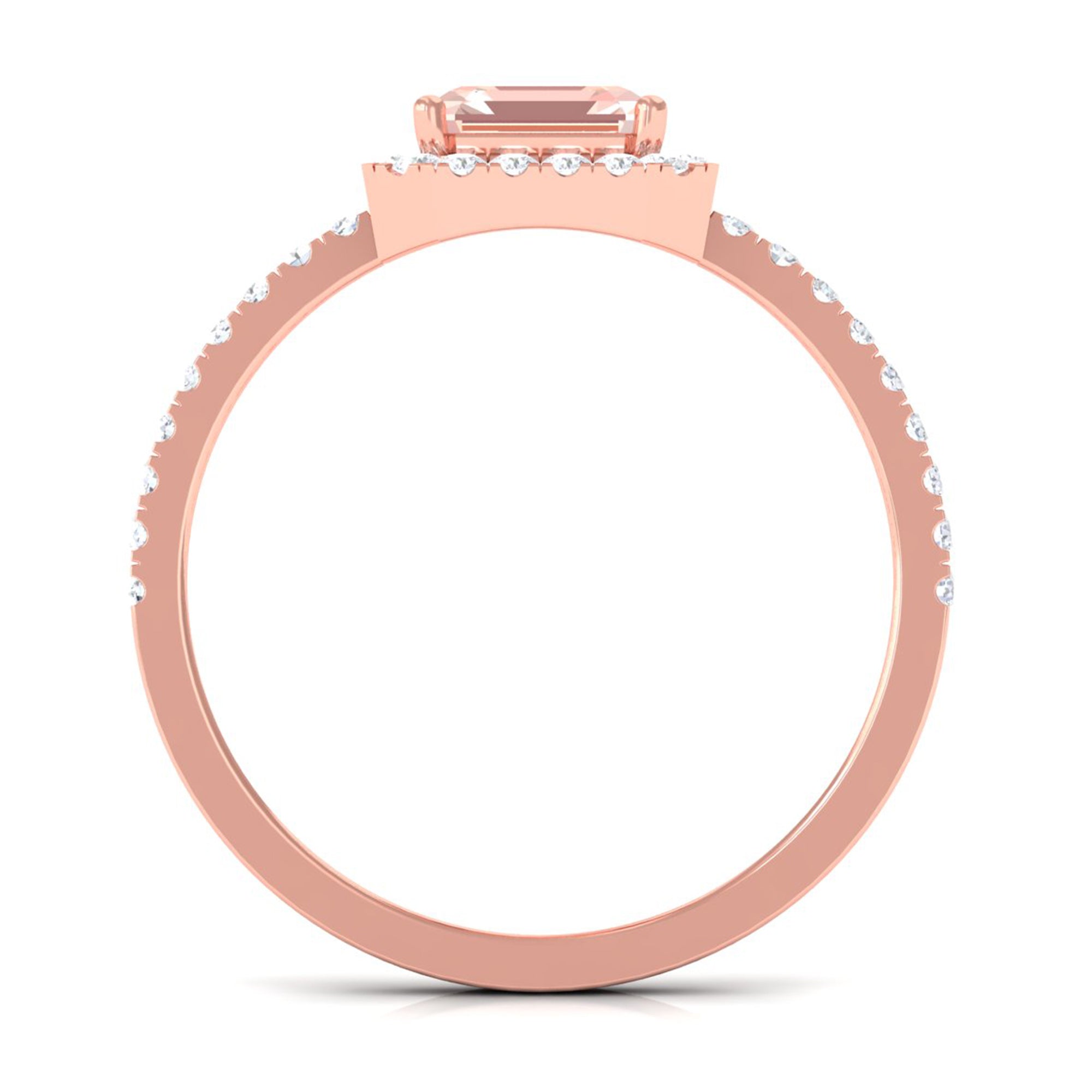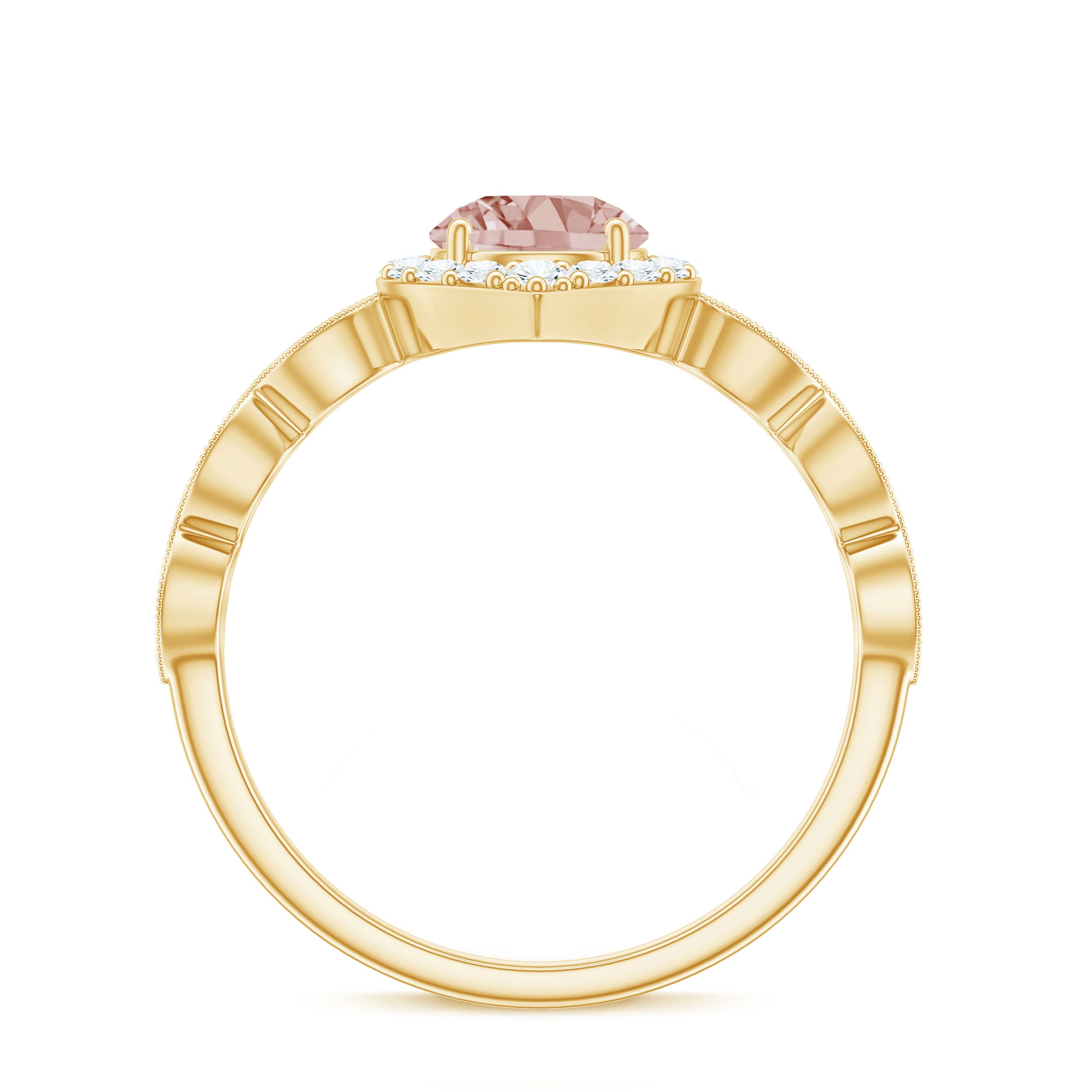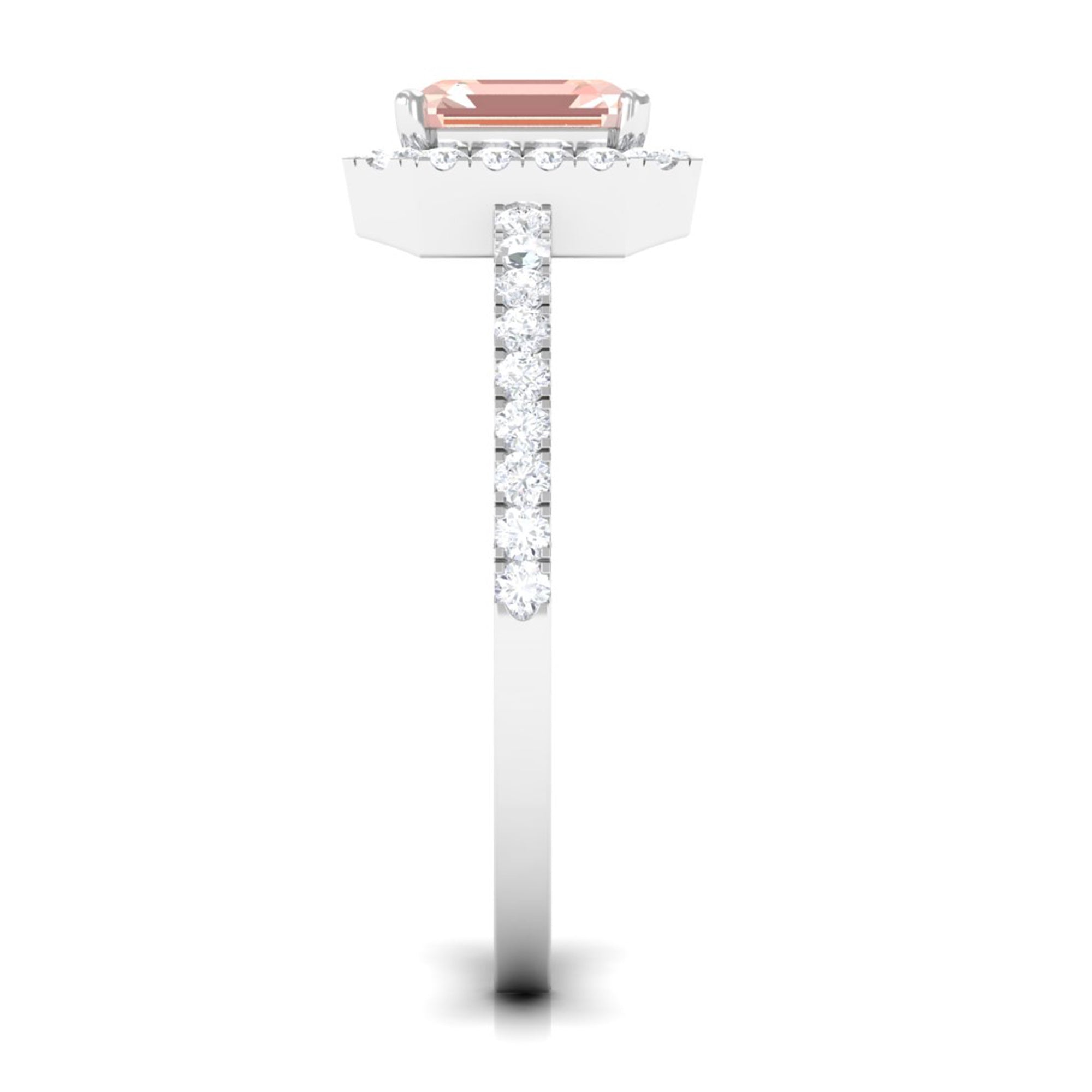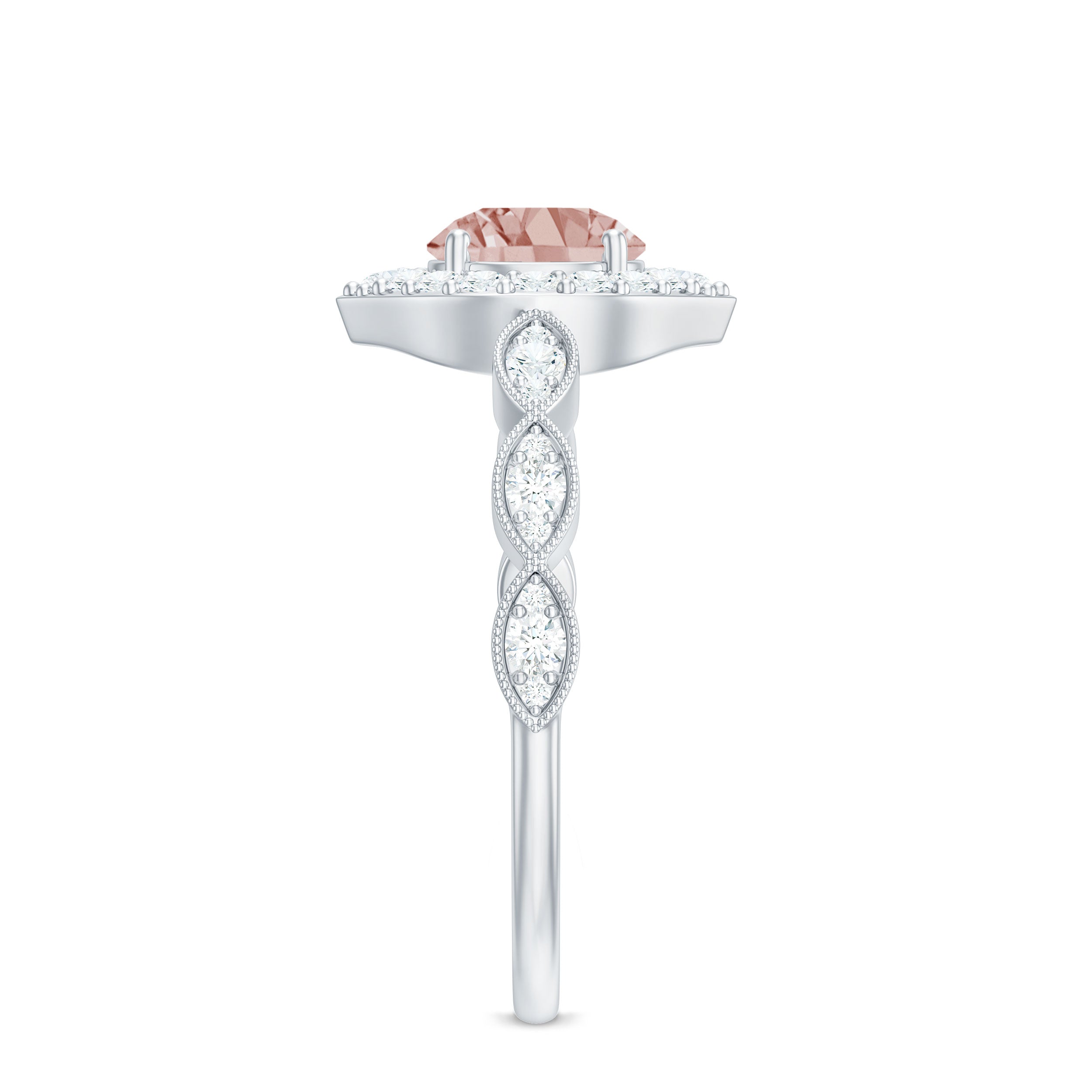 Lending a sparkling visual appeal to the conventional solitaire style, a Halo Ring encircles the center Morganite with a shimmering loop of Diamond/Moissanite. The Halo effortlessly draws more attention to the beauty of your Morganite by making it appear larger (while saving your precious bucks). So if you’re all about the glitz and glam, a Halo Style Morganite Engagement Ring might be a great fit for you.