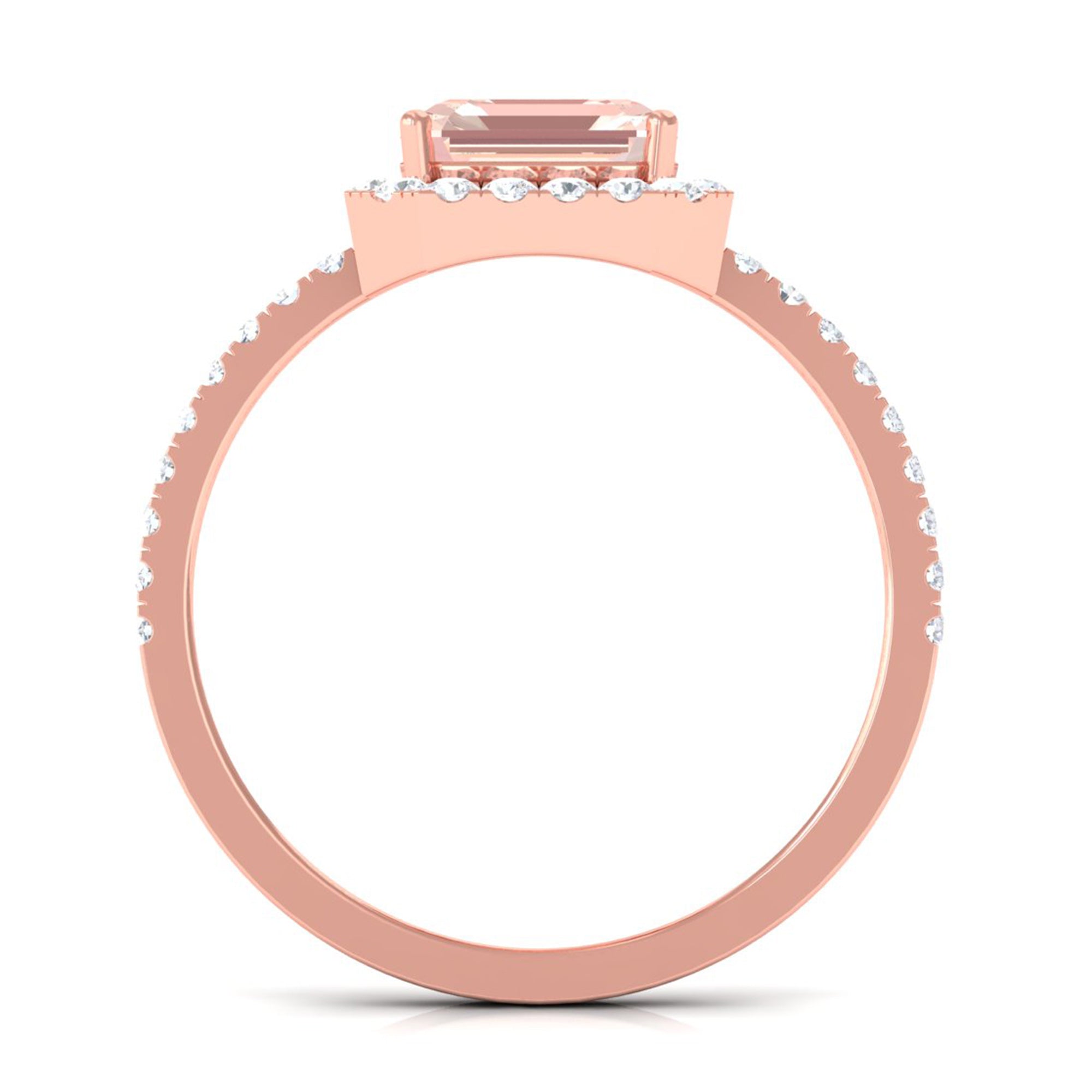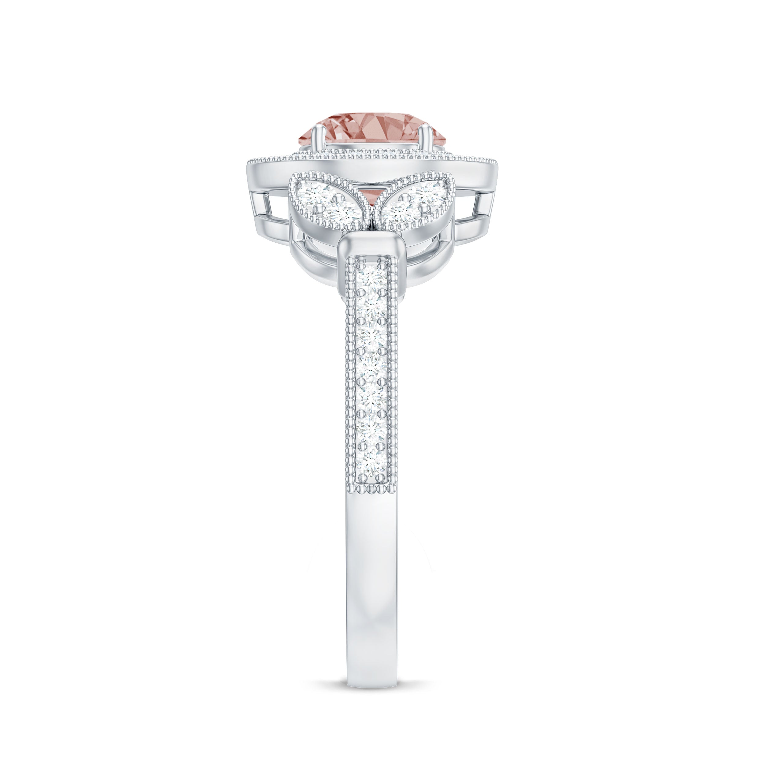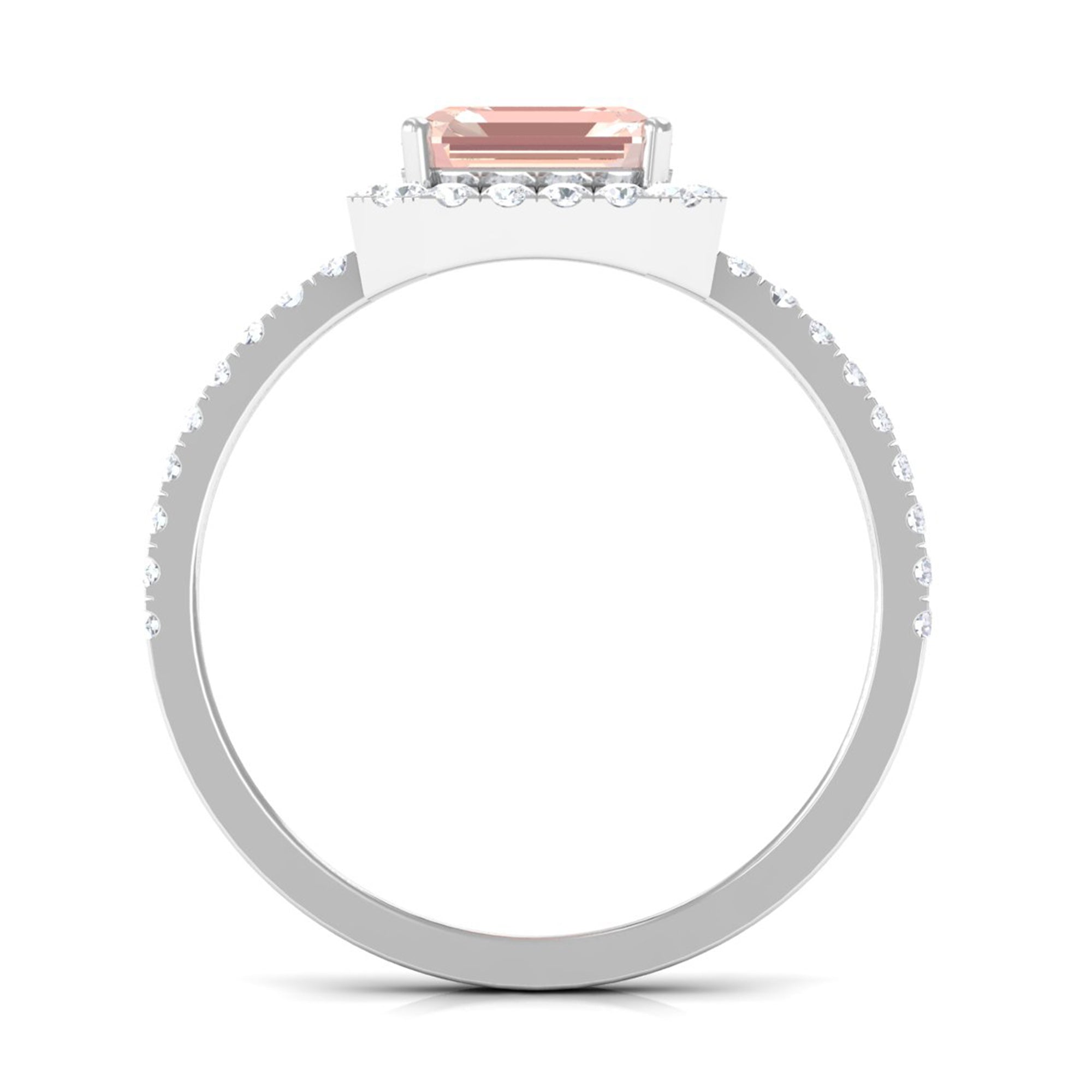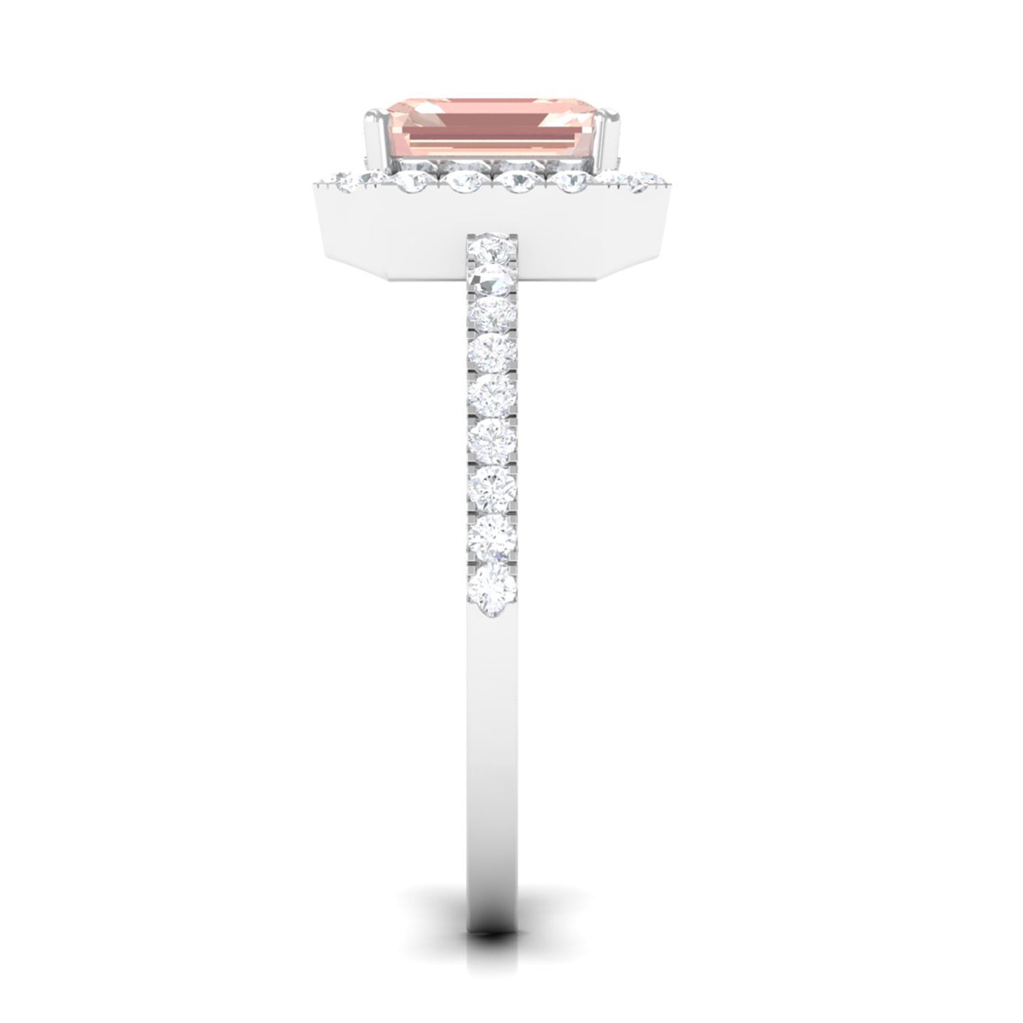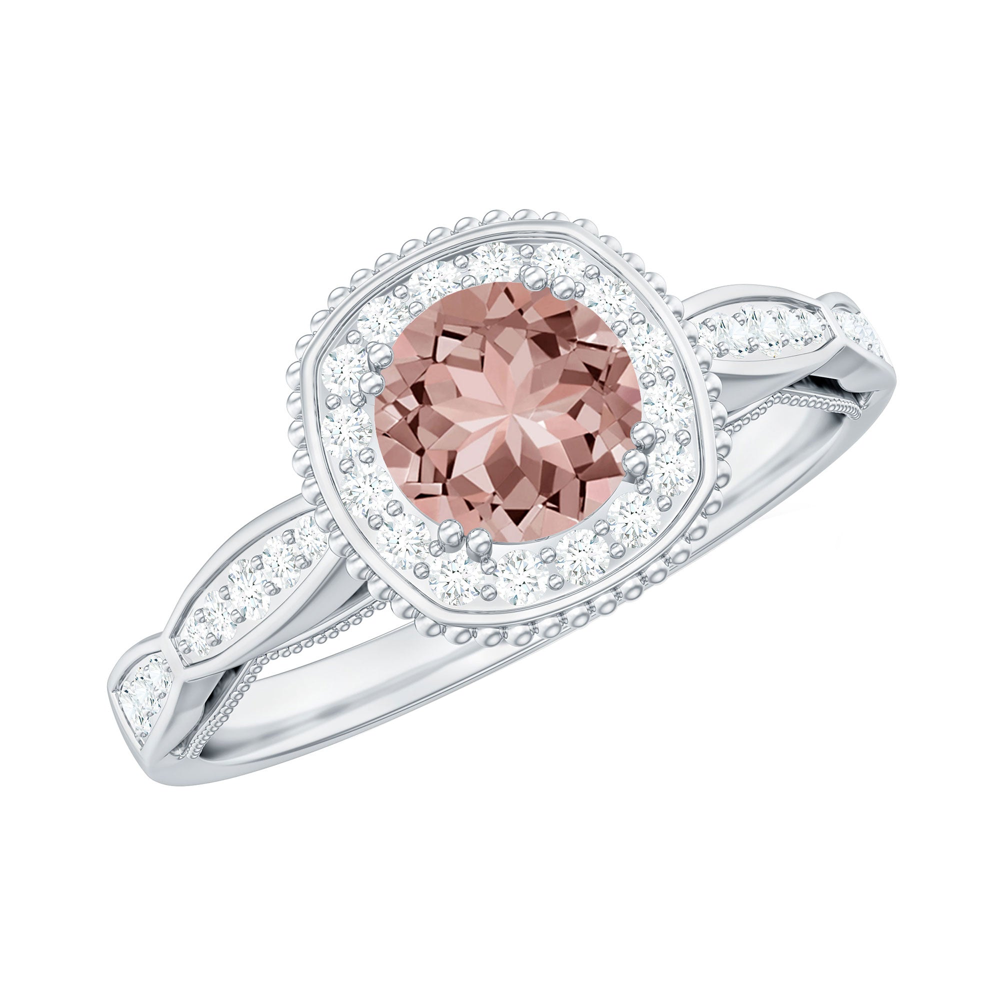 Lending a sparkling visual appeal to the conventional solitaire style, a Halo Ring encircles the center Morganite with a shimmering loop of Diamond/Moissanite. The Halo effortlessly draws more attention to the beauty of your Morganite by making it appear larger (while saving your precious bucks). So if you’re all about the glitz and glam, a Halo Style Morganite Engagement Ring might be a great fit for you.