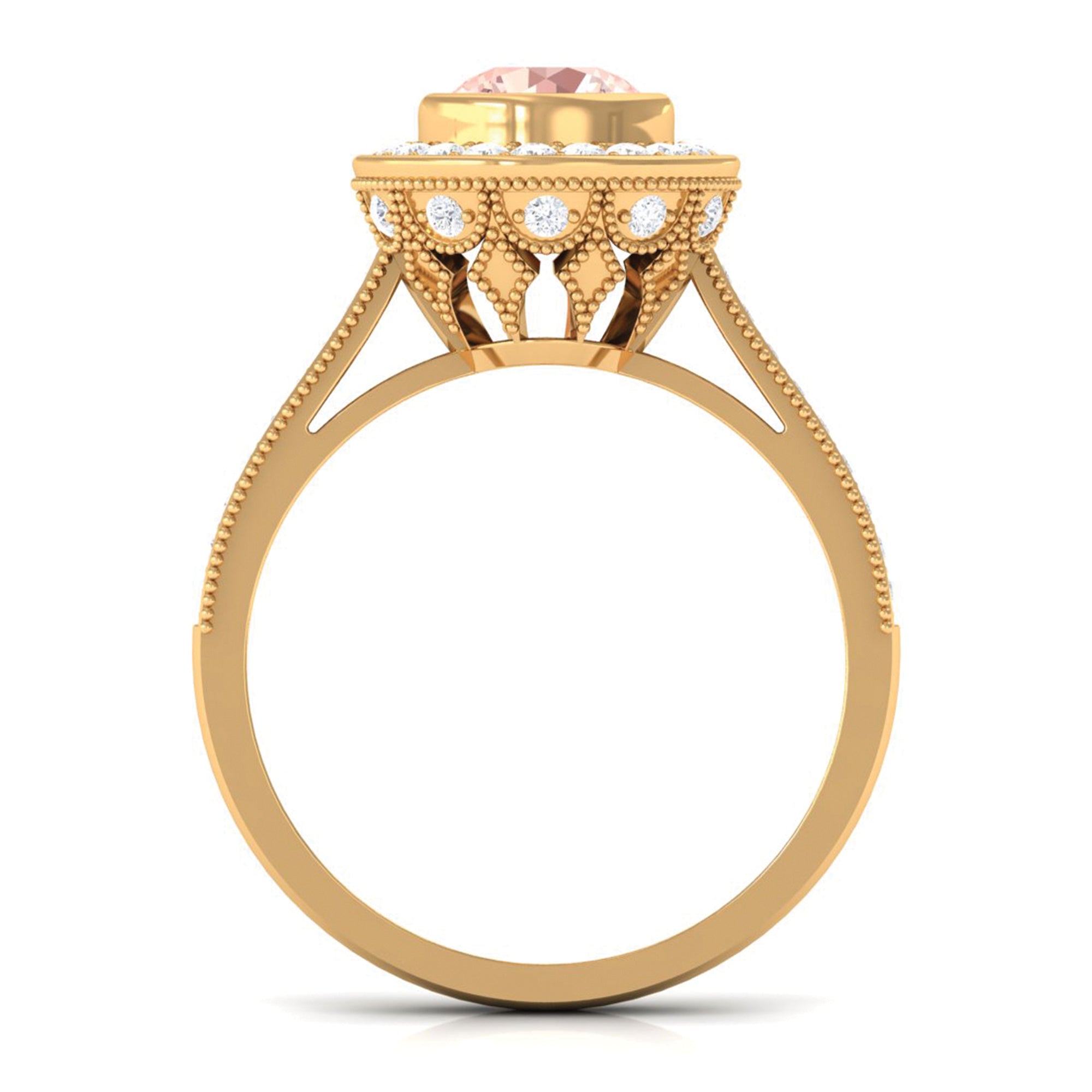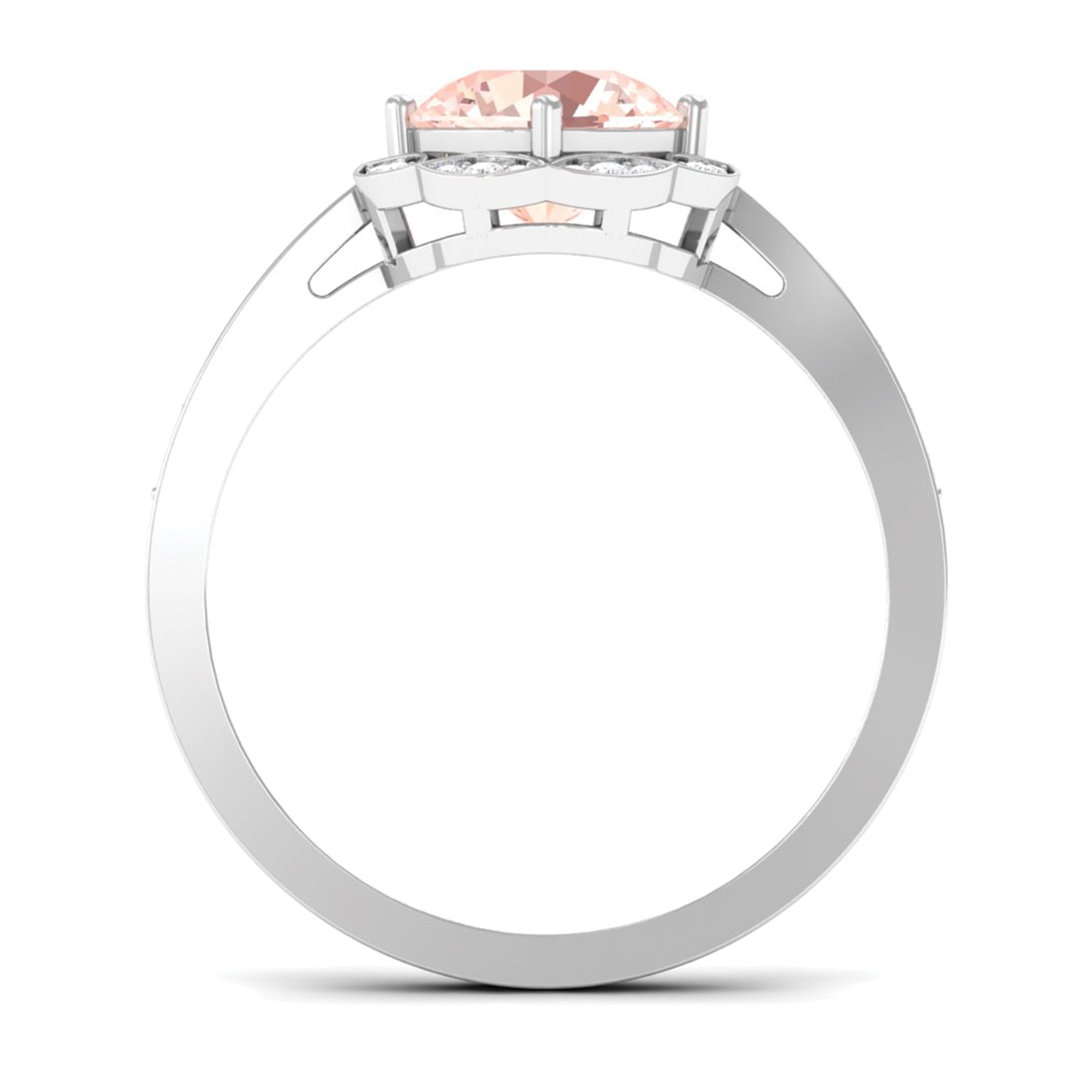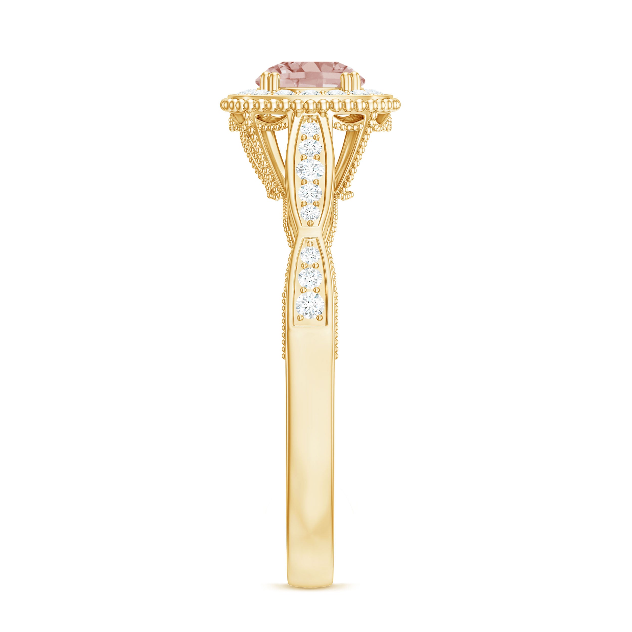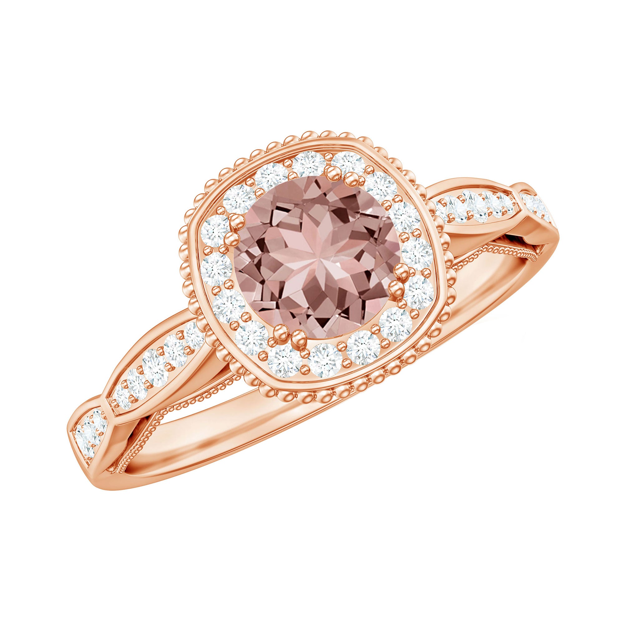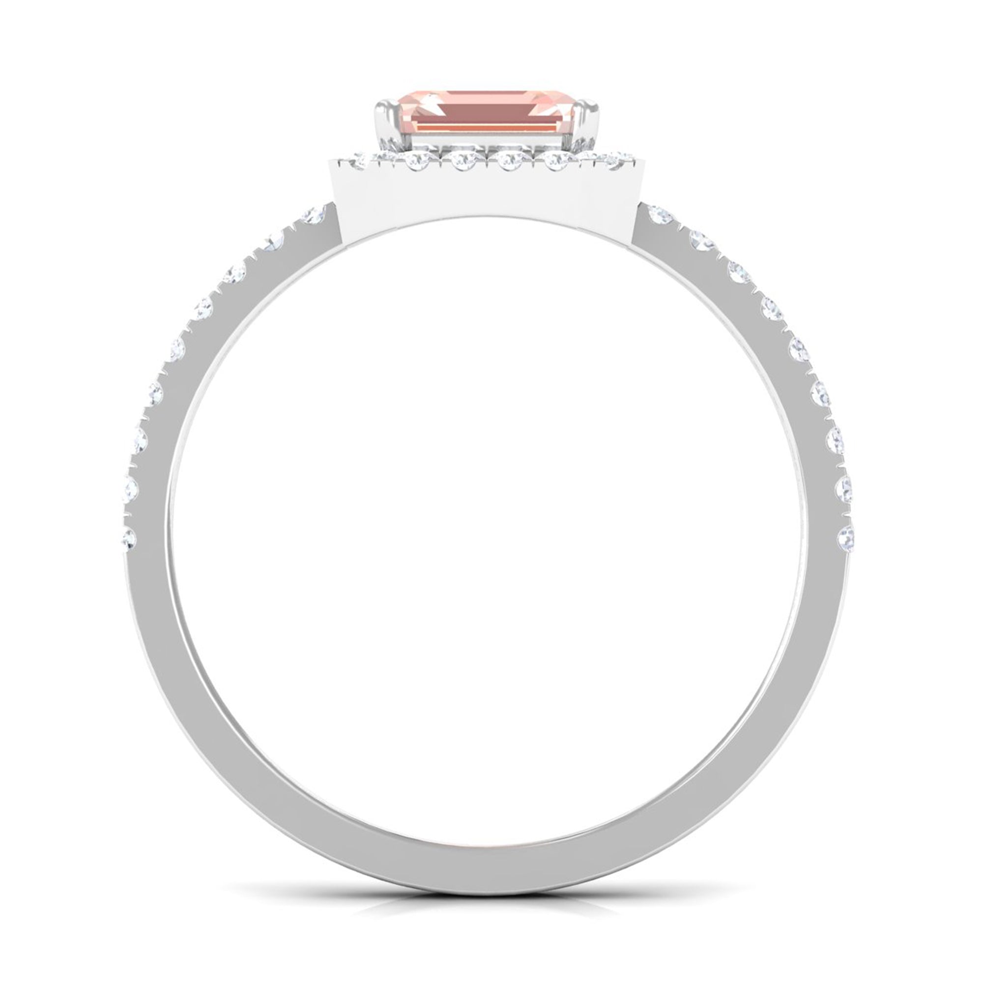Lending a sparkling visual appeal to the conventional solitaire style, a Halo Ring encircles the center Morganite with a shimmering loop of Diamond/Moissanite. The Halo effortlessly draws more attention to the beauty of your Morganite by making it appear larger (while saving your precious bucks). So if you’re all about the glitz and glam, a Halo Style Morganite Engagement Ring might be a great fit for you.