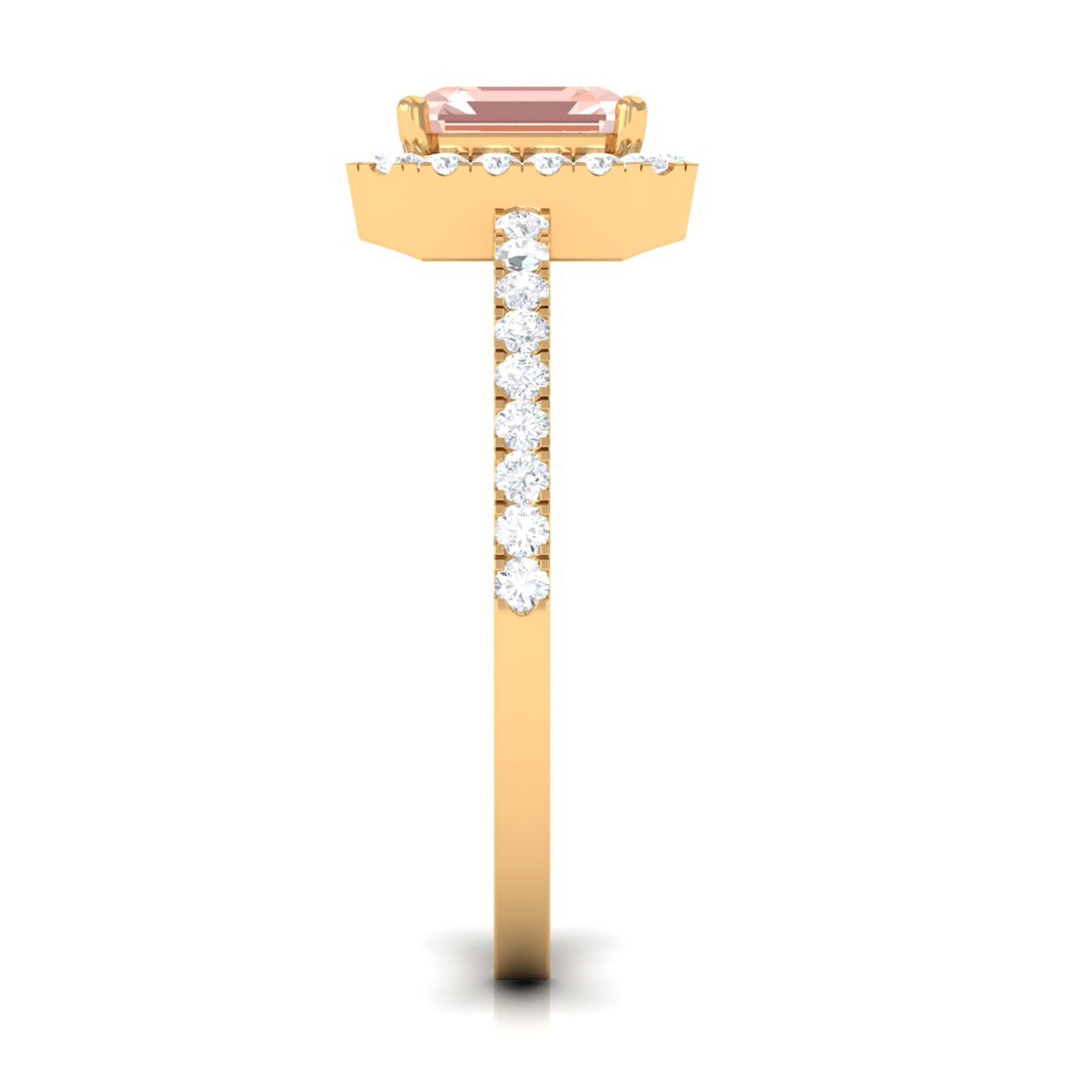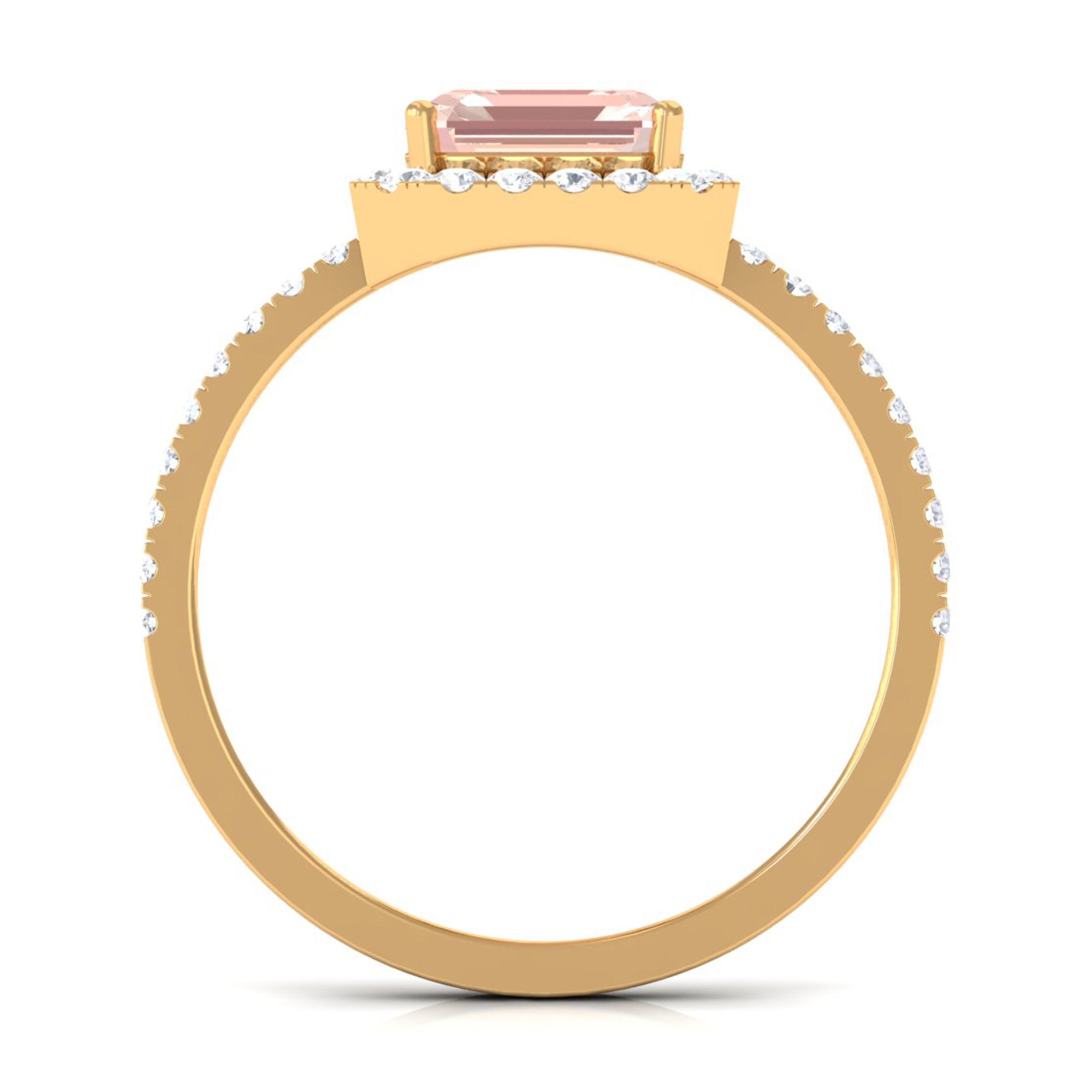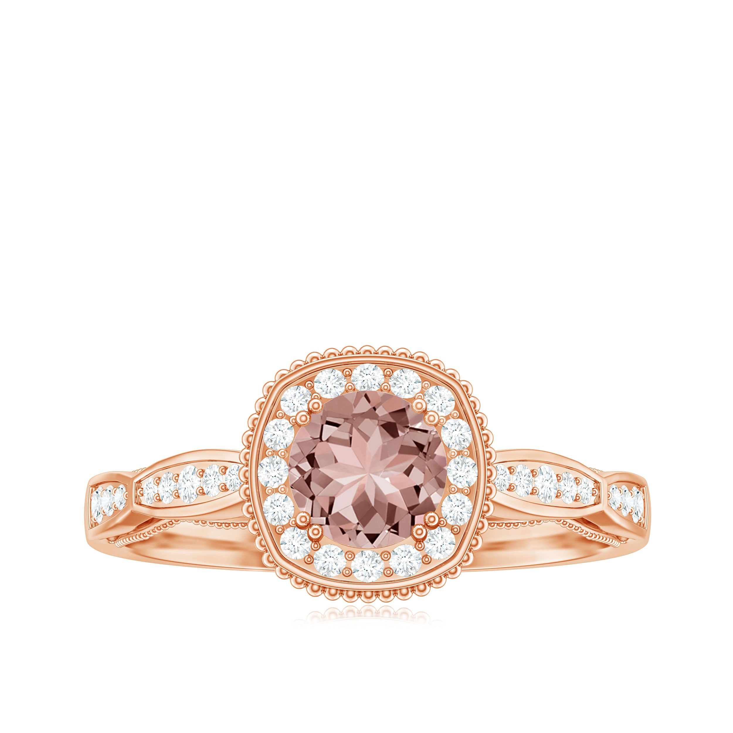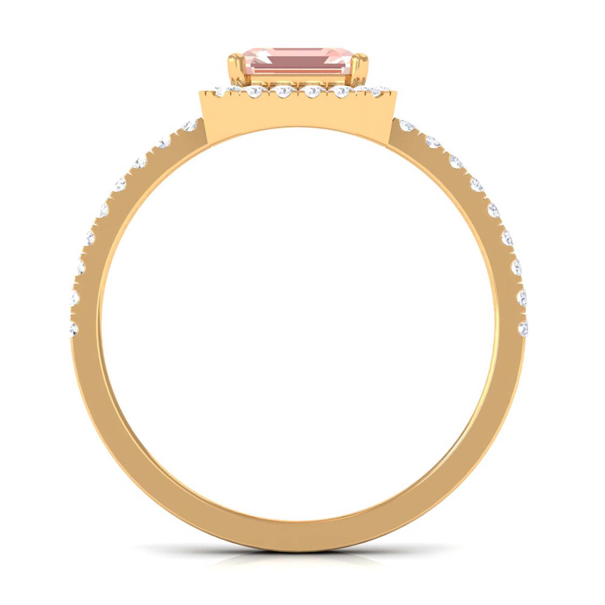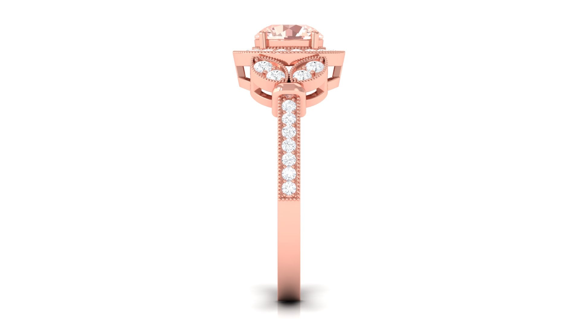 Lending a sparkling visual appeal to the conventional solitaire style, a Halo Ring encircles the center Morganite with a shimmering loop of Diamond/Moissanite. The Halo effortlessly draws more attention to the beauty of your Morganite by making it appear larger (while saving your precious bucks). So if you’re all about the glitz and glam, a Halo Style Morganite Engagement Ring might be a great fit for you.
