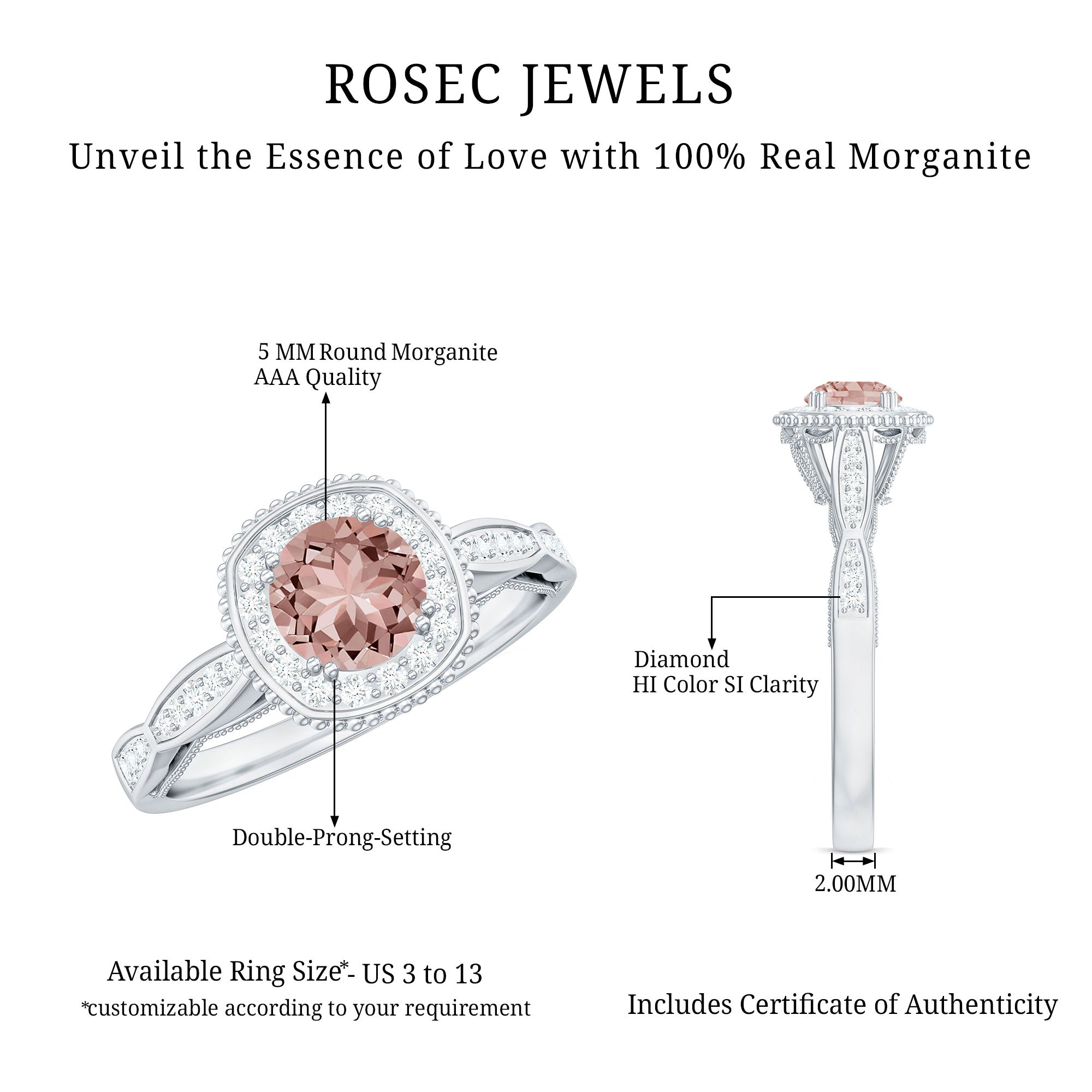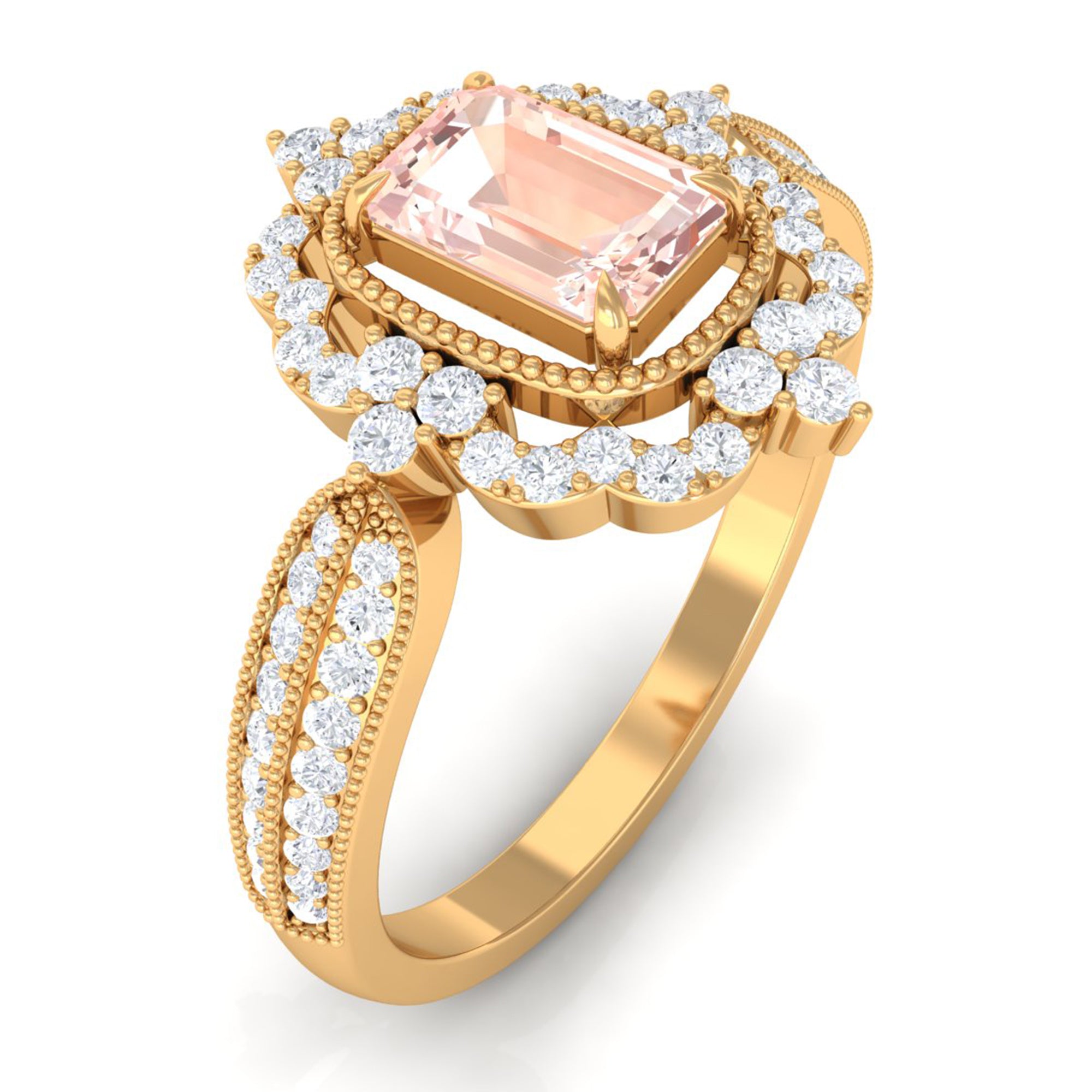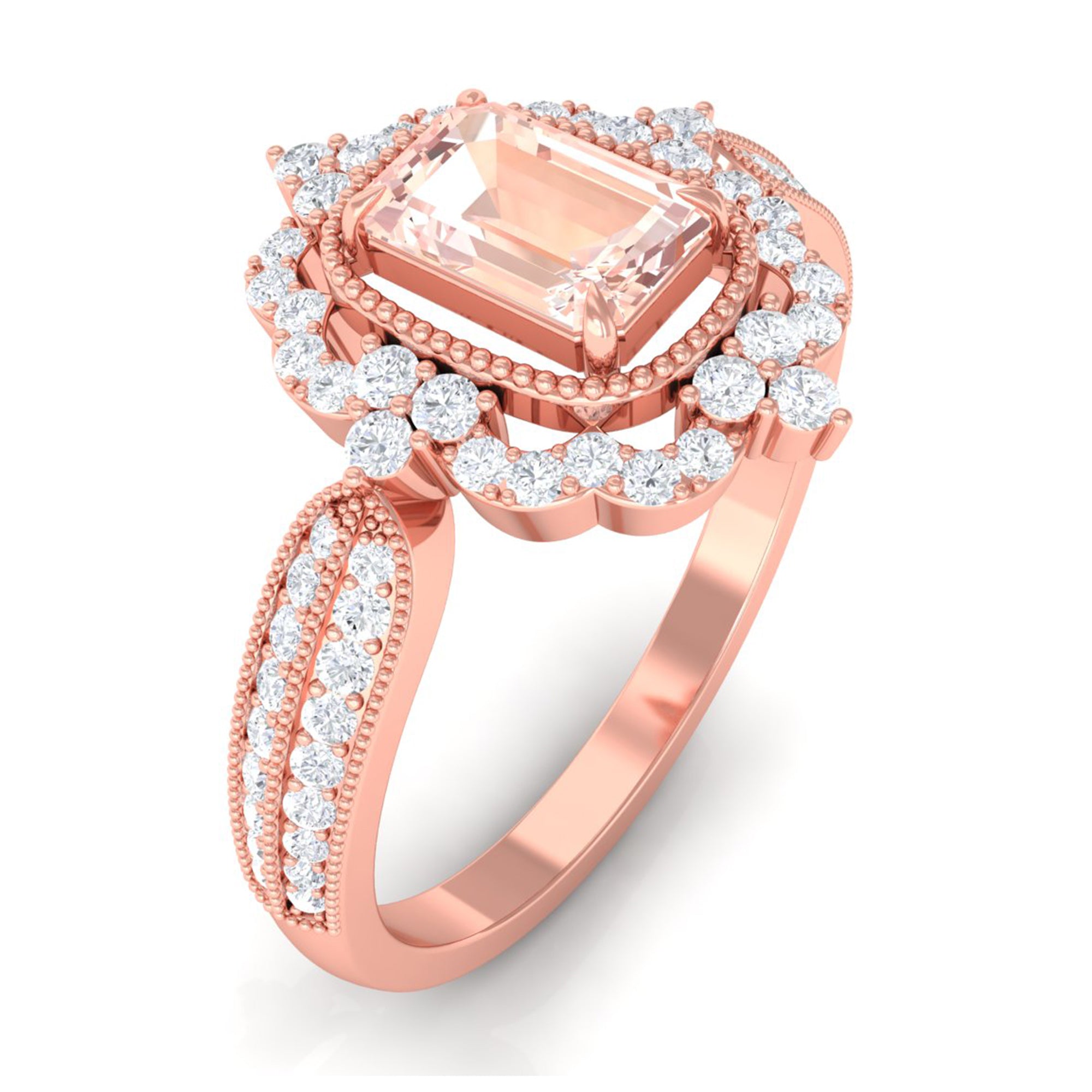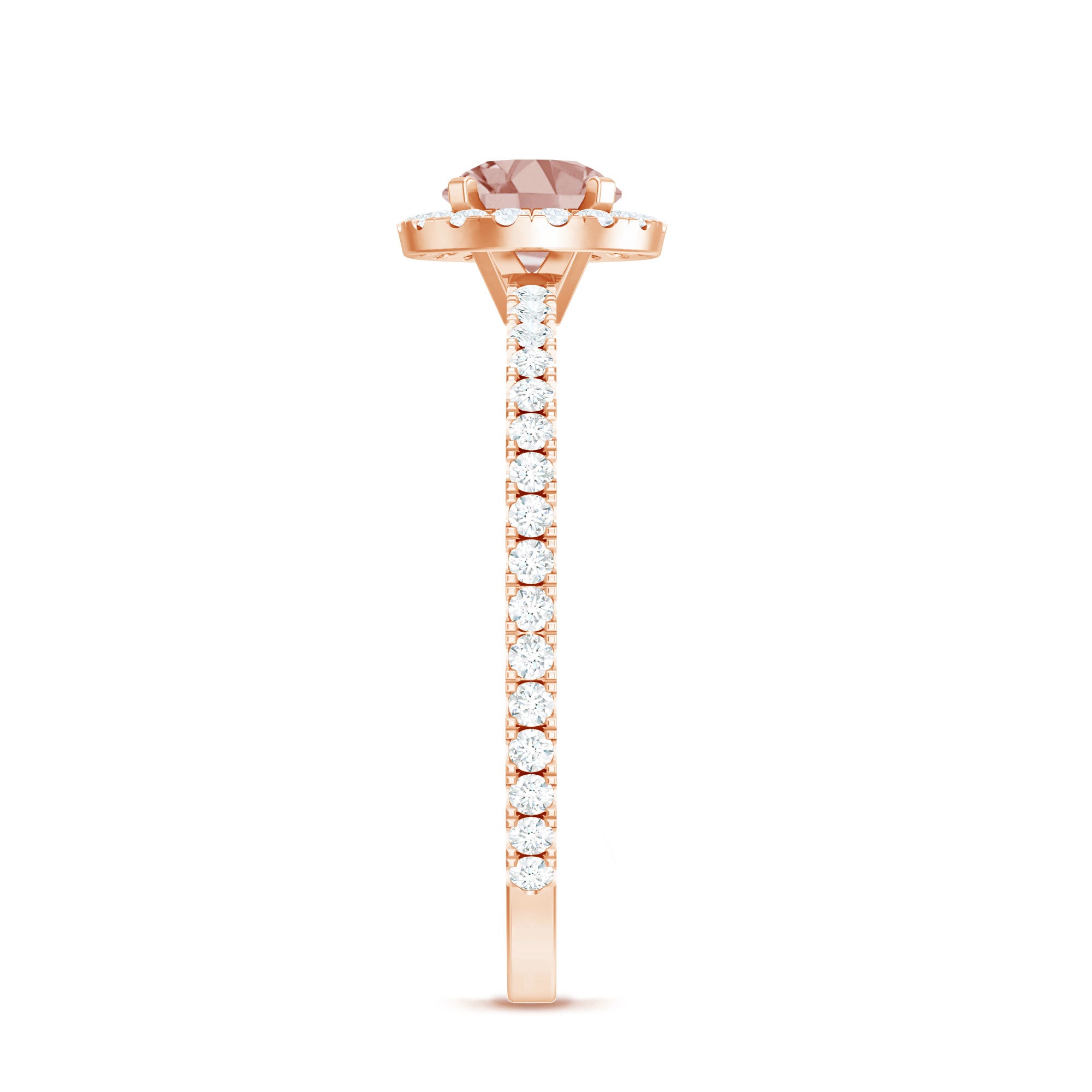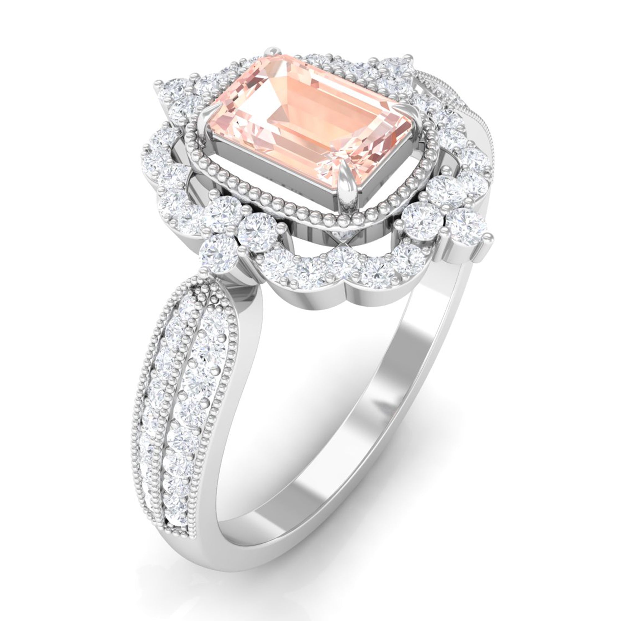 Lending a sparkling visual appeal to the conventional solitaire style, a Halo Ring encircles the center Morganite with a shimmering loop of Diamond/Moissanite. The Halo effortlessly draws more attention to the beauty of your Morganite by making it appear larger (while saving your precious bucks). So if you’re all about the glitz and glam, a Halo Style Morganite Engagement Ring might be a great fit for you.