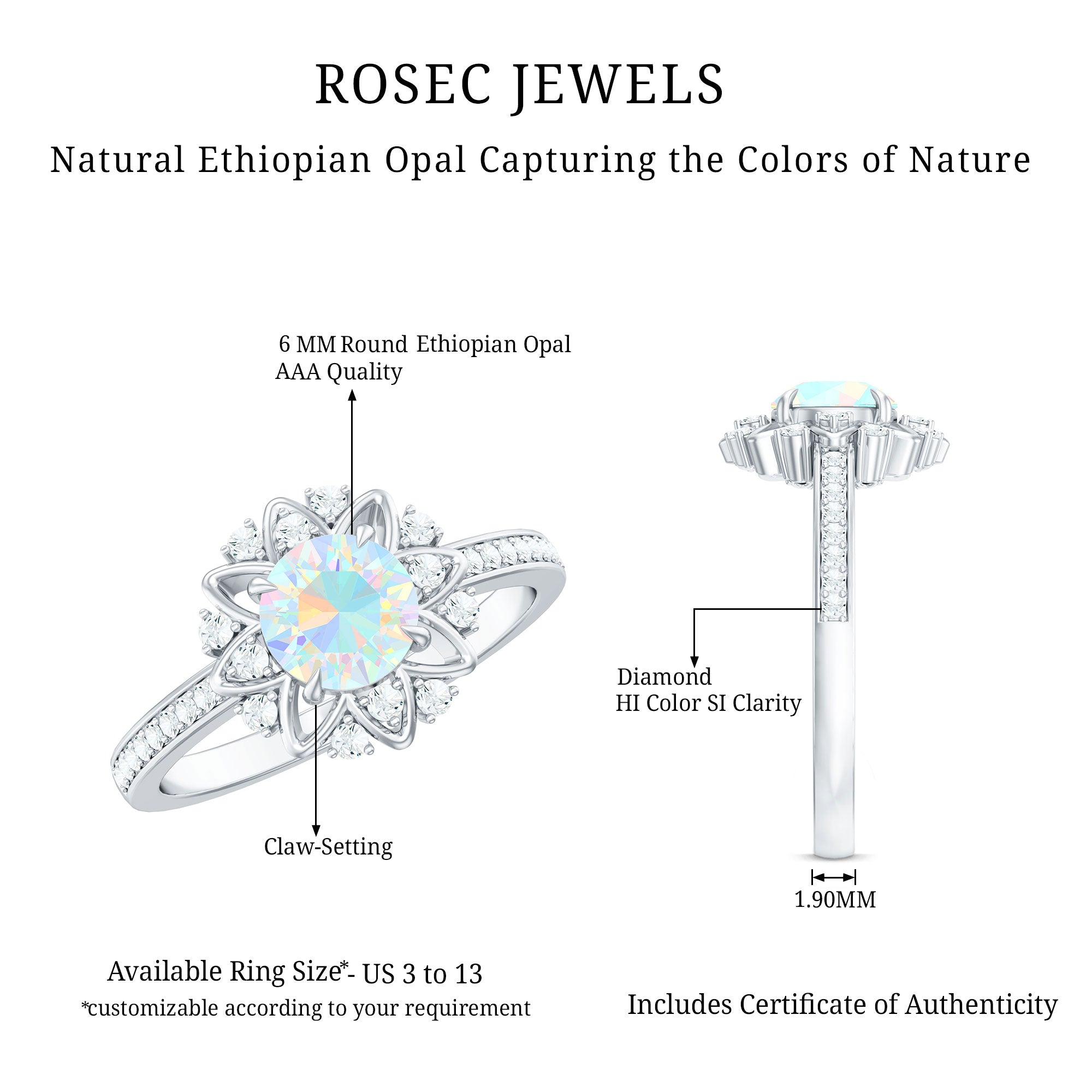 Ethiopian opal rings for women are a unique and vibrant choice for engagement rings. The opal natural play of colors, often shifting between fiery reds, deep blues, and soft greens. Our unique opal and diamond engagement ring symbolizes the dynamic nature of love.