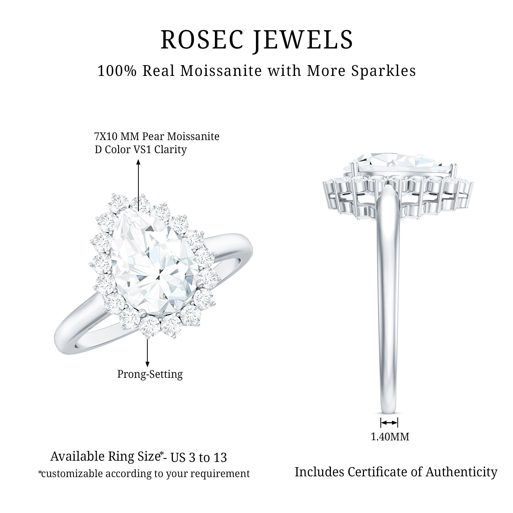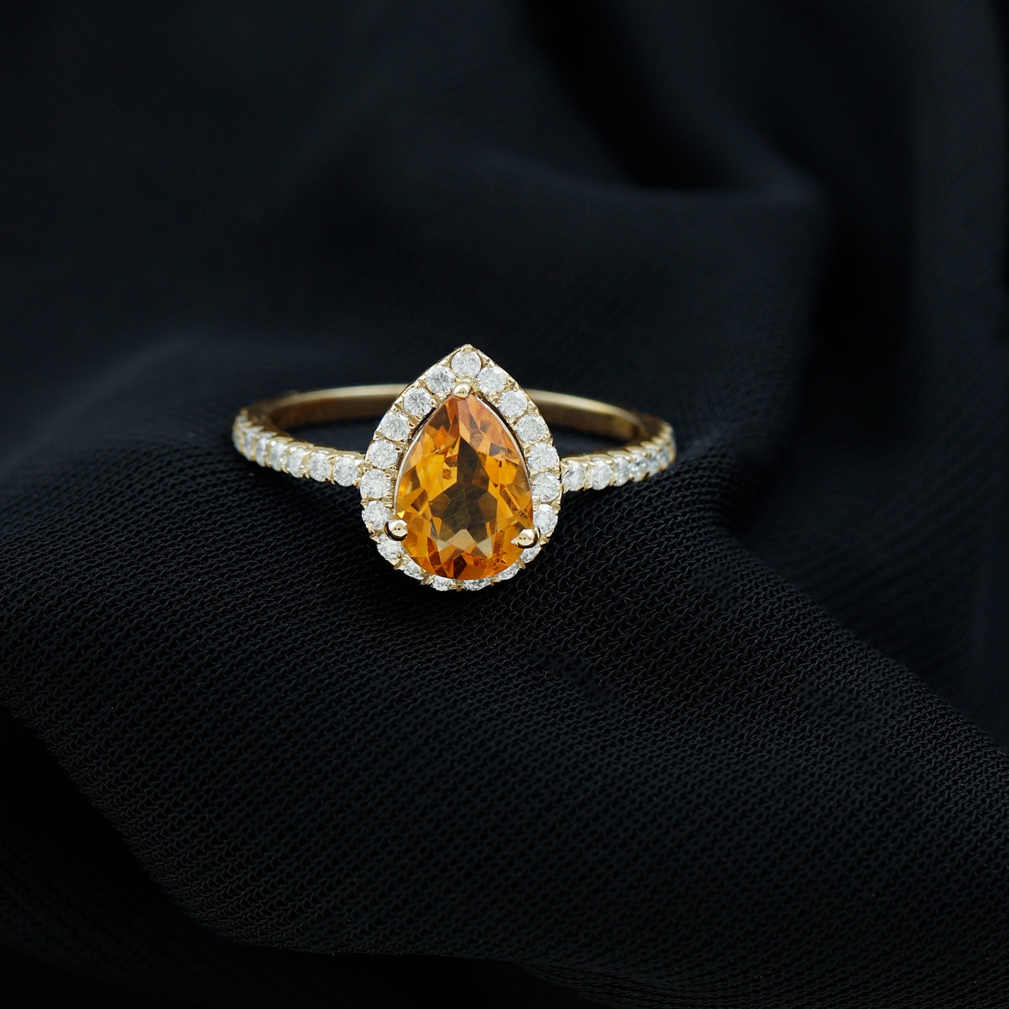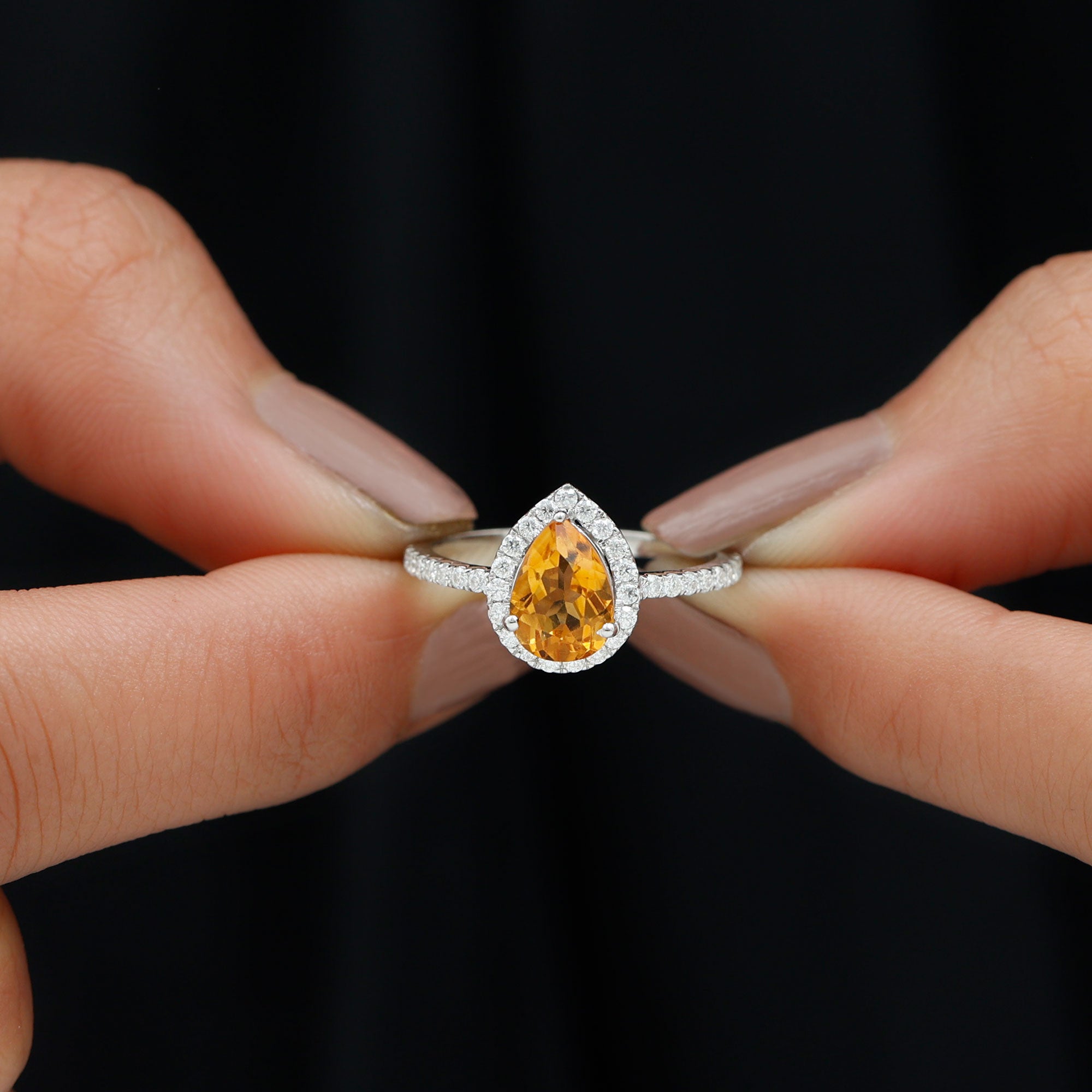 Halo Setting: A halo setting encircles the pear-shaped gem with smaller gemstones, enhancing its sparkle. The halo pattern can be of identical or different gemstones, usually round in shape. It is all about adding an intricate as well as luxurious touch to the gemstone and the overall ring design. In a pear-shaped diamond band, the accent of other gemstones, shining or colored, makes the center stone's shape more beautiful and adds meaning and brilliance to the piece.
