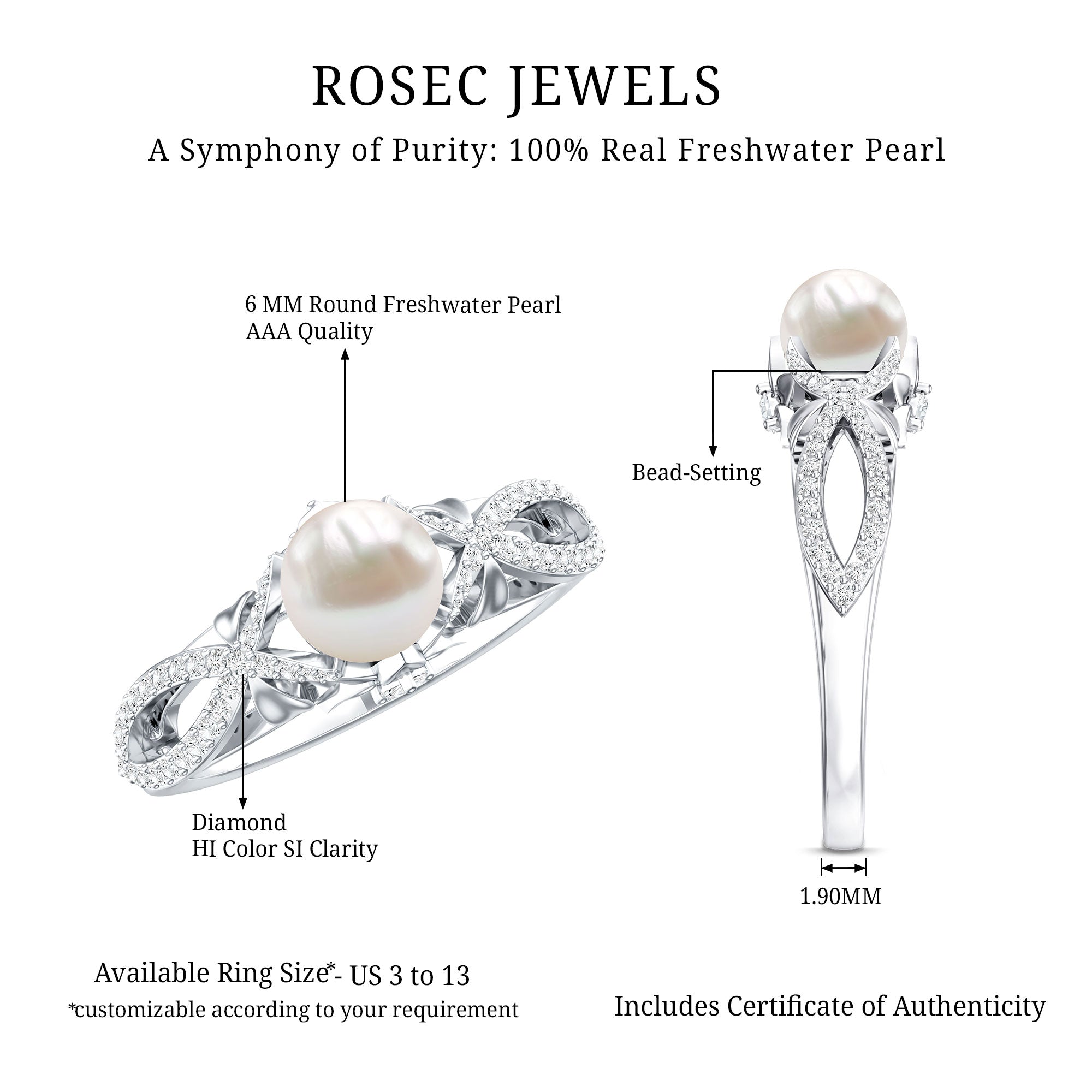 At Rosec Jewels, we specialize in crafting stunning freshwater pearl engagement rings, unique pearl wedding rings, pearl wedding bands, pearl engagement ring sets (even pearl bridal rings are all in rage), and so on, that highlight serene beauty. Our team of skilled artisans is dedicated to crafting pearl rings that cater to the distinct styles and tastes of women worldwide. We love to experiment with various shapes and sizes of freshwater pearls, along with precious metal embellishments and gemstones, resulting in breathtaking nature-inspired pearl rings, halo rings, and cocktail pearl rings that are perfect to celebrate your big day.