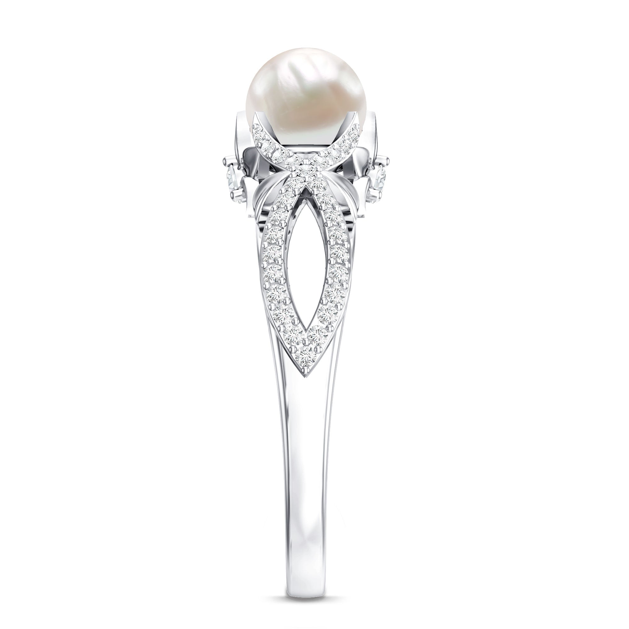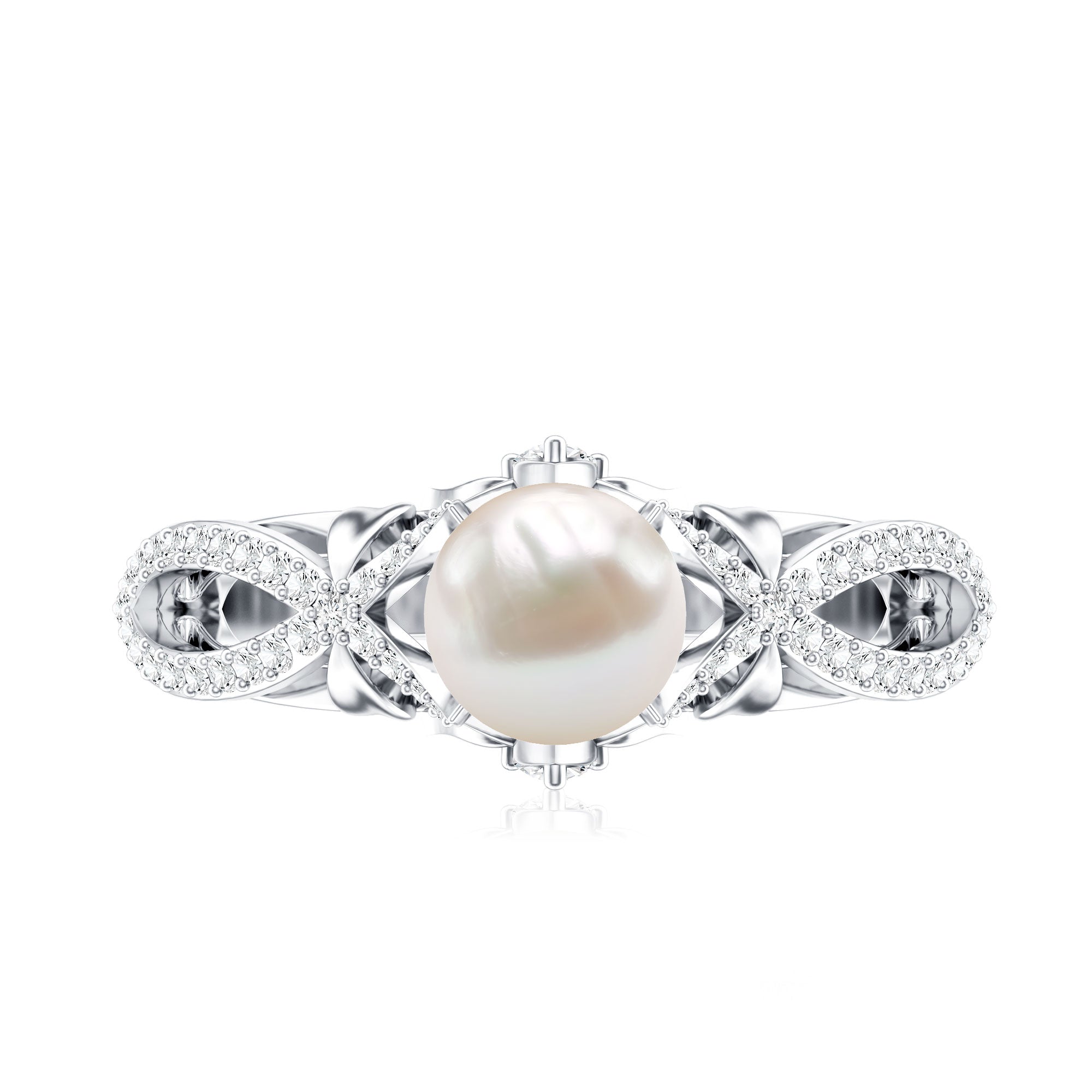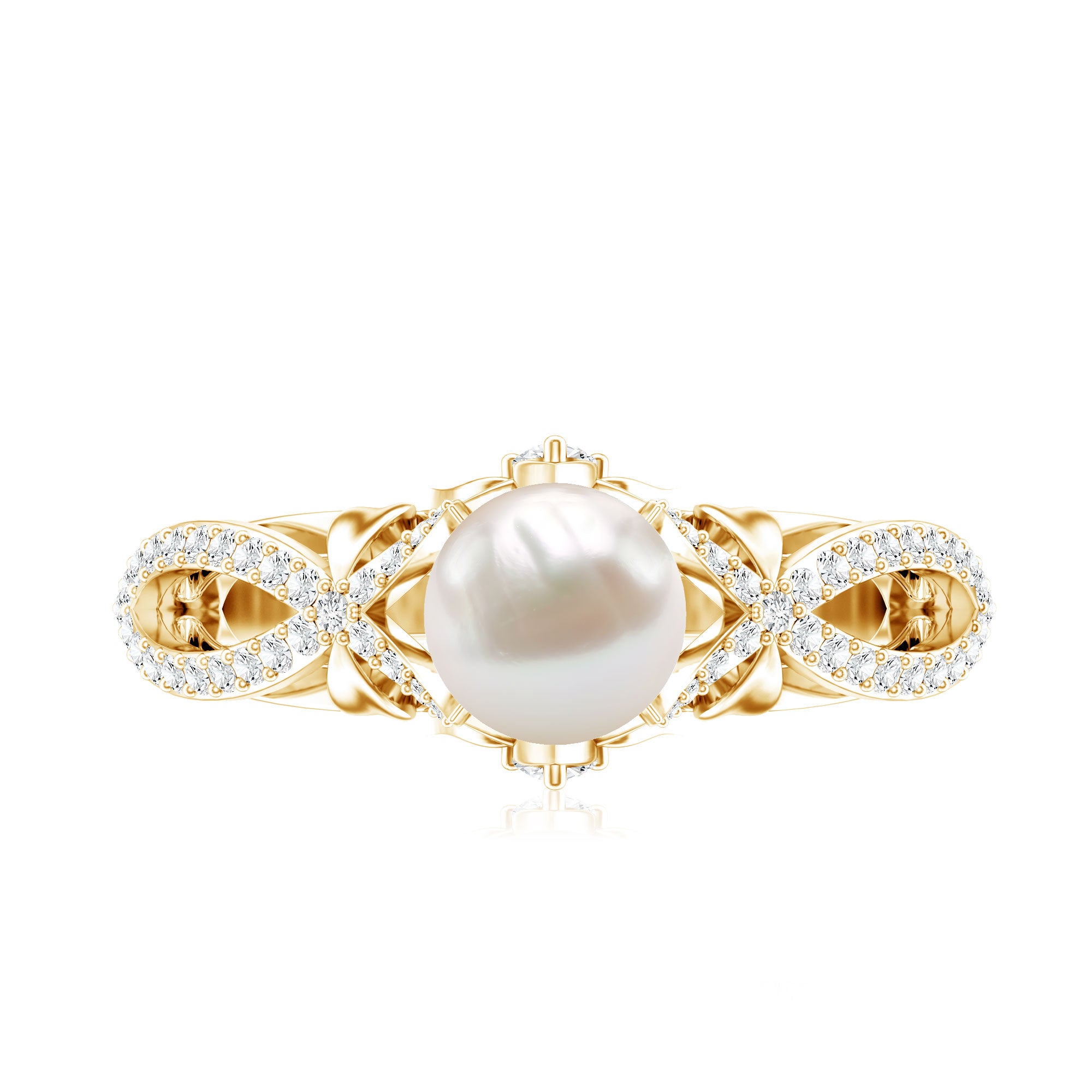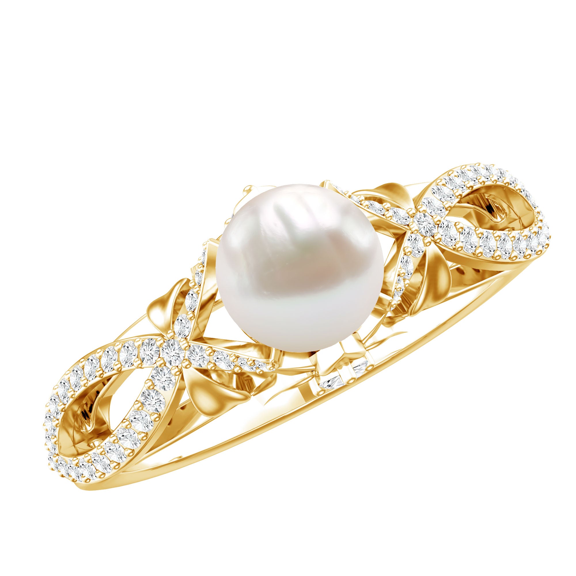 Freshwater Pearl Crossover Rings: - A freshwater pearl diamond rings designed in yellow gold or white gold, uplifts its timeless charm. The crisscross shank is elaborated with small glistening diamonds, set in a shared prong setting.