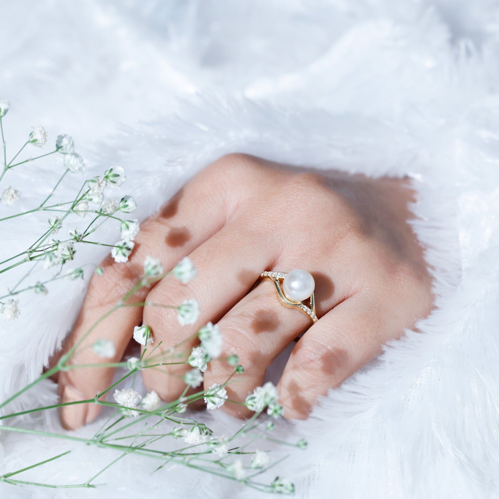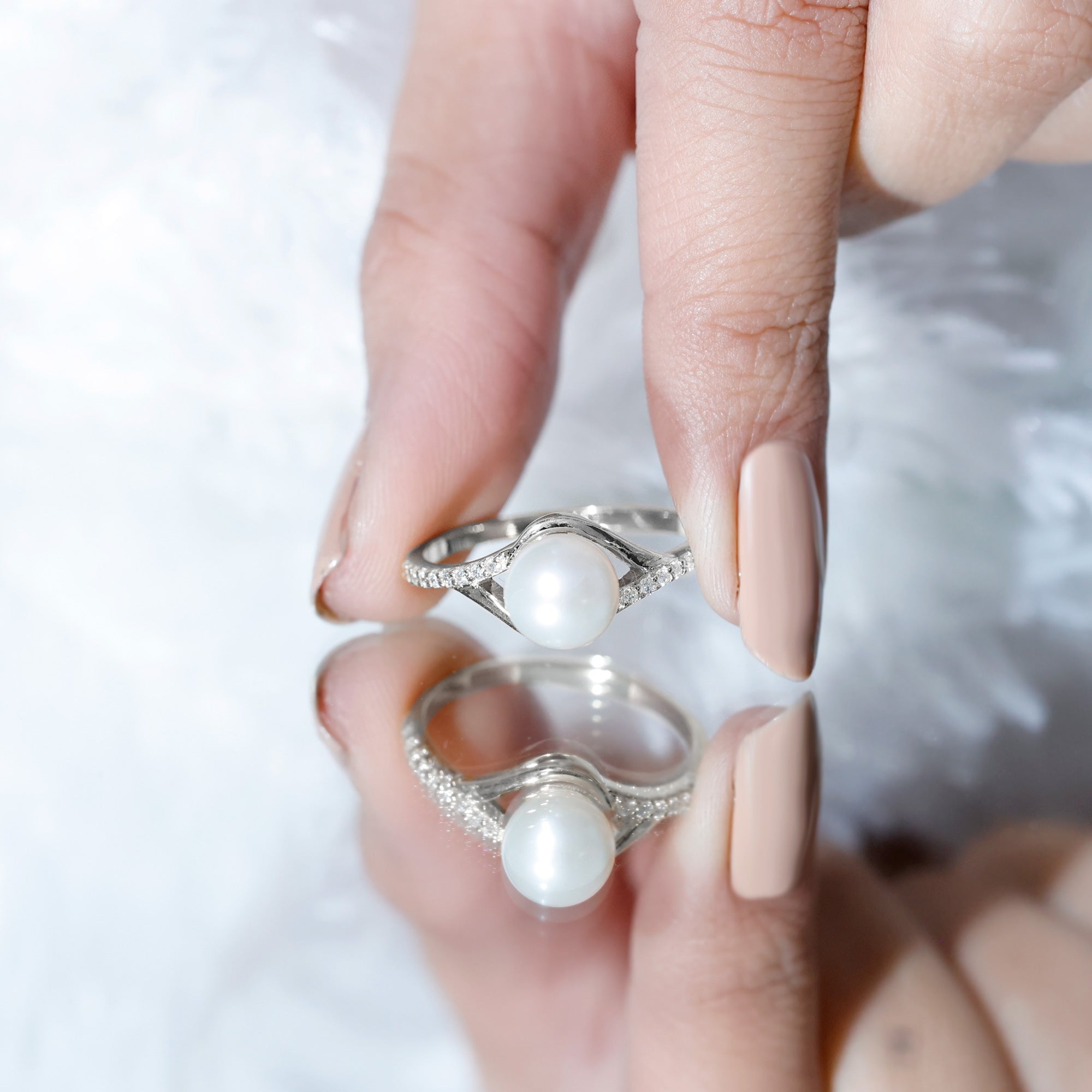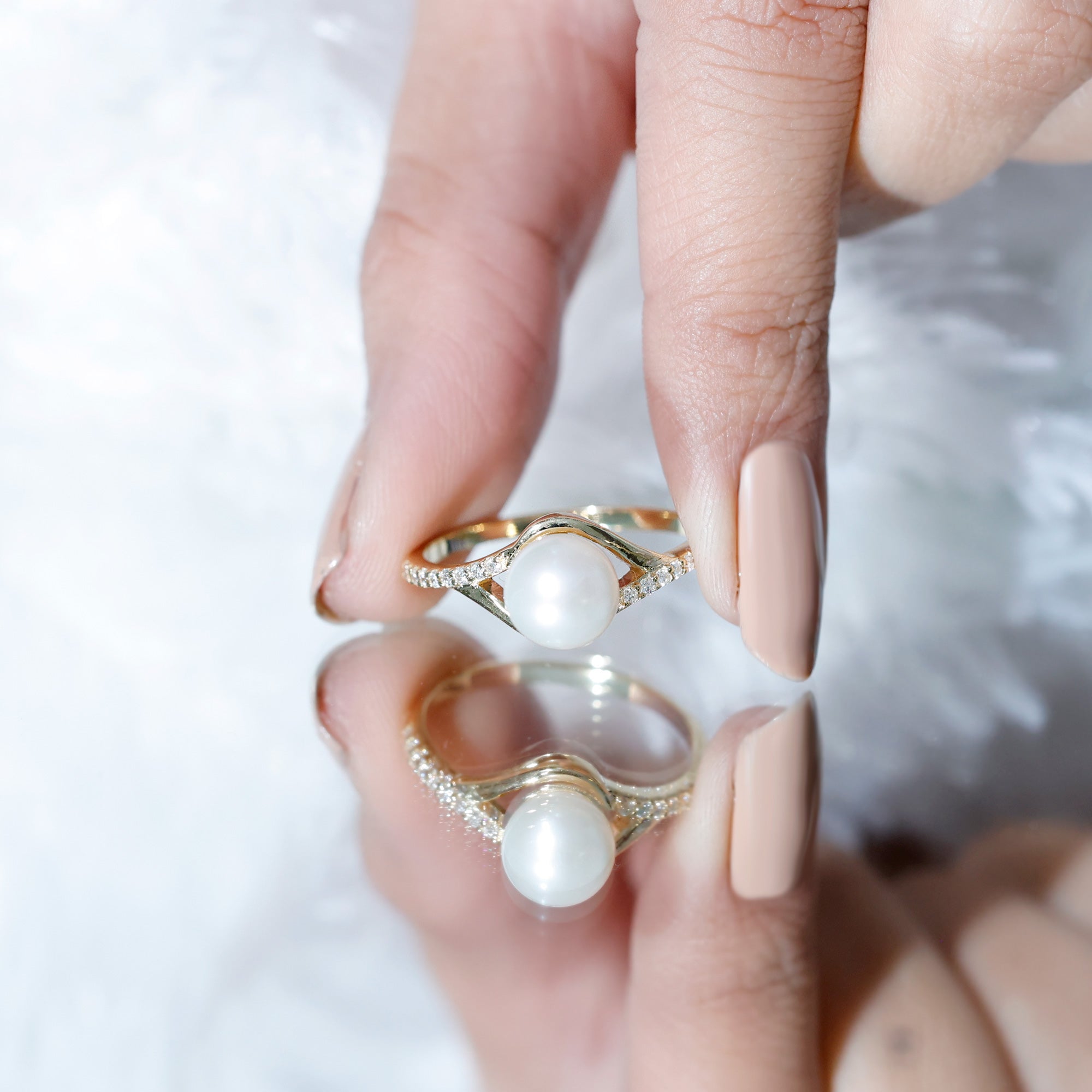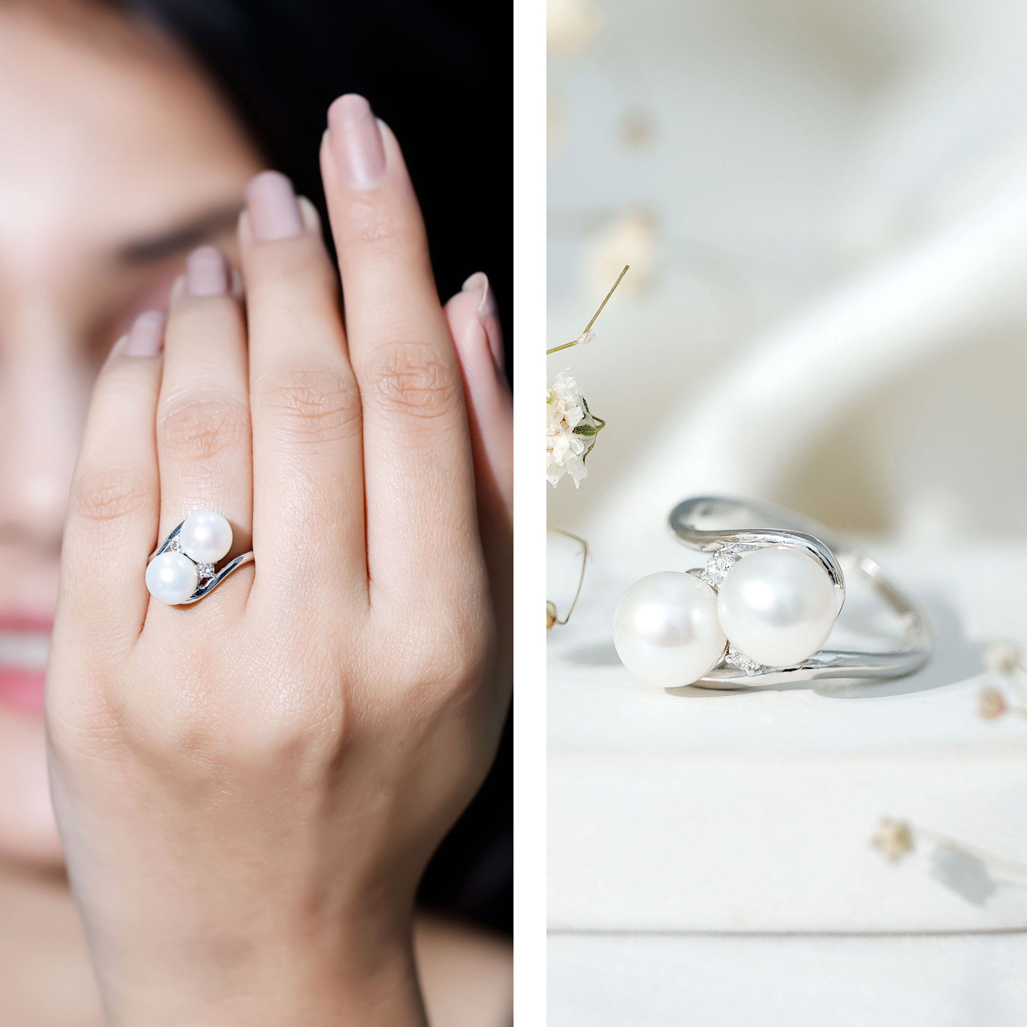6. Freshwater Pearl Contemporary Rings: represents a fusion of modern design with the aesthetic charm of freshwater pearls. Each ring is characterized by contemporary styles that combine with classic elegance of pearl and extra gemstones such as diamonds and others. Typically, each contemporary freshwater pearl ring features a minimalist wrap design and sparkling diamond gems, adding a contemporary twist.