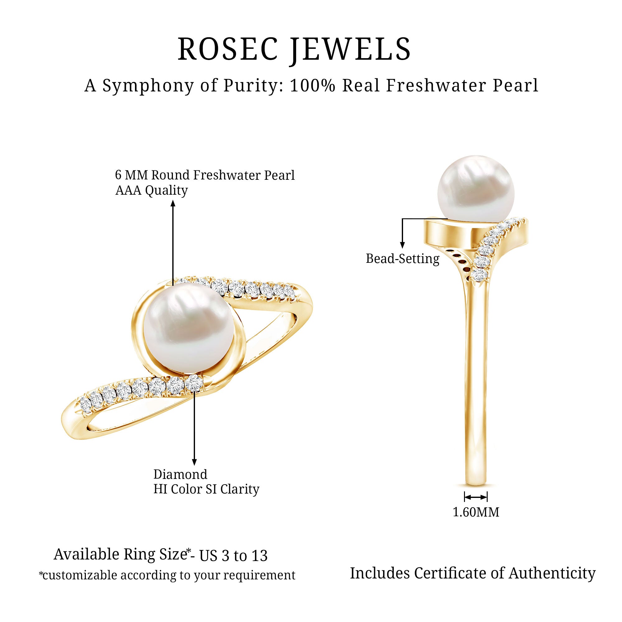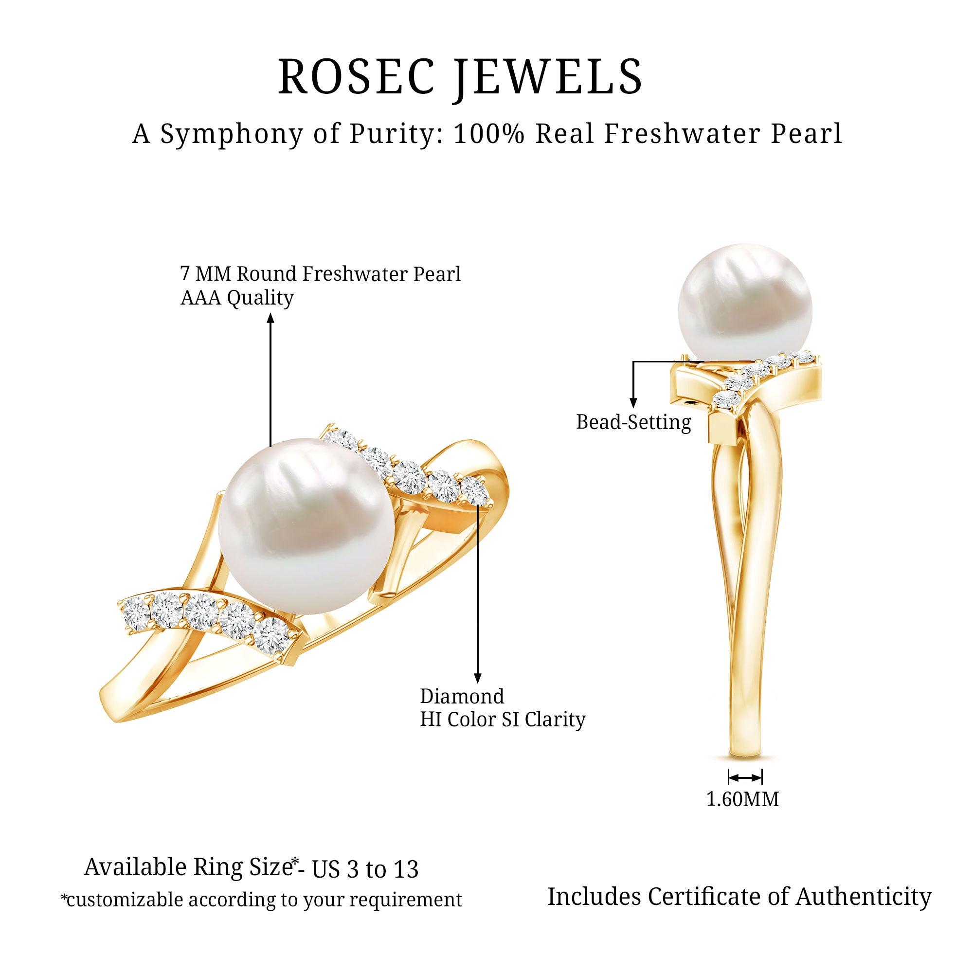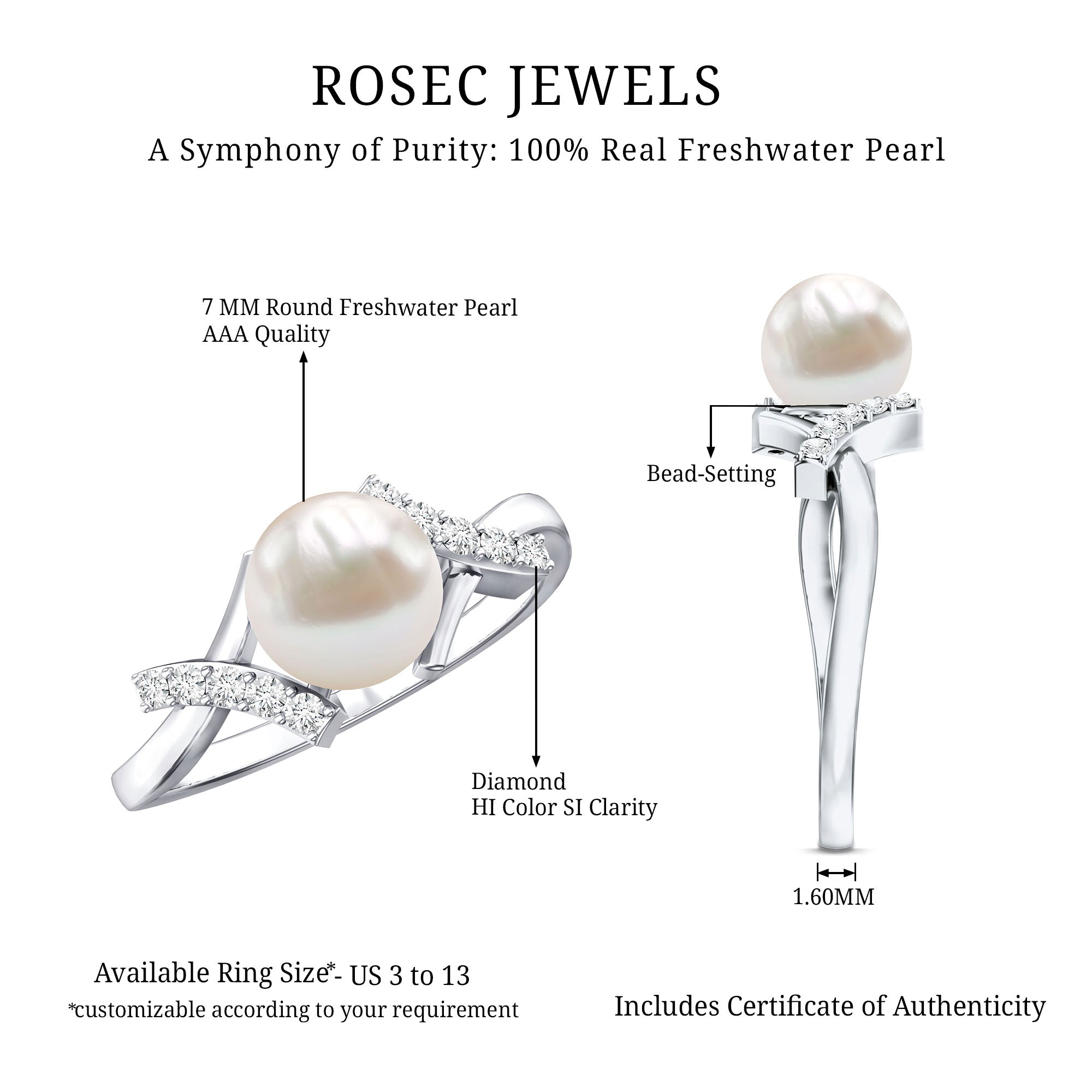 Freshwater Pearl Solitaire Rings: - Features a single pearl, set to grab the attention as a centerpiece. Our freshwater pearl solitaire rings are sought-after for their refinement and simplicity. Typically, solitaire pearl rings crafted in metal bands like white gold, yellow gold, and sterling silver, create timeless elegance for wearers.