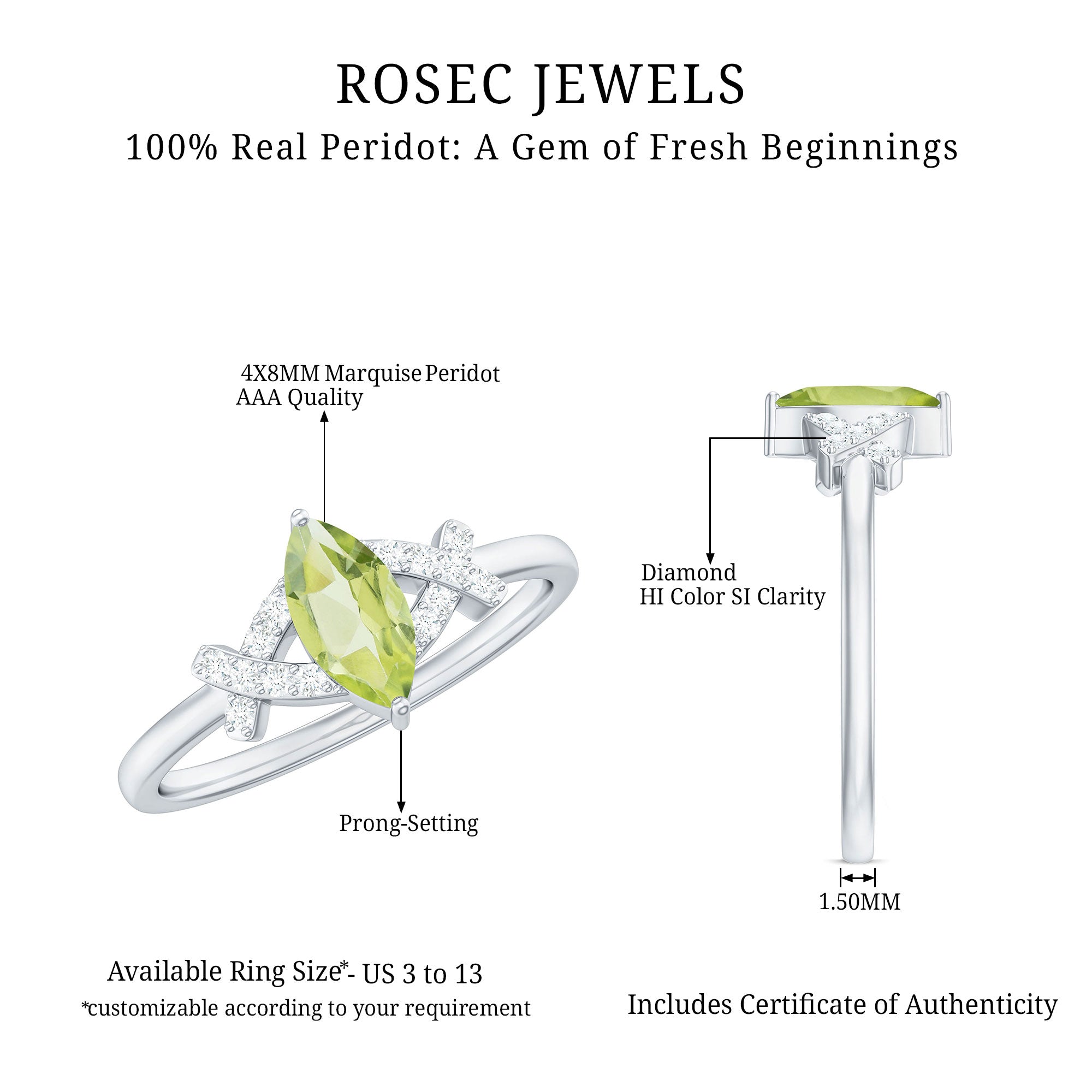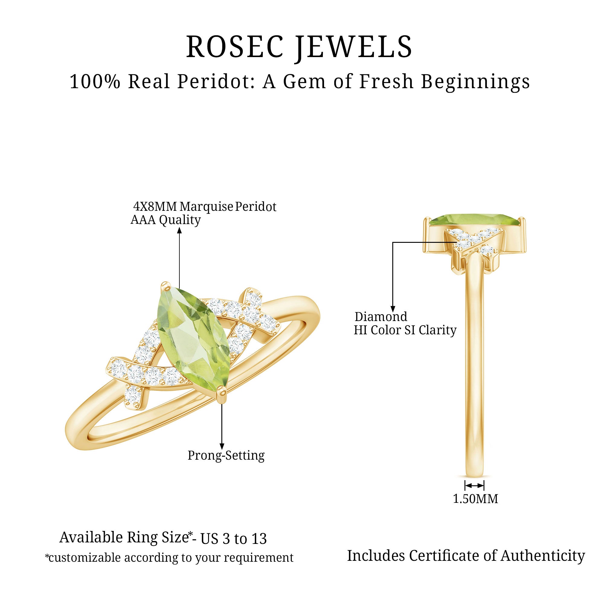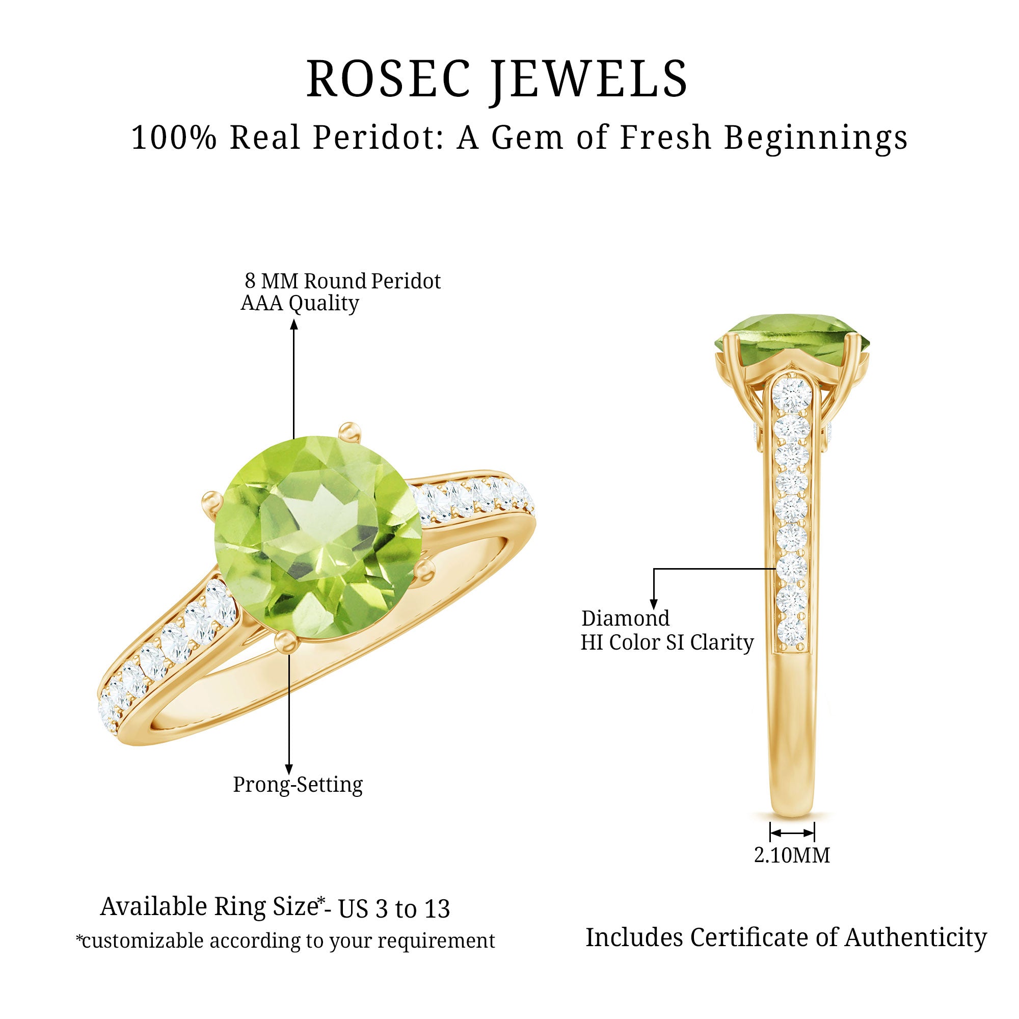 Rosec Jewels have a fascinating collection of vibrant peridot rings. Check out the beautiful collection today and pick your favorite now!