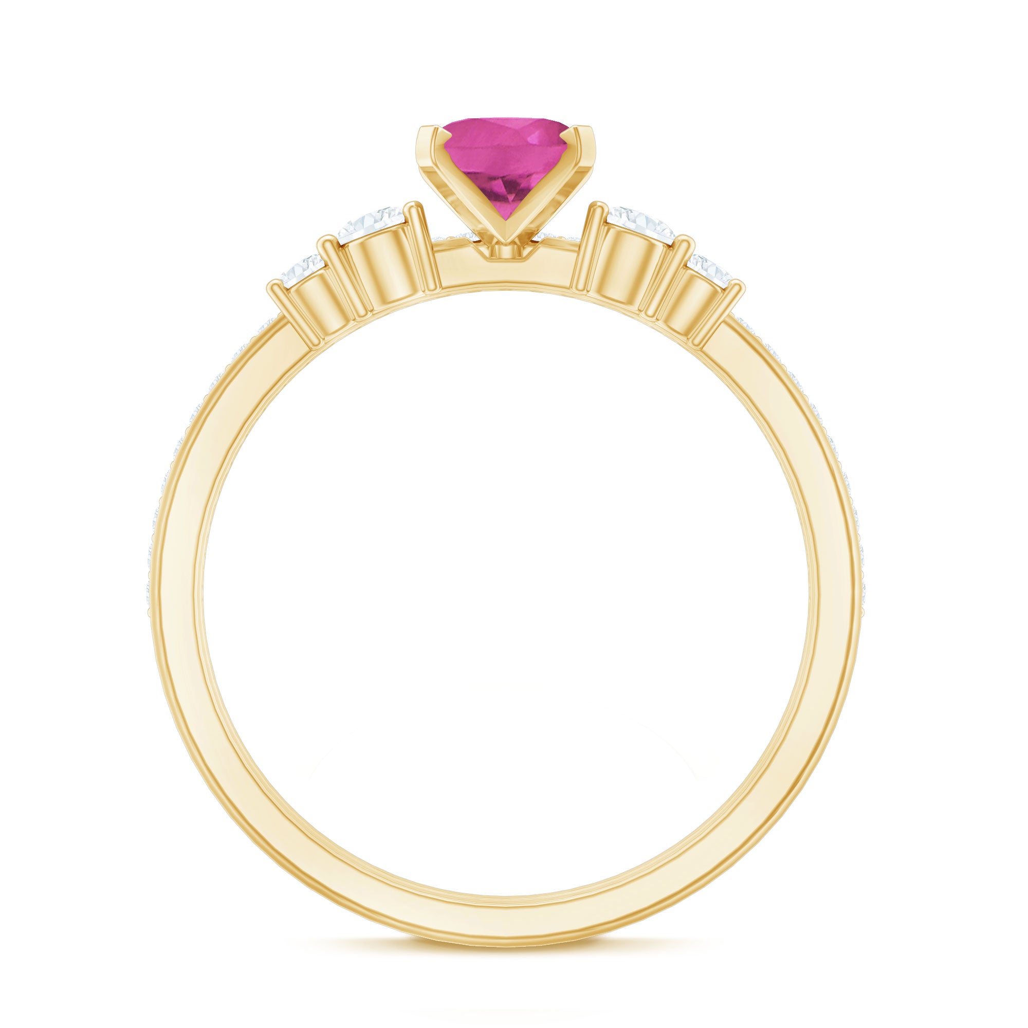 Lending an edgy appeal to the Simple Solitaire Style, this ring style is characterized by a parade of Diamond/Moissanite all around the Pink Tourmaline. The Halo doesn’t just brighten up the look of your Pretty Pink Center Stone but also helps it stand out by lending it an illusion of a bigger size. For those who fancy some sparkles in their emblem of love, it makes for a beautiful Pink Tourmaline Engagement Ring.