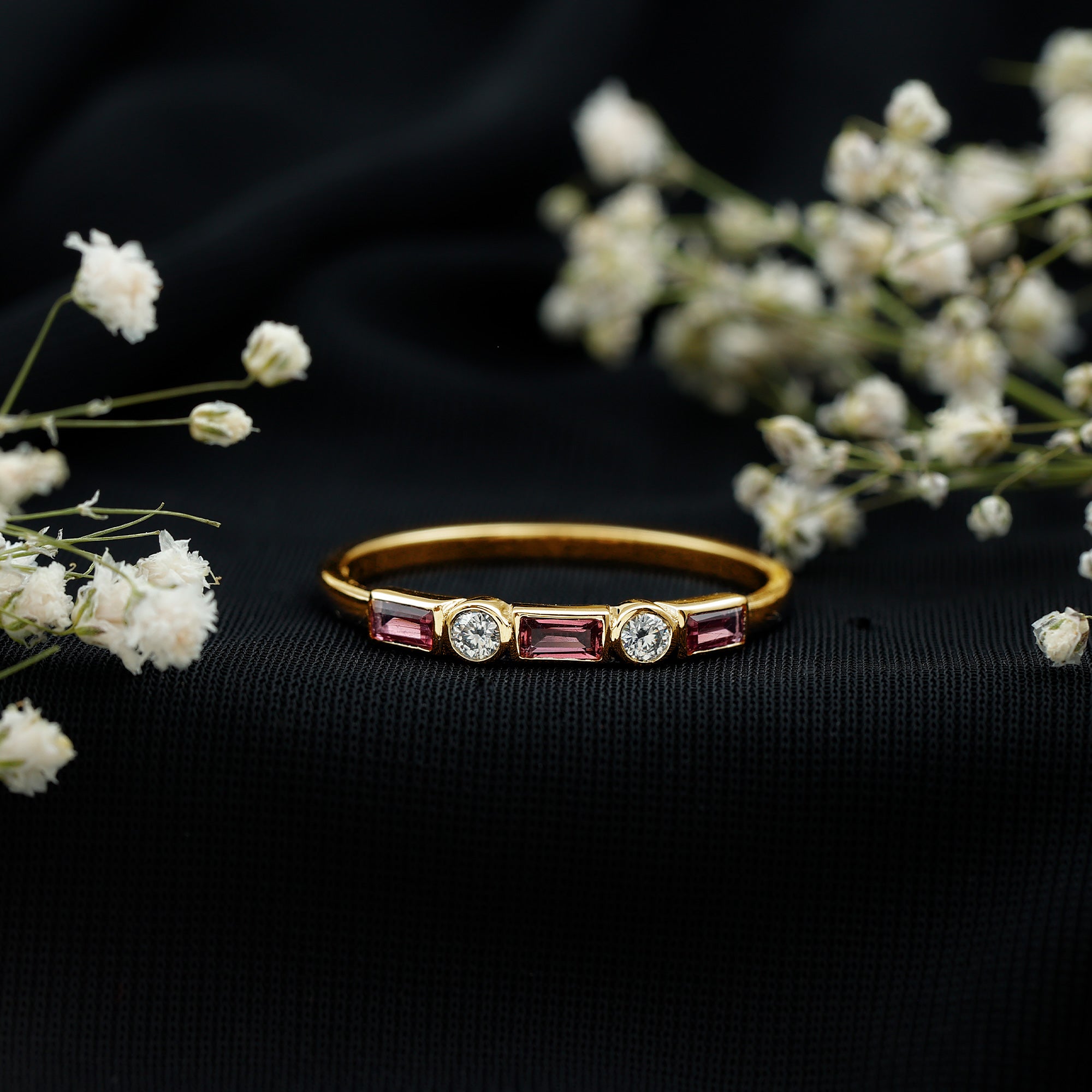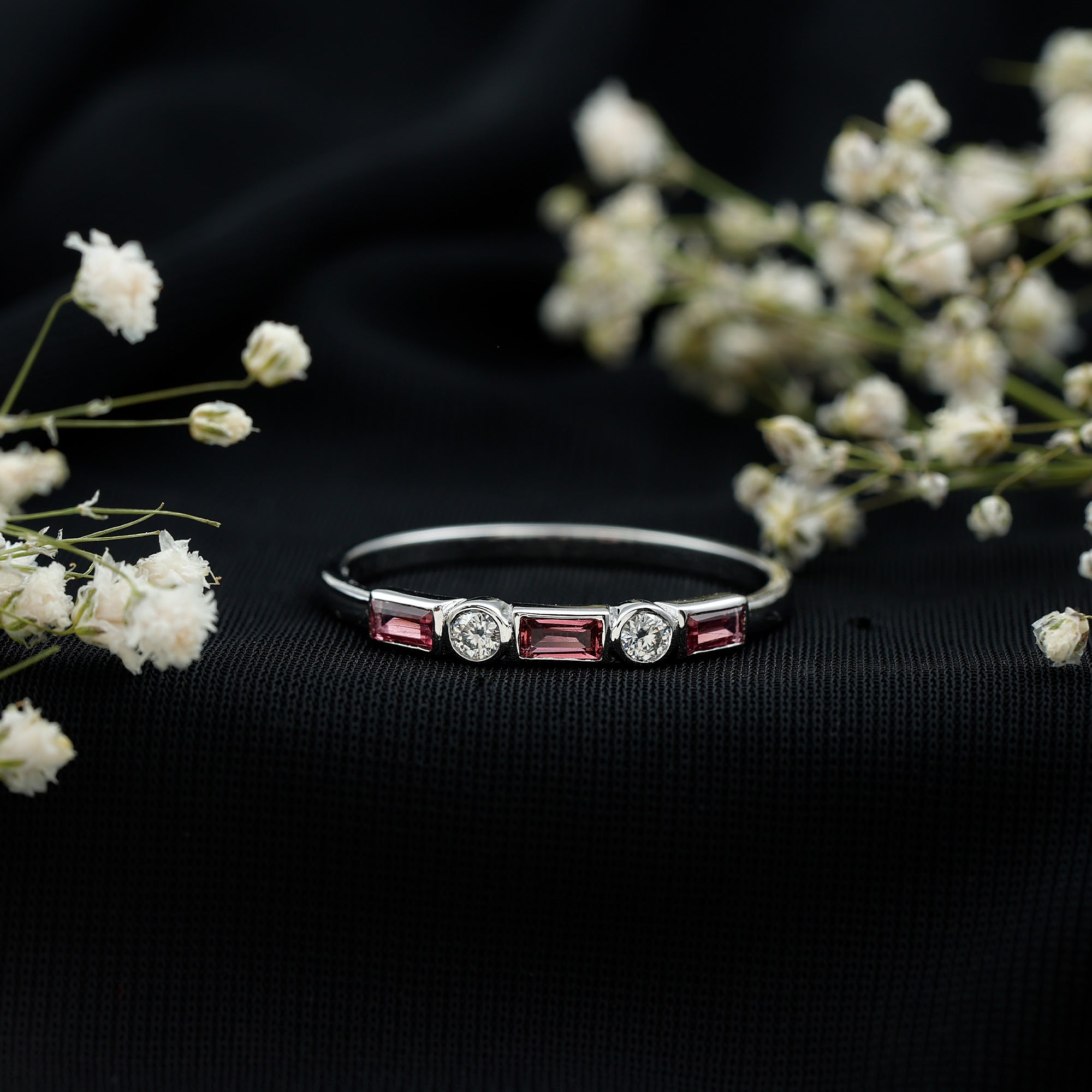 A Pink Tourmaline Eternity Ring is adorned with identically sized Pink Tourmaline all over the band. If you can’t get enough of the rosy pink hue of this October Birthstone, the good news is that an Eternity Ring is all about it. Besides that, it carries a meaning just as romantic as its appearance. It commemorates the kind of love that is meant to last a lifetime, which also makes it a meaningful Pink Tourmaline Wedding Ring.