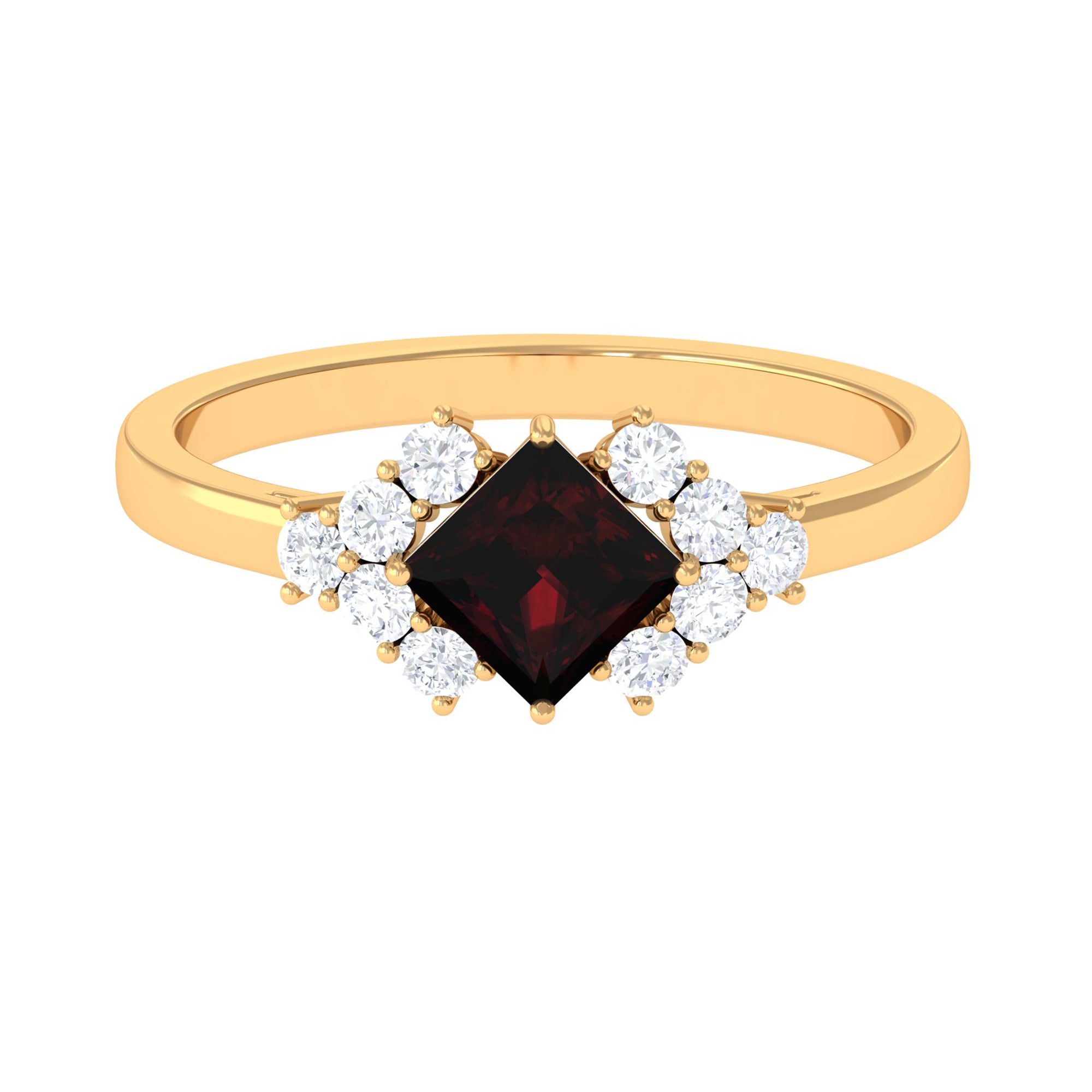 Princess cut center gemstone is surrounded by a circle of mostly smaller round stones for a sparkling and dramatic look. Gemstone halo makes the center stone appear larger and adds a grace to the princess cut gemstone engagement rings.