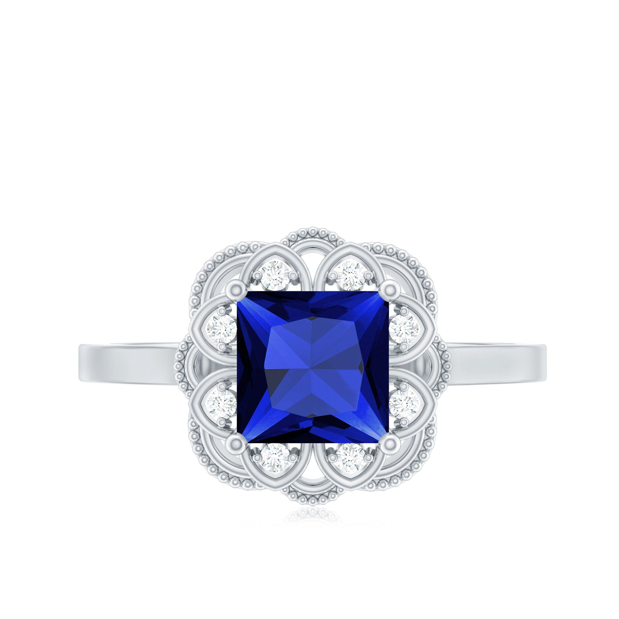 Princess cut center gemstone is surrounded by a circle of mostly smaller round stones for a sparkling and dramatic look. Gemstone halo makes the center stone appear larger and adds a grace to the princess cut gemstone engagement rings.