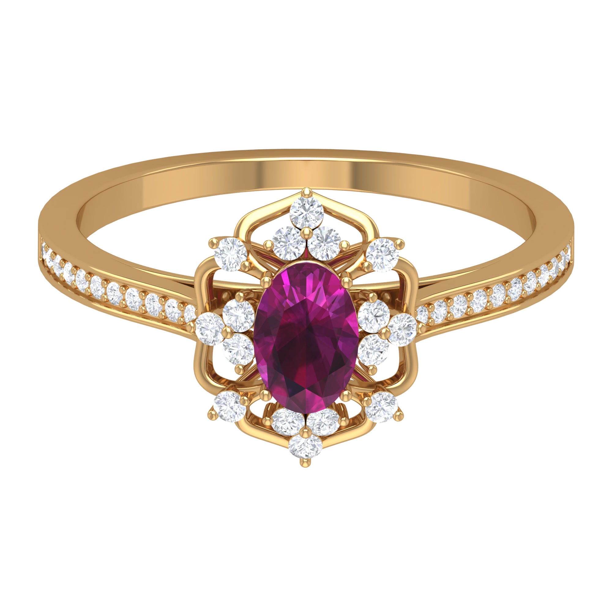 When the center stone of Rhodolite is adorned with a sparkling parade of Diamond/Moissanite all around, it is referred to as a Rhodolite Halo Ring. The Halo lends an interesting aesthetic appeal to the otherwise classic Rhodolite Solitaire Ring. Not to forget- it also makes the Rhodolite appear larger than its actual size.
