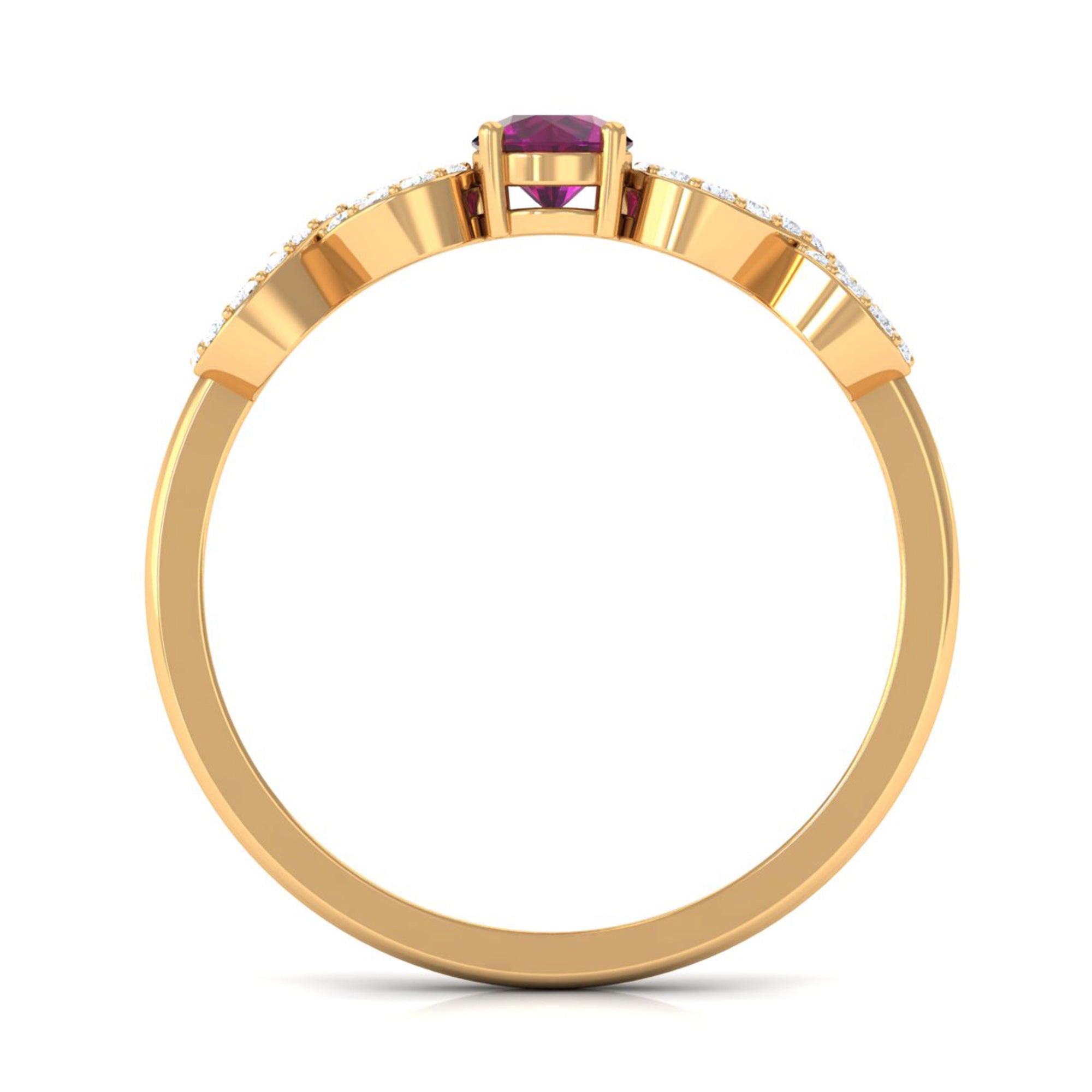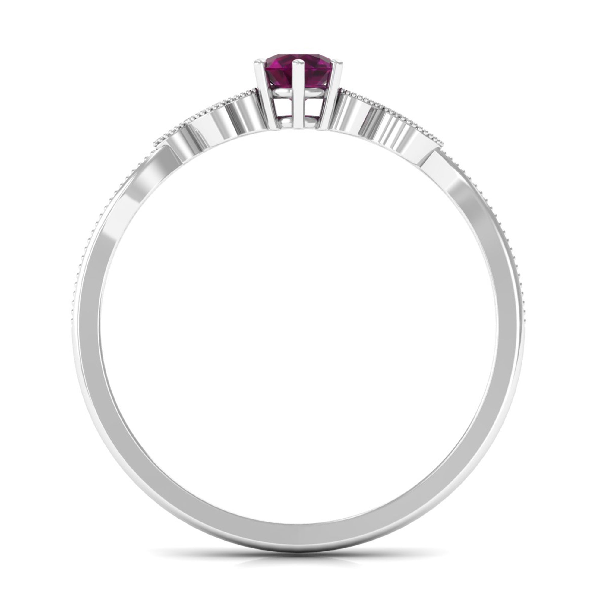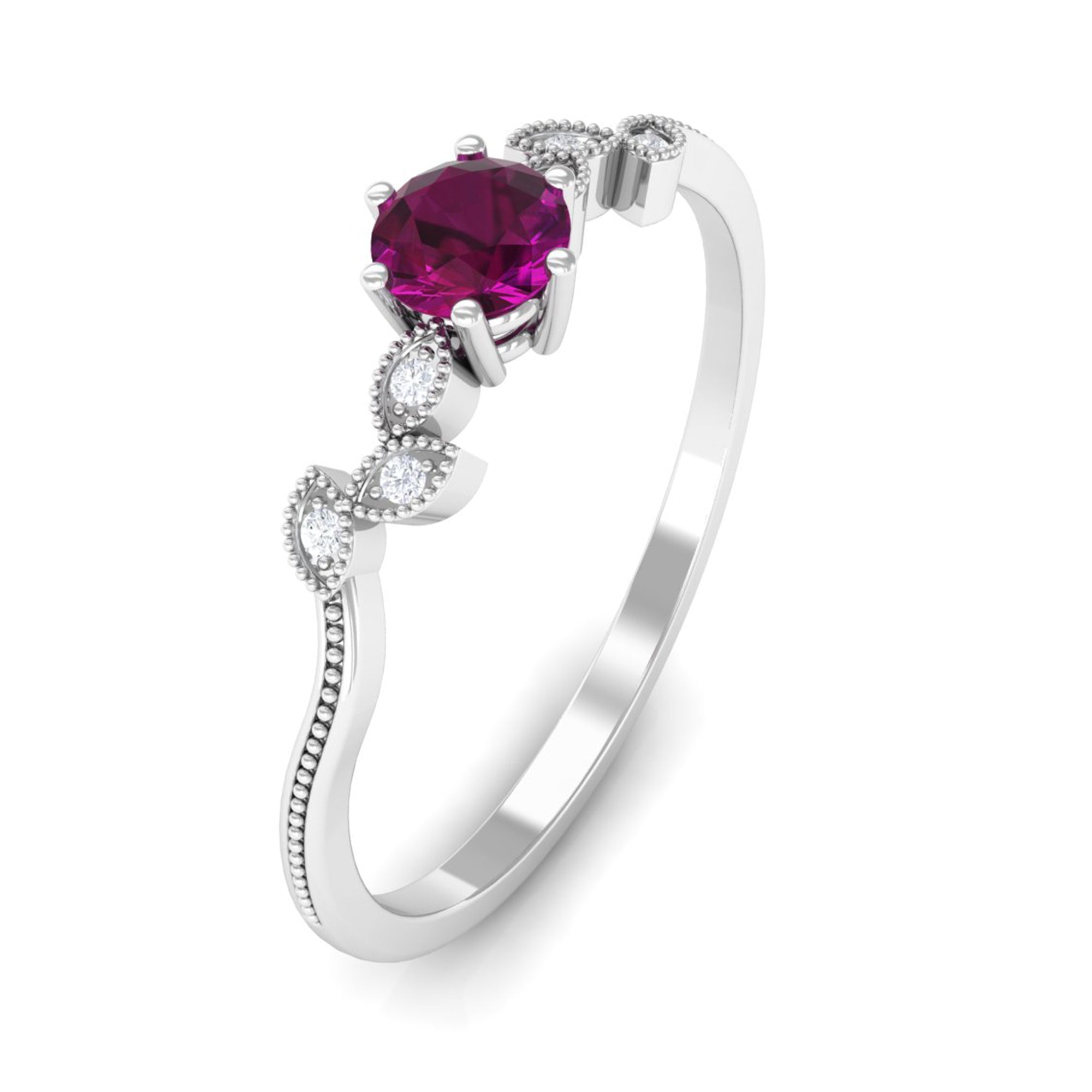 Adorned with the Single Stone of Rhodolite that takes all the center stage, a Rhodolite Solitaire Ring is the go-to choice of ring style. The Rhodolite Solitaire here is at least 6 MM in size. Despite its understated style, this ring style pleases many senses of style, which makes it a highly versatile Rhodolite Engagement Ring. For a classic aesthetic, a Round Cut Rhodolite Ring works best. While for a fancier aesthetic, nothing better than a ring fashioned in princess, marquise, or pear-cut Rhodolite. If you fancy a vintage vibe, you won’t find a better pick than a Rhodolite Ring adorned with Asscher, Emerald, or Cushion Cut.