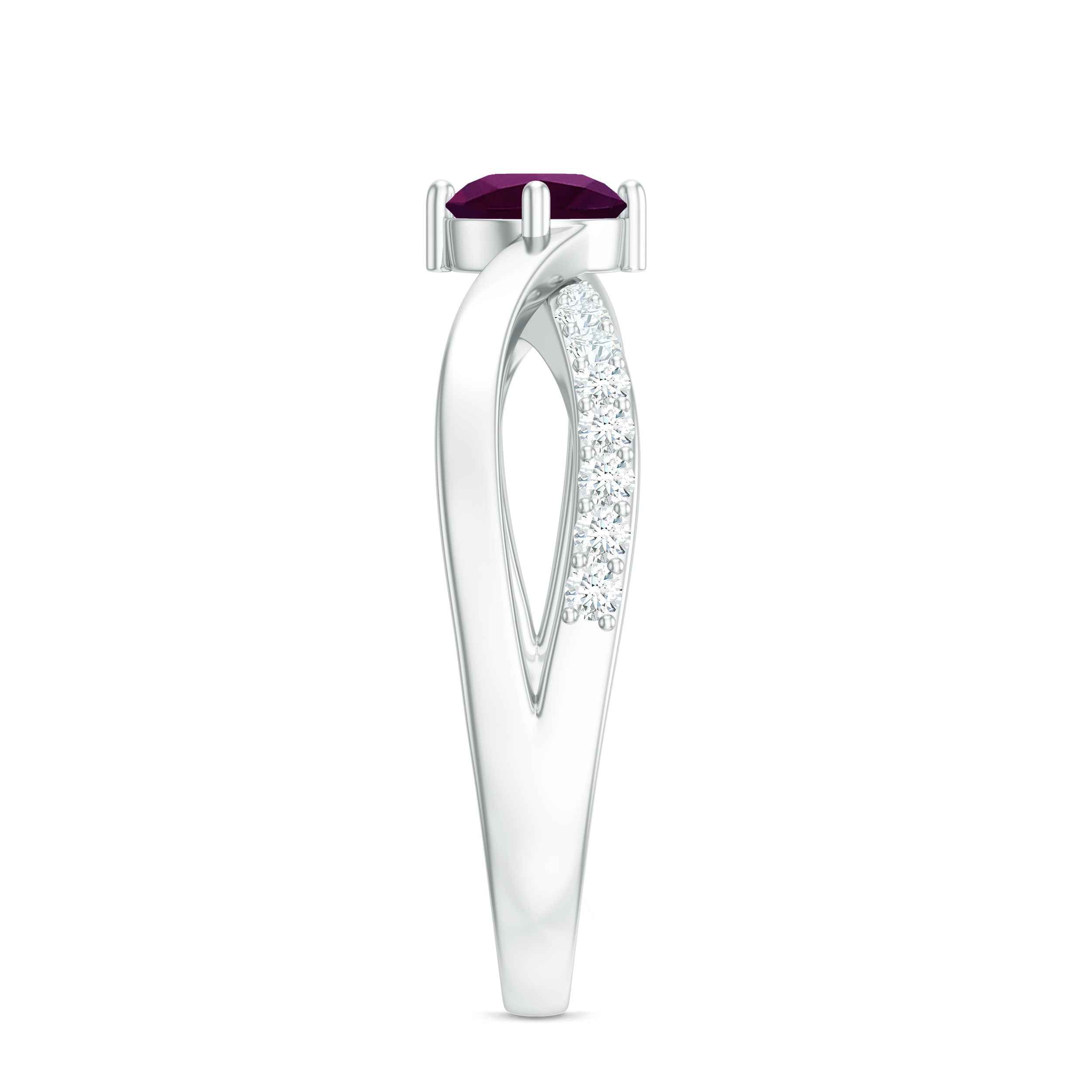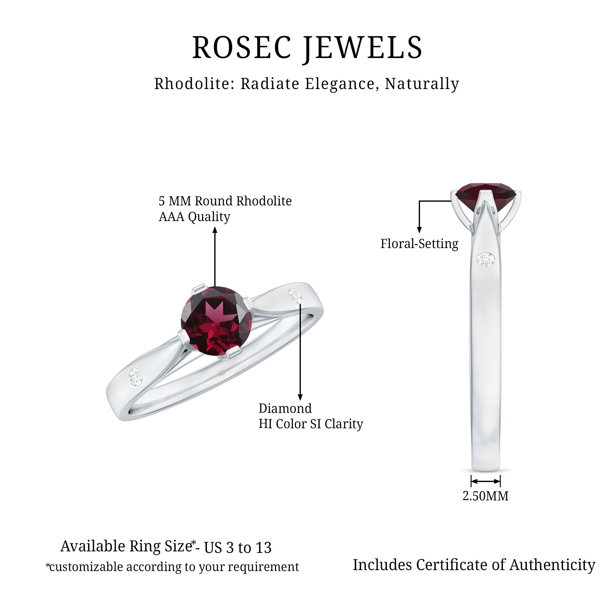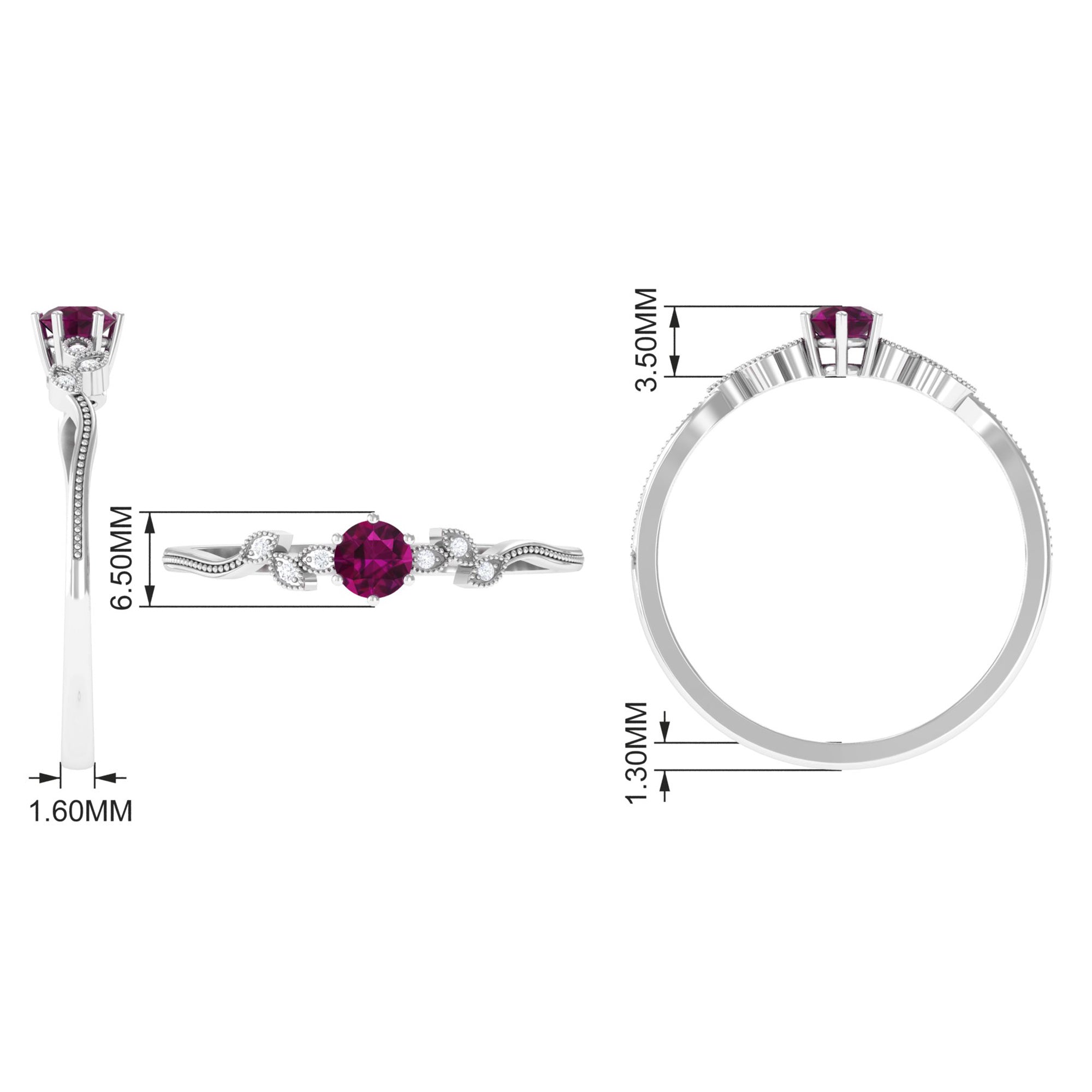 Adorned with the Single Stone of Rhodolite that takes all the center stage, a Rhodolite Solitaire Ring is the go-to choice of ring style. The Rhodolite Solitaire here is at least 6 MM in size. Despite its understated style, this ring style pleases many senses of style, which makes it a highly versatile Rhodolite Engagement Ring. For a classic aesthetic, a Round Cut Rhodolite Ring works best. While for a fancier aesthetic, nothing better than a ring fashioned in princess, marquise, or pear-cut Rhodolite. If you fancy a vintage vibe, you won’t find a better pick than a Rhodolite Ring adorned with Asscher, Emerald, or Cushion Cut.