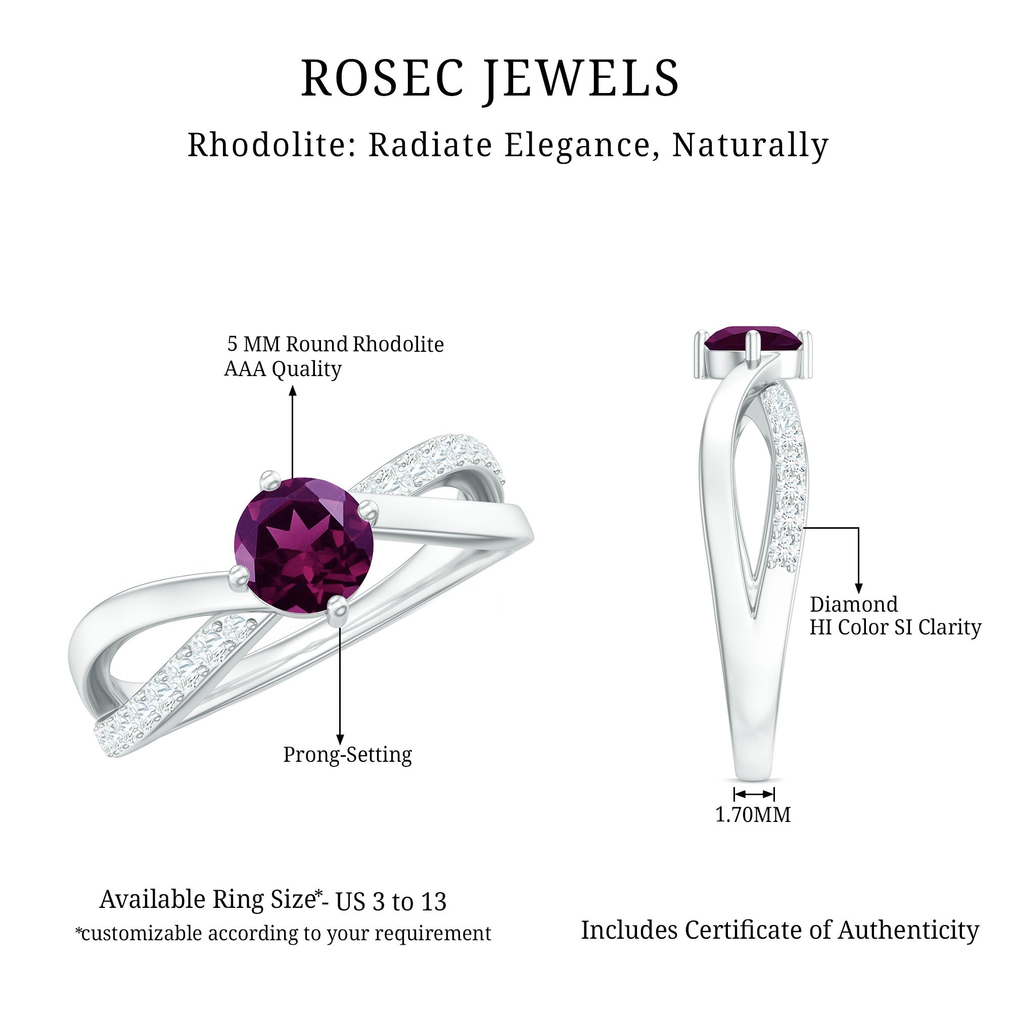 Highly regarded as the Stone of Commitment, Rhodolite is a gemstone that speaks to the wearer with its mystical symbolism. Being a renowned symbol of love, compassion, trust, and empathy, it (to no surprise) makes for a meaningful Rhodolite Engagement Ring. Moreover, it commemorates the 2nd wedding anniversary thanks to the belief that it epitomizes the eternal flame of love.