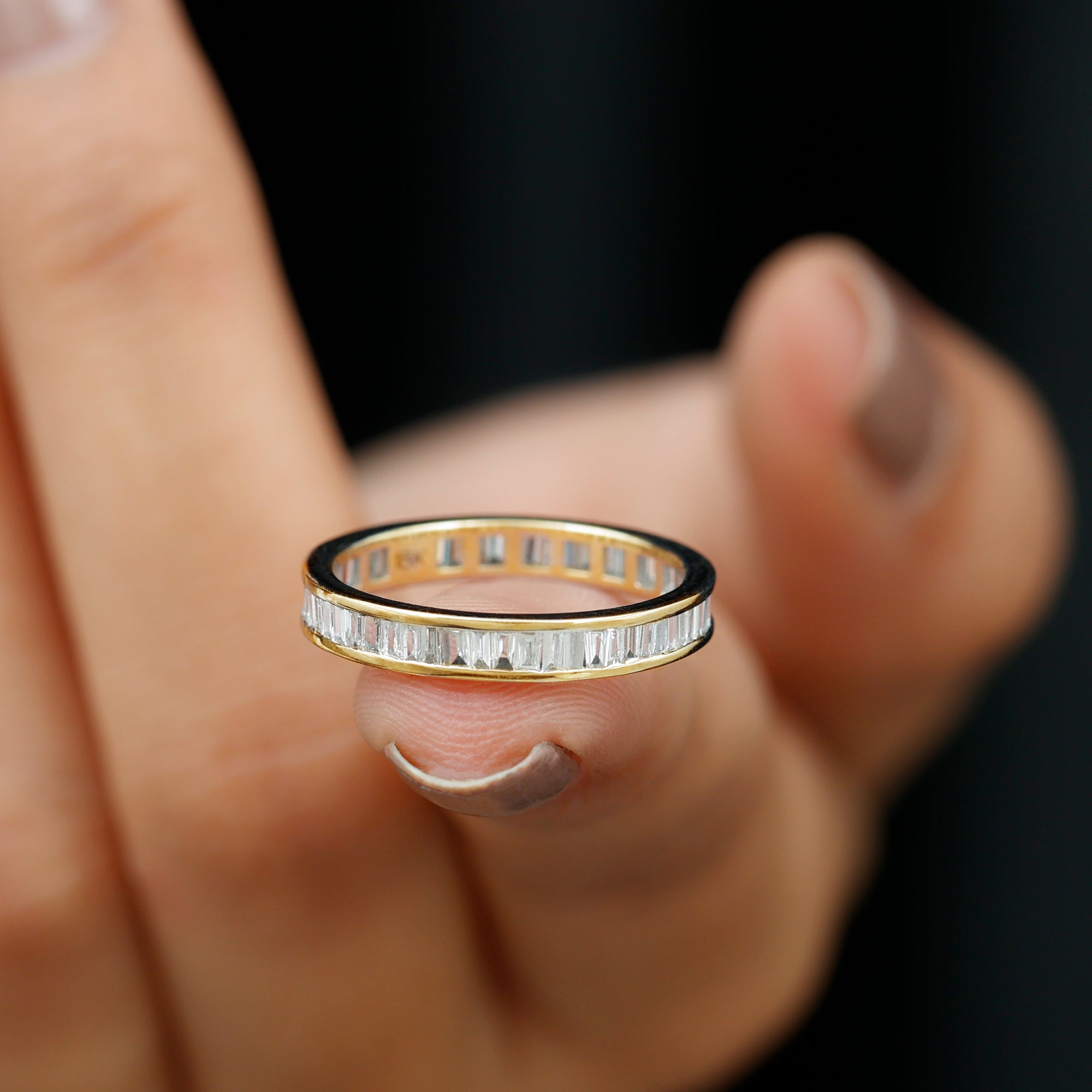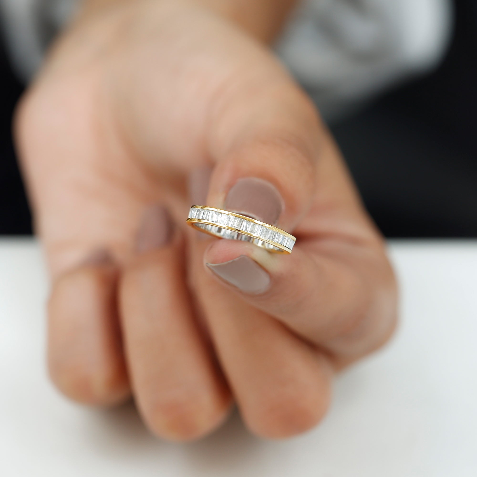 Typically, it is a type of metal ring that features gemstones set in a continuous band around the circumference of the ring. If you’re seeking something simple to flaunt regularly, a band with subtle colored stones such as Morganite, Aquamarine, Moissanite, or a Classic 14K White Gold Gemstone Band could be the one. While if you’re a little more fond of a pop of color, deeply hued stones such as Ruby, Blue Sapphire, Emerald etc., or a Yellow or Rose Gold Gemstone Band might do the job right.