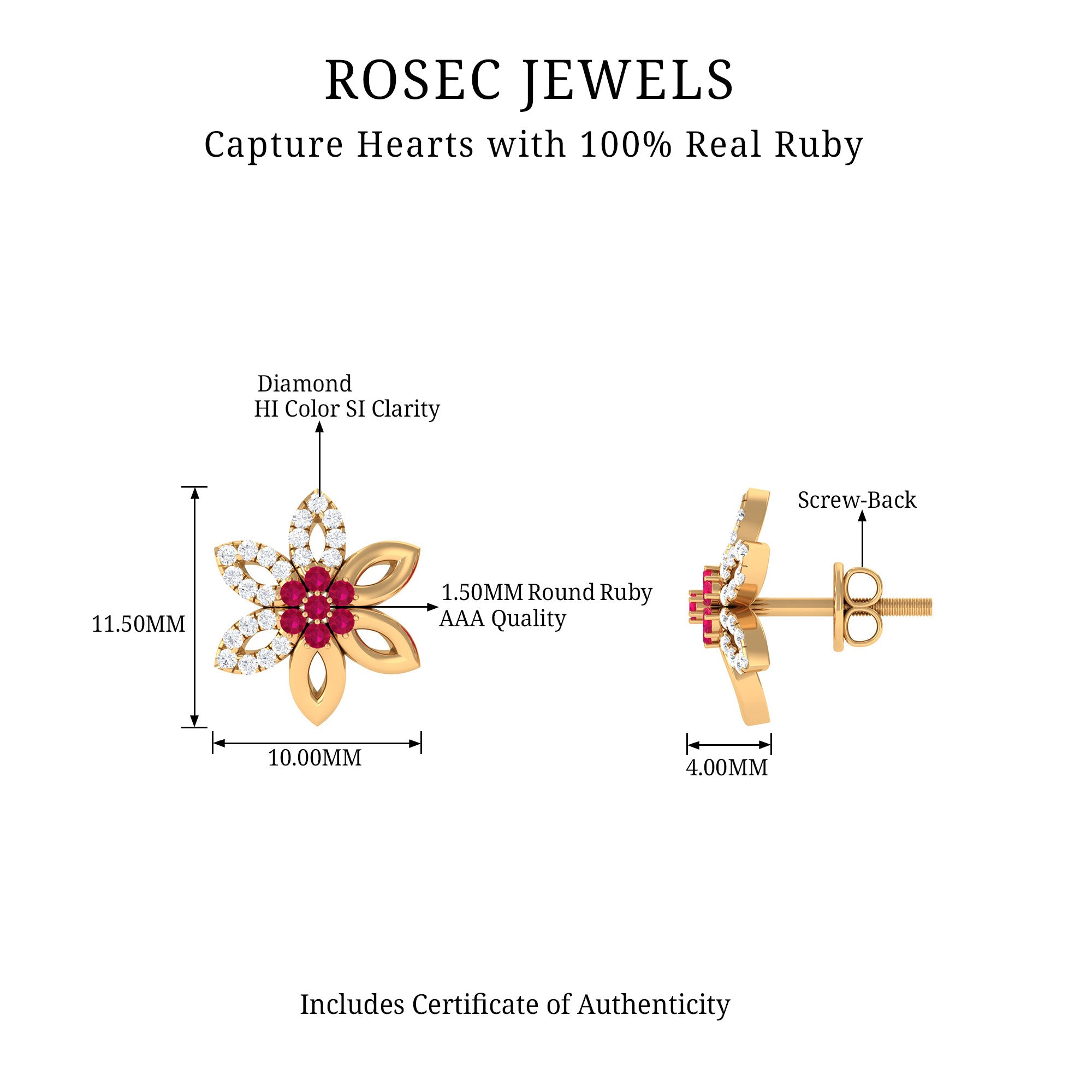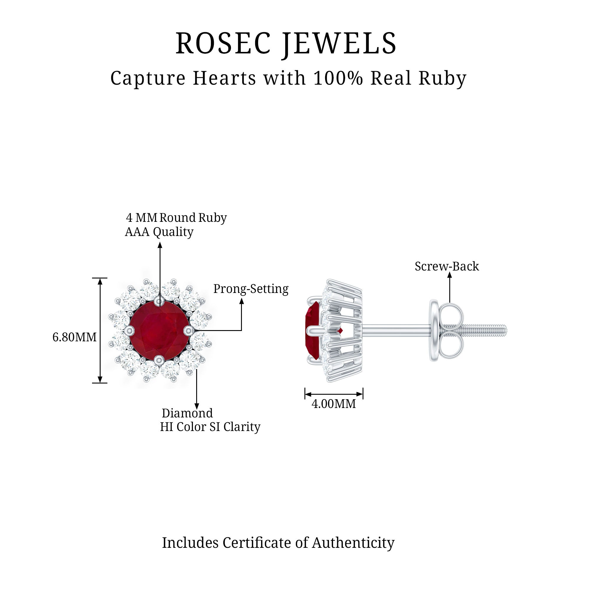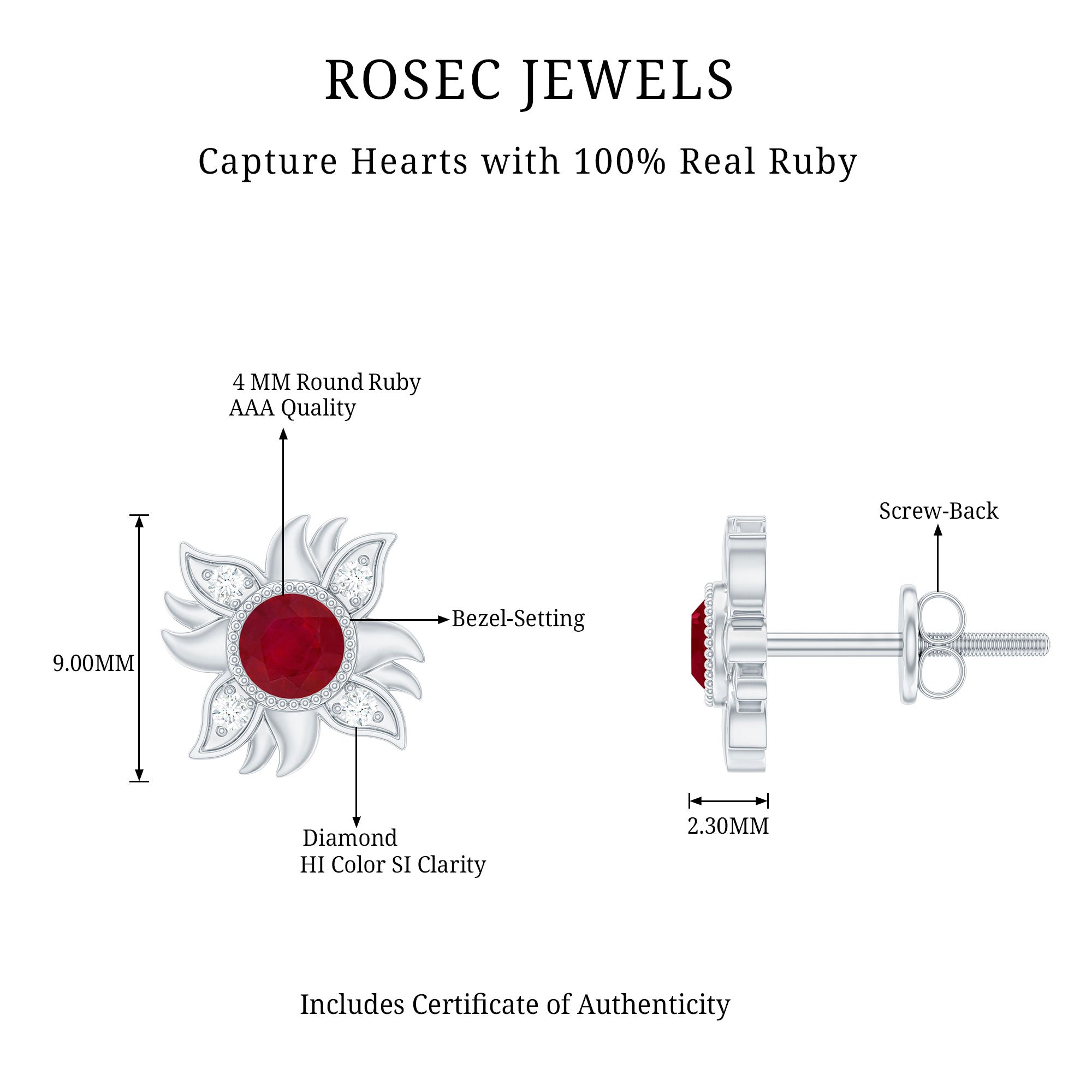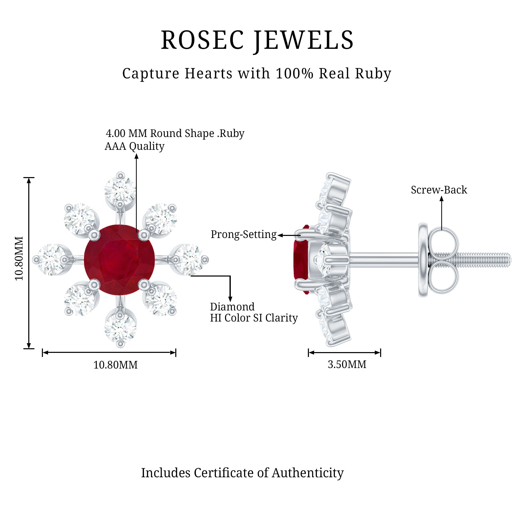 Mainly, this design of studs highlights the beauty and brilliance of ruby. These earrings are available in various metals like white gold, yellow gold, and sterling silver. The choice depends on your budget and preferences.