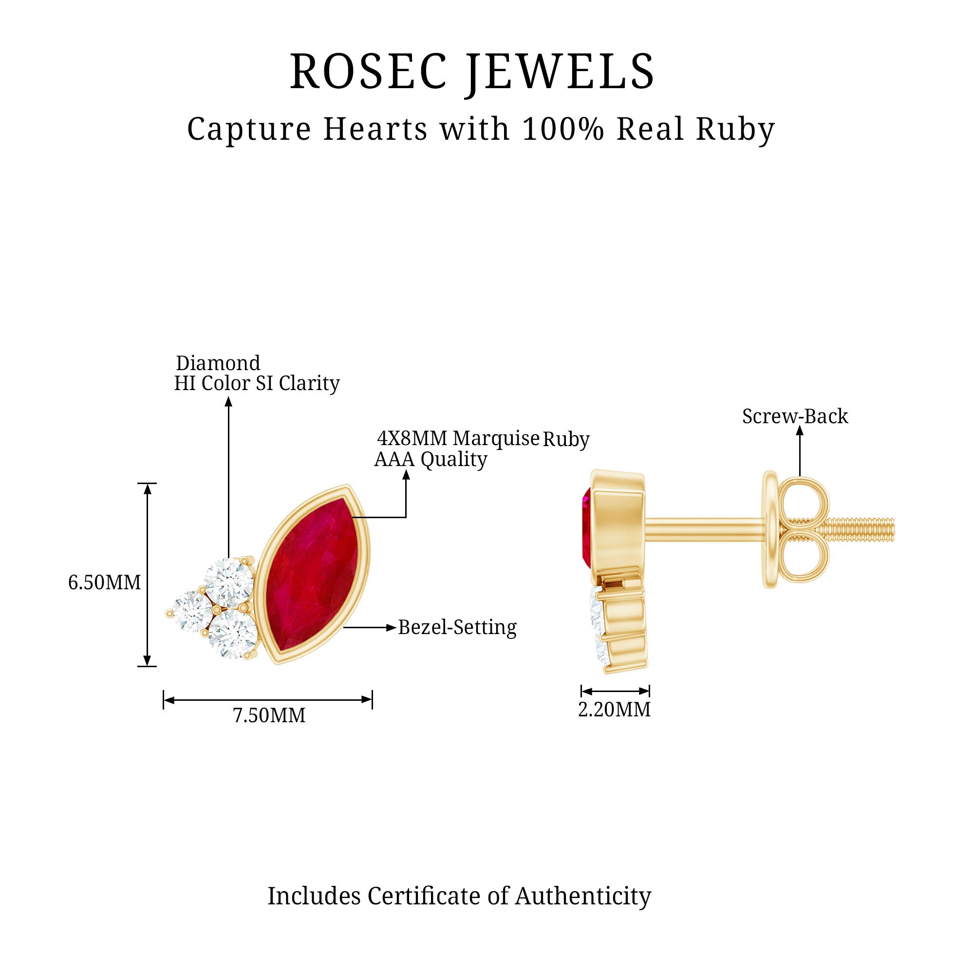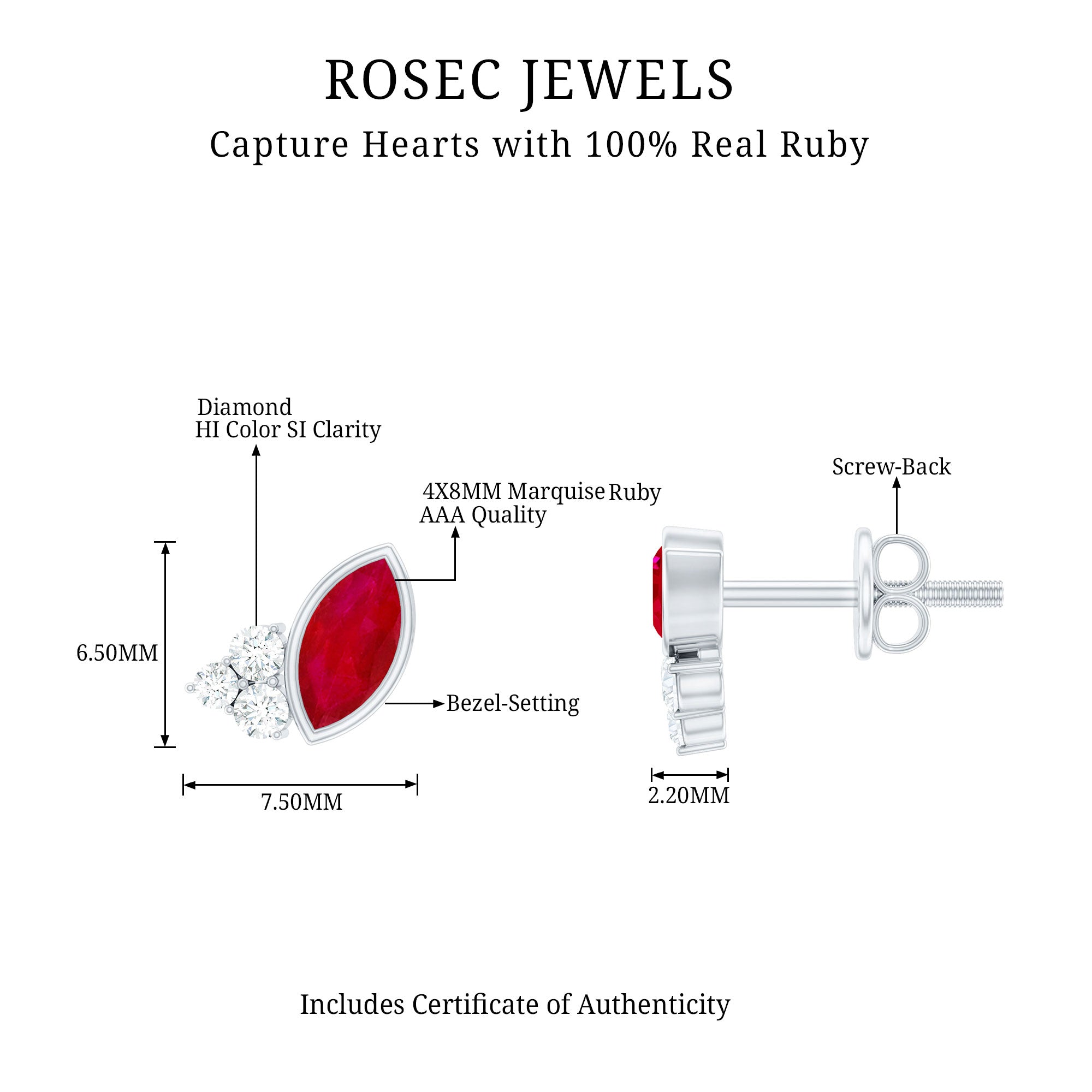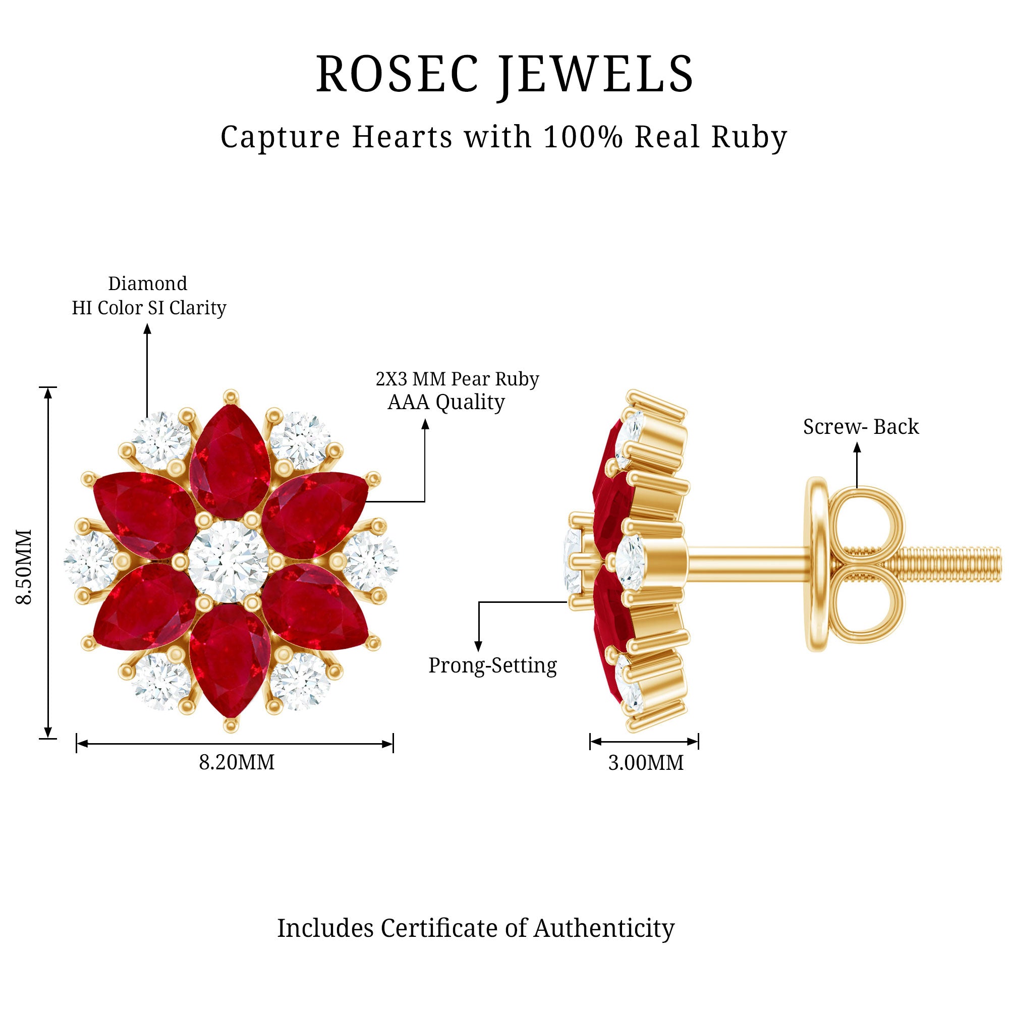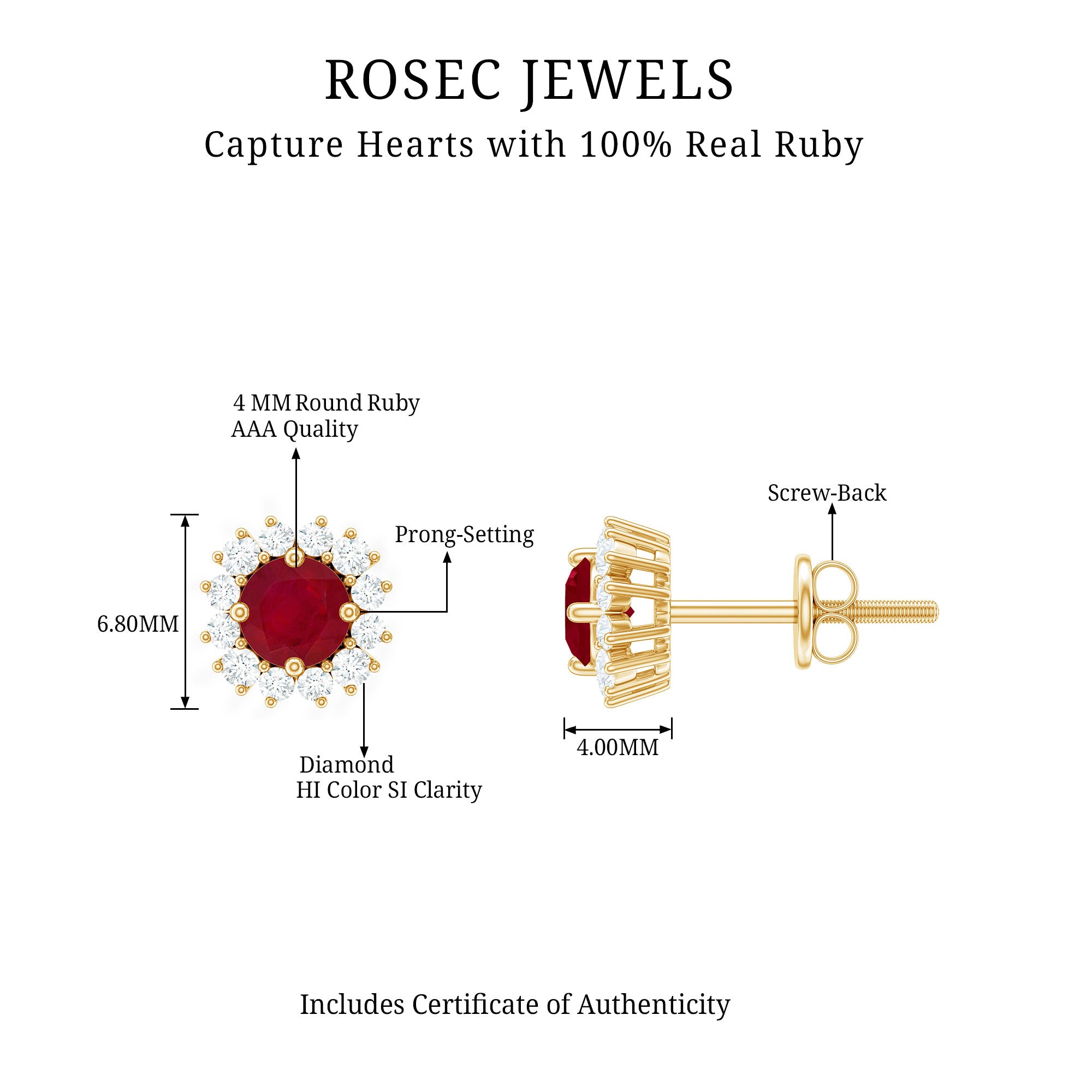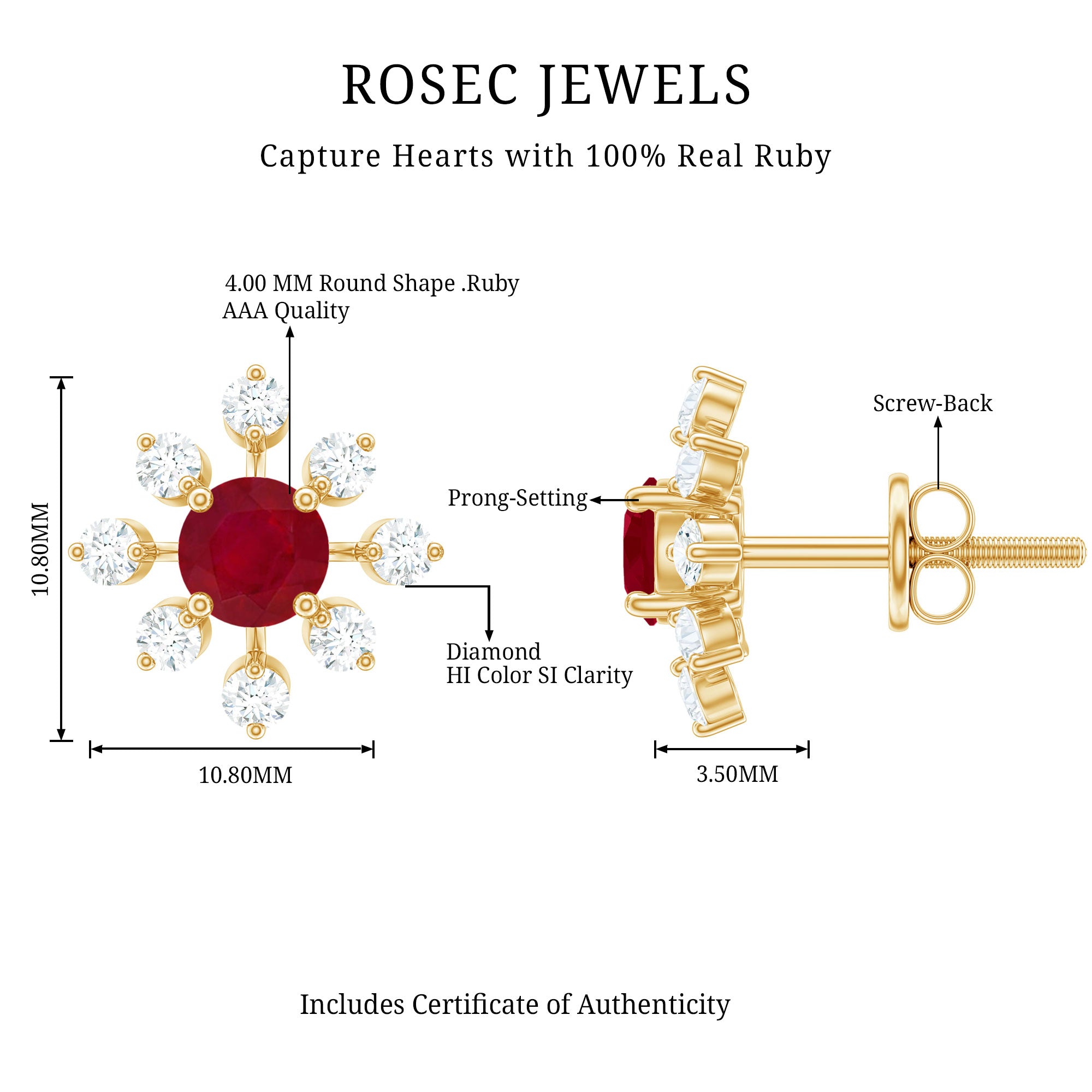 Mainly, this design of studs highlights the beauty and brilliance of ruby. These earrings are available in various metals like white gold, yellow gold, and sterling silver. The choice depends on your budget and preferences.