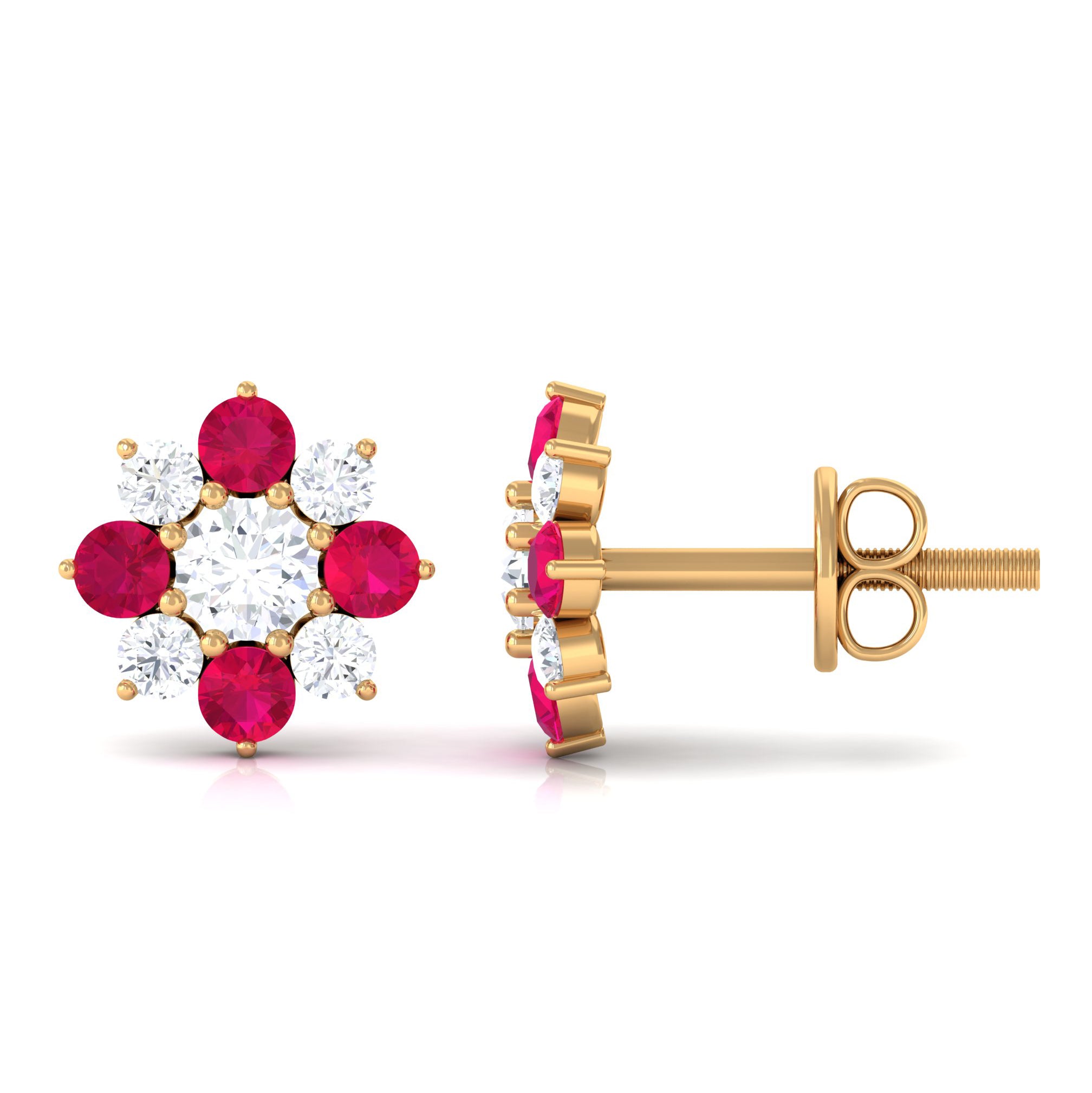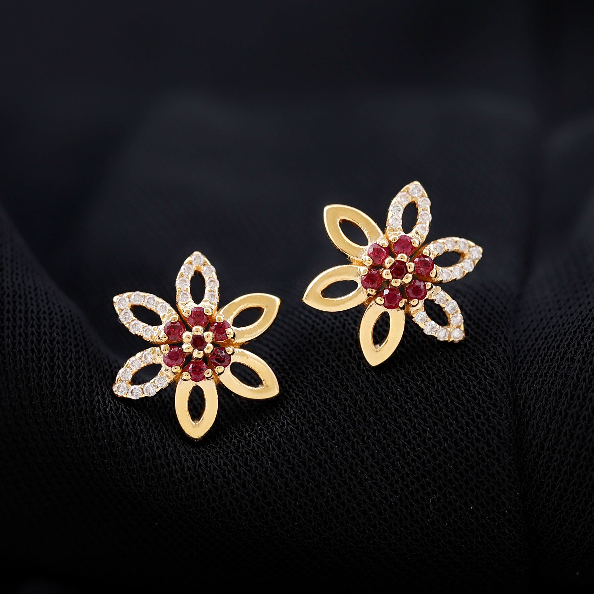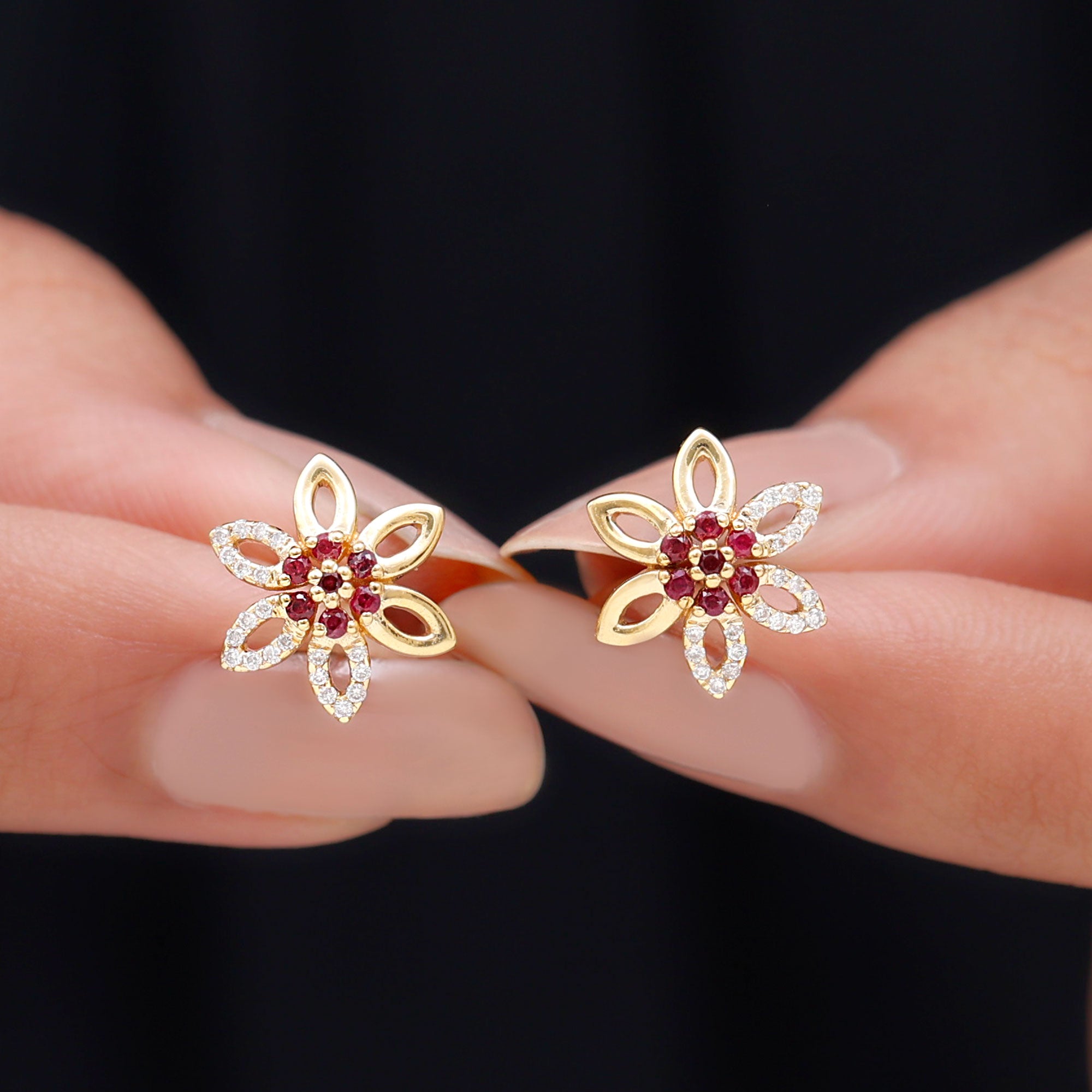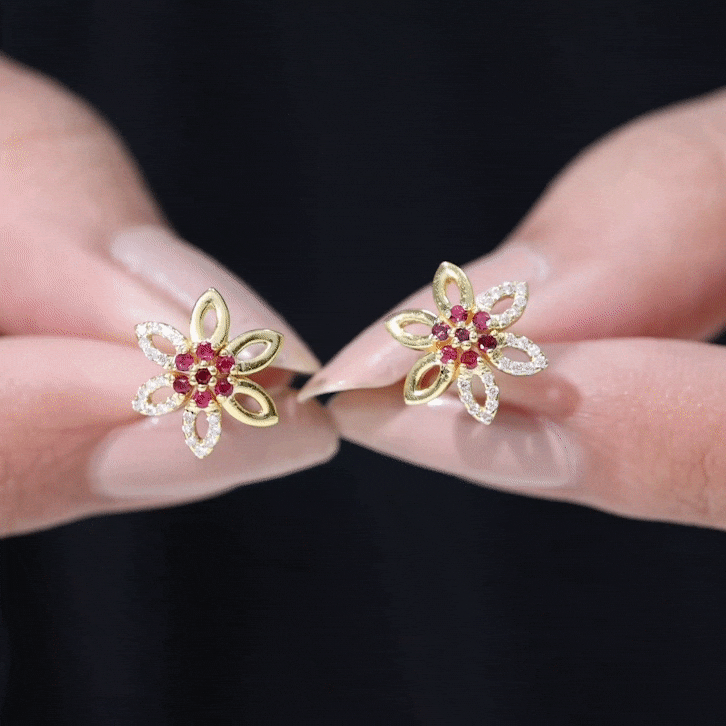 Looking for a pair of gold stud earrings that evoke the beauty of nature? Our collection of flower stud earrings is inspired by the gentle features of the natural world and captivates attention with every movement. This design blends ruby with shimmering moissanite or diamond to craft intricate floral or leaf motifs. Wearing these earrings ensures you stand out from the crowd with their exquisite elegance.