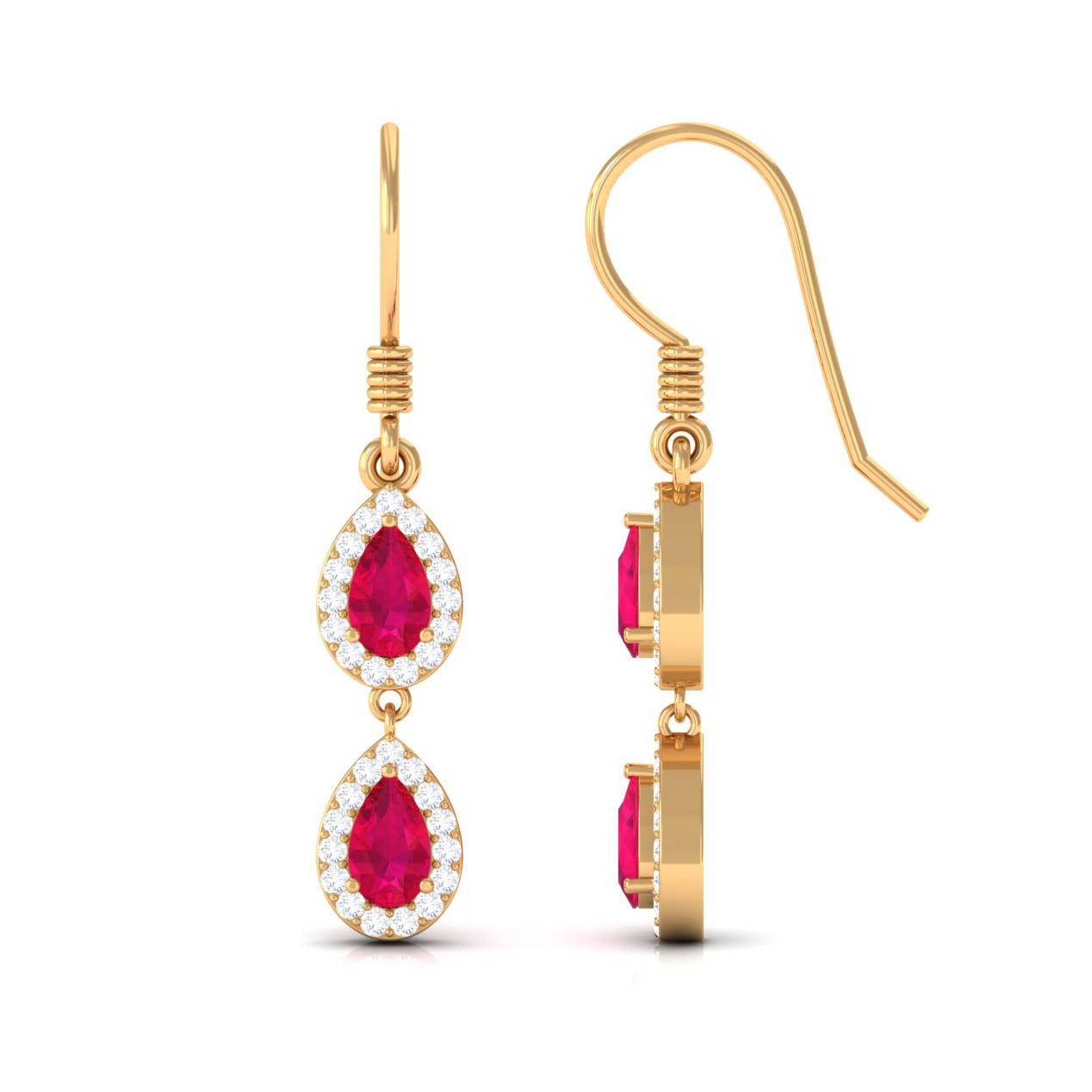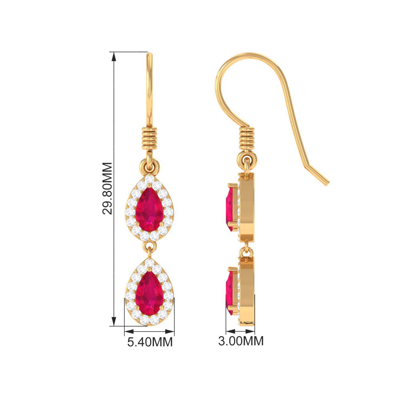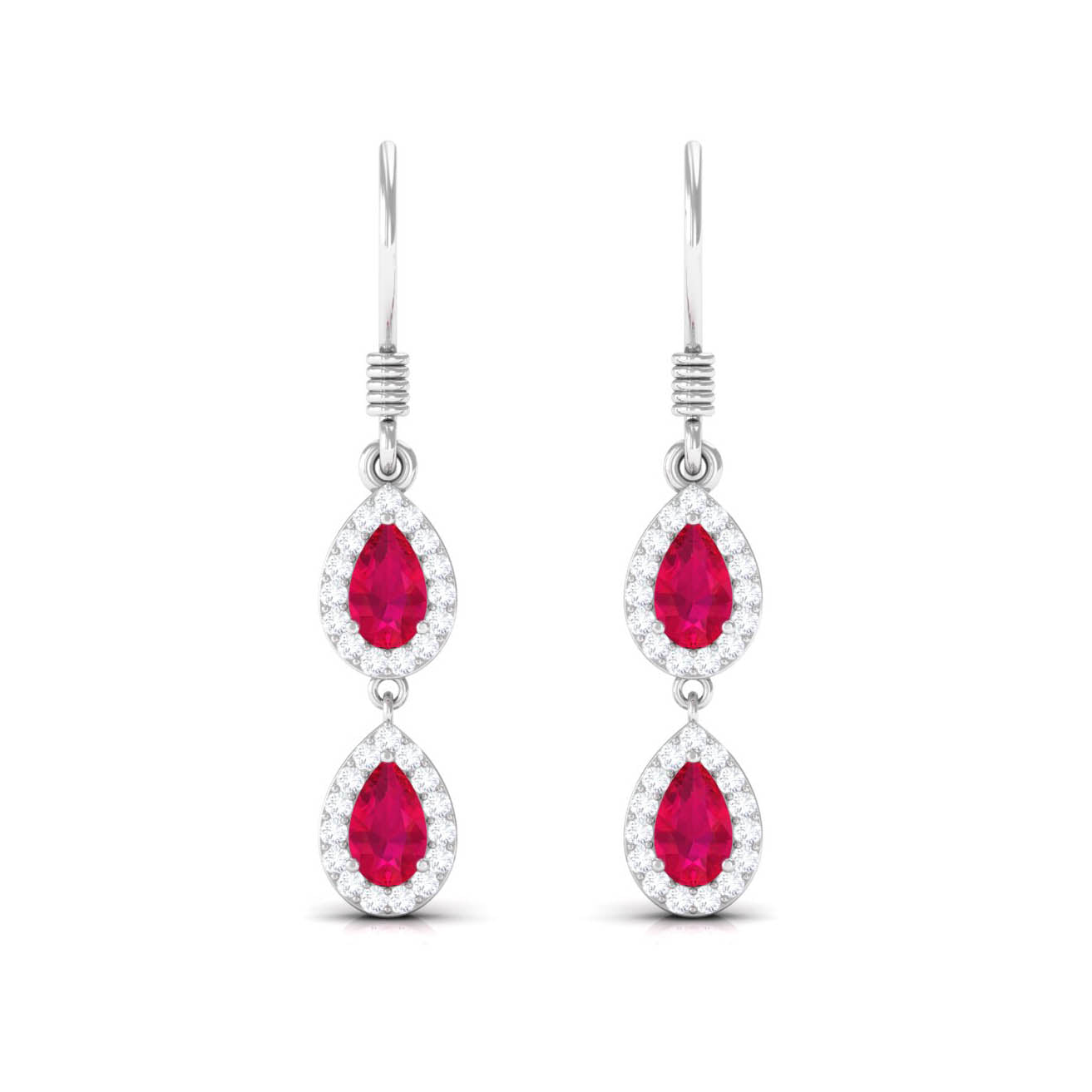 Halo drop earrings bring an additional touch of brilliance to any attire. The glimmer is enhanced by a vibrant red ruby, placed elegantly within a radiant halo of diamond or moissanite gemstones.