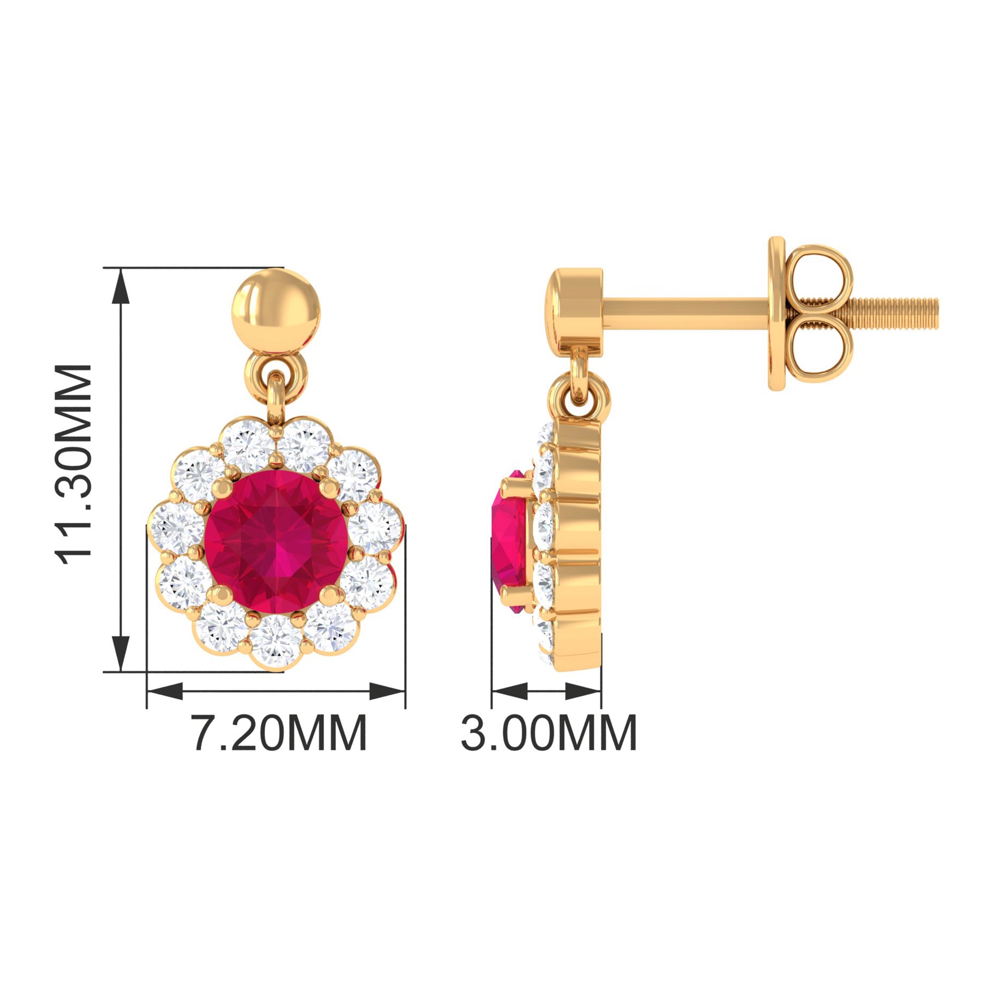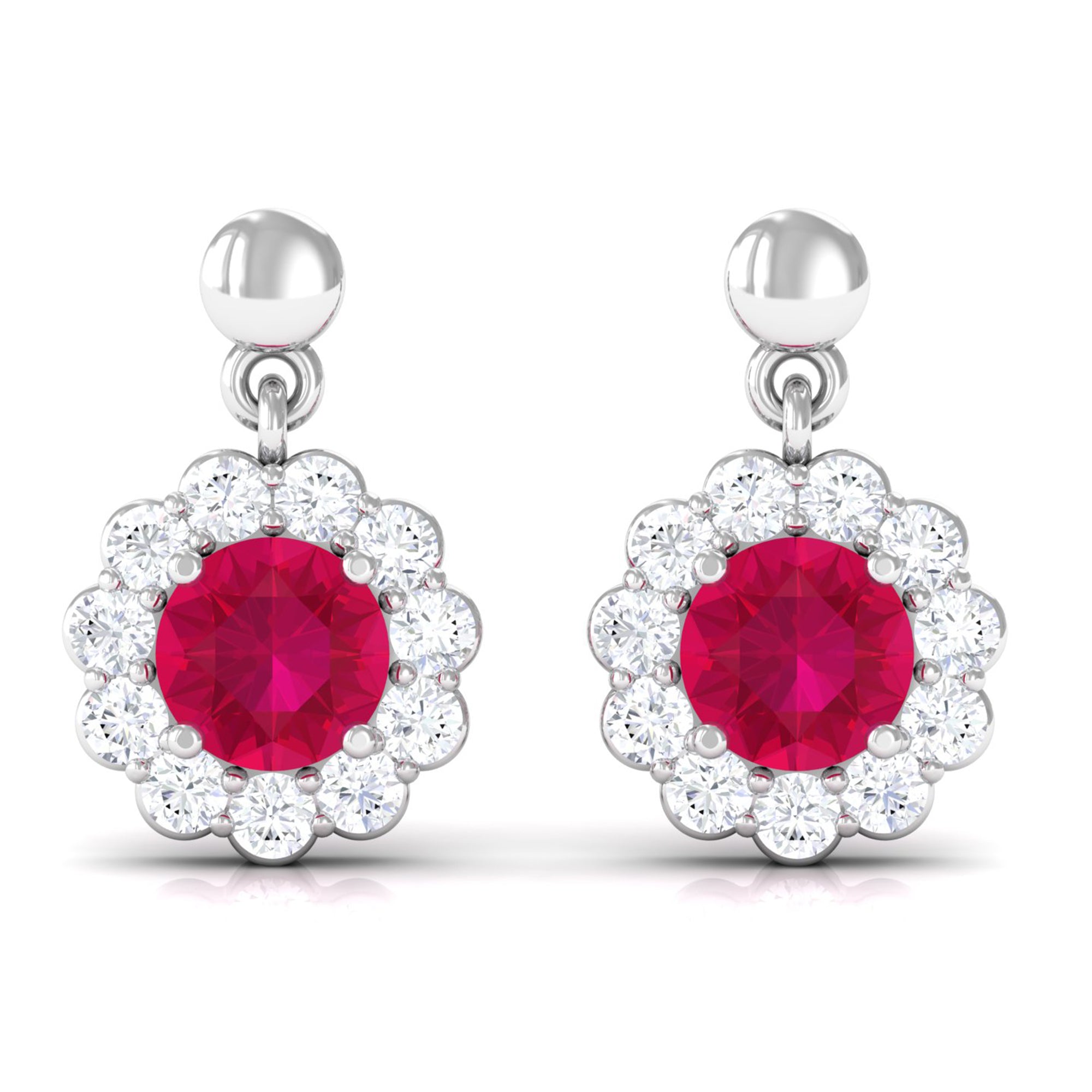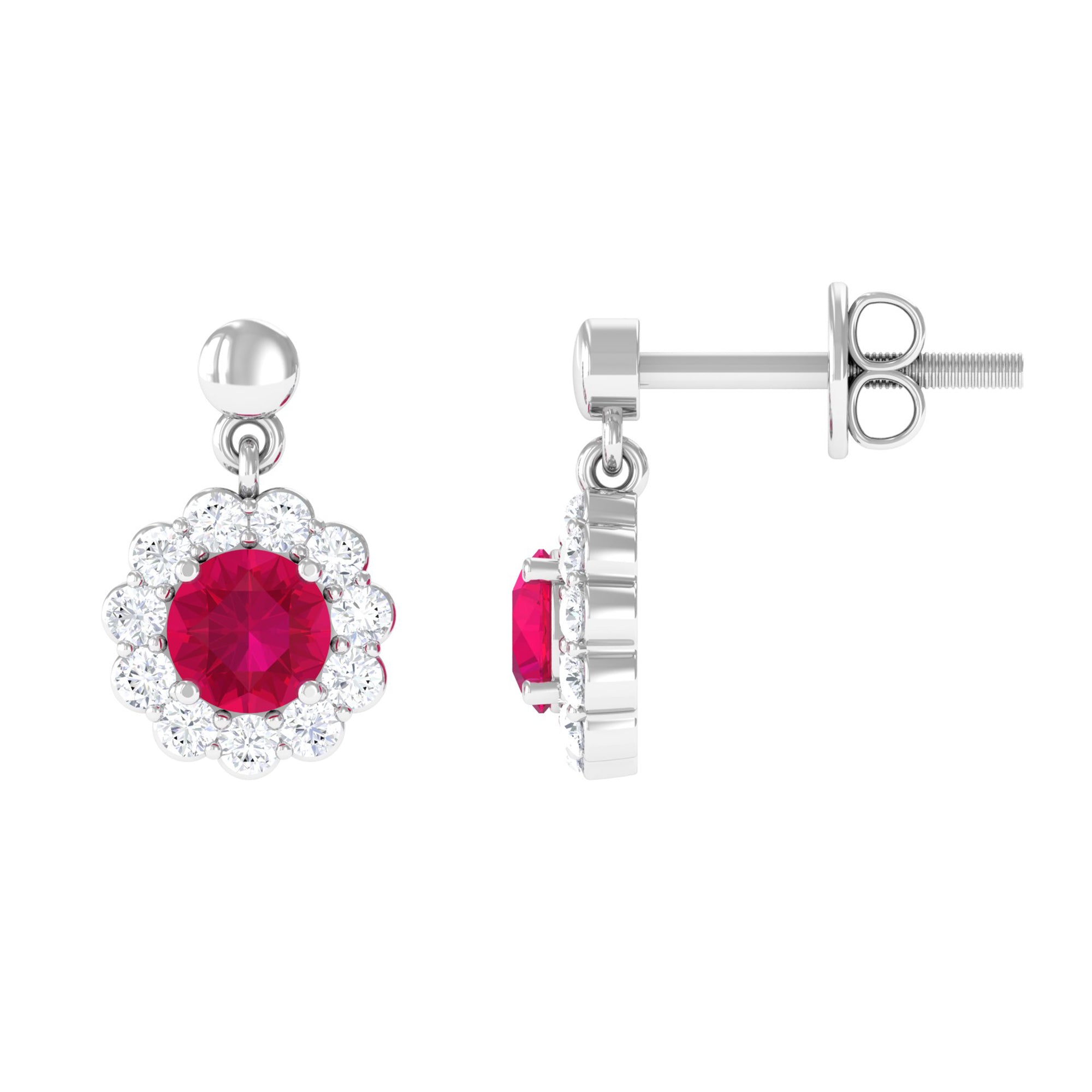 Halo drop earrings bring an additional touch of brilliance to any attire. The glimmer is enhanced by a vibrant red ruby, placed elegantly within a radiant halo of diamond or moissanite gemstones.