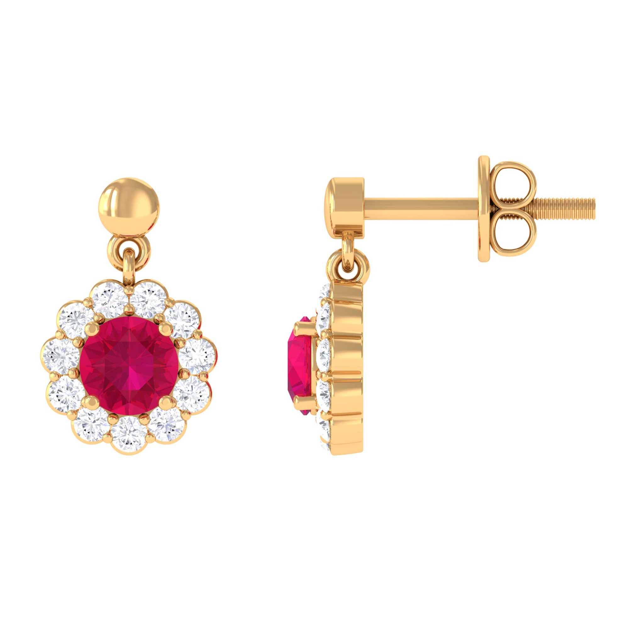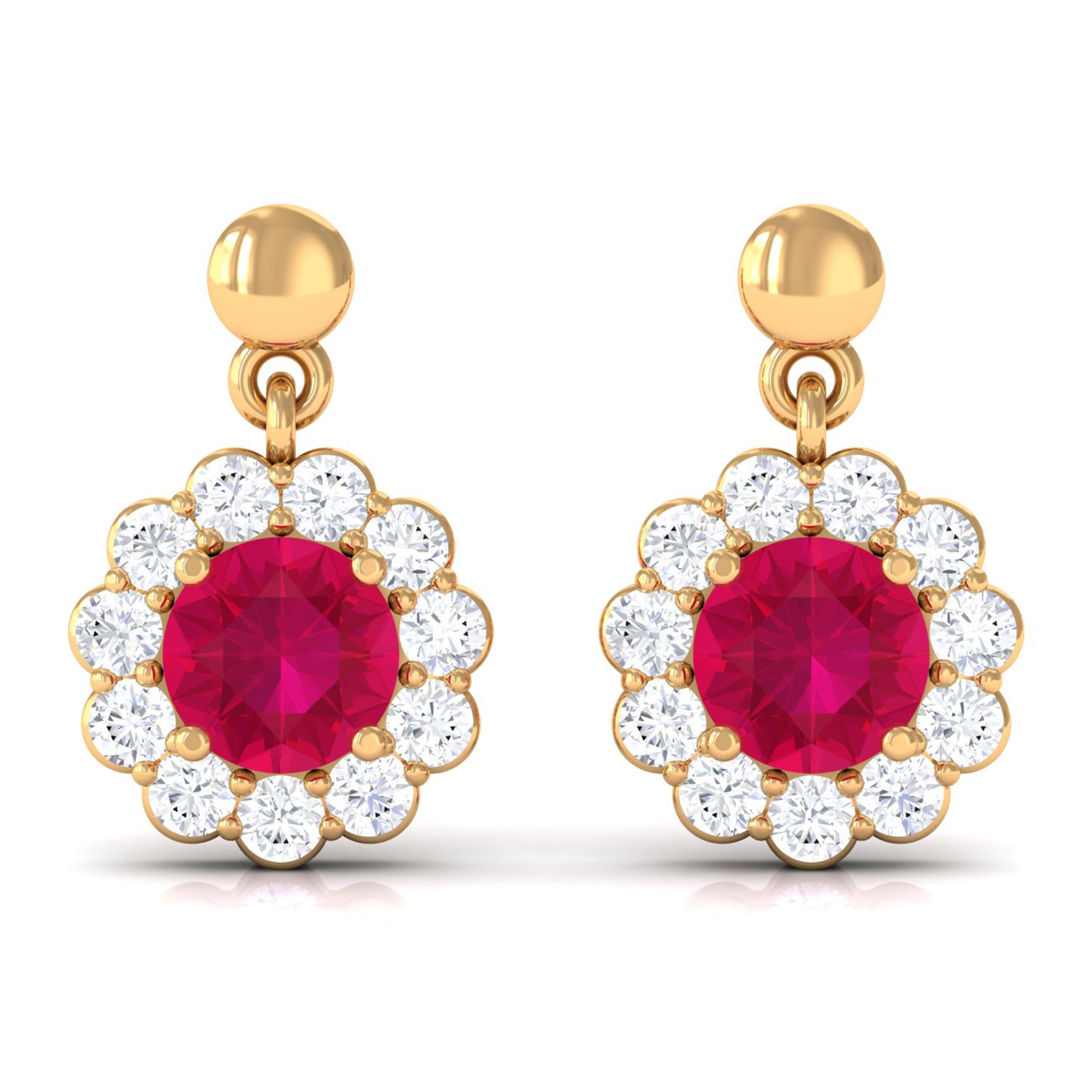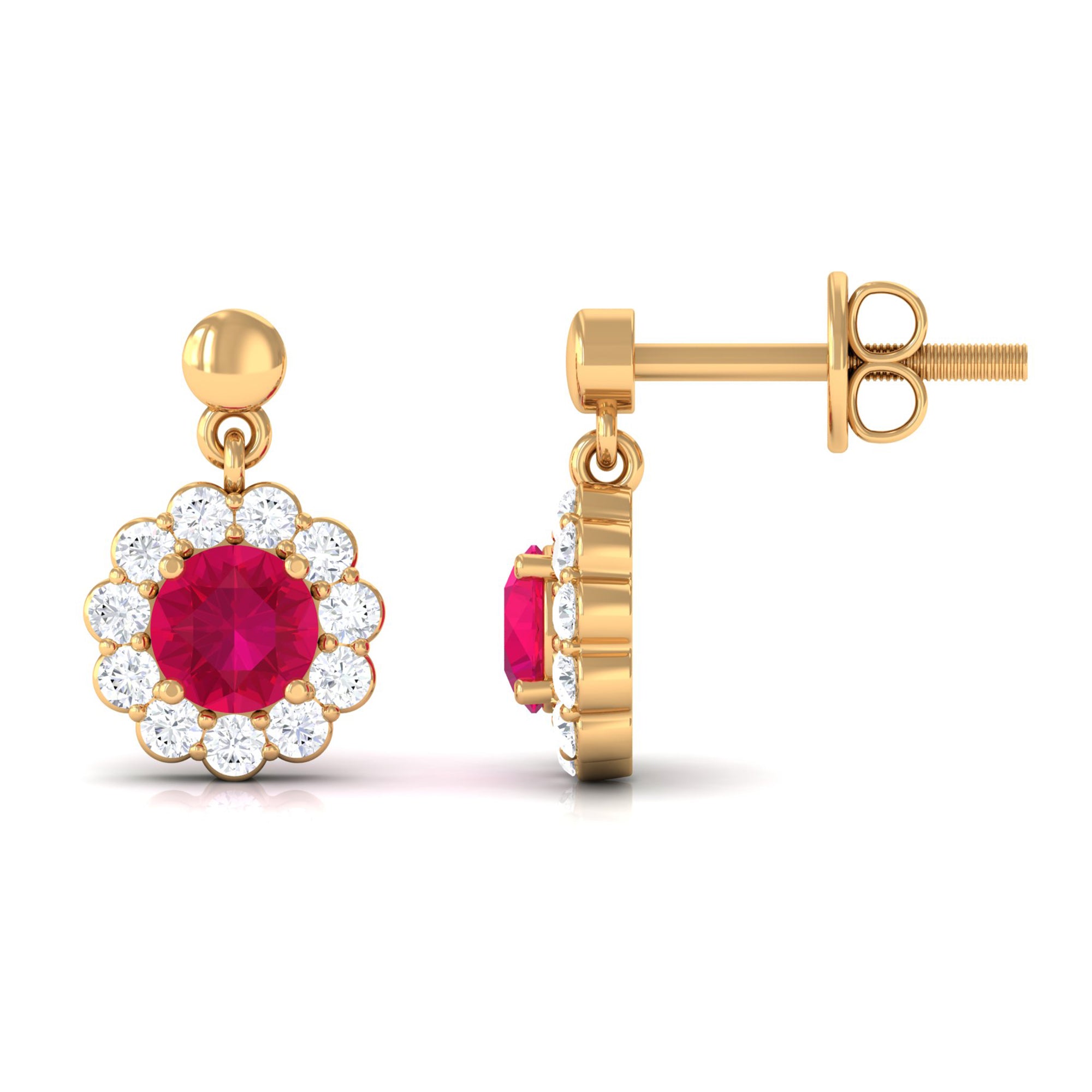 Halo drop earrings bring an additional touch of brilliance to any attire. The glimmer is enhanced by a vibrant red ruby, placed elegantly within a radiant halo of diamond or moissanite gemstones.