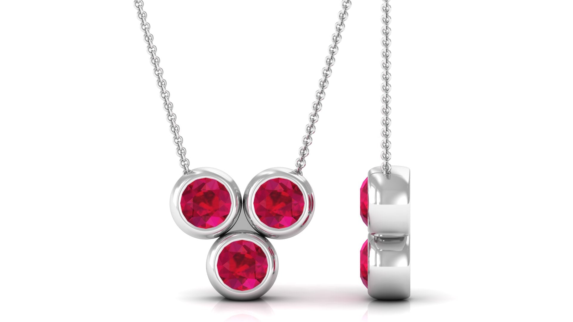 Three Stone Ruby Necklaces:- A perfect combination of vibrant ruby and sparkling diamond accents. These exquisite ruby necklaces feature three red ruby gems in an intricately designed setting. They are perfect for adding an extra touch of sparkle to your day or night ensembles.