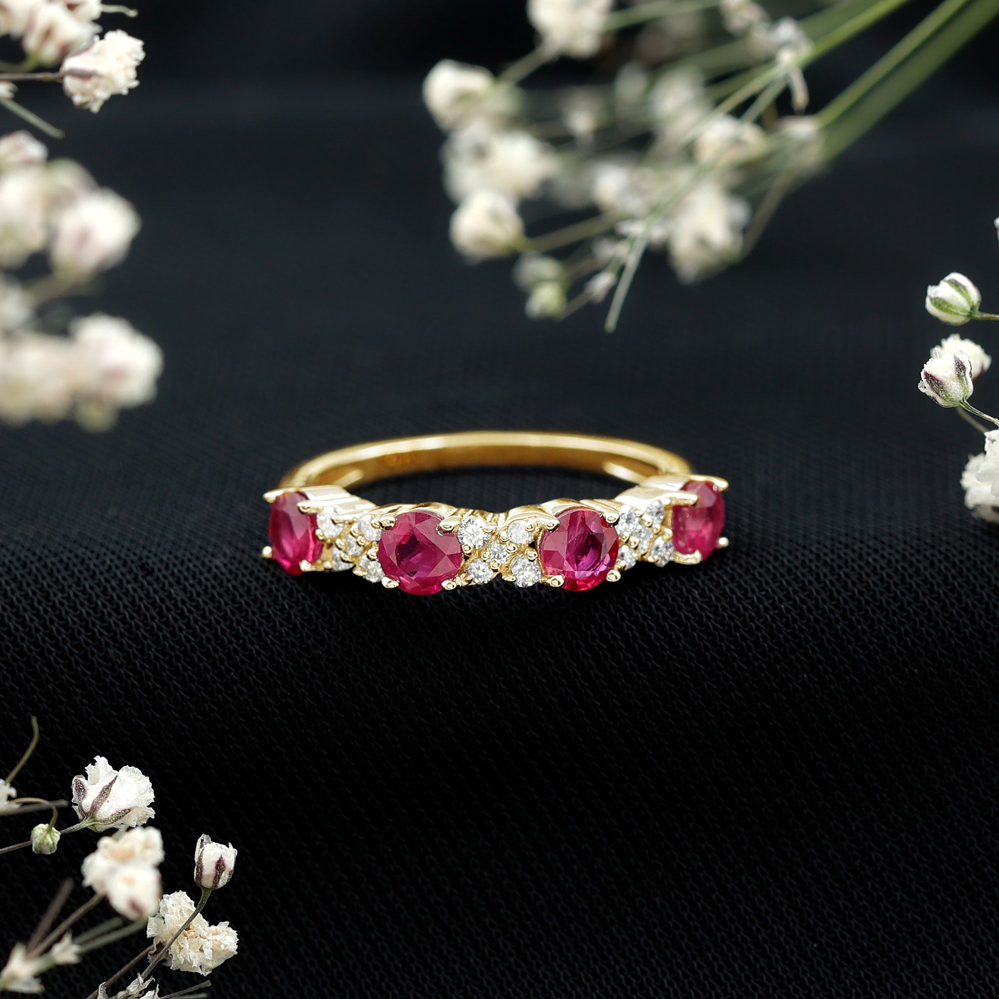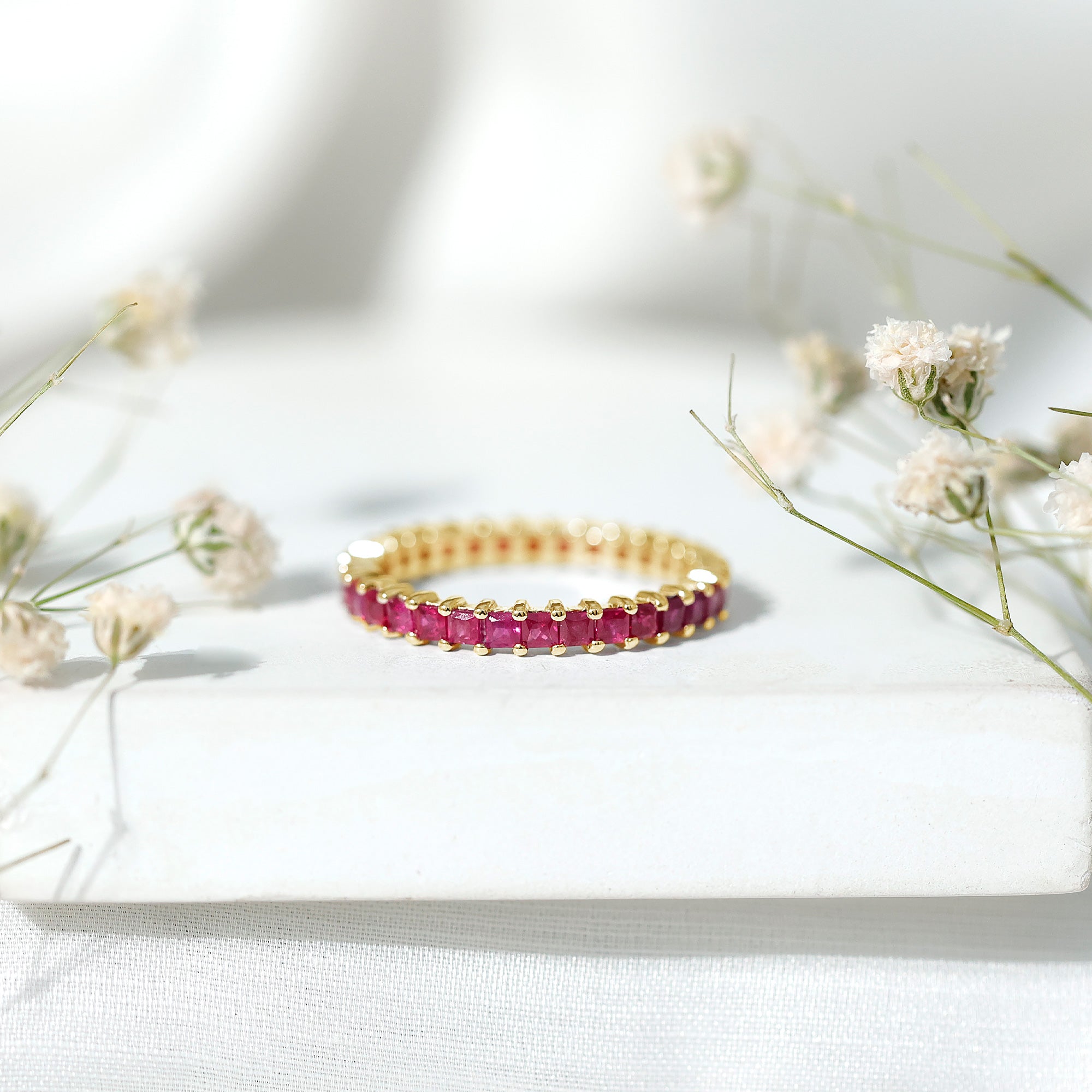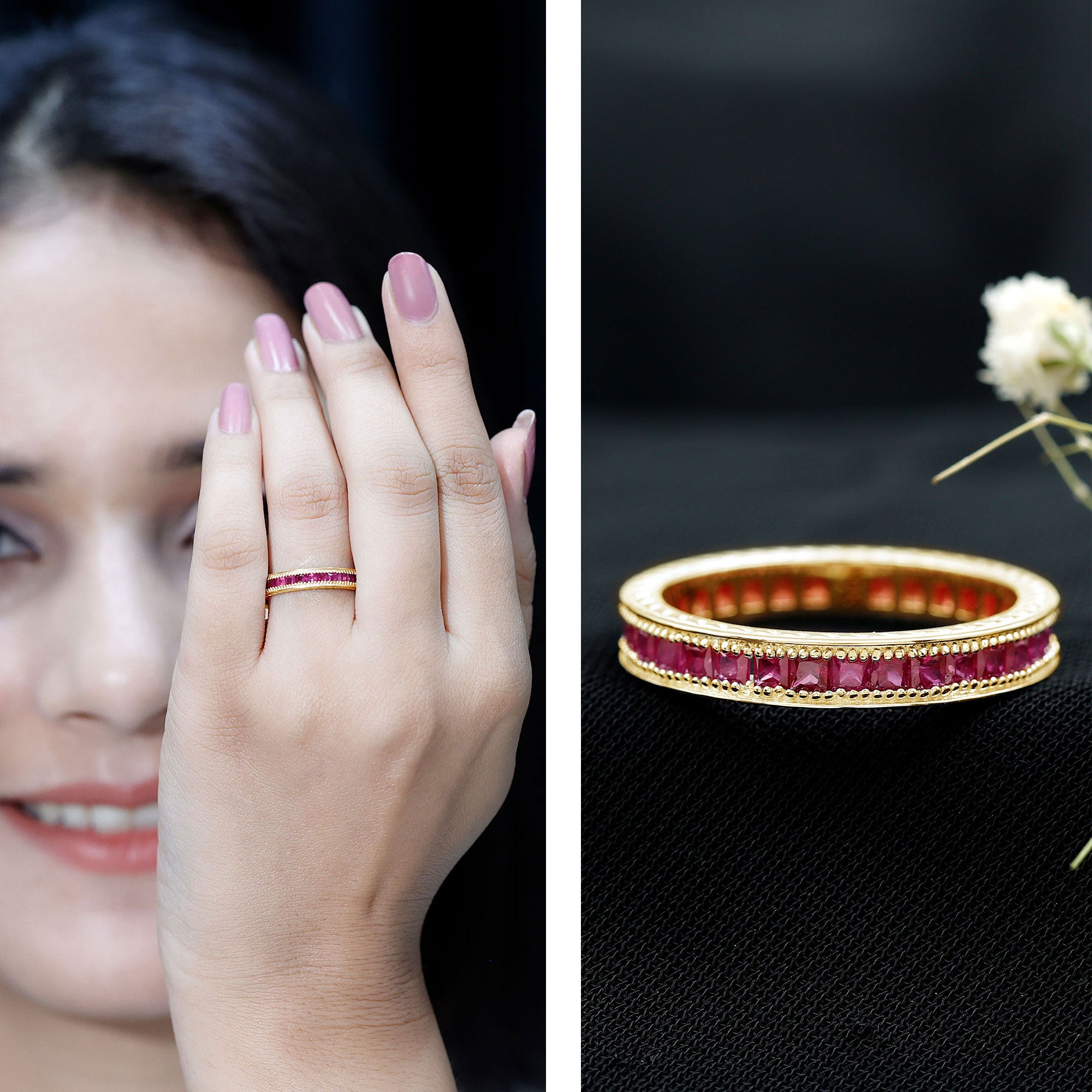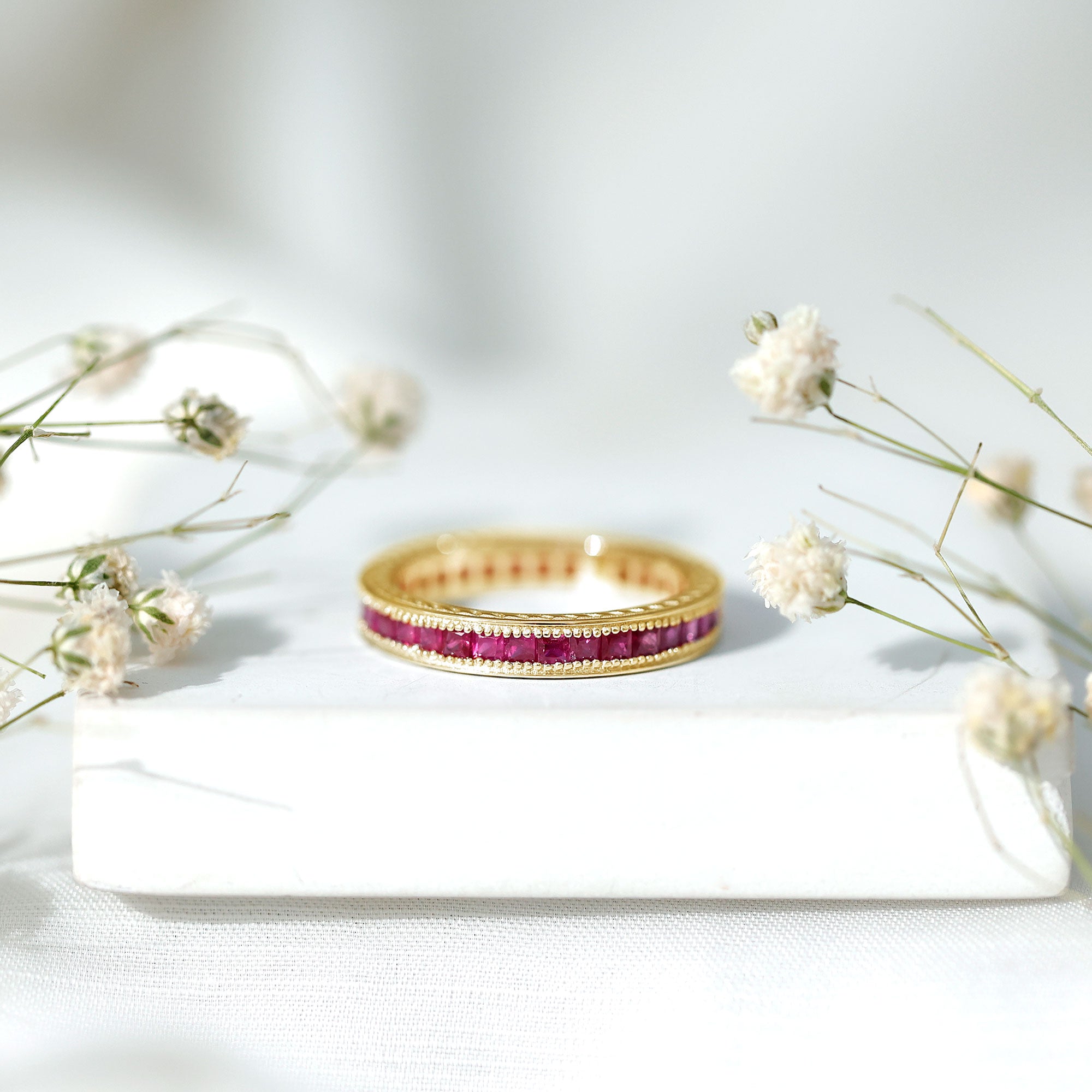 Ruby rings are chosen for their deep red color and enduring symbolism. As the July birthstone, ruby is traditionally associated with love and commitment, making it a meaningful choice for engagement, anniversary, and milestone jewelry.