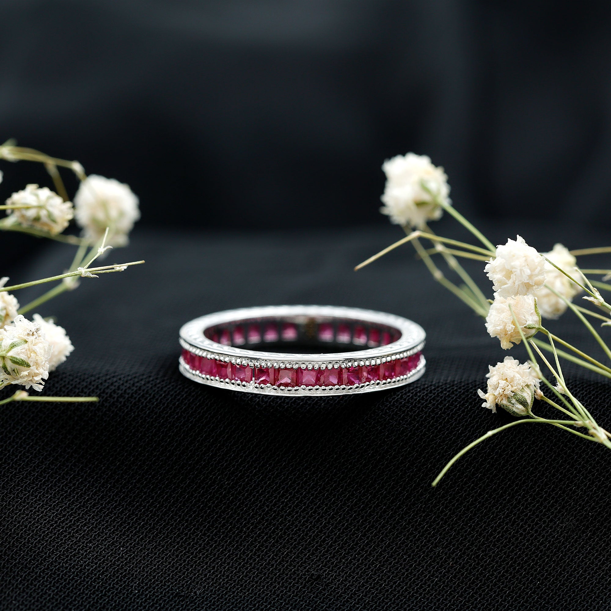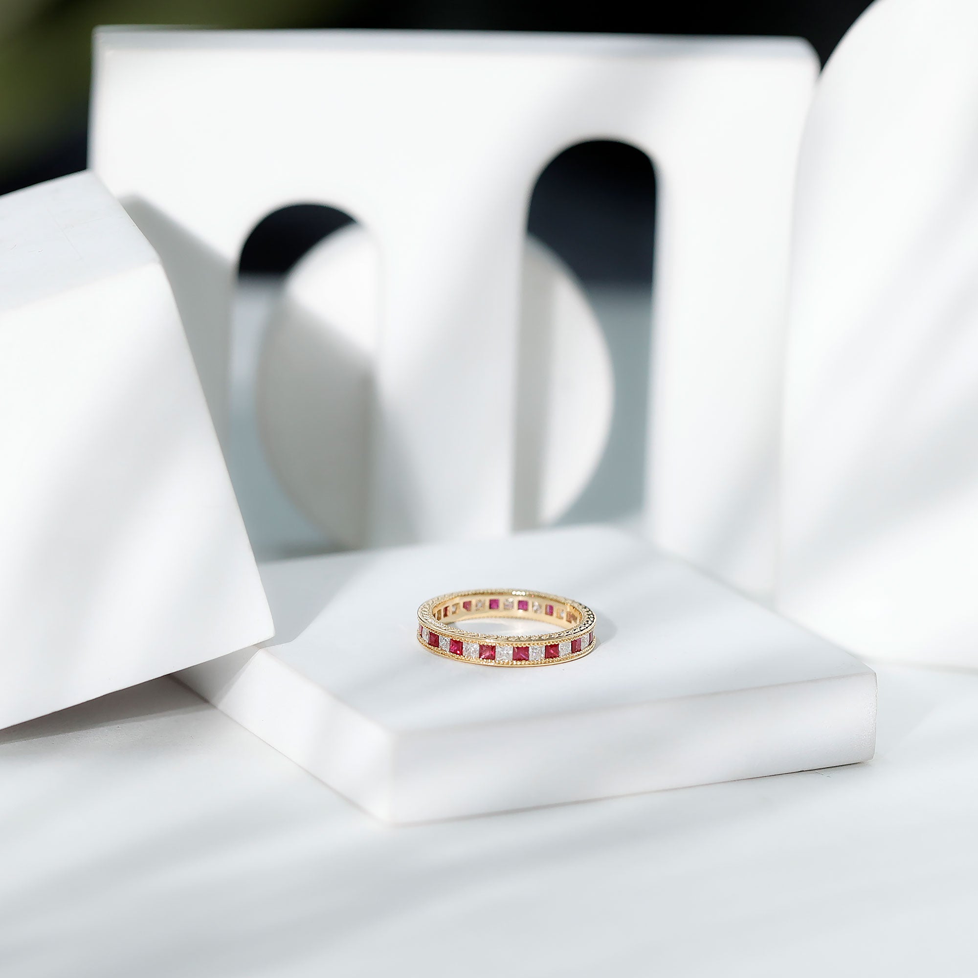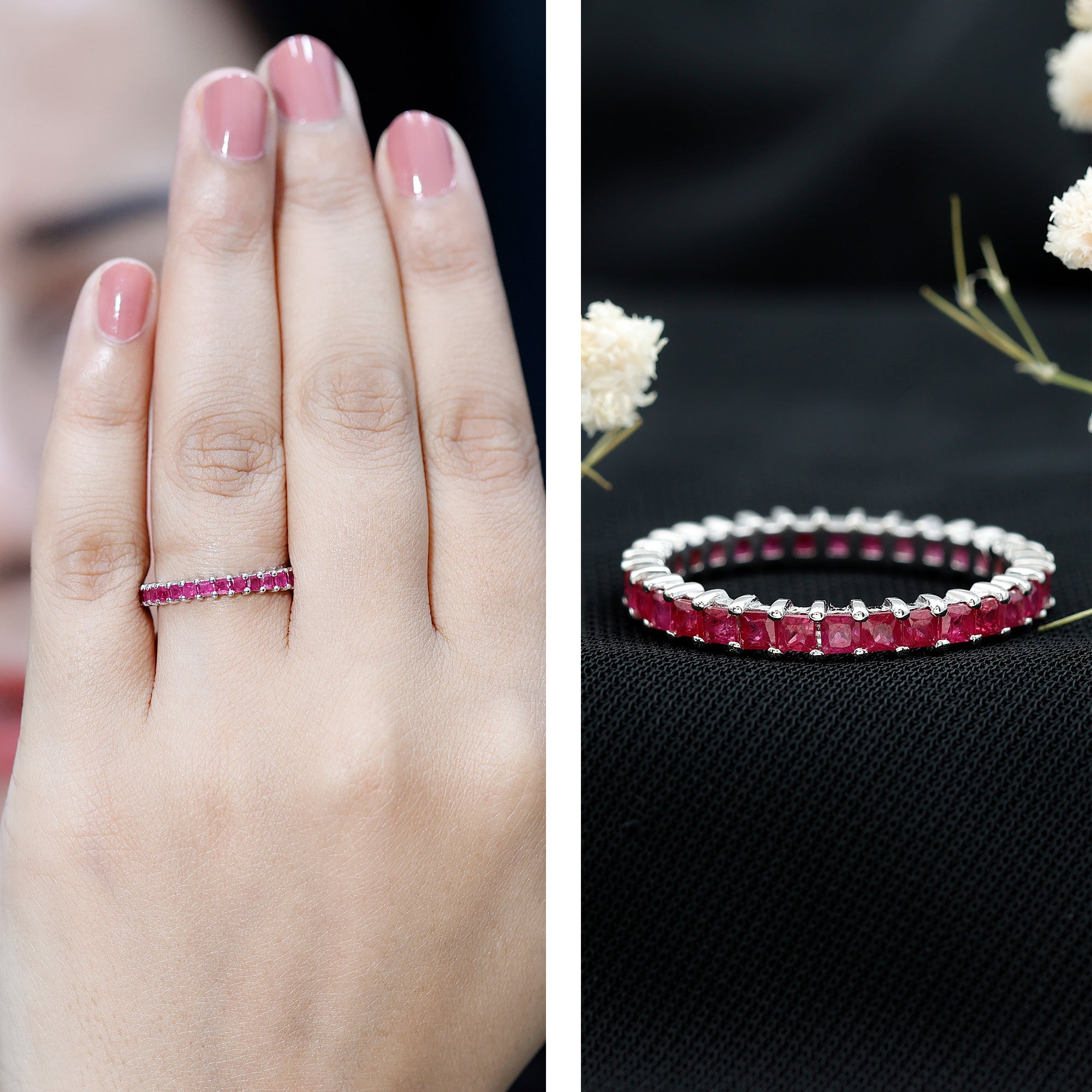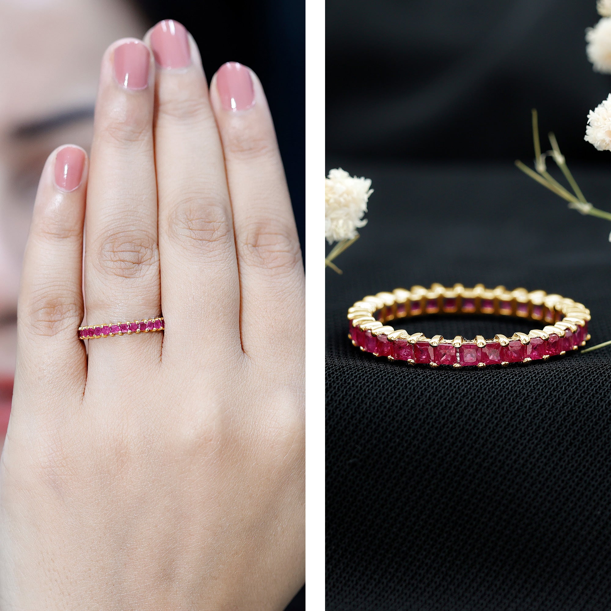 Yellow gold enhances ruby’s warmth, white gold creates crisp contrast, and rose gold softens the overall appearance. The best choice depends on your preferred aesthetic.