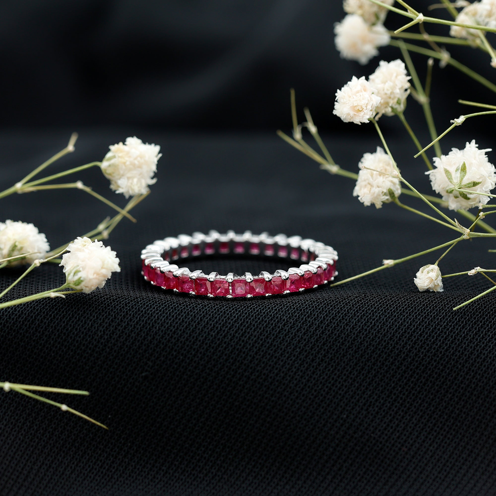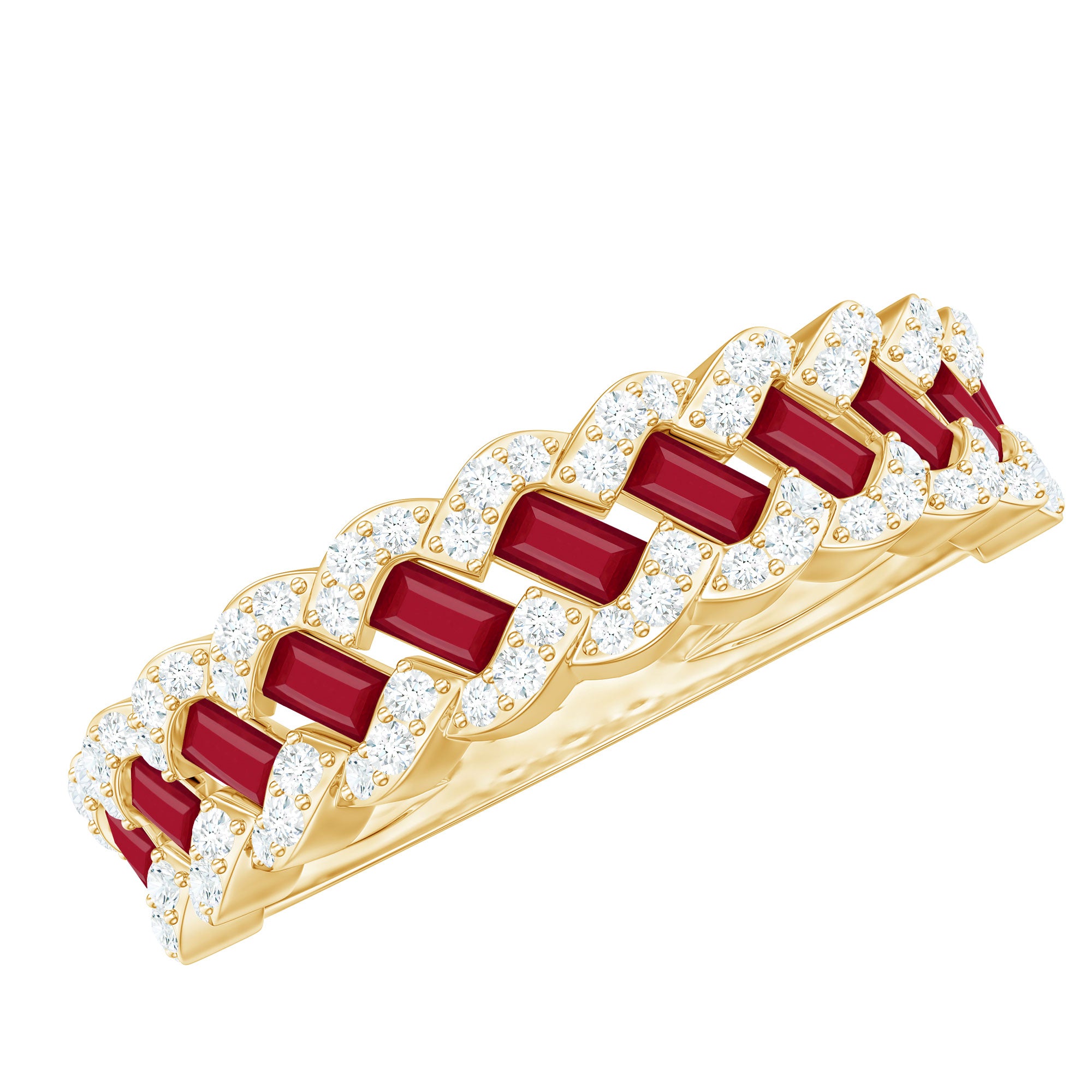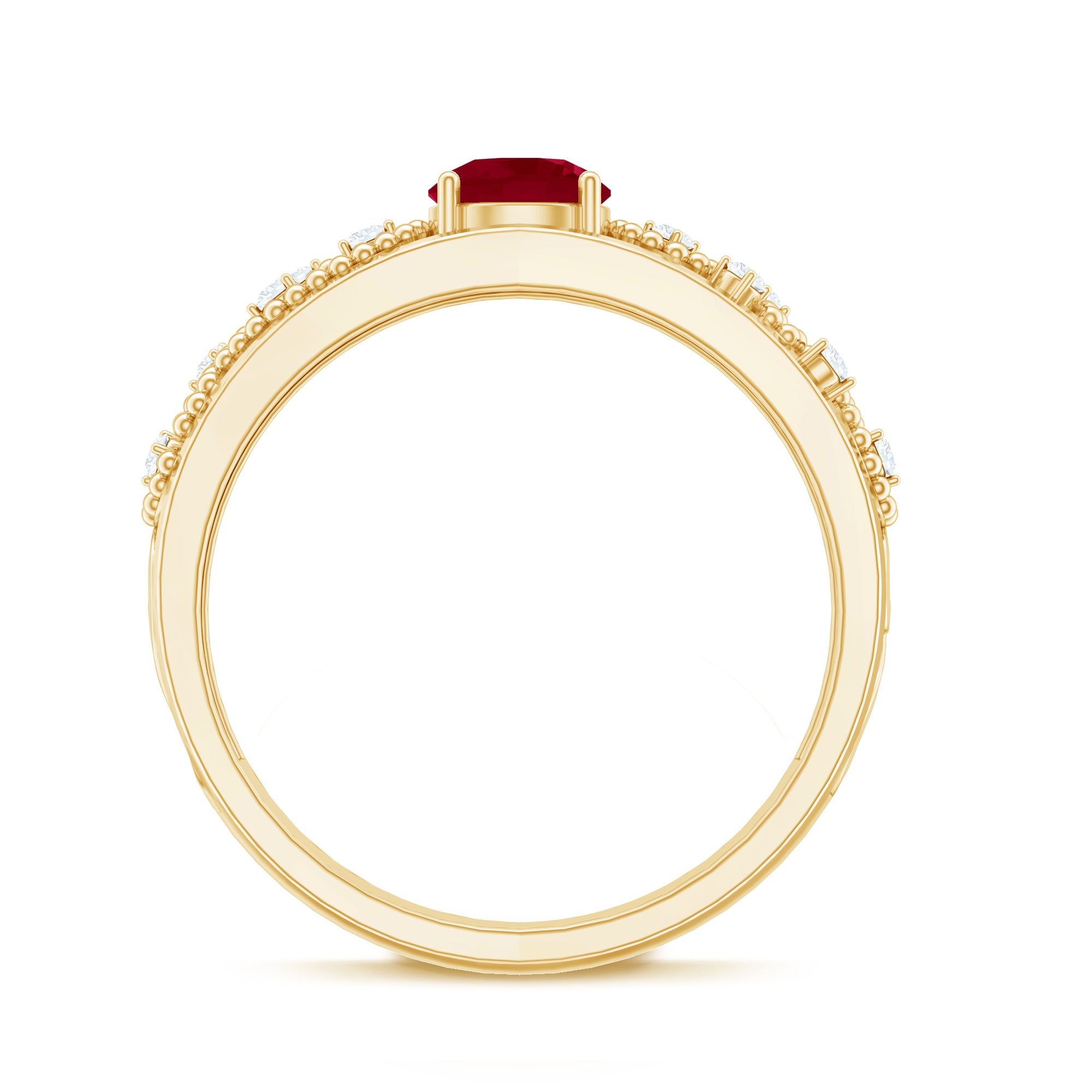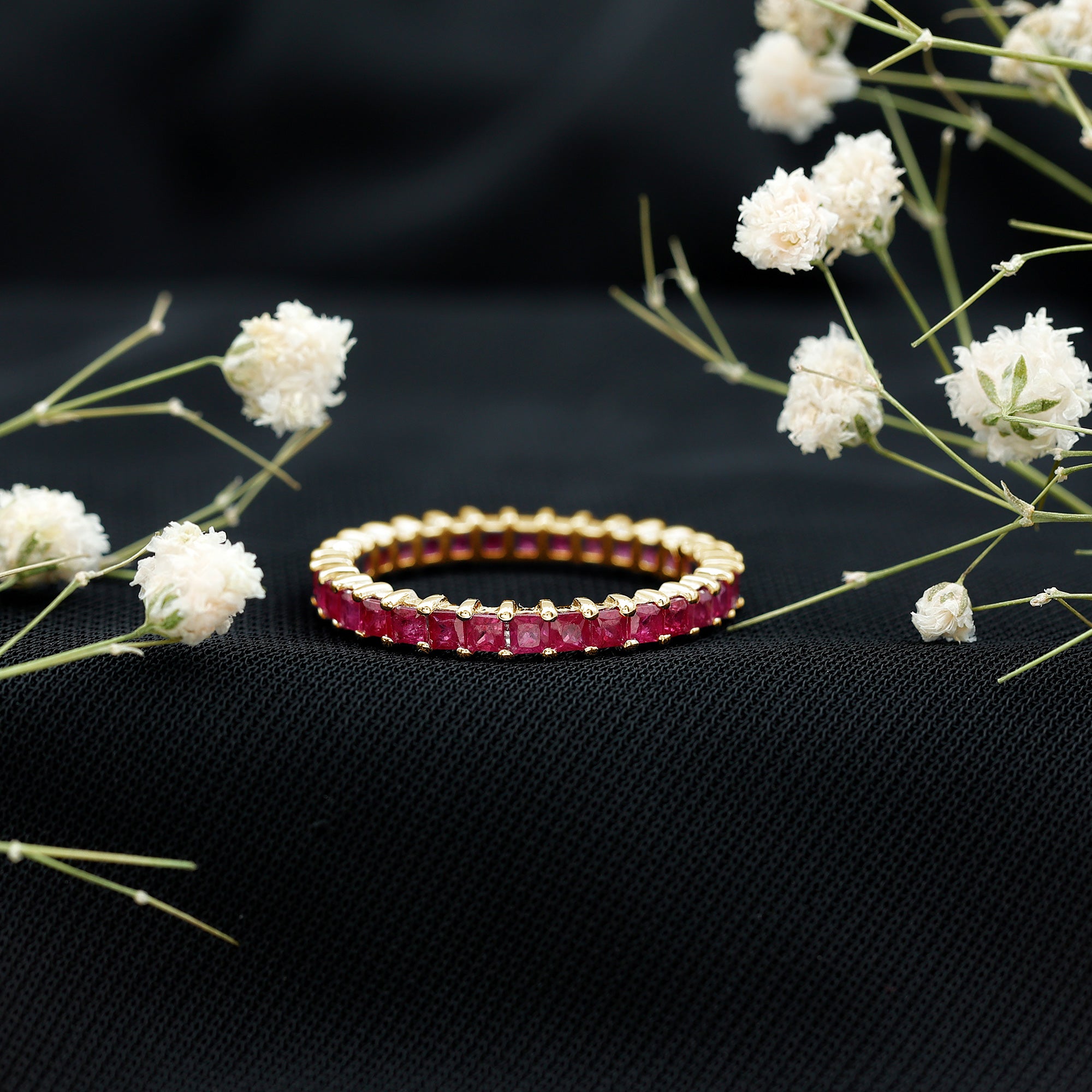 Yellow gold enhances ruby’s warmth, white gold creates crisp contrast, and rose gold softens the overall appearance. The best choice depends on your preferred aesthetic.