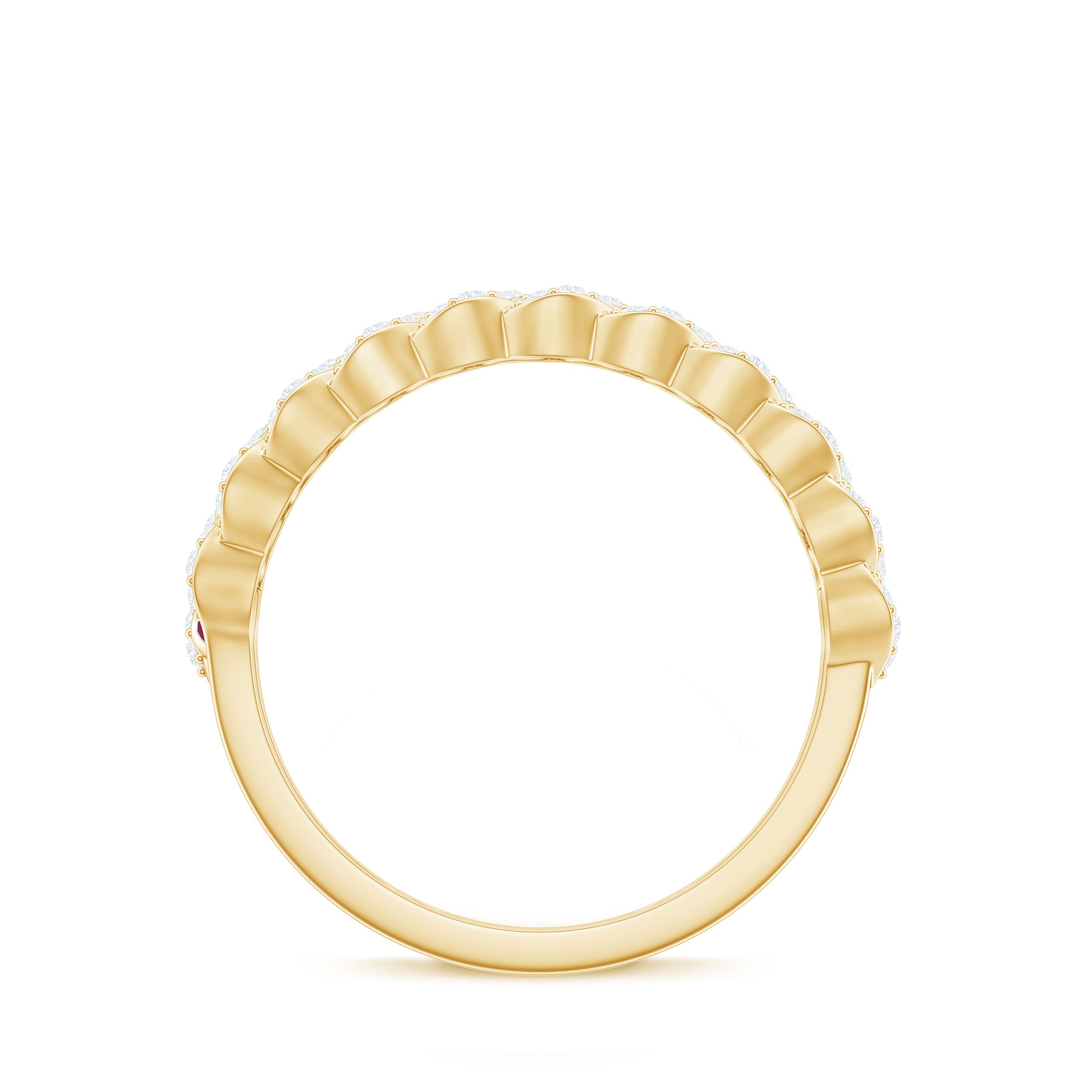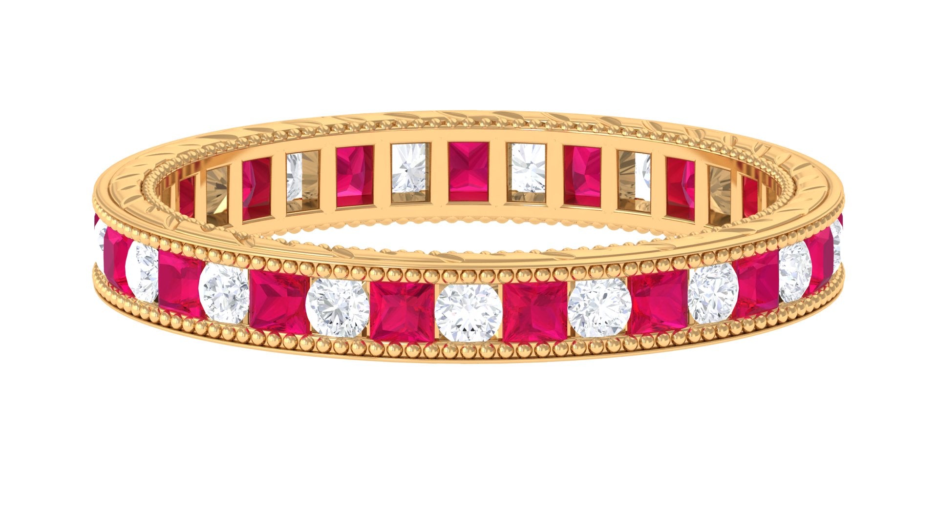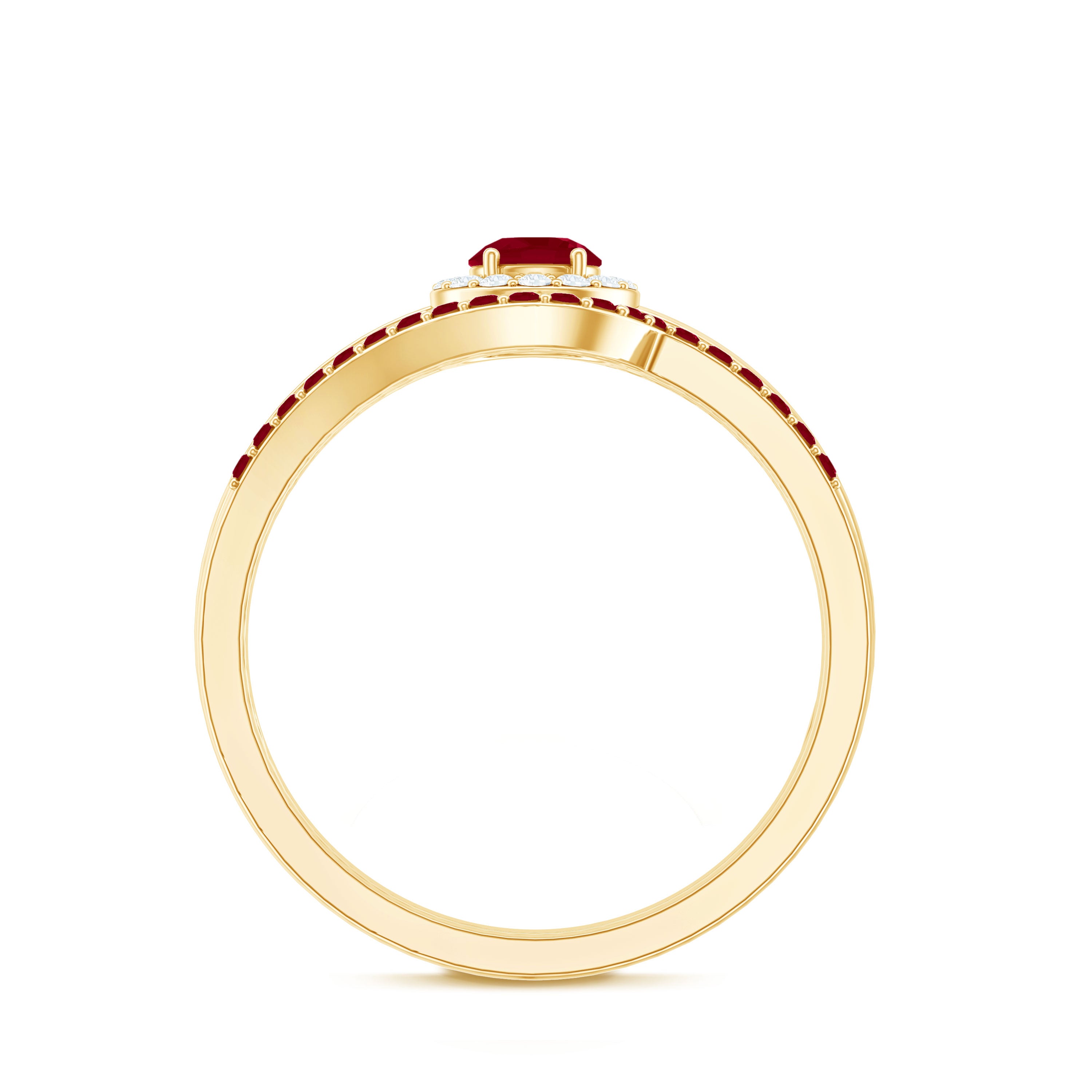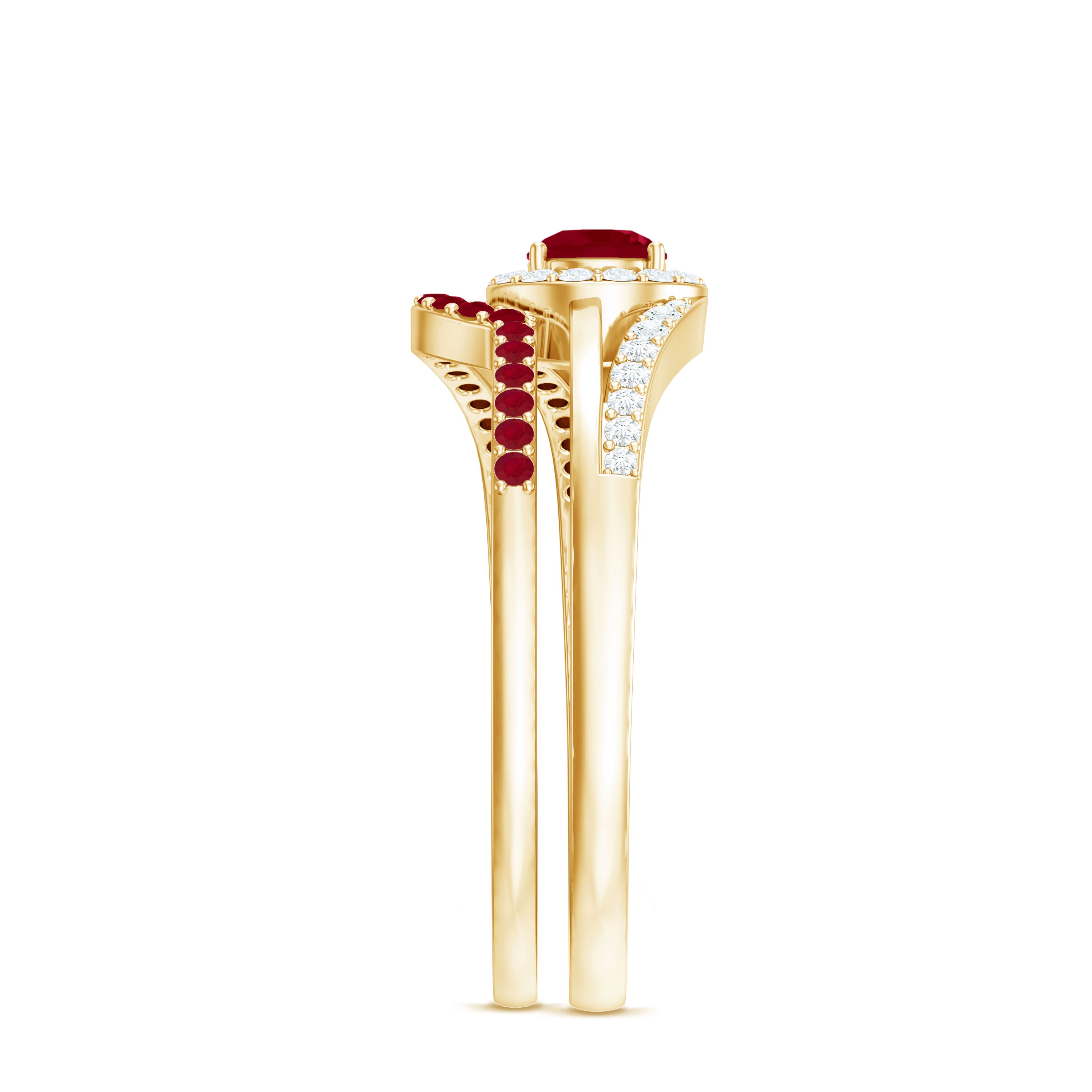 Yellow gold enhances ruby’s warmth, white gold creates crisp contrast, and rose gold softens the overall appearance. The best choice depends on your preferred aesthetic.